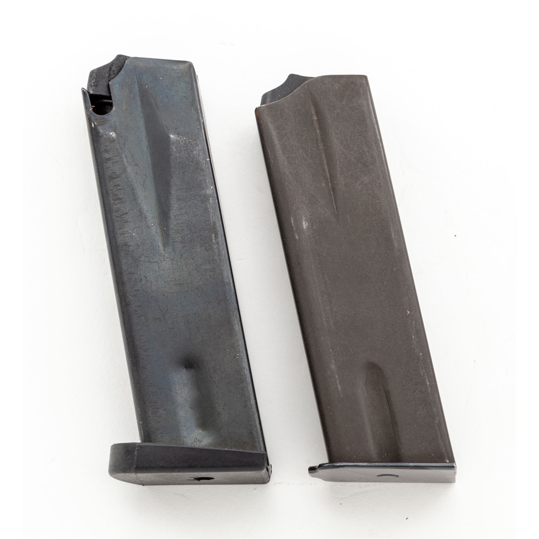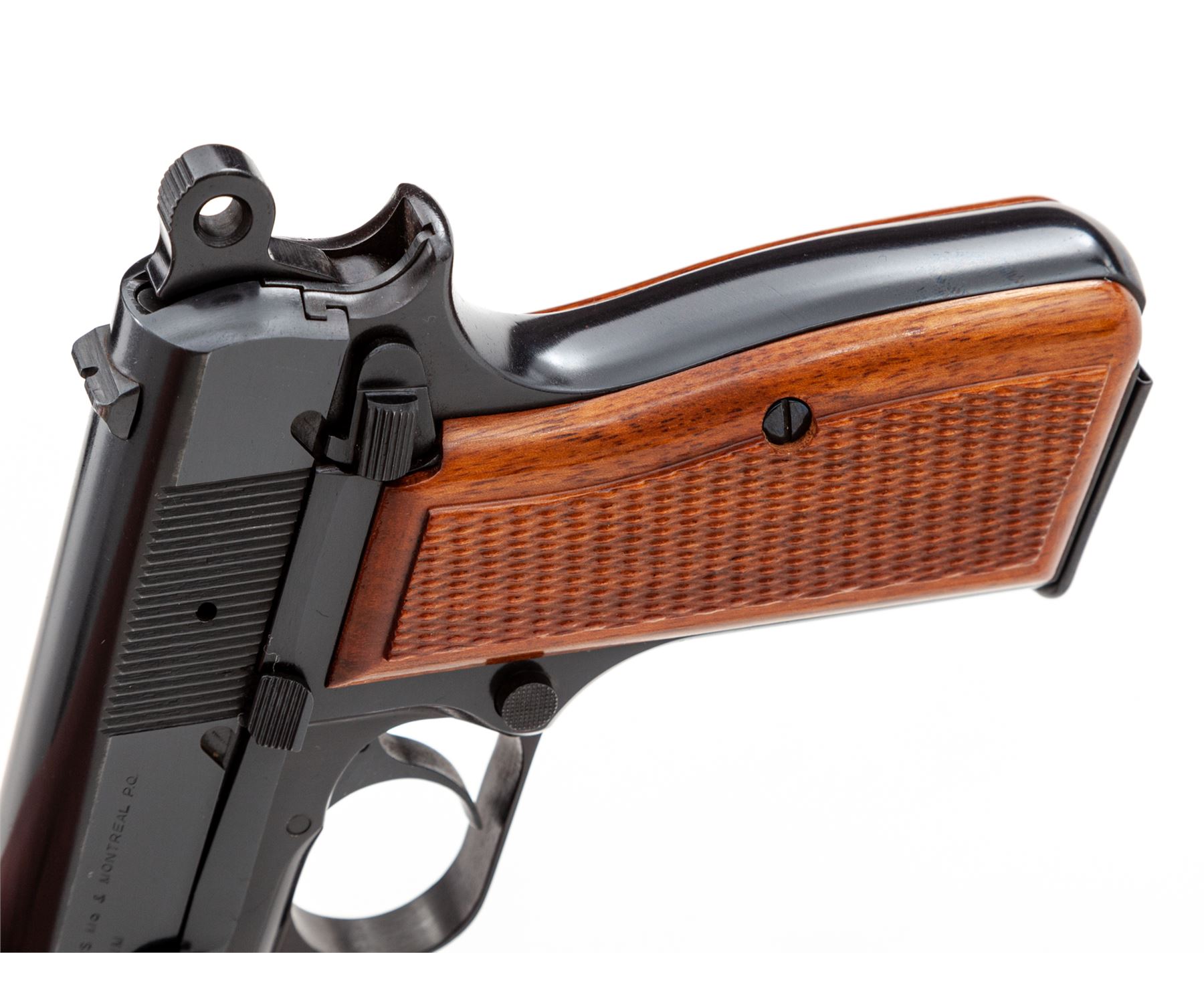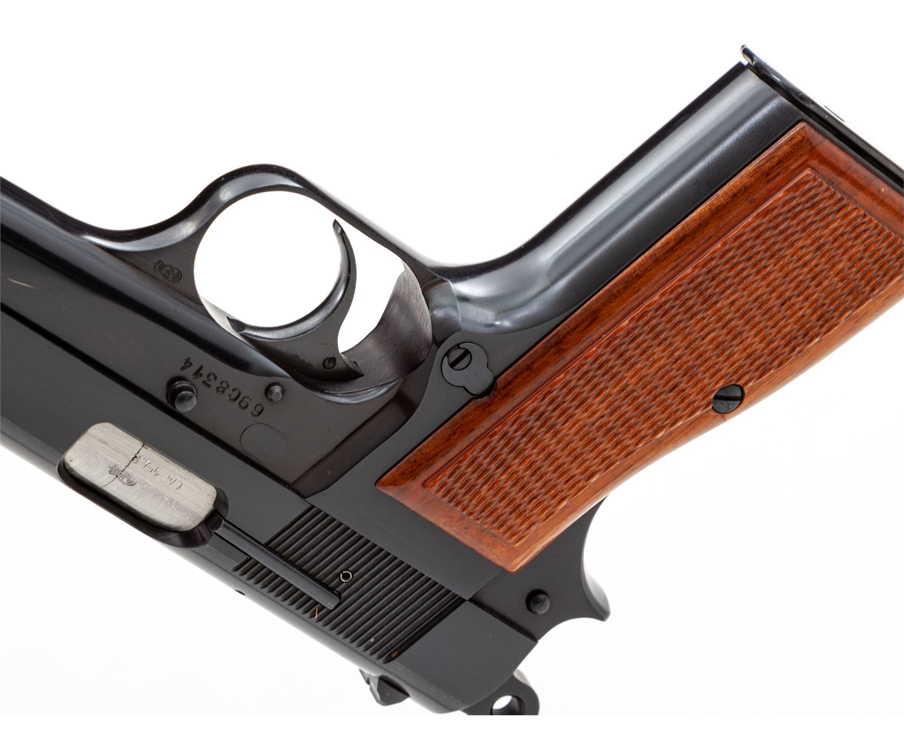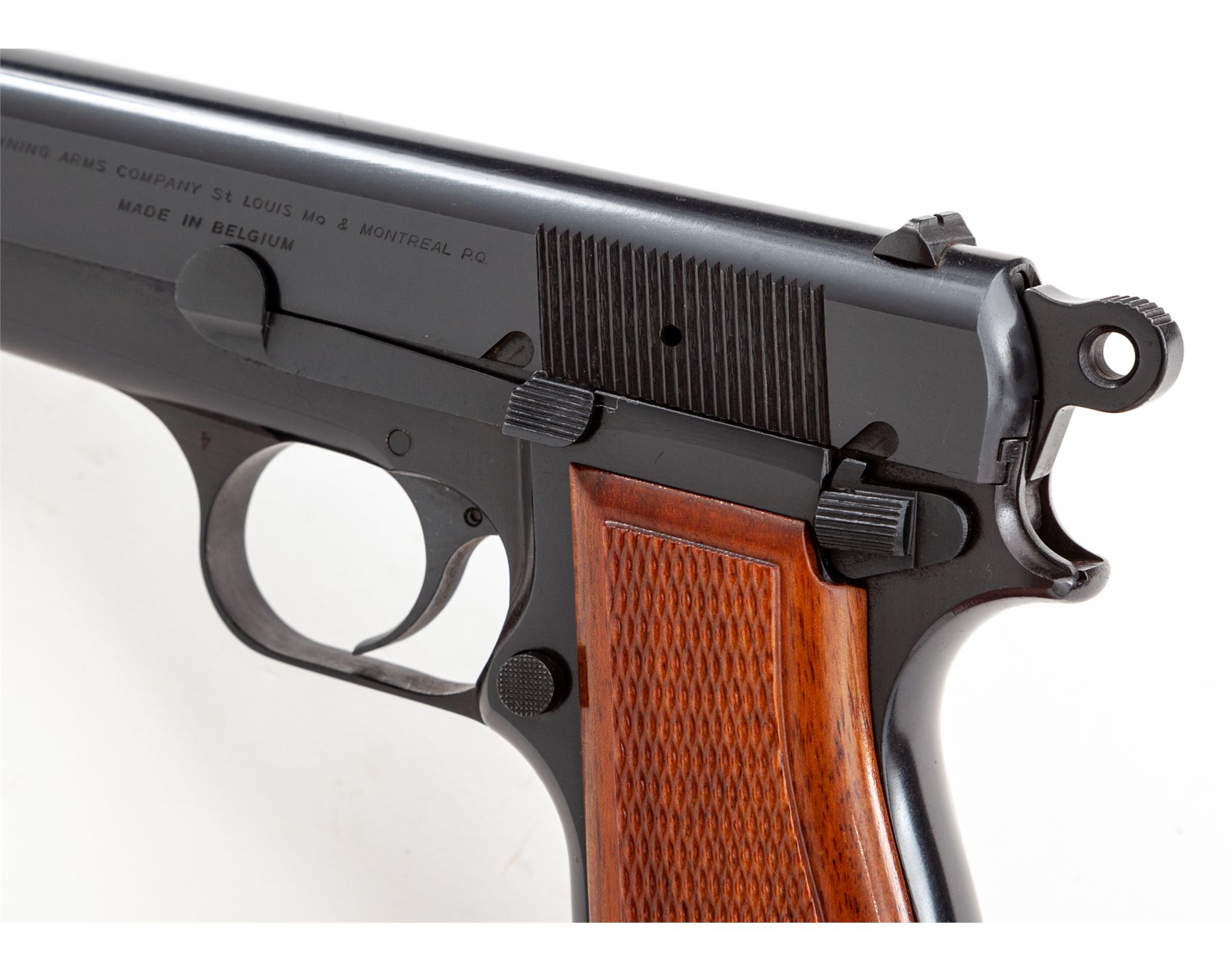 Browning Hi-Power Semi-Automatic Pistol, #69C8314, 9mm cal., 4-5/8'' barrel, dark blue finish, factory checkered red backed walnut grips, ring hammer, blade front sight, ''U''-notched rear sight. Included are three (3) 13-round magazines; two (2) with parkerized bodies, one is marked ''Made In Italy'', both with blued floorplates and one blued steel magazine with black plastic floorplate. Left side of slide is marked ''BROWNING ARMS COMPANY ST LOUIS MO & MONTREAL P.Q.'' and ''MADE IN BELGIUM''. Mfg'd 1969. Approx. 99% original blue finish remains and pistol rates as excellent overall; metal with only a few slight handling marks. Grips retain all of their gloss finish with only a few insignificant marks to the smooth borders, checkering shows no visible wear. Action is smooth, bore is bright with excellent rifling; inside and out a very clean high condition pistol. Est.: $750-$1,000. (Modern/PPT) (High-cap mags not available to Calif. residents.)