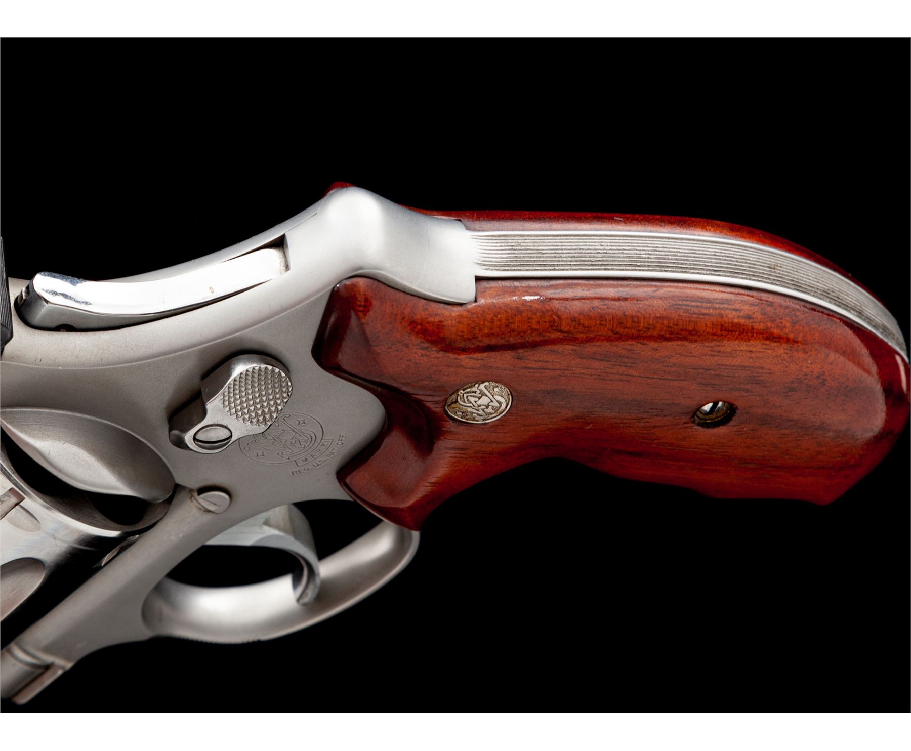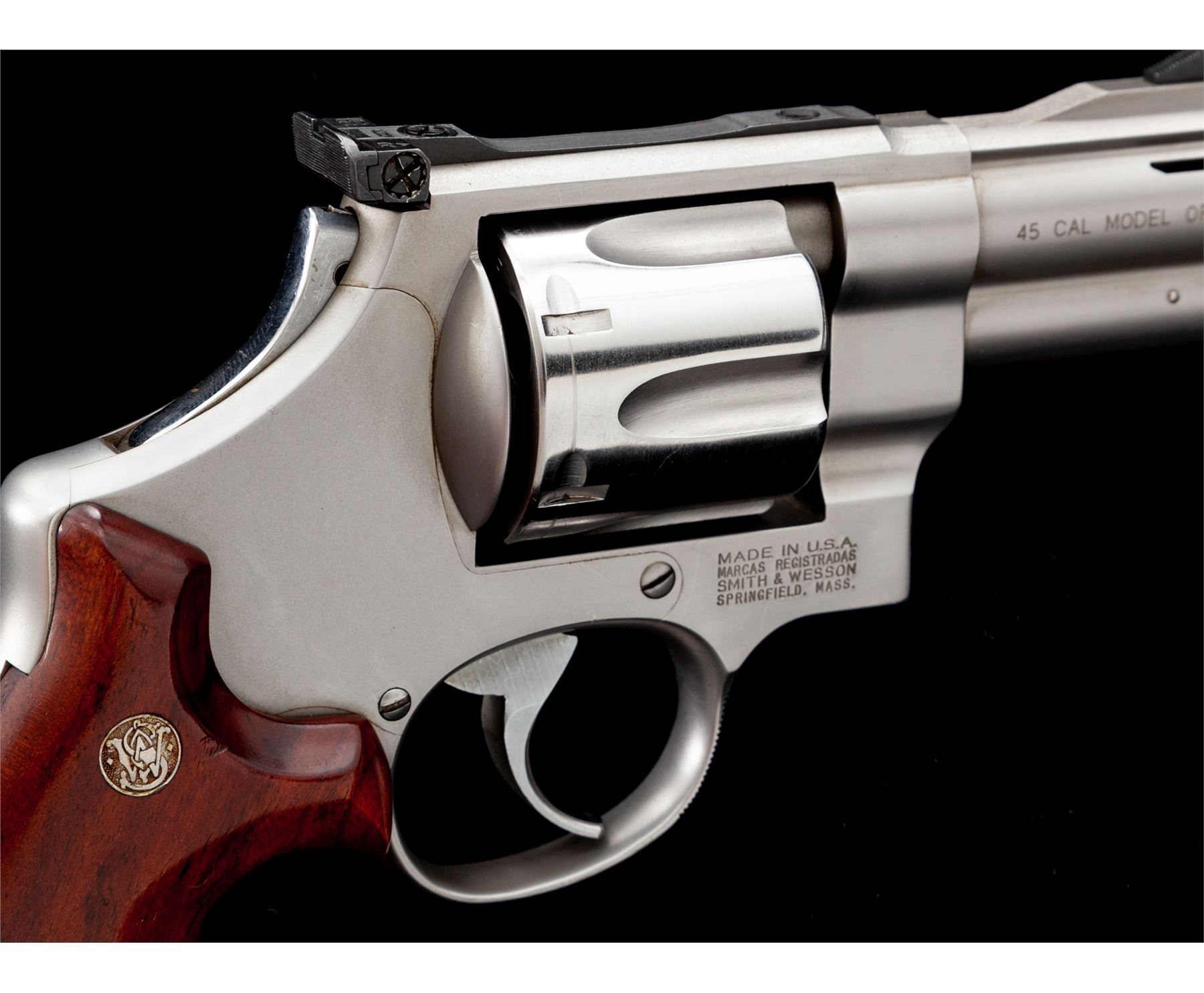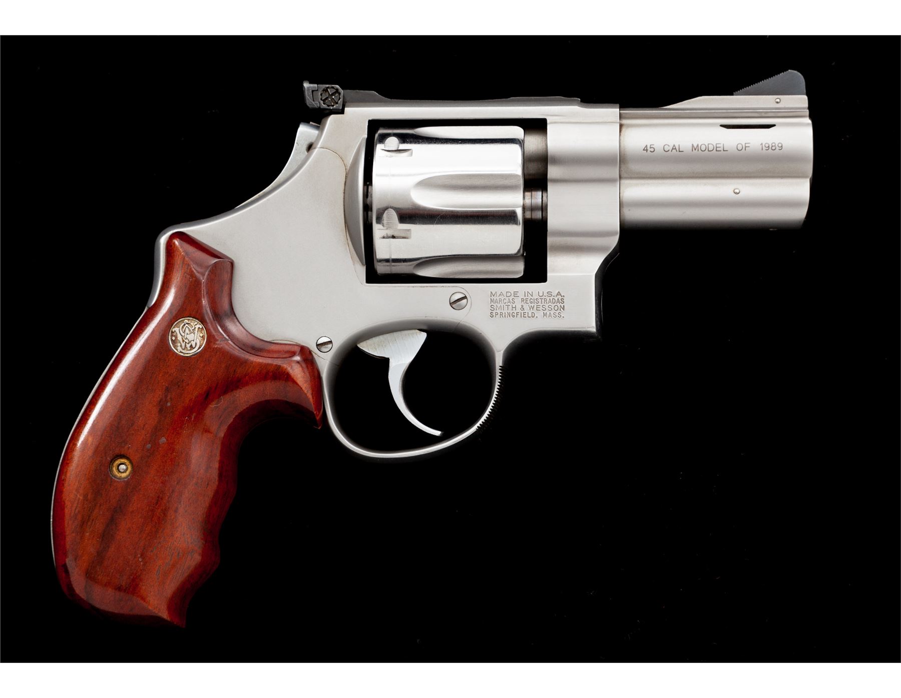 Custom Smith & Wesson Model 625-3 Double Action Revolver, #BEN4691, .45 ACP cal., 3'' ported barrel, stainless steel finish with bright polished cylinder, factory finger-grooved cocobolo grips, bobbed hammer, polished trigger, standard ramp front, and Millett adjustable rear sight. Action job, chamfered forcing cone and thinned grips with all custom work by George DeLio. Includes full moon clips and holders. Double action trigger letting off right at 6.10 lbs. Condition is excellent, appearing as new and unused. Est.: $800-$1,200. (Modern/PPT)