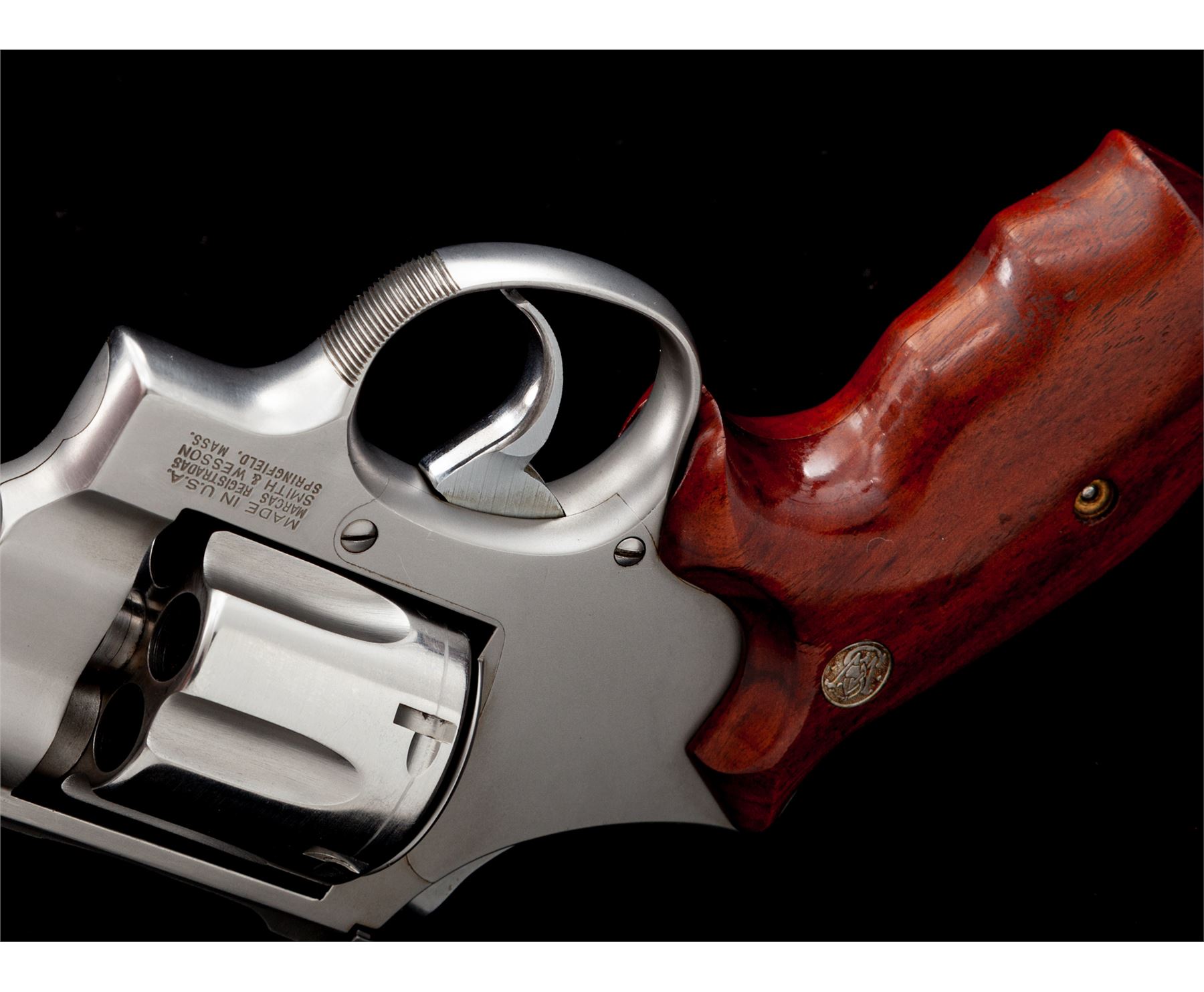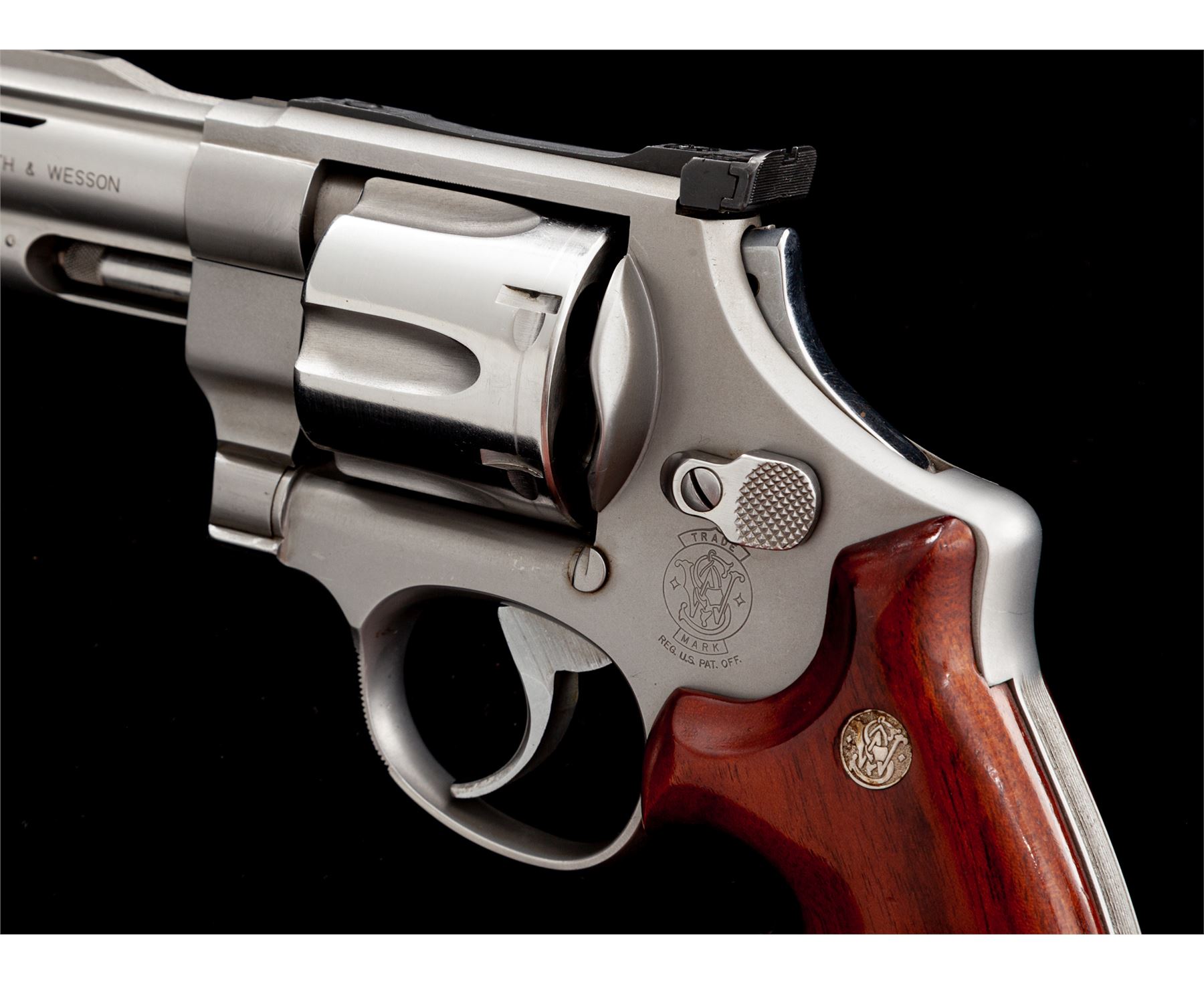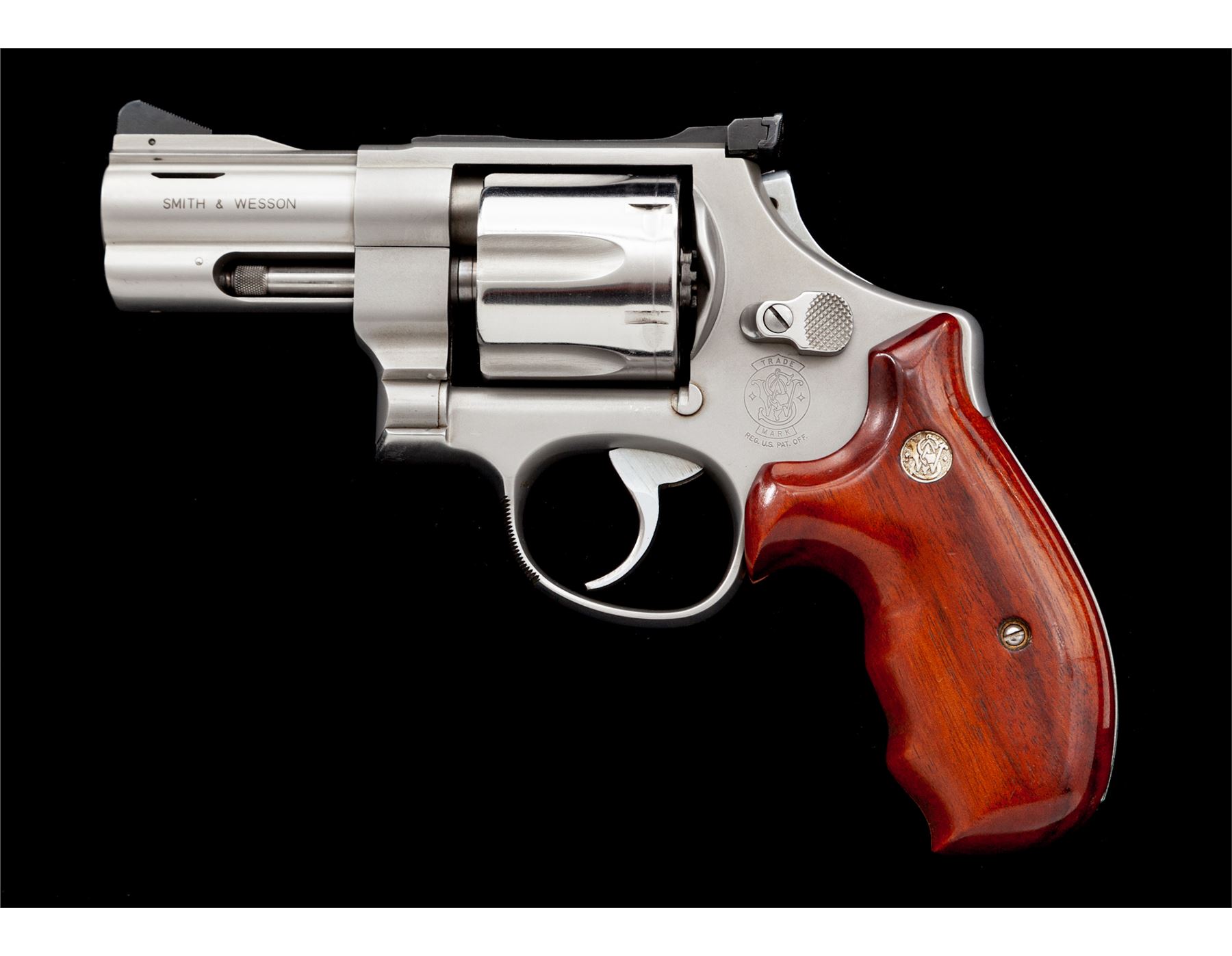 Custom Smith & Wesson Model 625-3 Double Action Revolver, #BEN4691, .45 ACP cal., 3'' ported barrel, stainless steel finish with bright polished cylinder, factory finger-grooved cocobolo grips, bobbed hammer, polished trigger, standard ramp front, and Millett adjustable rear sight. Action job, chamfered forcing cone and thinned grips with all custom work by George DeLio. Includes full moon clips and holders. Double action trigger letting off right at 6.10 lbs. Condition is excellent, appearing as new and unused. Est.: $800-$1,200. (Modern/PPT)