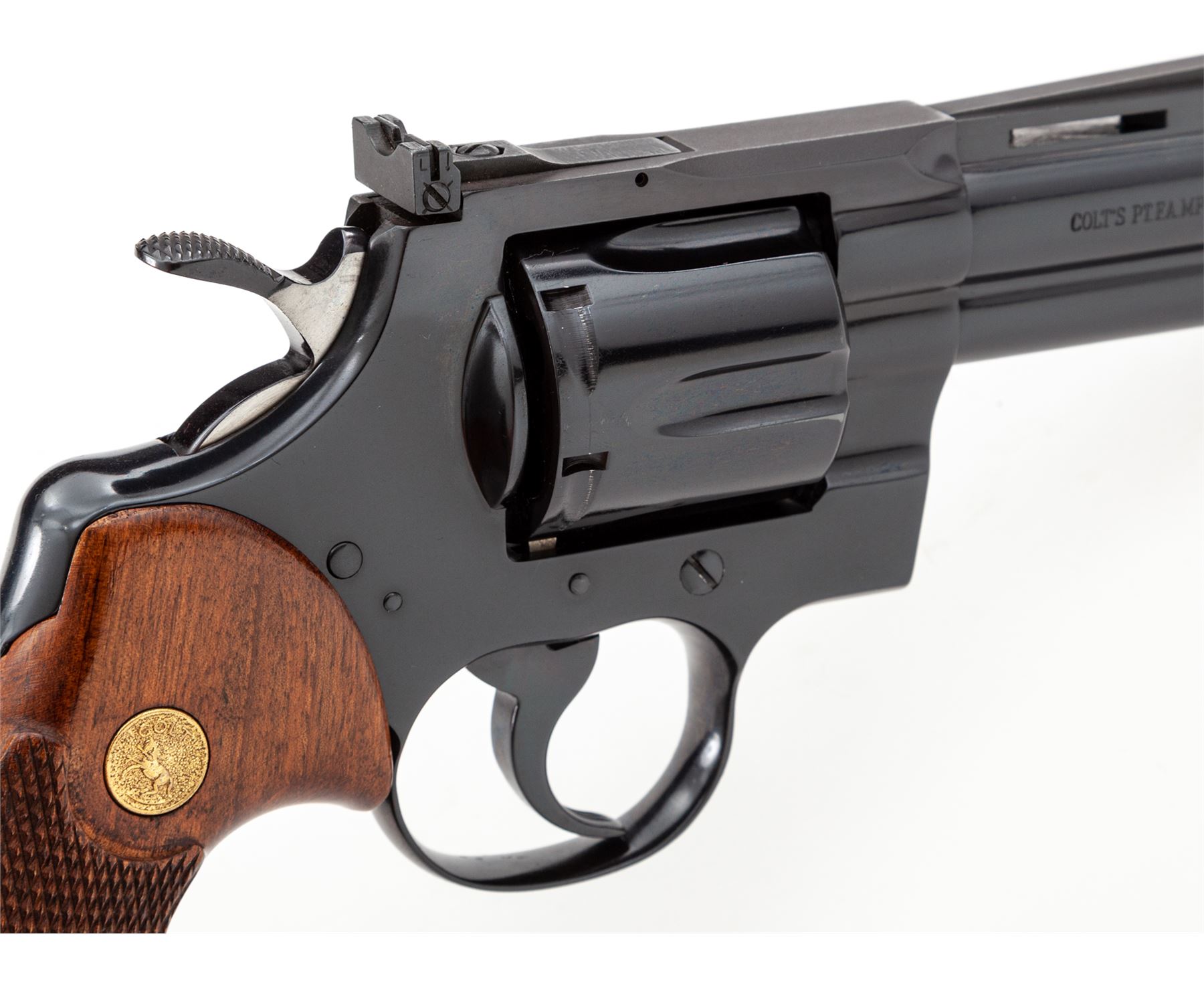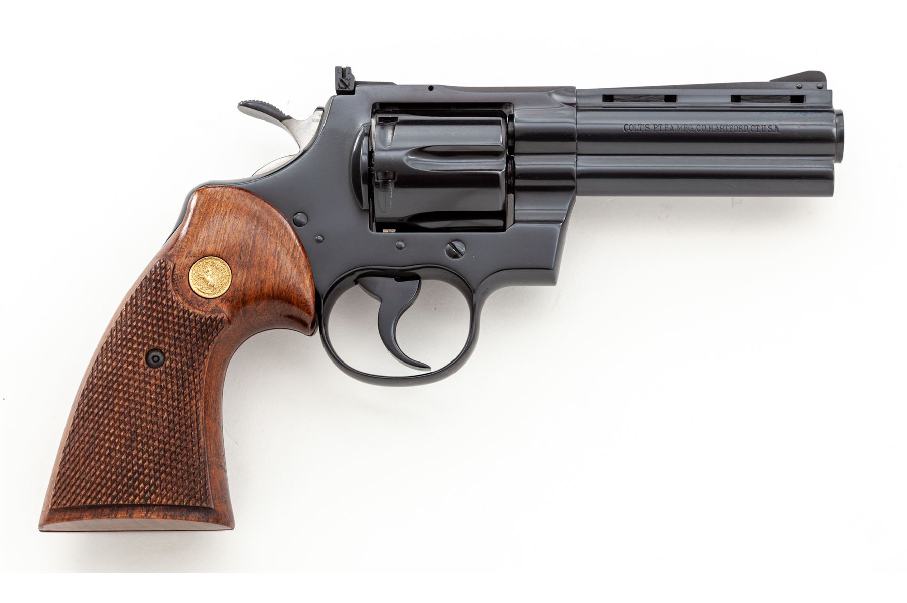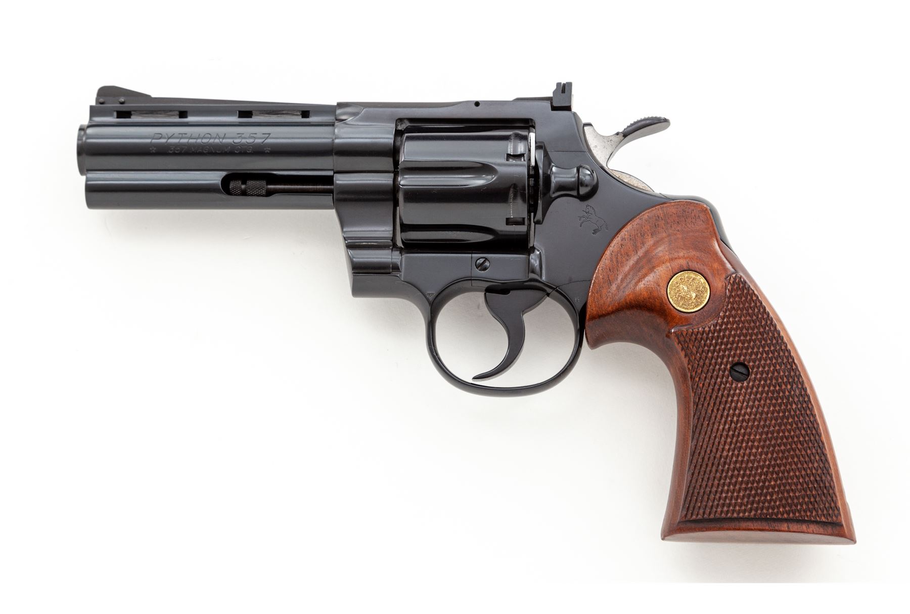 Late 60's Colt Python Double Action Revolver, #E1147, .357 mag. cal., 4'' vent rib barrel, blue finish, factory checkered walnut grips with gold Colt medallions, pinned blade front sight and fully adjustable square notched rear sight. Mfg'd 1969. Condition is excellent retaining approx. 98%+ factory blue, with very minor index mark to cylinder. Right side lower portion of frame and muzzle area with a few slight scratches, factory lettering is clear. Grips show just light wear and handling, checkering is sharp. Crisp action, bright bore rates excellent. Overall a nice example of a slightly used Python. Est.: $2,500-$3,000. (Modern/PPT)