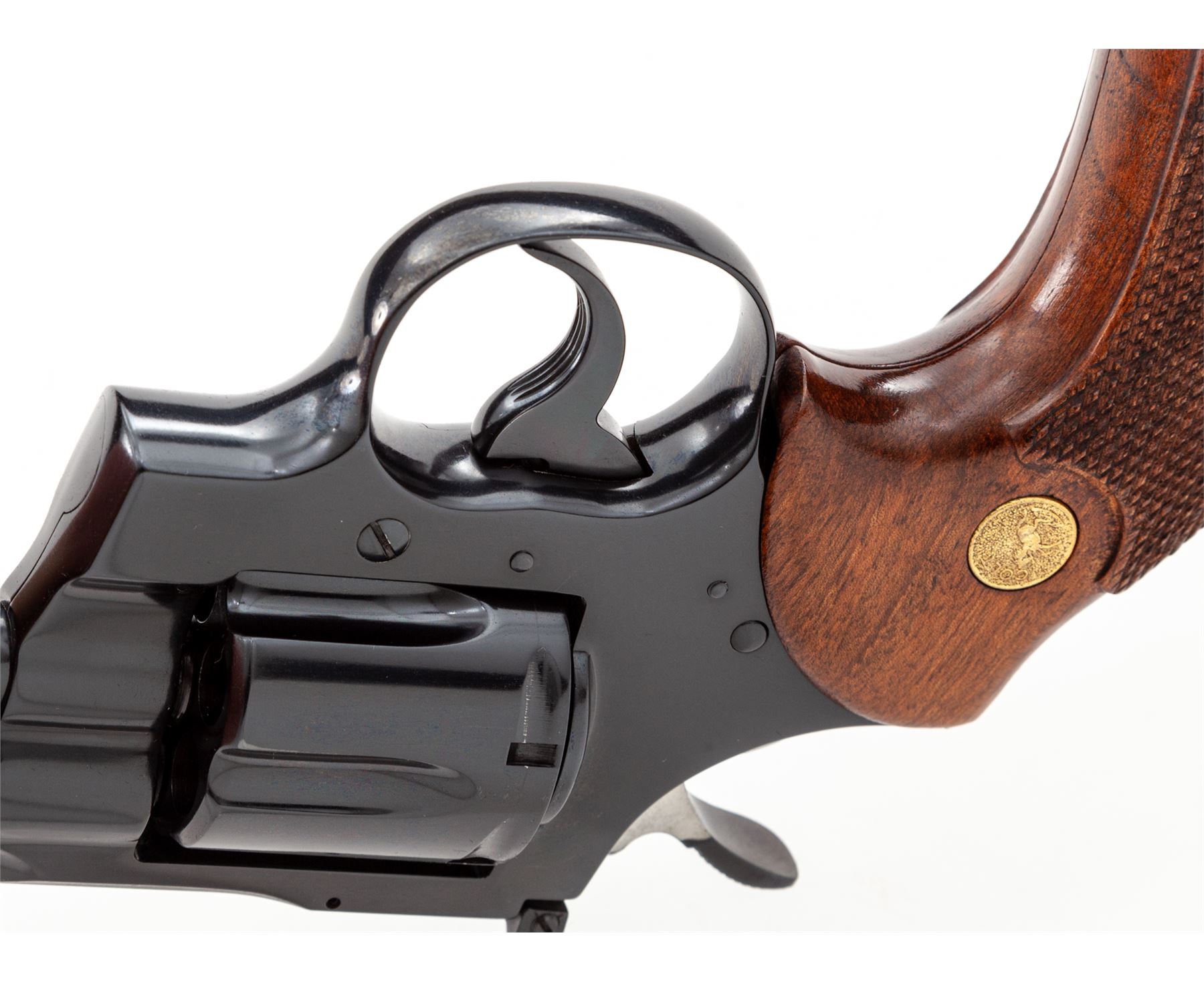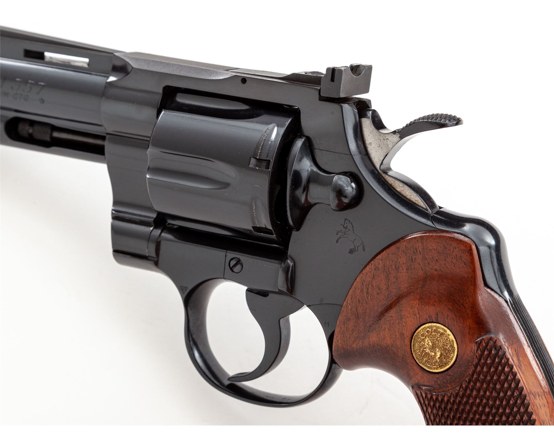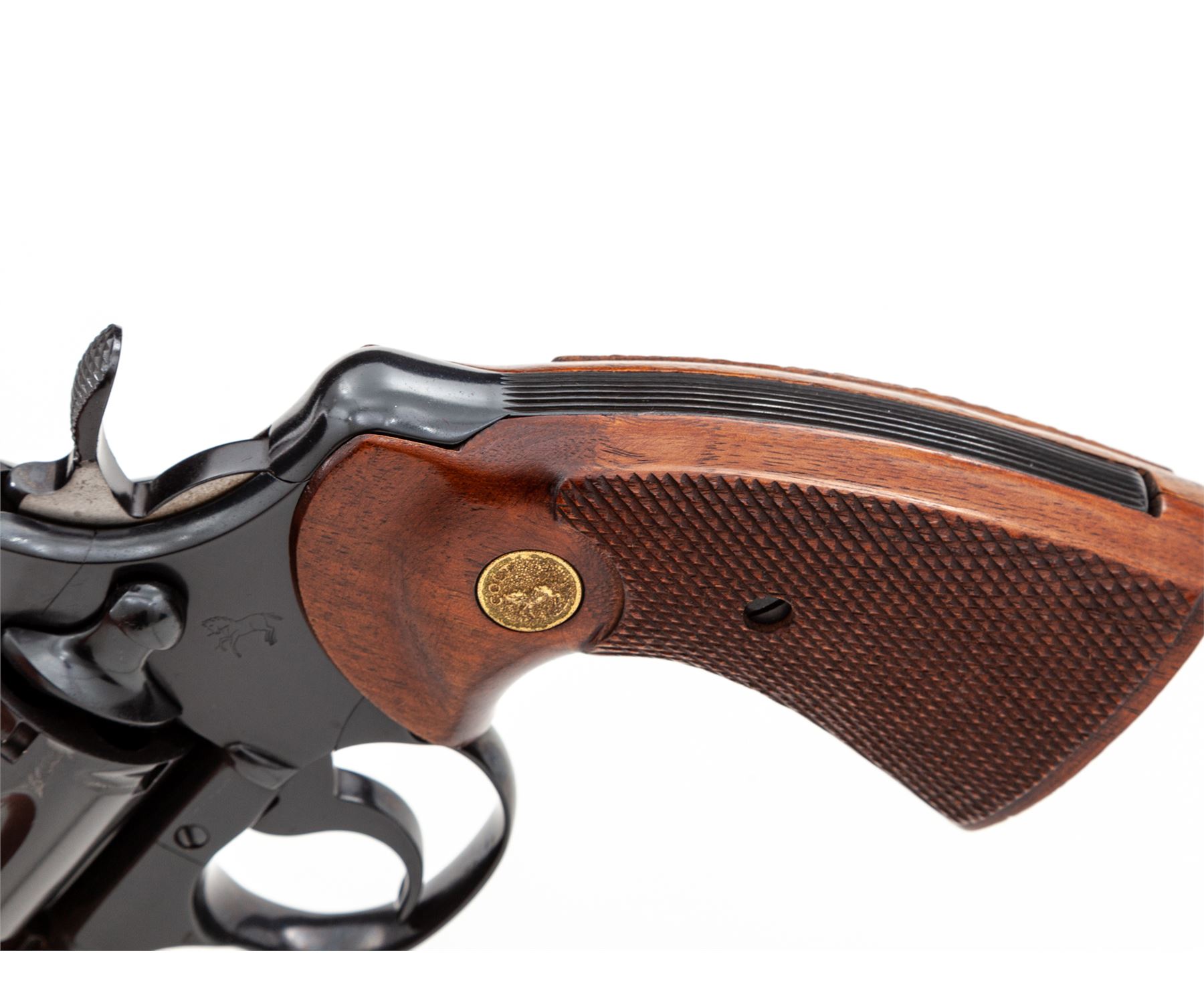 Late 60's Colt Python Double Action Revolver, #E1147, .357 mag. cal., 4'' vent rib barrel, blue finish, factory checkered walnut grips with gold Colt medallions, pinned blade front sight and fully adjustable square notched rear sight. Mfg'd 1969. Condition is excellent retaining approx. 98%+ factory blue, with very minor index mark to cylinder. Right side lower portion of frame and muzzle area with a few slight scratches, factory lettering is clear. Grips show just light wear and handling, checkering is sharp. Crisp action, bright bore rates excellent. Overall a nice example of a slightly used Python. Est.: $2,500-$3,000. (Modern/PPT)