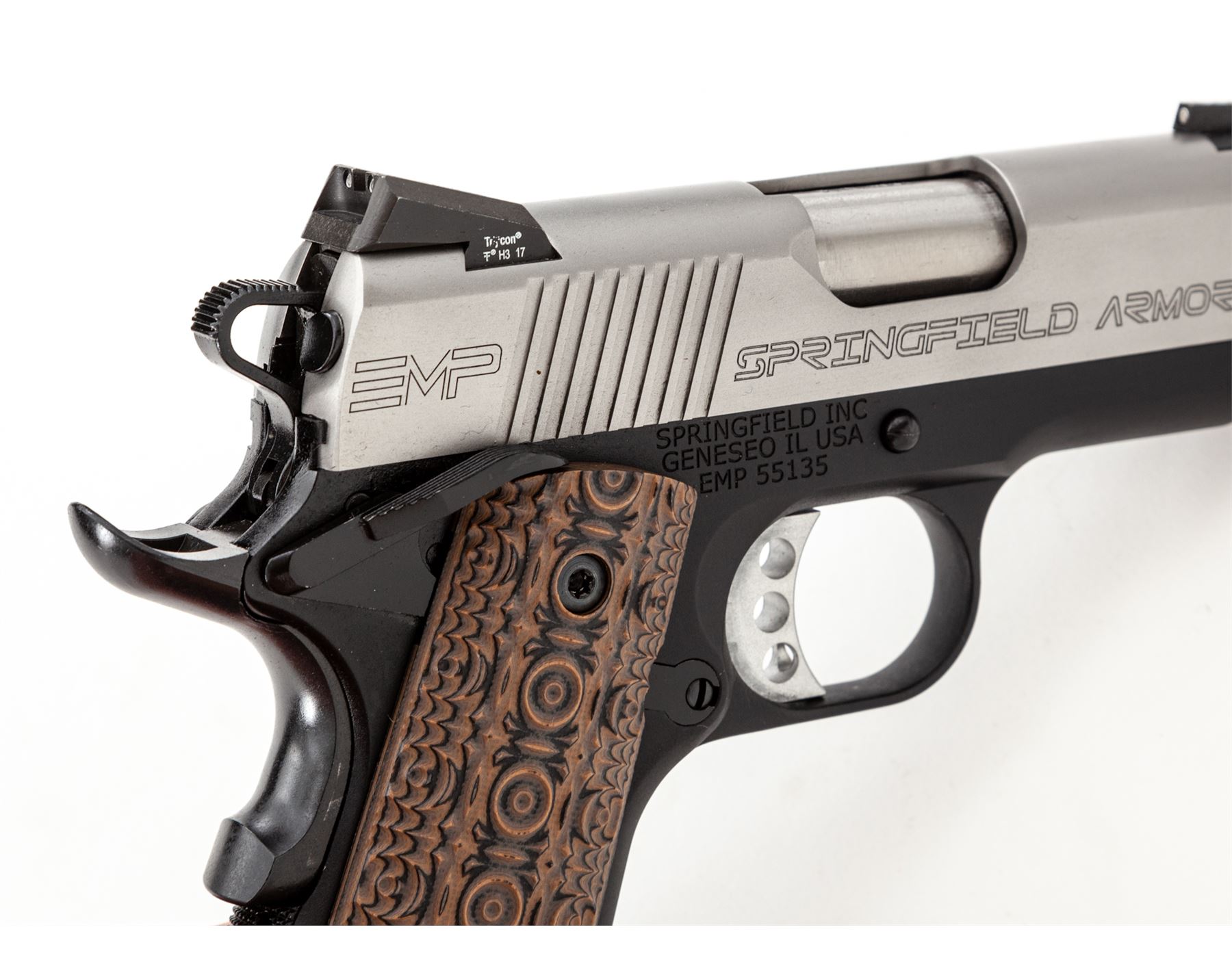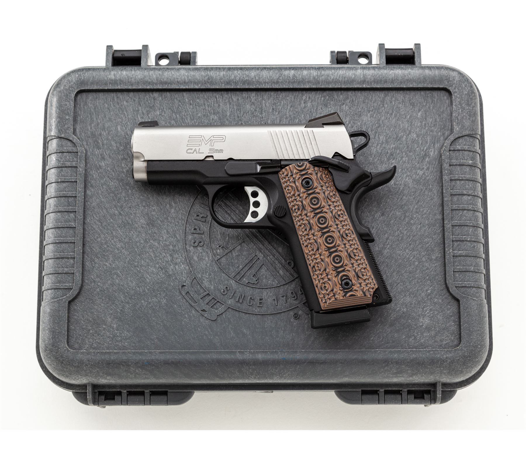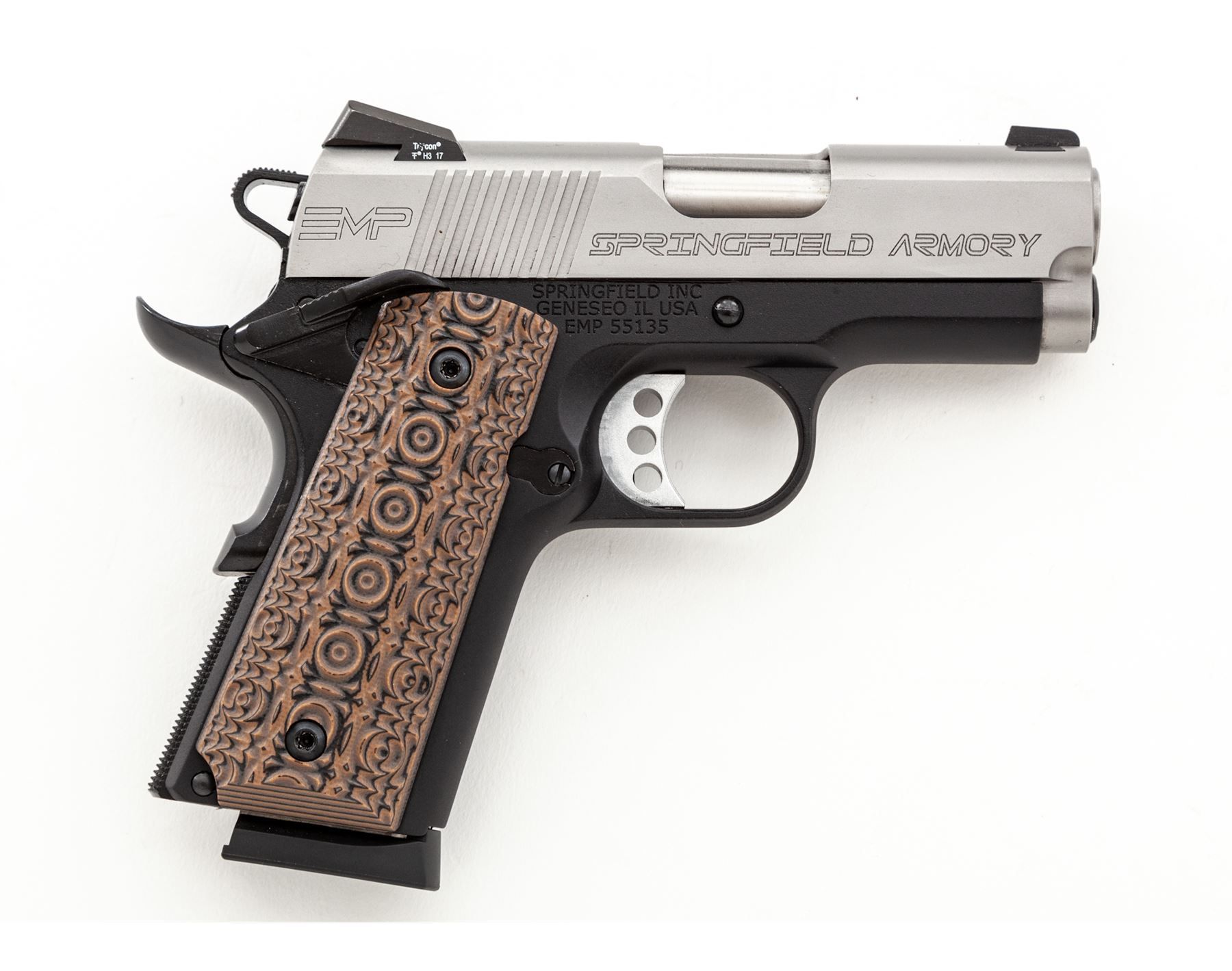 Springfield Armory EMP Lightweight Bitone Semi-Automatic Pistol, #EMP55135, 9mm cal., 3'' bull barrel, satin stainless slide, anodized black aluminum alloy frame, Aztec Pattern G10 grips, by VZ Grips, 3-dot Trijicon night sights, skeletonized hammer and trigger, ambidextrous thumb safety, with three (3) EMP magazines. Included are the original checkered double diamond pattern cocobolo grips. In hard shell Springfield Armory case with matching end label and the owner's manual. Condition is excellent, appearing as new. Approx. 99%+ factory finish remains showing only a few insignificant handling marks. Grips also appear as new. Smooth action and mirror bright bore. Original grips are also as new. Est.: $800-$1,200. (Modern/PPT)