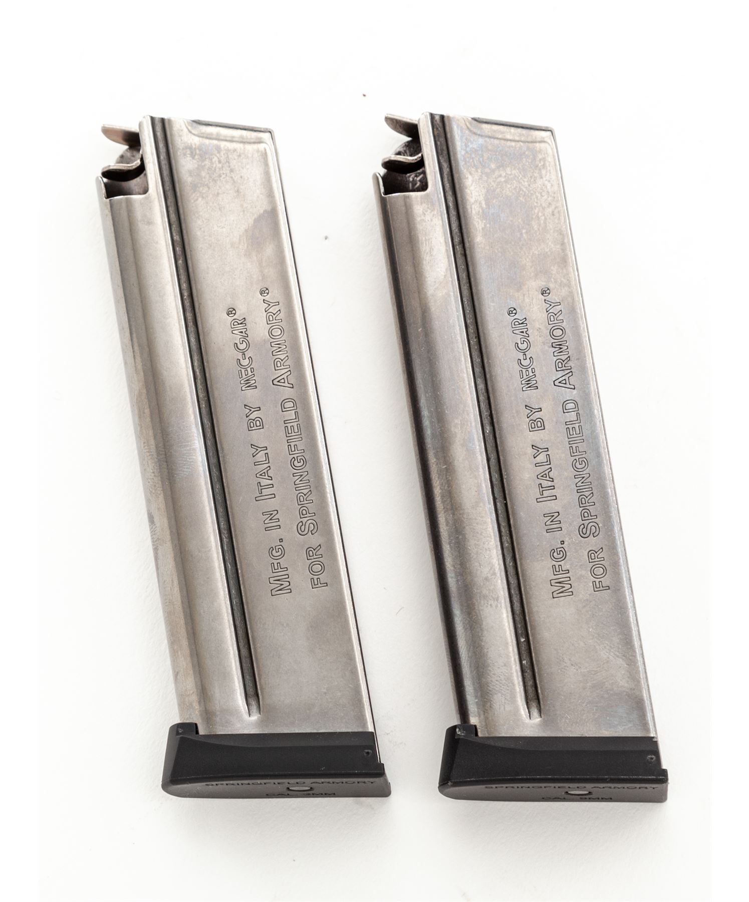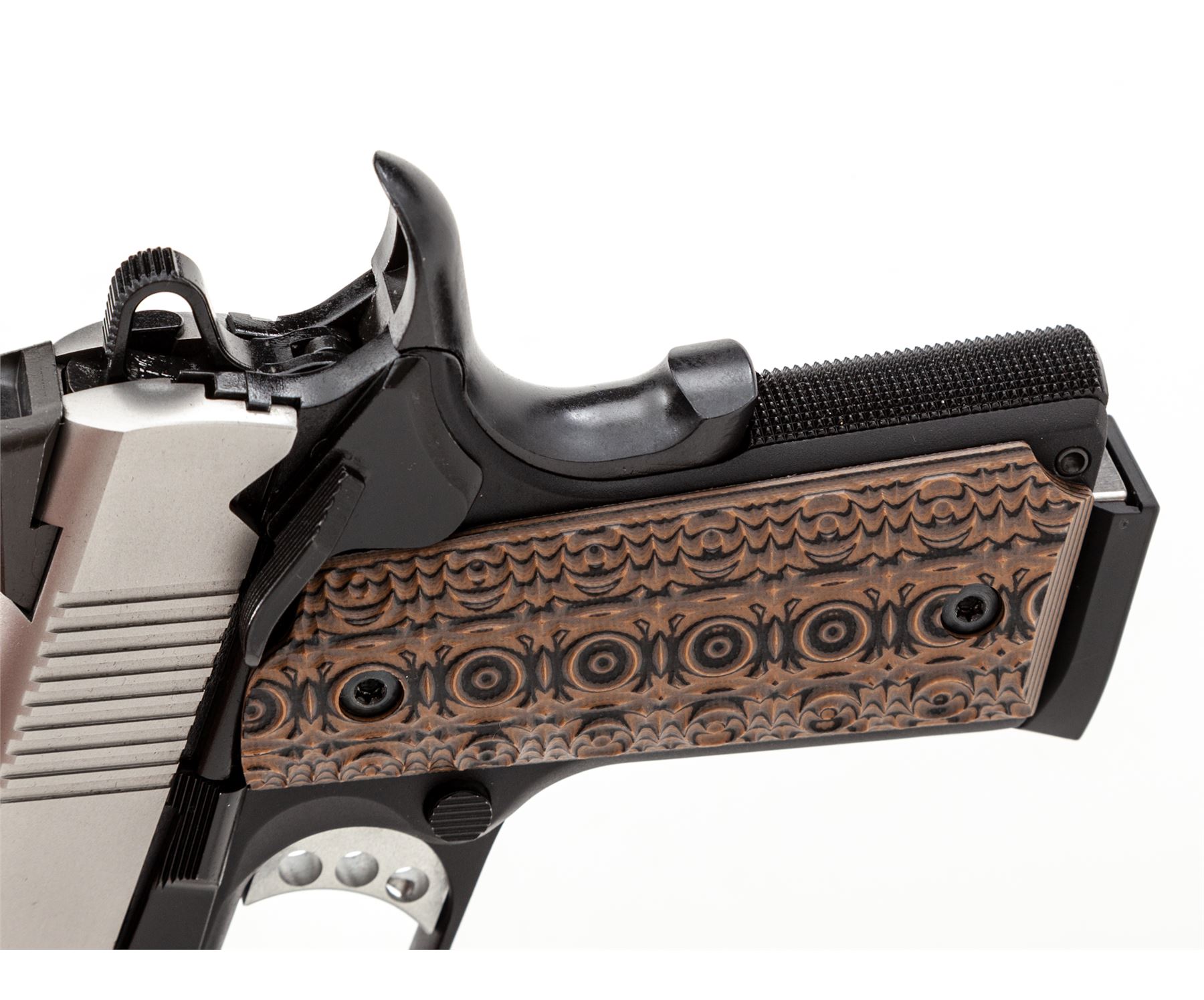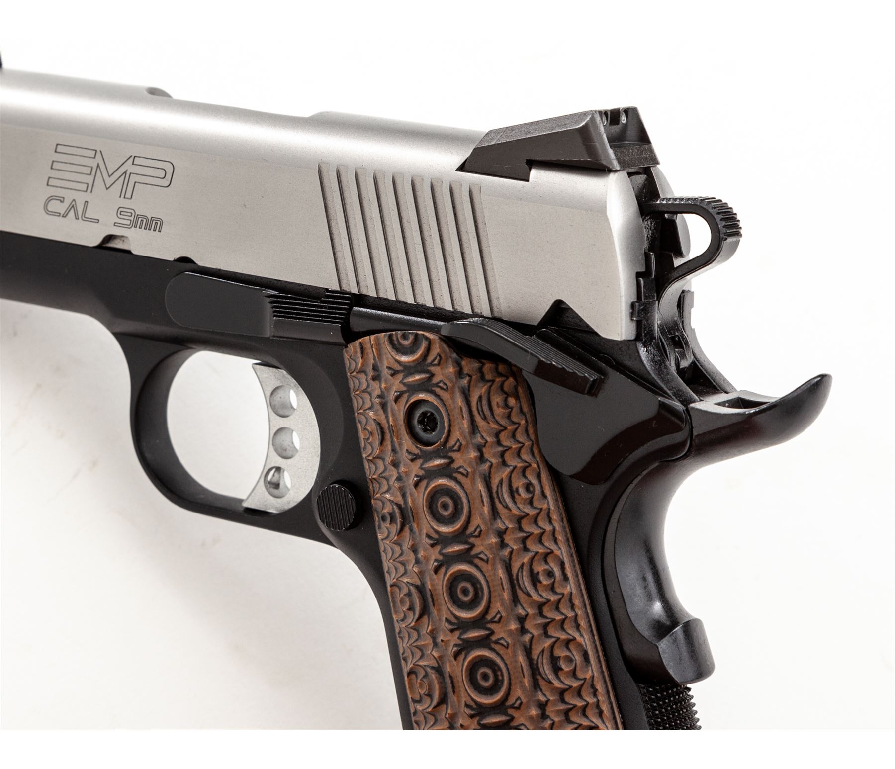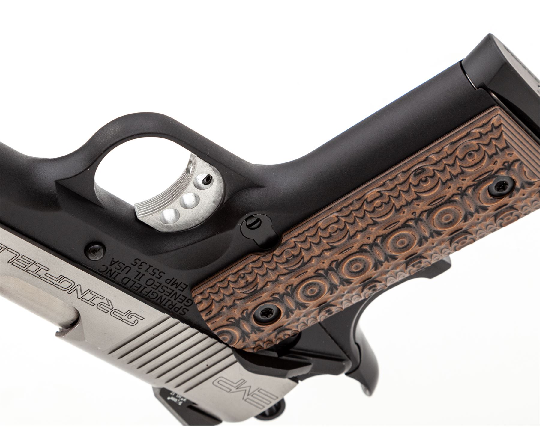 Springfield Armory EMP Lightweight Bitone Semi-Automatic Pistol, #EMP55135, 9mm cal., 3'' bull barrel, satin stainless slide, anodized black aluminum alloy frame, Aztec Pattern G10 grips, by VZ Grips, 3-dot Trijicon night sights, skeletonized hammer and trigger, ambidextrous thumb safety, with three (3) EMP magazines. Included are the original checkered double diamond pattern cocobolo grips. In hard shell Springfield Armory case with matching end label and the owner's manual. Condition is excellent, appearing as new. Approx. 99%+ factory finish remains showing only a few insignificant handling marks. Grips also appear as new. Smooth action and mirror bright bore. Original grips are also as new. Est.: $800-$1,200. (Modern/PPT)