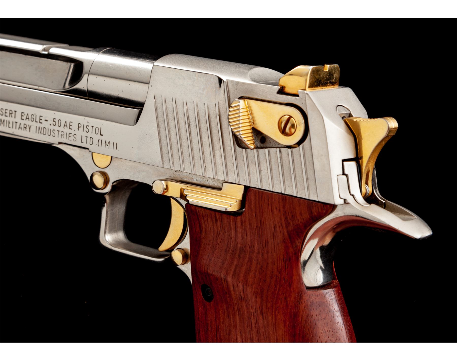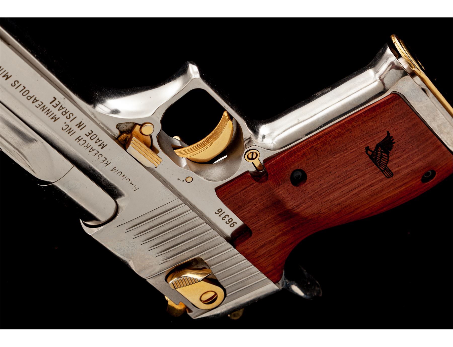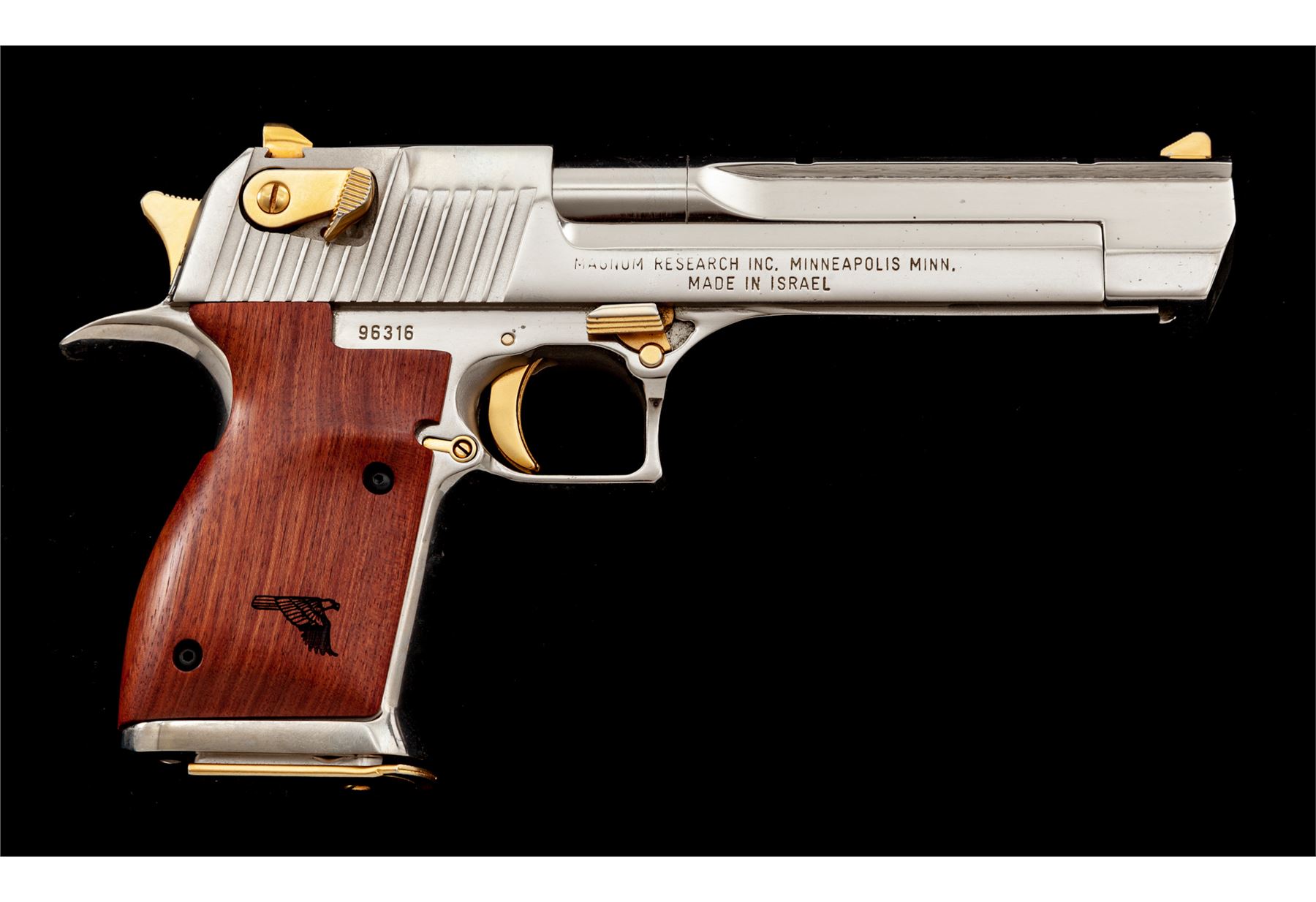 Factory Gold and Nickel-Plated Israeli Desert Eagle Semi-Automatic Pistol, by IMI, #96316, .50 AE cal., 6.5'' barrel, nickel finish with gold small parts, Bubinga target stocks, with one gold and nickel-plated magazine, in factory walnut eagle case, with stand, original box, manual and shooting instructions, dating from approx. 1994. Condition is excellent, appearing as new and unfired, with some minor thinning to gold-plated components. Est.: $1,400-$1,800. (Modern/PPT)