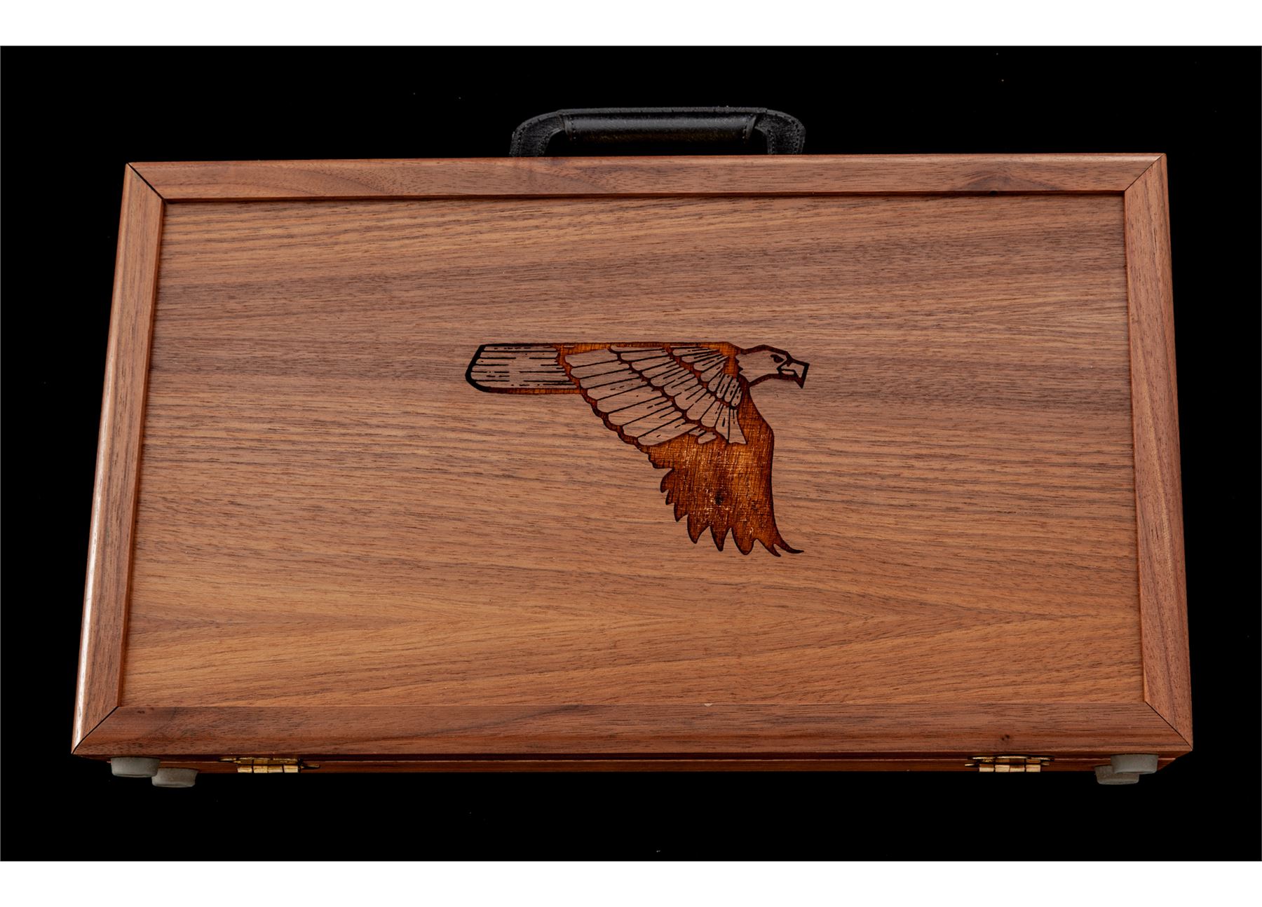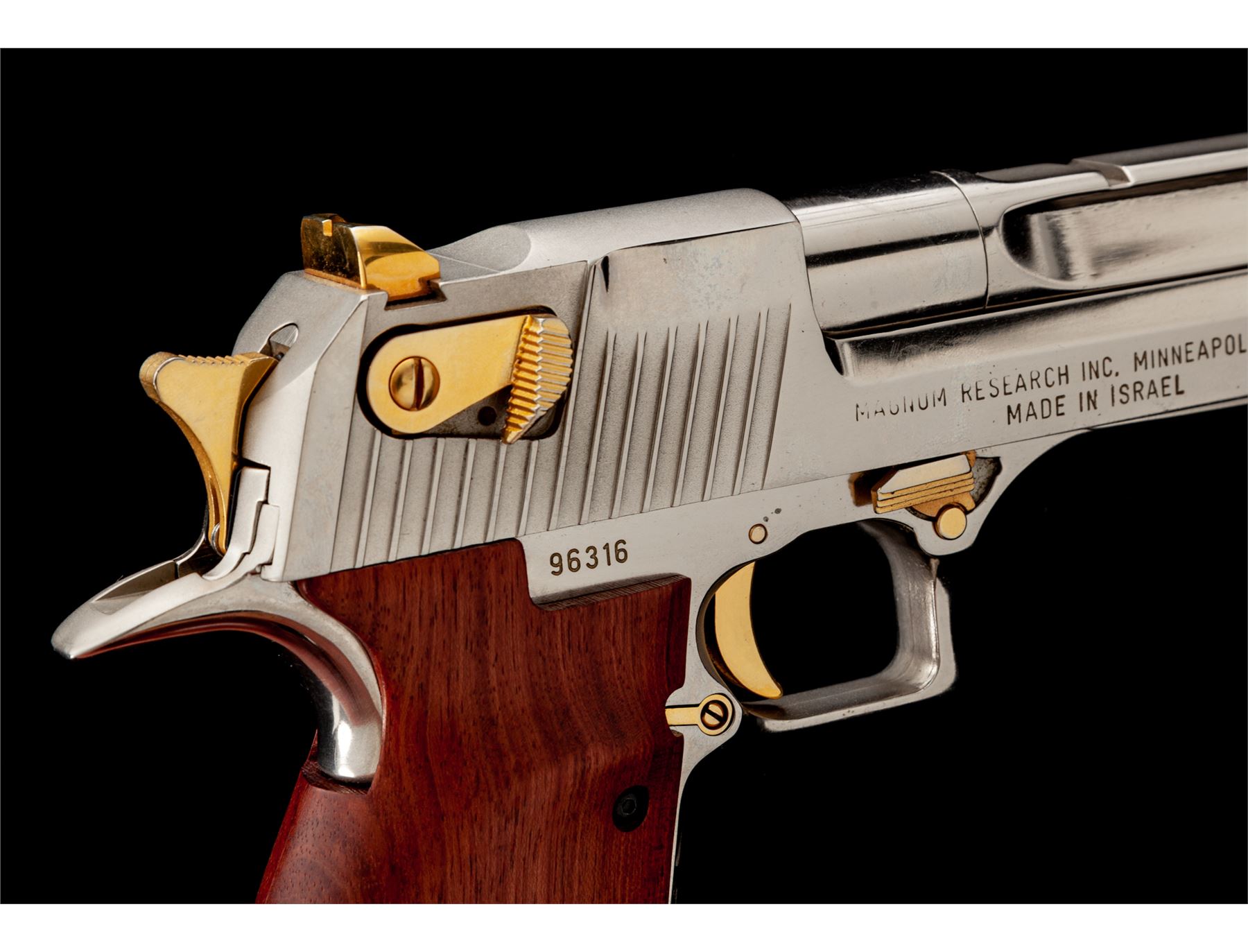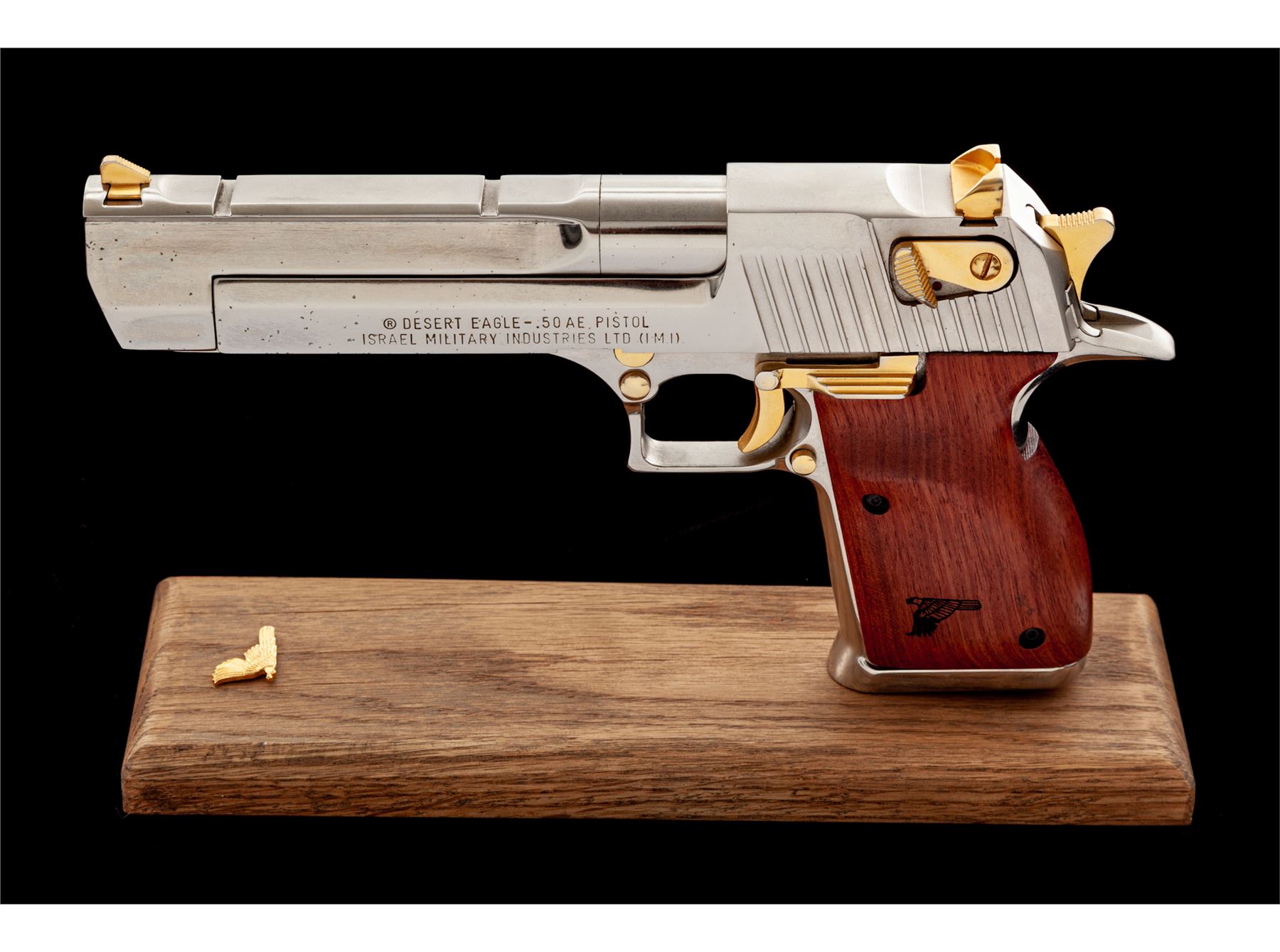 Factory Gold and Nickel-Plated Israeli Desert Eagle Semi-Automatic Pistol, by IMI, #96316, .50 AE cal., 6.5'' barrel, nickel finish with gold small parts, Bubinga target stocks, with one gold and nickel-plated magazine, in factory walnut eagle case, with stand, original box, manual and shooting instructions, dating from approx. 1994. Condition is excellent, appearing as new and unfired, with some minor thinning to gold-plated components. Est.: $1,400-$1,800. (Modern/PPT)
