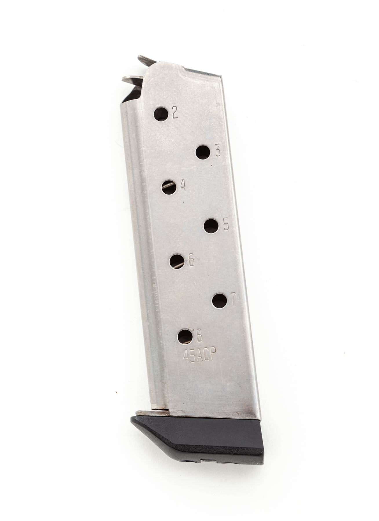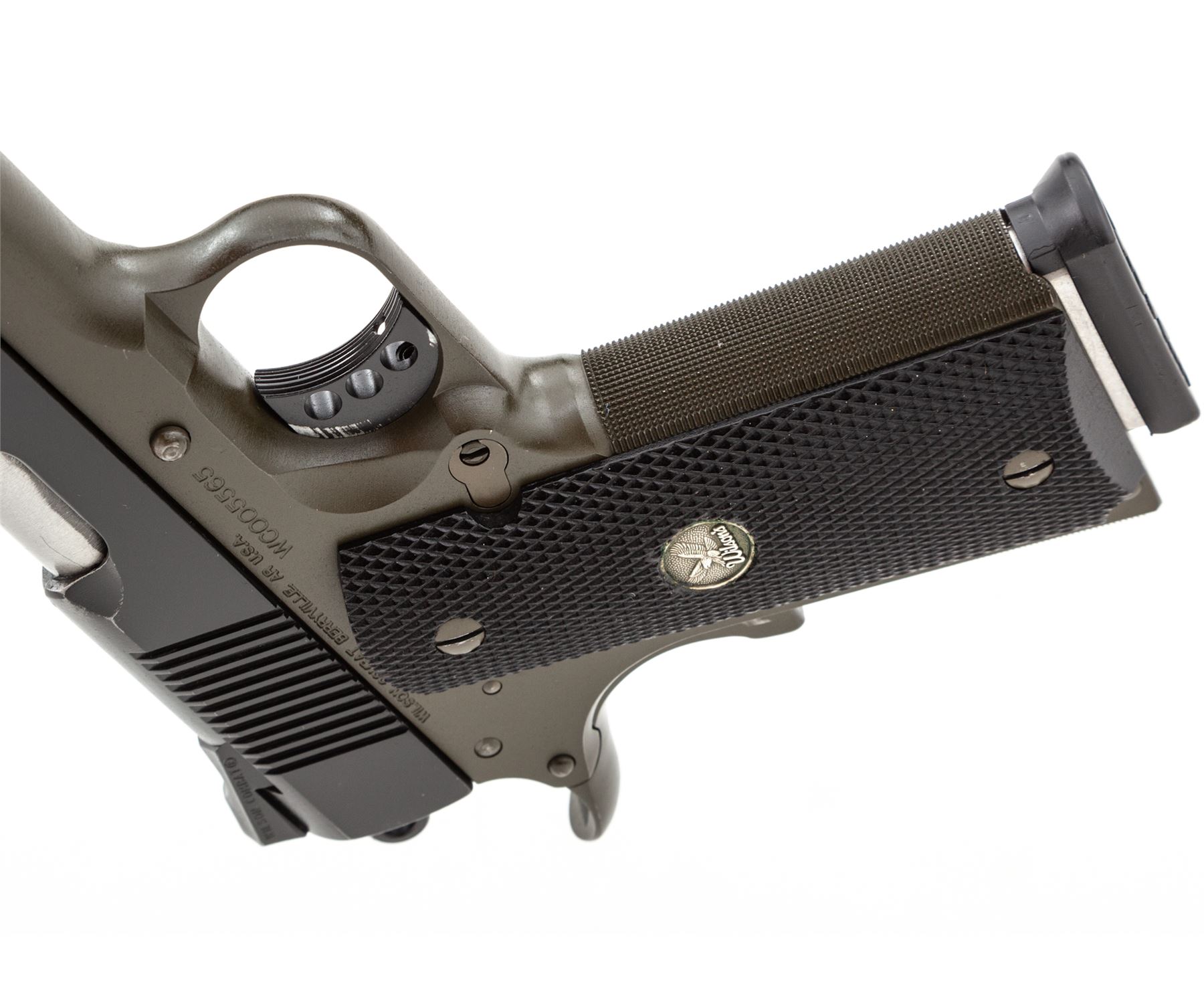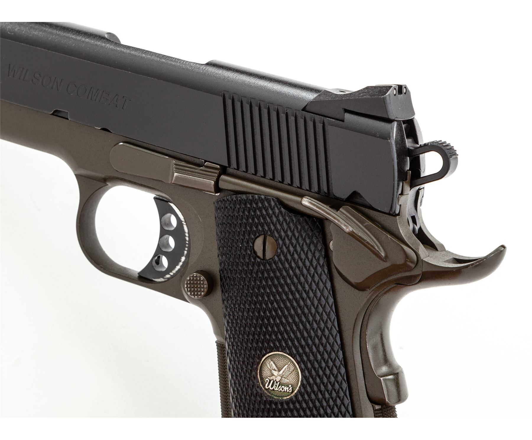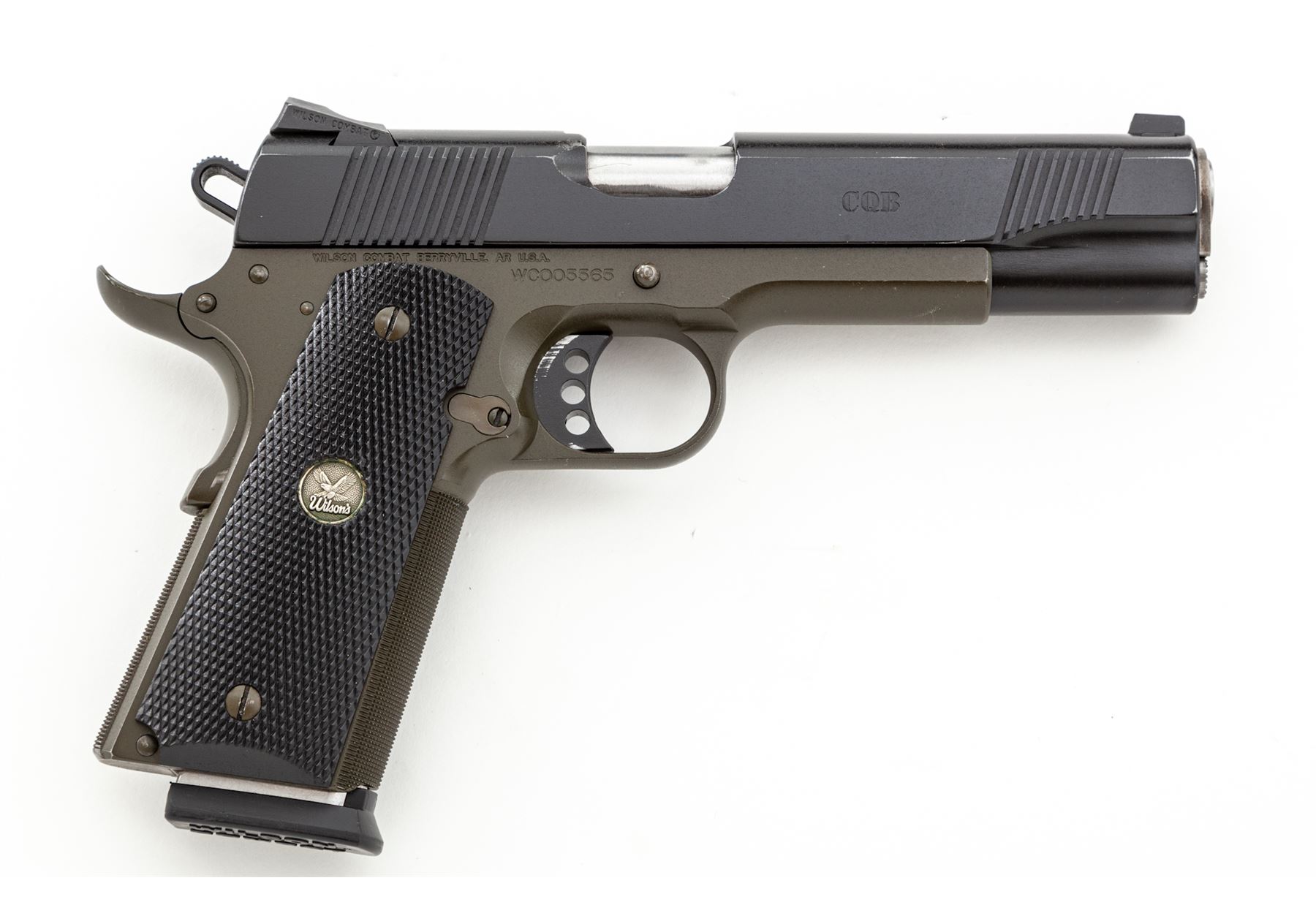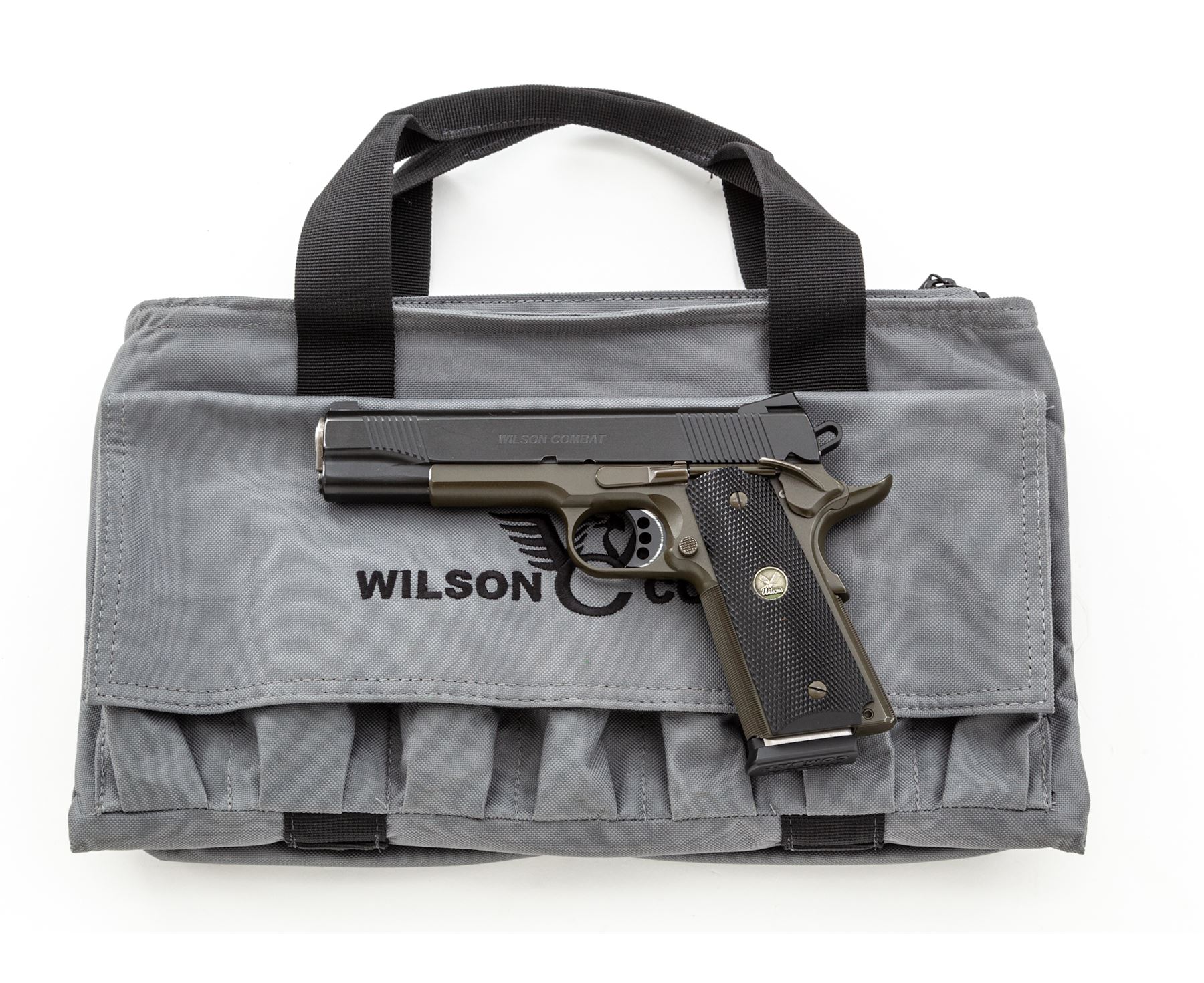 Two-Tone Wilson Combat CQB Semi-Automatic Pistol, #WC005565, .45 ACP cal., 5'' stainless barrel and bushing, black slide, green frame, checkered black composite grips with WC medallions, front and rear slide serrations, skeletonized hammer and trigger, finely checkered front and back strap, low profile thumb safety, 3-dot fixed night sights, one 8-round Wilson Combat magazine, and one 8-round McCormick magazine. Included is a padded Wilson Combat range bag. Overall condition is excellent with approx. 97%-98% original green and black finish remaining. Light wear to the highpoints of the slide and near the chamber account for a majority of the finish loss. Grips appear as new. Night sights are dim. Nice smooth action; bright bore with excellent defined rifling. Est.: $2,000-$2,500. (Modern/PPT)