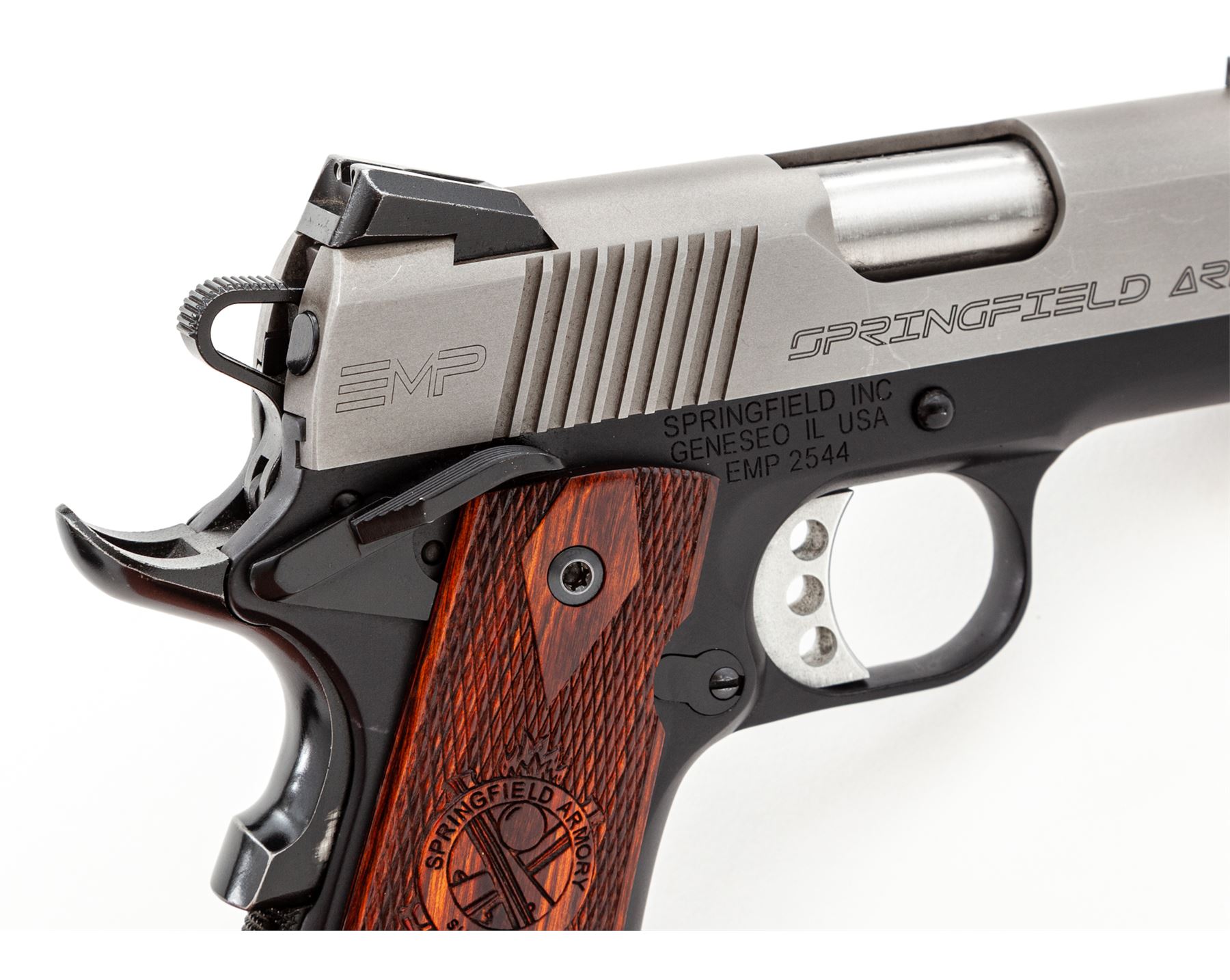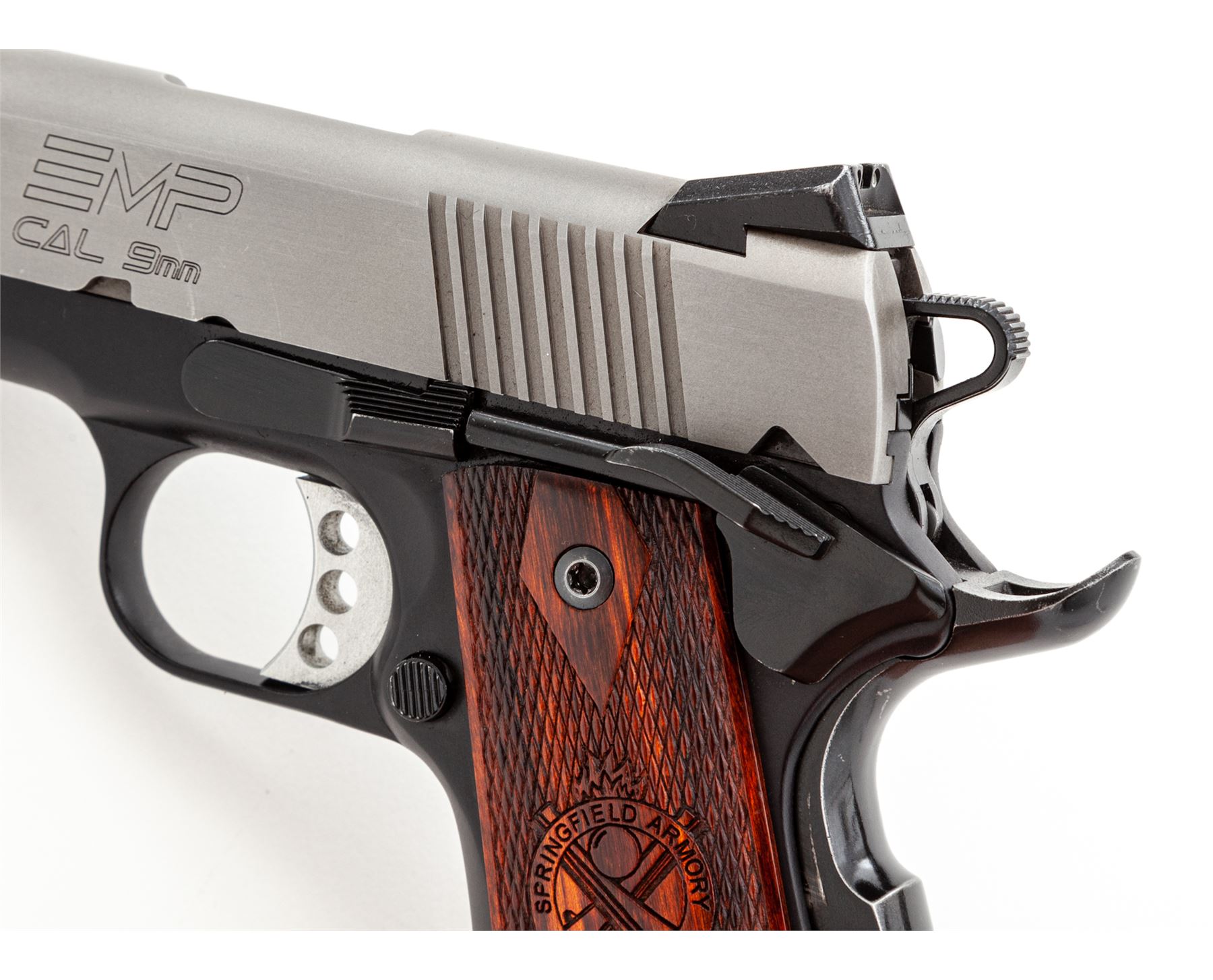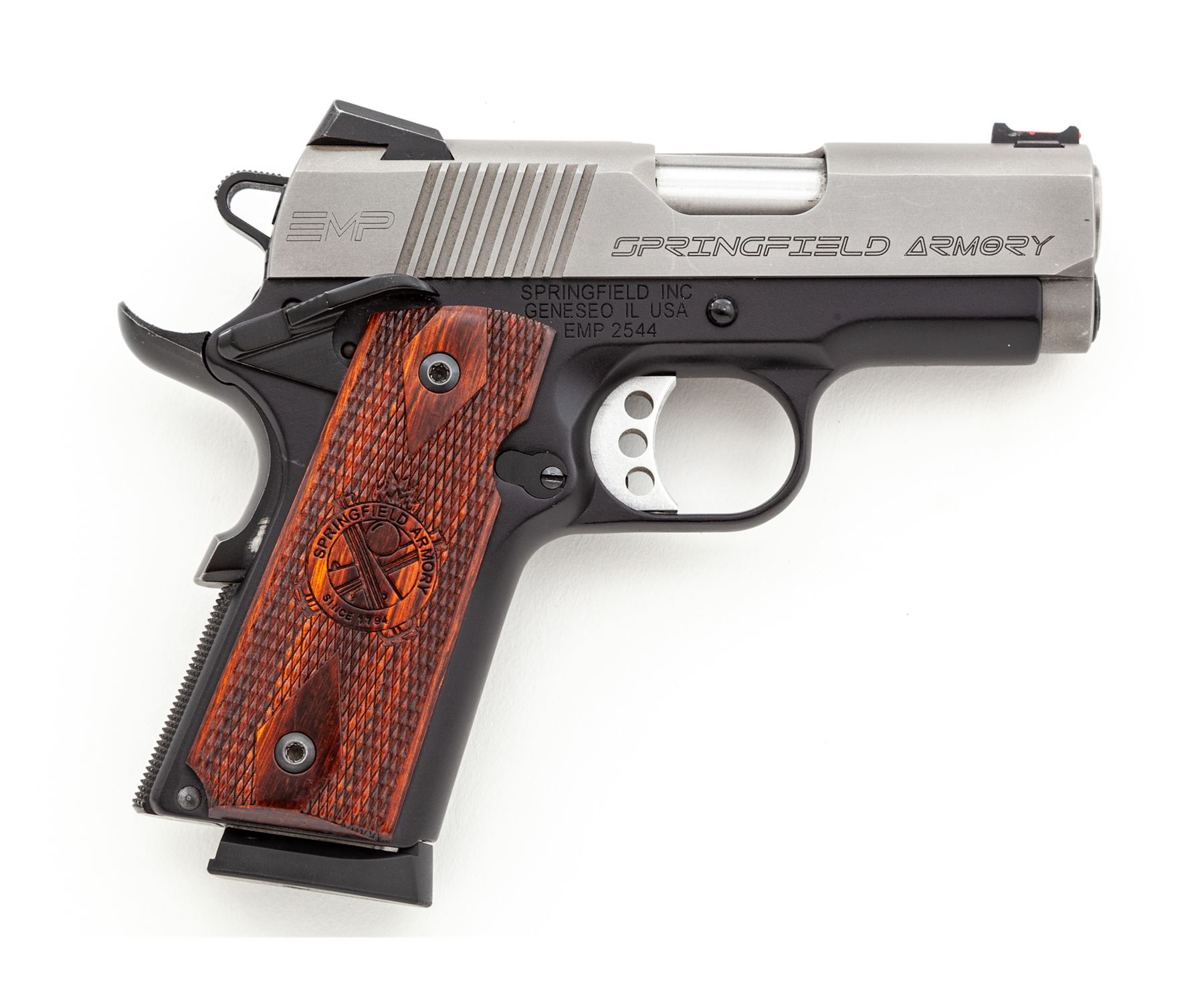 Springfield Armory Model EMP Compact Semi-Automatic Pistol, with four (4) magazines, #EMP2544, 9mm cal., 3'' barrel, matte stainless slide, black anodized aluminum alloy frame, factory checkered Cocobolo grips with Springfield Armory logo, ambidextrous thumb safety, skeletonized hammer and trigger, red fiber optic front sight, two-dot night sights, with four (4) factory nine shot magazines. In hard plastic SA marked case that has no firearms identification label, with a right-hand black polymer Springfield holster. In fine overall condition showing normal signs of light carry wear and range use. Matte slide with some mild scuffs and rub marks from the holster, frame retains approx. 97% of the original black finish with thinning to the high points of the grip safety. Grips are excellent with only a few small handling marks. Smooth action, near excellent bore. Outside of the case with the serial number written in paint pen. Est.: $600-$800. (Modern/PPT)