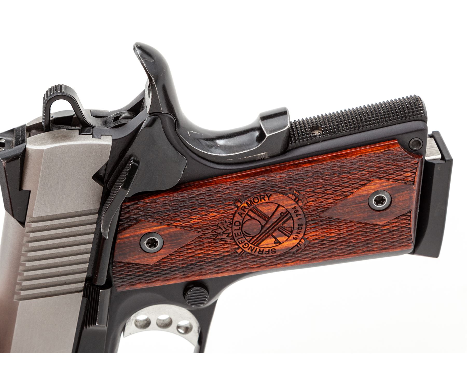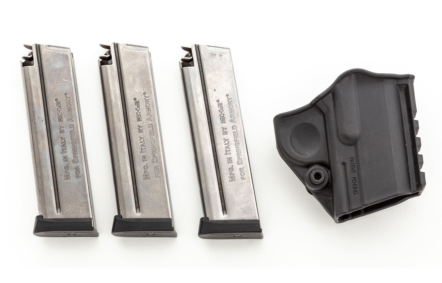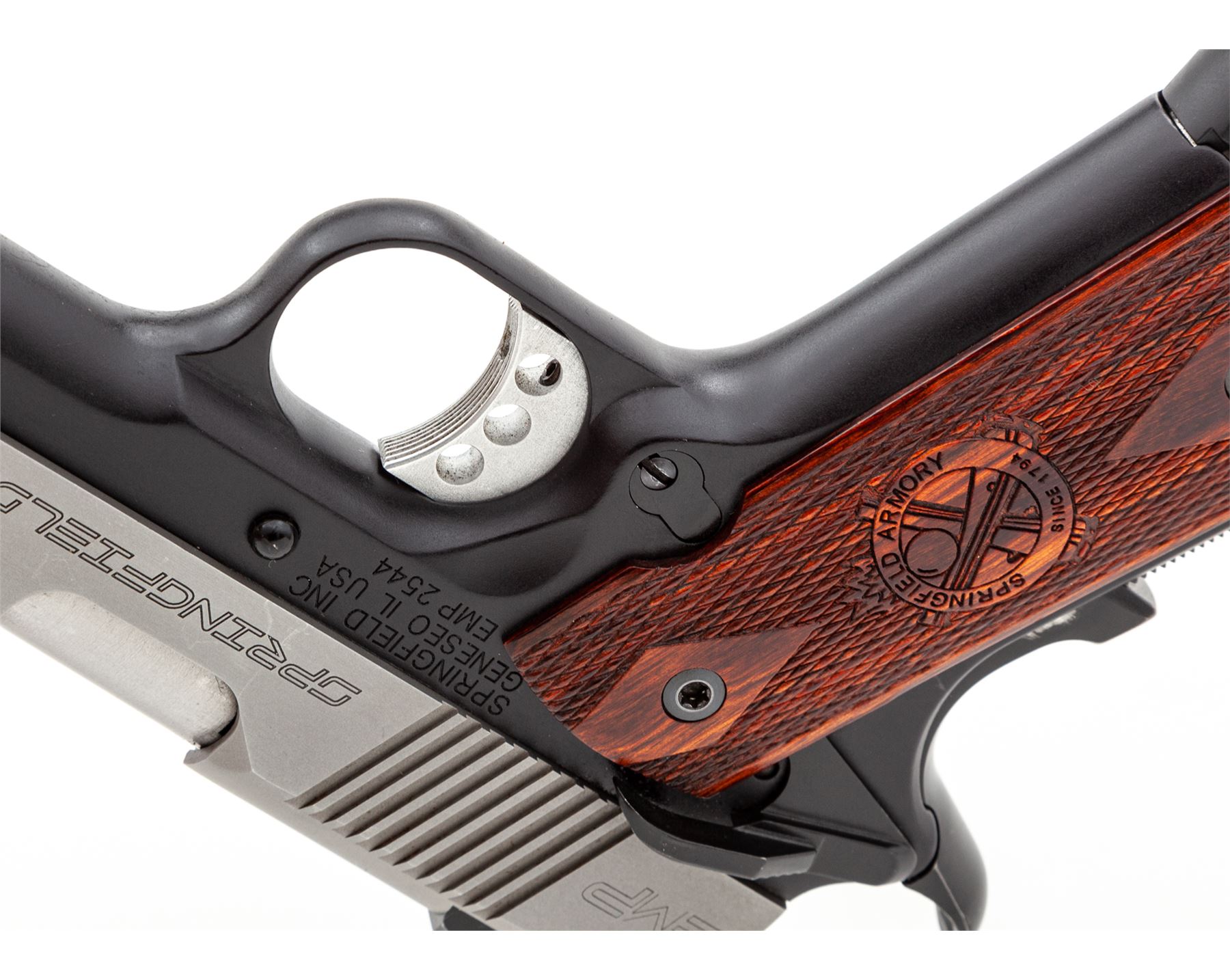 Springfield Armory Model EMP Compact Semi-Automatic Pistol, with four (4) magazines, #EMP2544, 9mm cal., 3'' barrel, matte stainless slide, black anodized aluminum alloy frame, factory checkered Cocobolo grips with Springfield Armory logo, ambidextrous thumb safety, skeletonized hammer and trigger, red fiber optic front sight, two-dot night sights, with four (4) factory nine shot magazines. In hard plastic SA marked case that has no firearms identification label, with a right-hand black polymer Springfield holster. In fine overall condition showing normal signs of light carry wear and range use. Matte slide with some mild scuffs and rub marks from the holster, frame retains approx. 97% of the original black finish with thinning to the high points of the grip safety. Grips are excellent with only a few small handling marks. Smooth action, near excellent bore. Outside of the case with the serial number written in paint pen. Est.: $600-$800. (Modern/PPT)