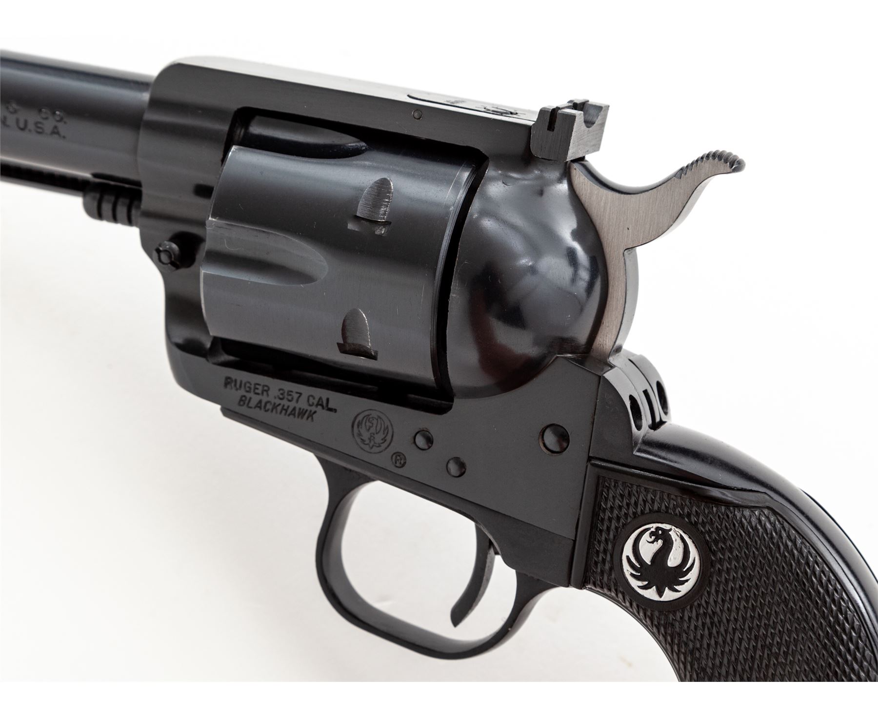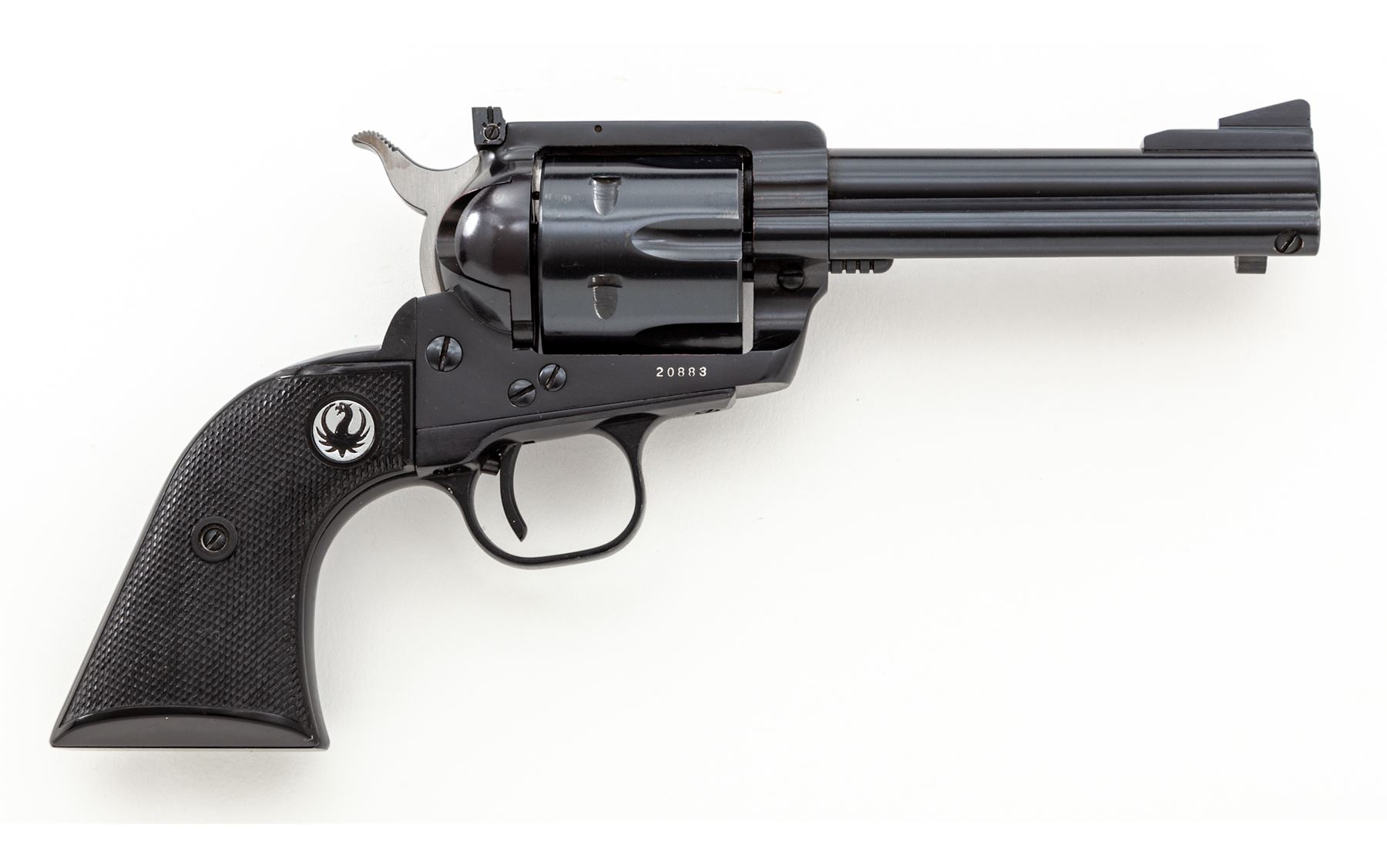 Early Ruger Blackhawk Single Action Revolver, #20883, .357 mag. cal., 4-5/8'' barrel, blue finish, factory checkered black plastic grips, in original box with instructions. Condition is excellent with light thinning at muzzle and just the lightest marks from handling. Good grips and action, bright bore. This example pre-dates the transfer bar modification. Box remains in very good condition with some pen writing to lid and separation at one edge. Est.: $600-$800. (C&R)