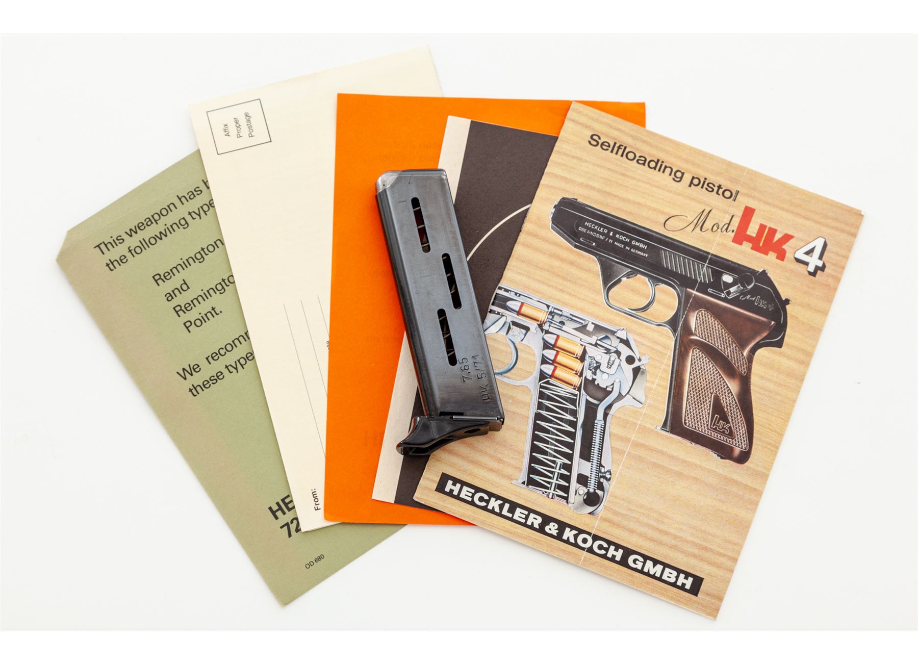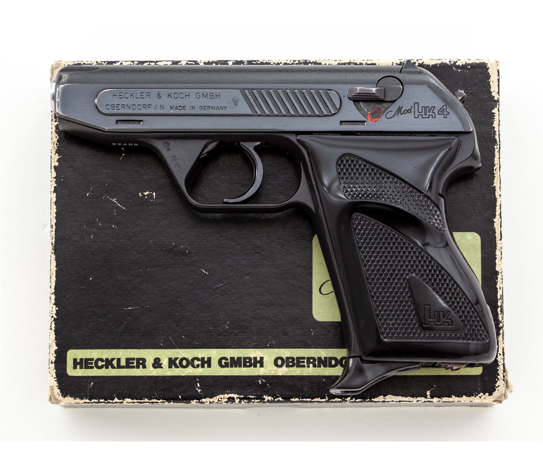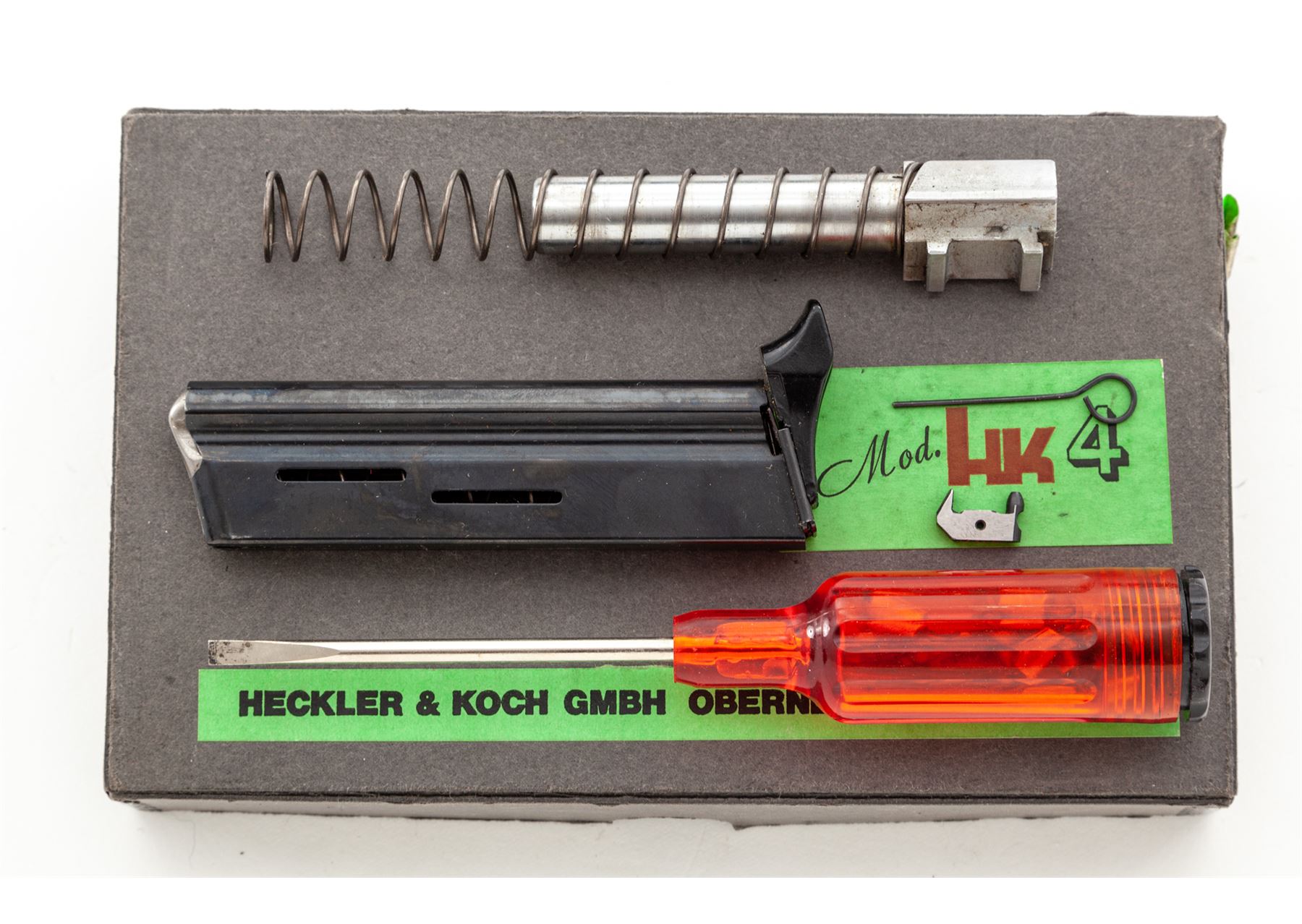 HK Model 4 Semi-Automatic Pistol, #22488, .32 cal., 3.5'' barrel, blue finish, checkered plastic grips, with two (2) magazines, in original box with test target. Complete with .22 cal. conversion kit consisting of barrel, tool, recoil spring and magazine, in original box, barrel #112581; .380 conversion kit consisting of barrel, recoil spring, screwdriver and magazine, in original, barrel #10000. Condition to pistol is near excellent retaining approx. 94% lightly thinning blue, with losses to red paint in safety area and minor scratches to grips. Good action, bright bore. Pistol box shows scuffs along top edges of lid. Conversion kits remain in excellent condition, with one of the box edges having been marked in sharpie. Est.: $1,000-$1,500. (Modern)(Not available to Calif. residents.)