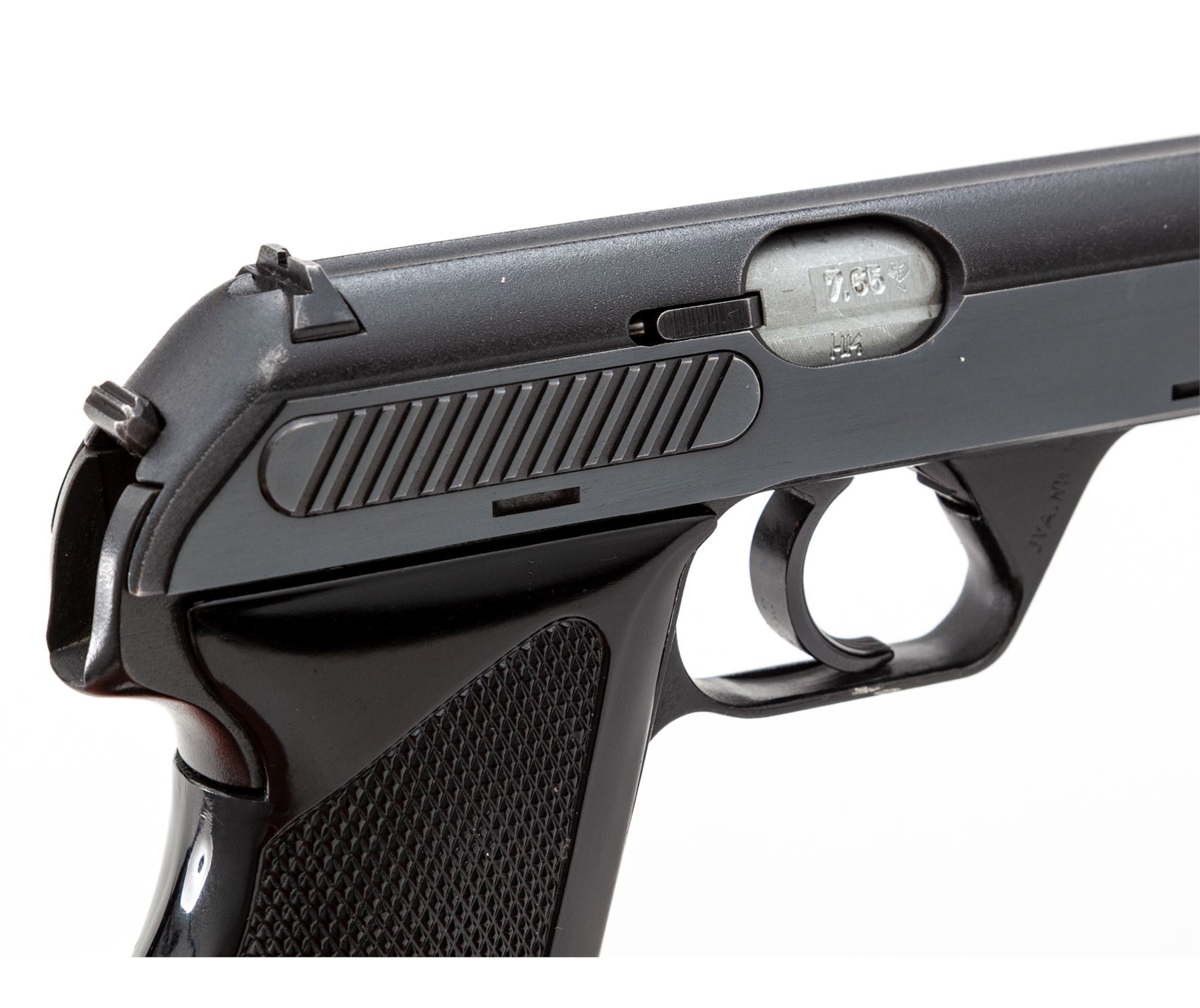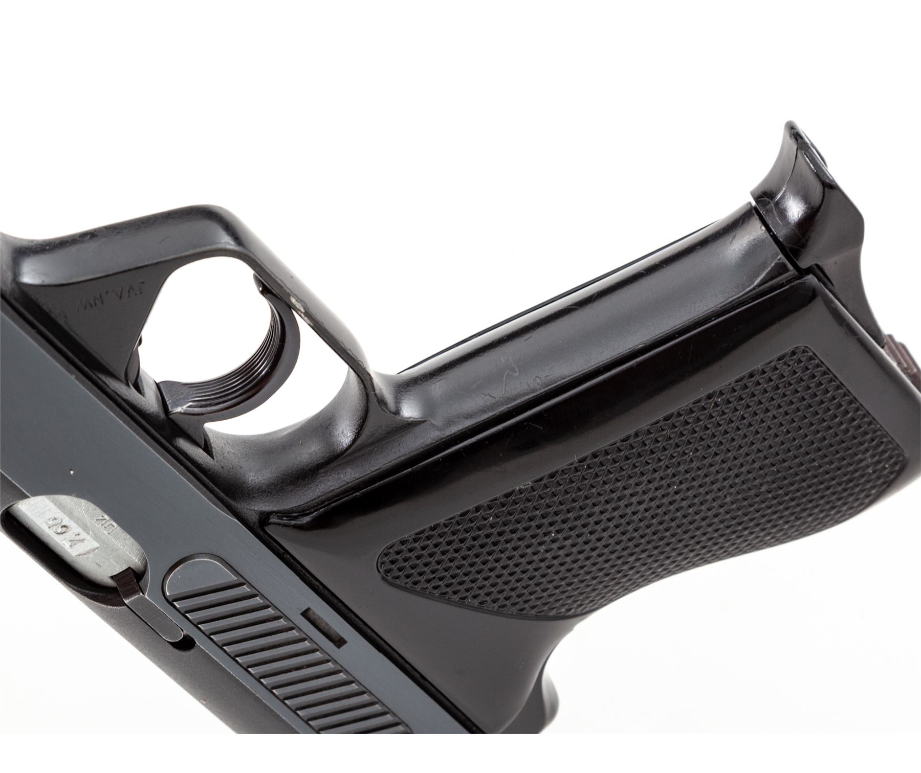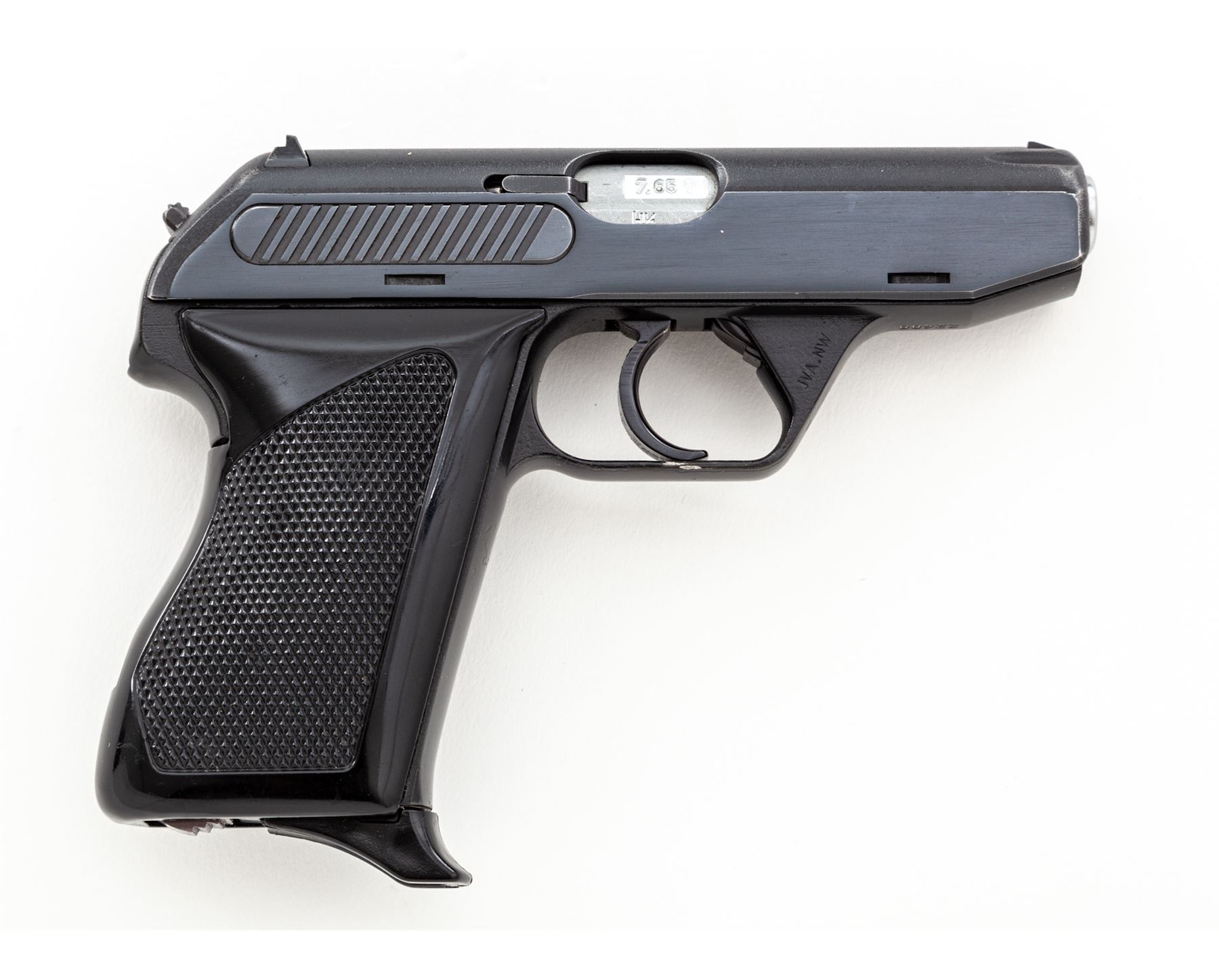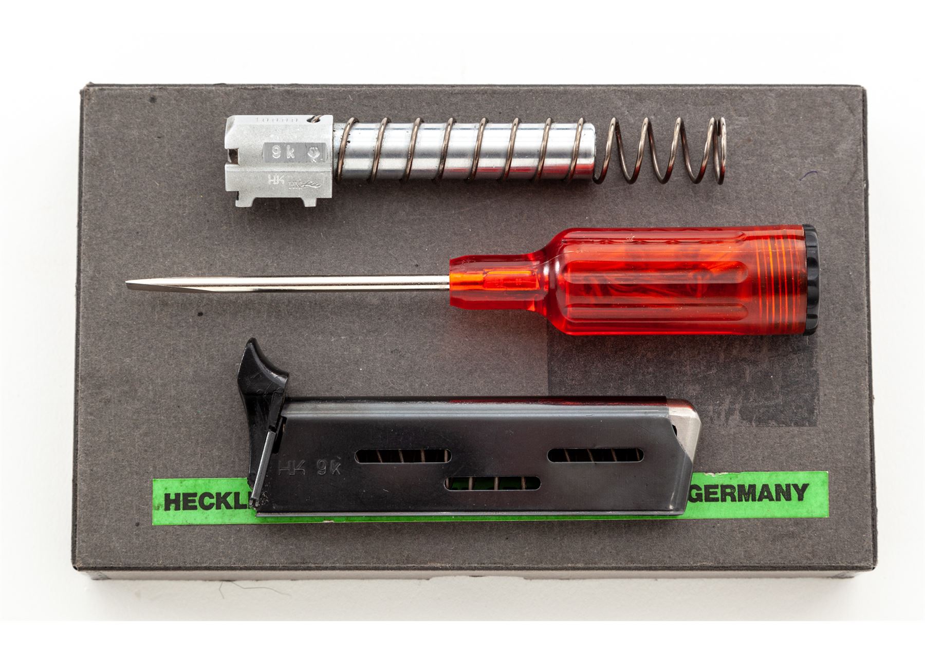 HK Model 4 Semi-Automatic Pistol, #22488, .32 cal., 3.5'' barrel, blue finish, checkered plastic grips, with two (2) magazines, in original box with test target. Complete with .22 cal. conversion kit consisting of barrel, tool, recoil spring and magazine, in original box, barrel #112581; .380 conversion kit consisting of barrel, recoil spring, screwdriver and magazine, in original, barrel #10000. Condition to pistol is near excellent retaining approx. 94% lightly thinning blue, with losses to red paint in safety area and minor scratches to grips. Good action, bright bore. Pistol box shows scuffs along top edges of lid. Conversion kits remain in excellent condition, with one of the box edges having been marked in sharpie. Est.: $1,000-$1,500. (Modern)(Not available to Calif. residents.)