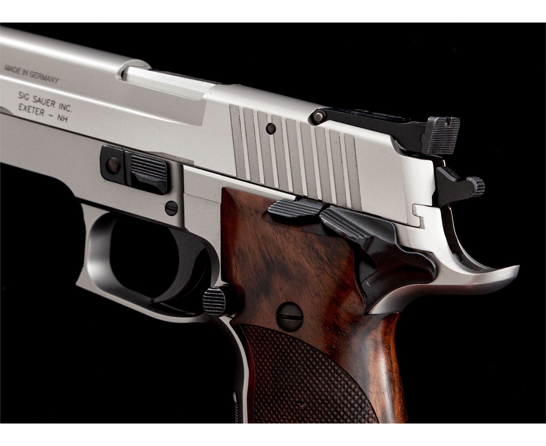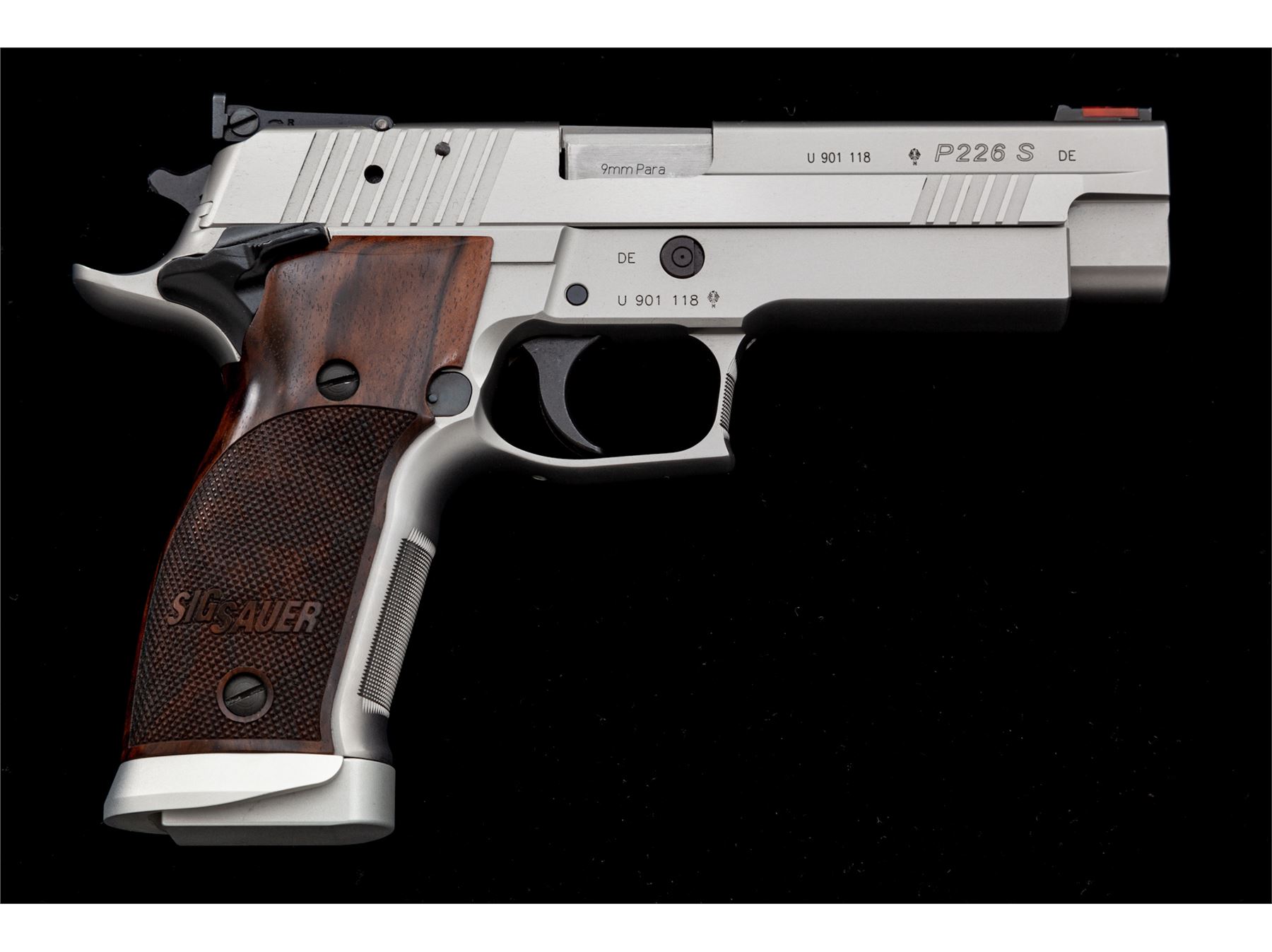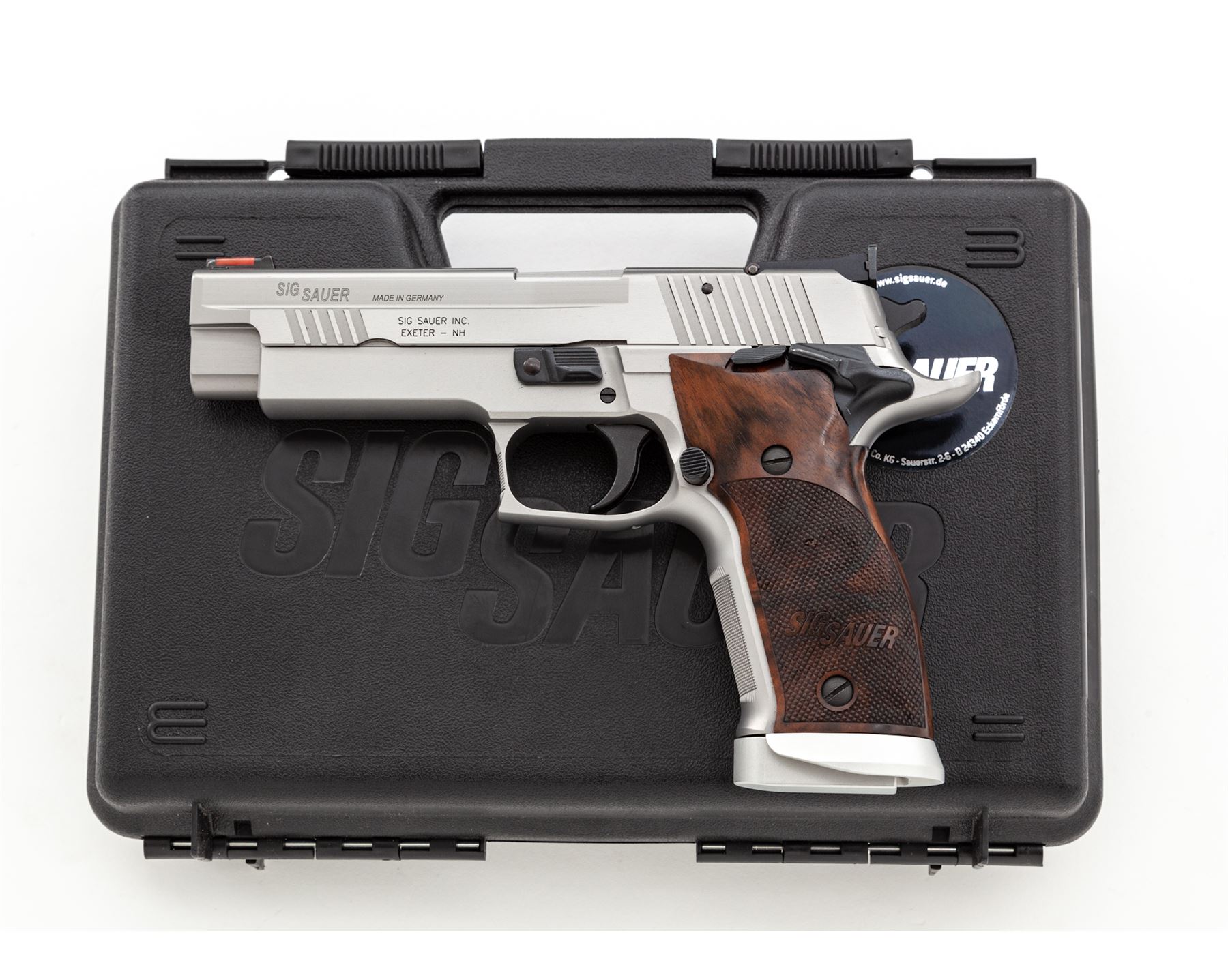Sig Sauer P226S X-Five Semi-Automatic Pistol, #U901118, 9mm cal., single action only, 5'' stainless barrel, matte stainless finish, factory checkered wraparound walnut Sig Sauer grips, flared magwell, red fiber optic front sight, fully adjustable notched Sig Sauer rear sight, ambidextrous thumb safety, finely checkered front grip strap, adjustable trigger, with four (4) magazines total; two (2) 10-round Sig Sauer magazines both with aluminum bases and two (2) 10-round Mec-Gar magazines. In an original black plastic Sig Sauer case with owner's manual, small adjustment tools, tube of Sig Sauer grease, and test target that is numbered to the gun; case lacks any type of identification label. Also included is a pair of original black polymer grips. In excellent near new overall condition, this pistol does not appear to have been fired very often. Grips and metal with a few minor marks from handling and storage, the most noticeable being a small nick to the left grip checkering. Excellent action and mirror bright bore. Extra pair of black polymer grips appear as new. Est.: $1,800-$2,400. (Modern/PPT)