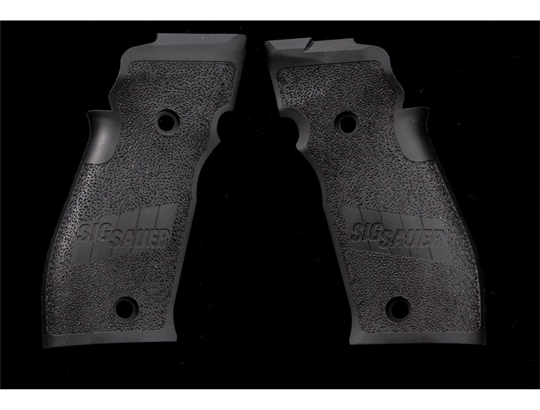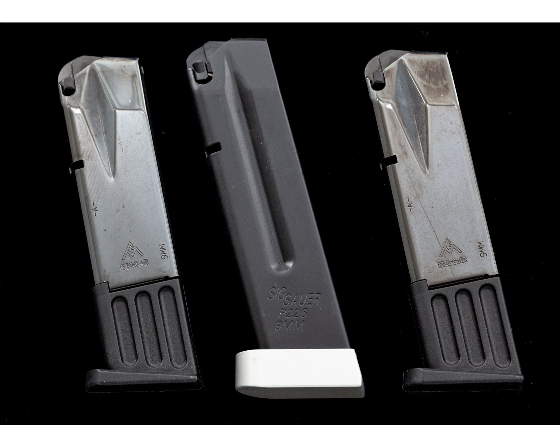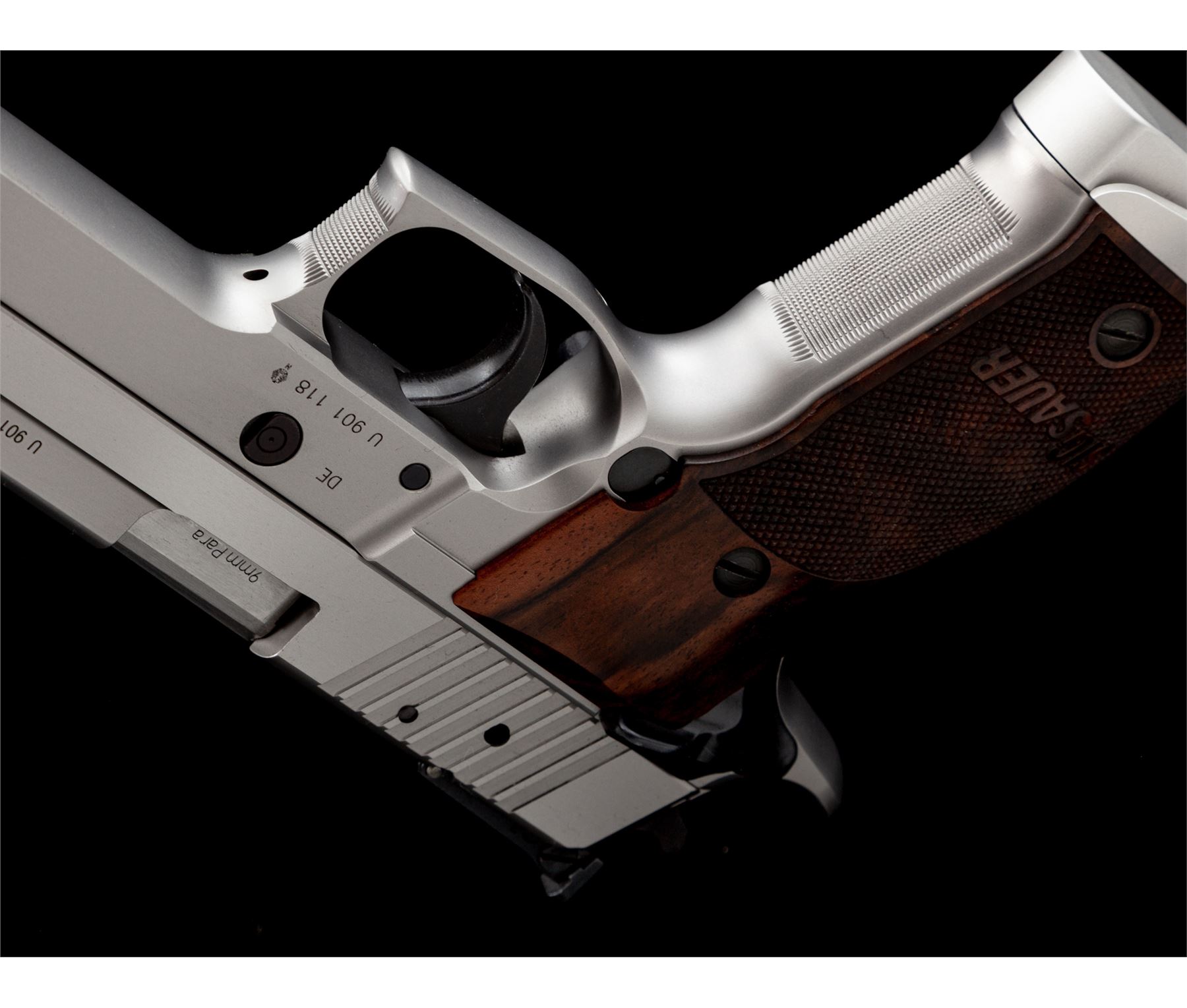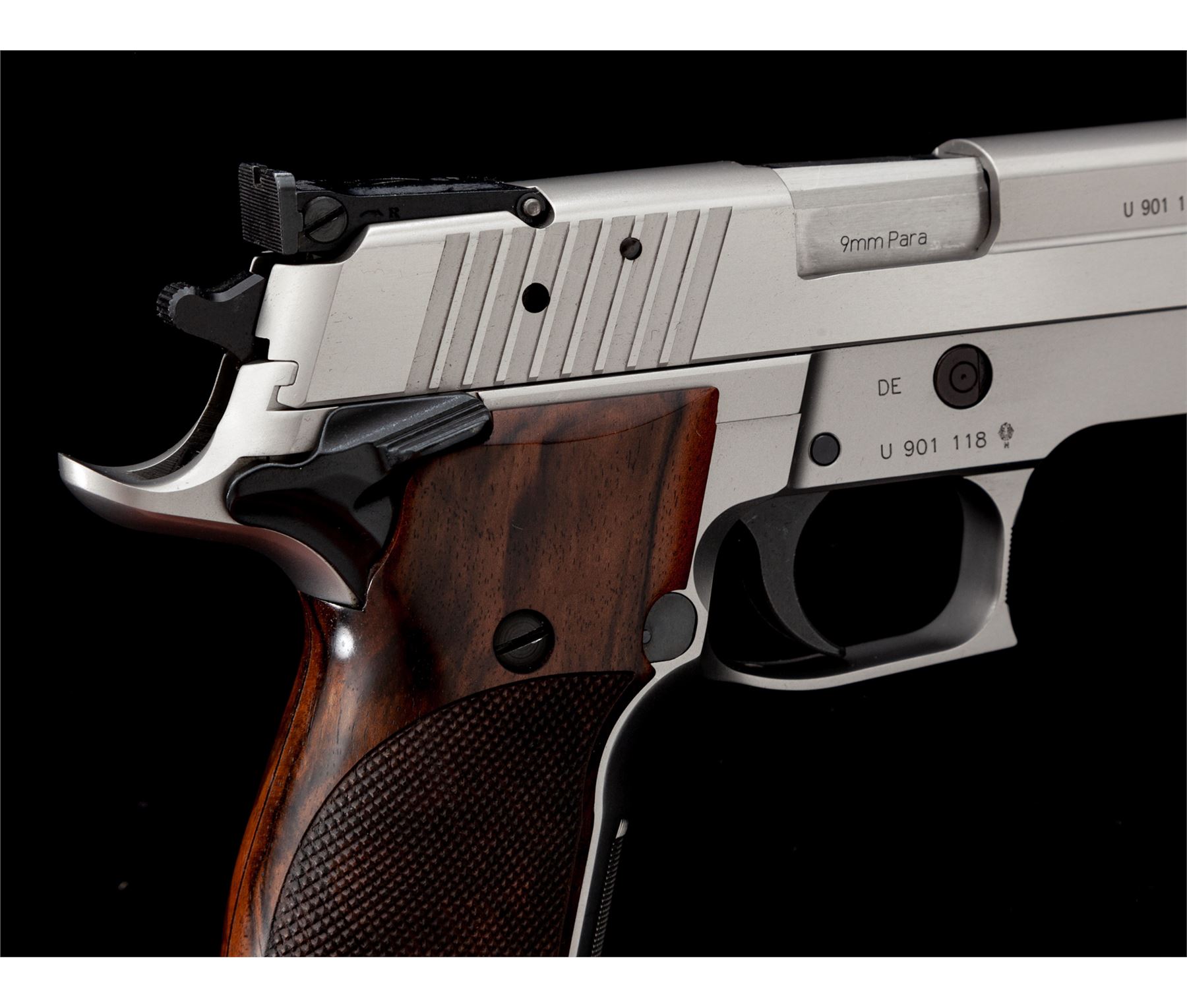 Sig Sauer P226S X-Five Semi-Automatic Pistol, #U901118, 9mm cal., single action only, 5'' stainless barrel, matte stainless finish, factory checkered wraparound walnut Sig Sauer grips, flared magwell, red fiber optic front sight, fully adjustable notched Sig Sauer rear sight, ambidextrous thumb safety, finely checkered front grip strap, adjustable trigger, with four (4) magazines total; two (2) 10-round Sig Sauer magazines both with aluminum bases and two (2) 10-round Mec-Gar magazines. In an original black plastic Sig Sauer case with owner's manual, small adjustment tools, tube of Sig Sauer grease, and test target that is numbered to the gun; case lacks any type of identification label. Also included is a pair of original black polymer grips. In excellent near new overall condition, this pistol does not appear to have been fired very often. Grips and metal with a few minor marks from handling and storage, the most noticeable being a small nick to the left grip checkering. Excellent action and mirror bright bore. Extra pair of black polymer grips appear as new. Est.: $1,800-$2,400. (Modern/PPT)