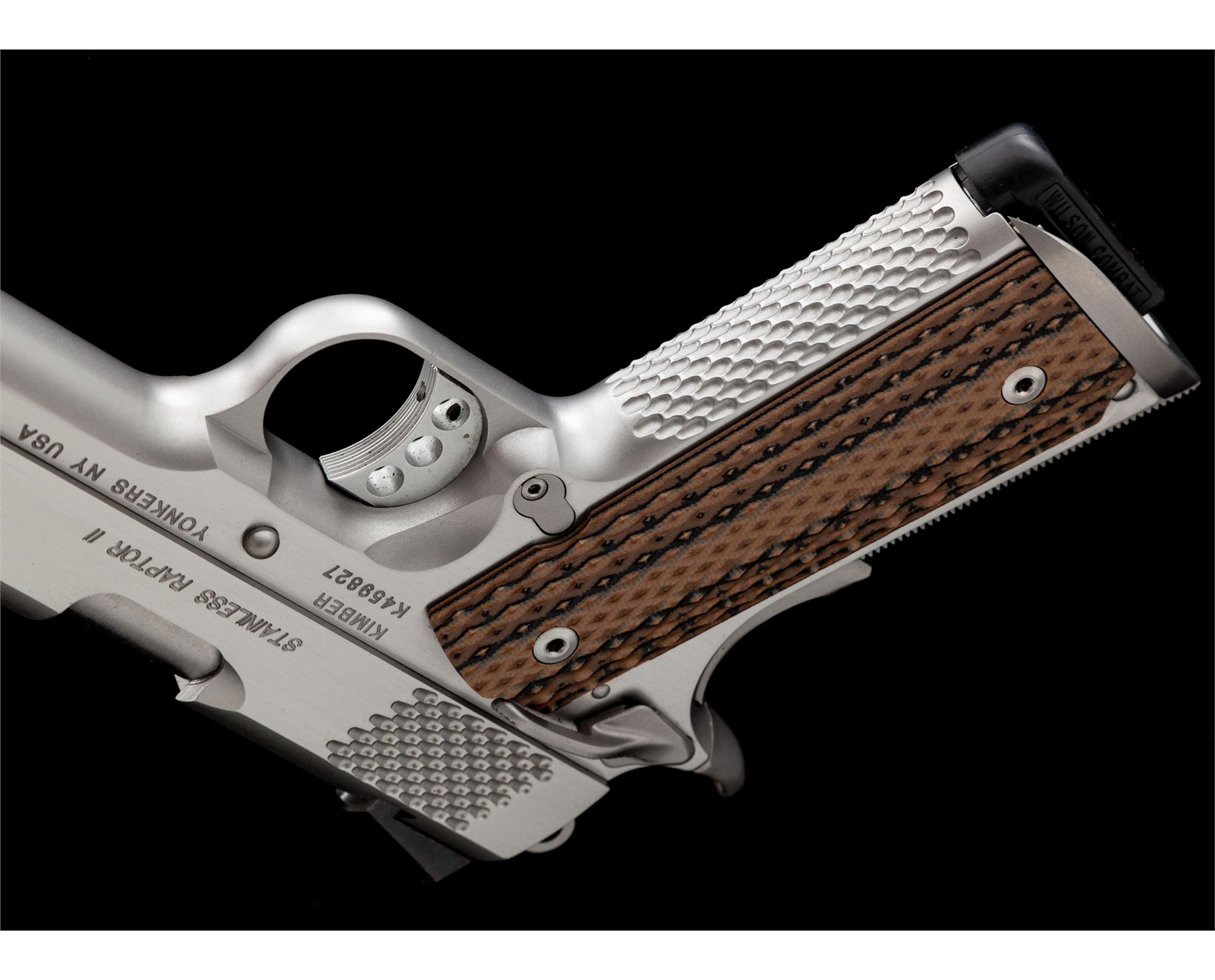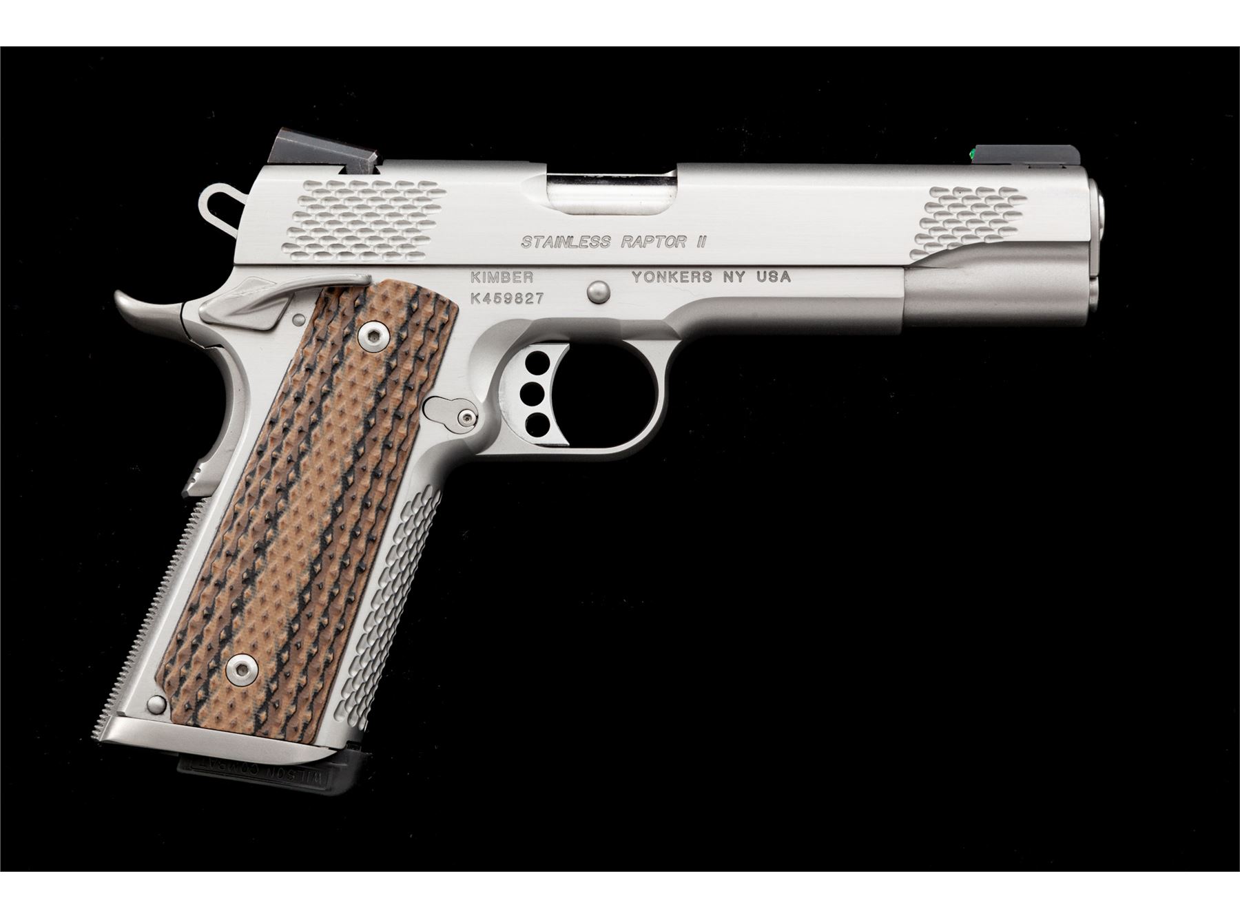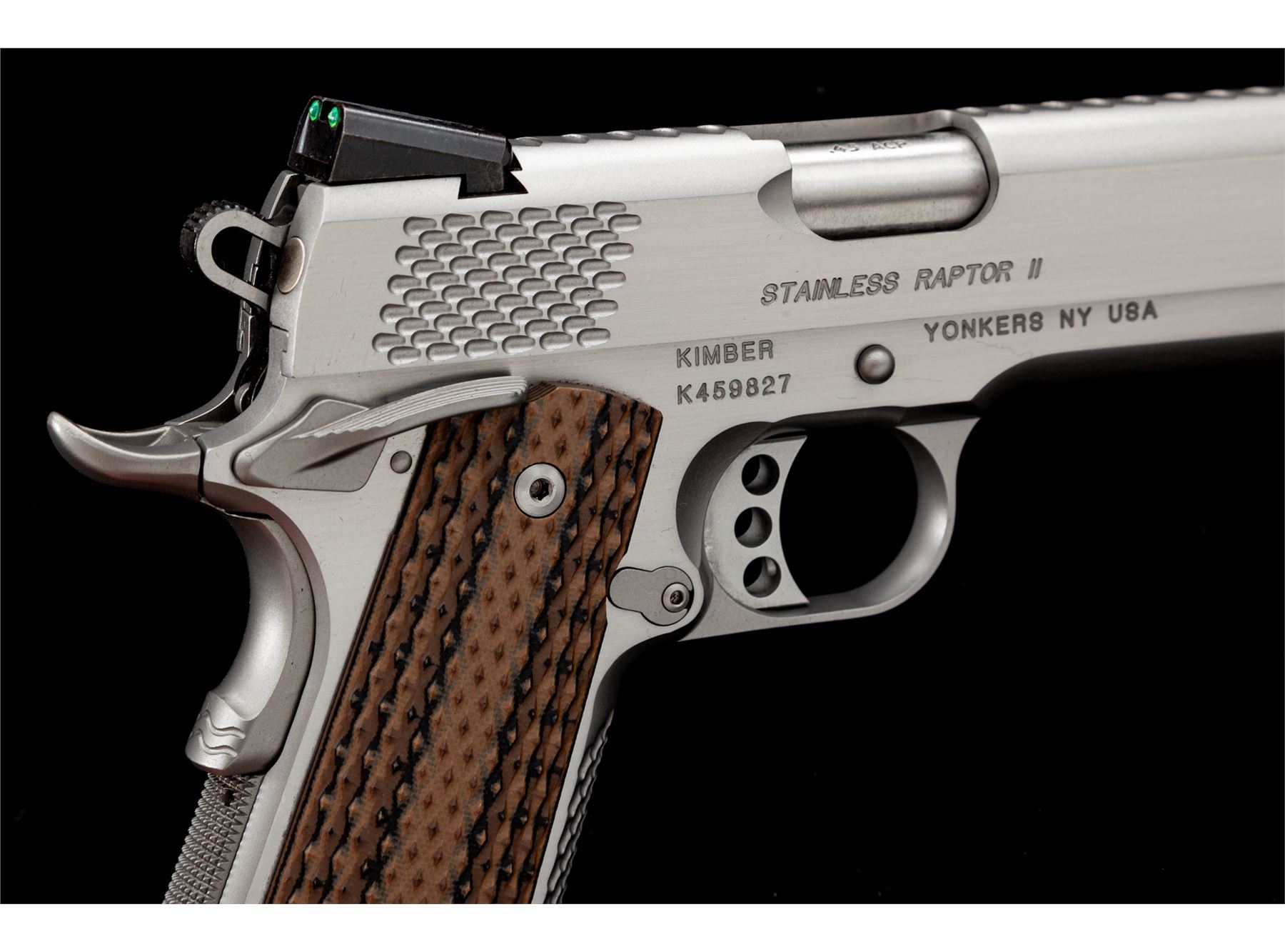 Kimber Custom Shop Stainless Raptor II Semi-Automatic Pistol, #K459827, .45 ACP cal., 5'' barrel, combination satin and polished stainless finish, with scale type serrations on the front and back of the slide as well as the front grip strap. The original grips have been replaced with a pair of checkered G10 grips manufactured by VZ Grips. Pistol also features an ambidextrous thumb safety, skeletonized hammer and trigger, with green 3-dot fiber optic sights, and one Wilson Combat magazine. Included is the original black plastic Kimber case with matching end label and cable lock. Condition overall is excellent. Left front portion of the slide and frame with a few small scratches; flat sides with a nice polished finish and crisp lettering and scale type slide serrations. VZ grips appear as new. Excellent action and bright shiny bore. Est.: $800-$1,000. (Modern/PPT)