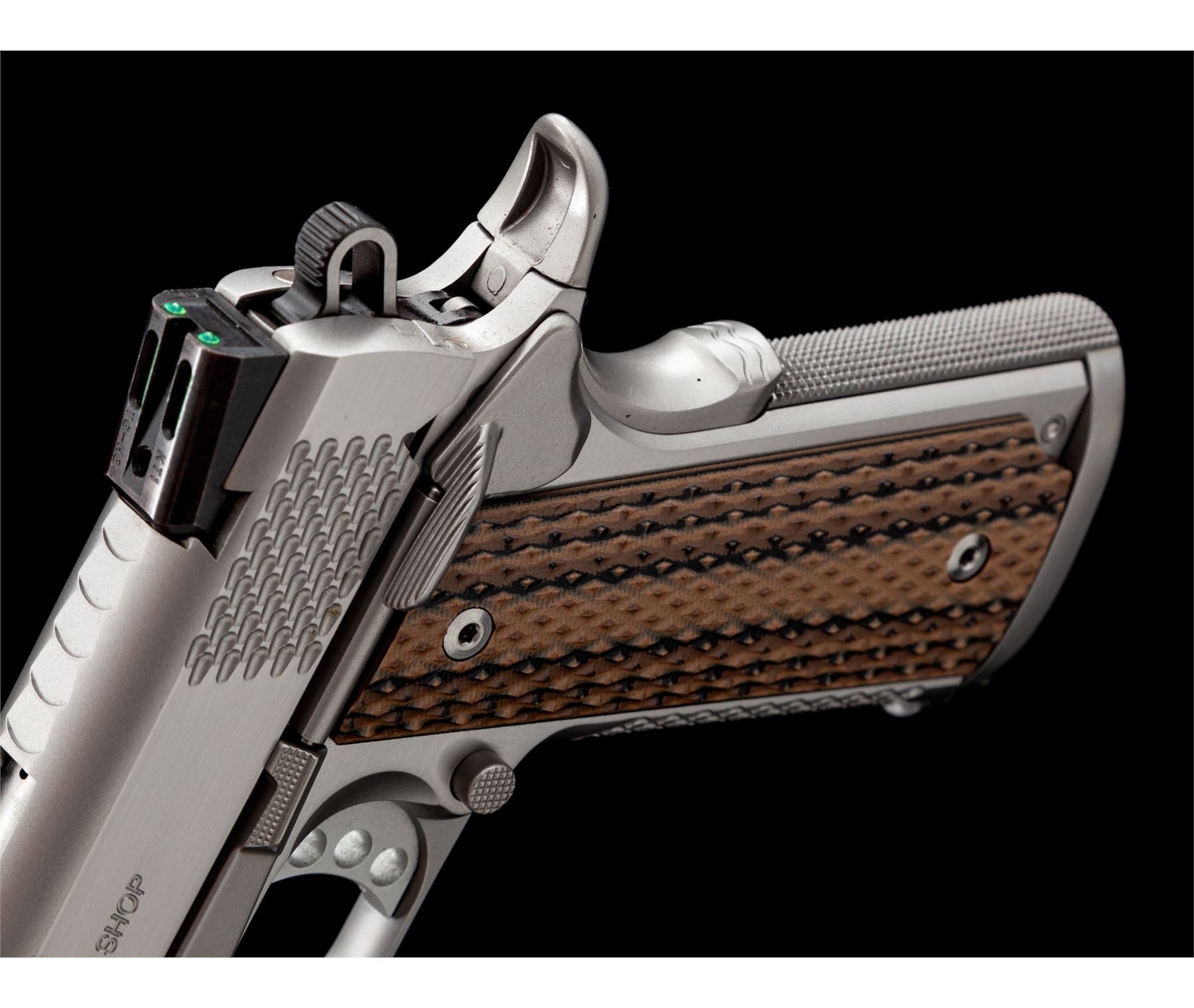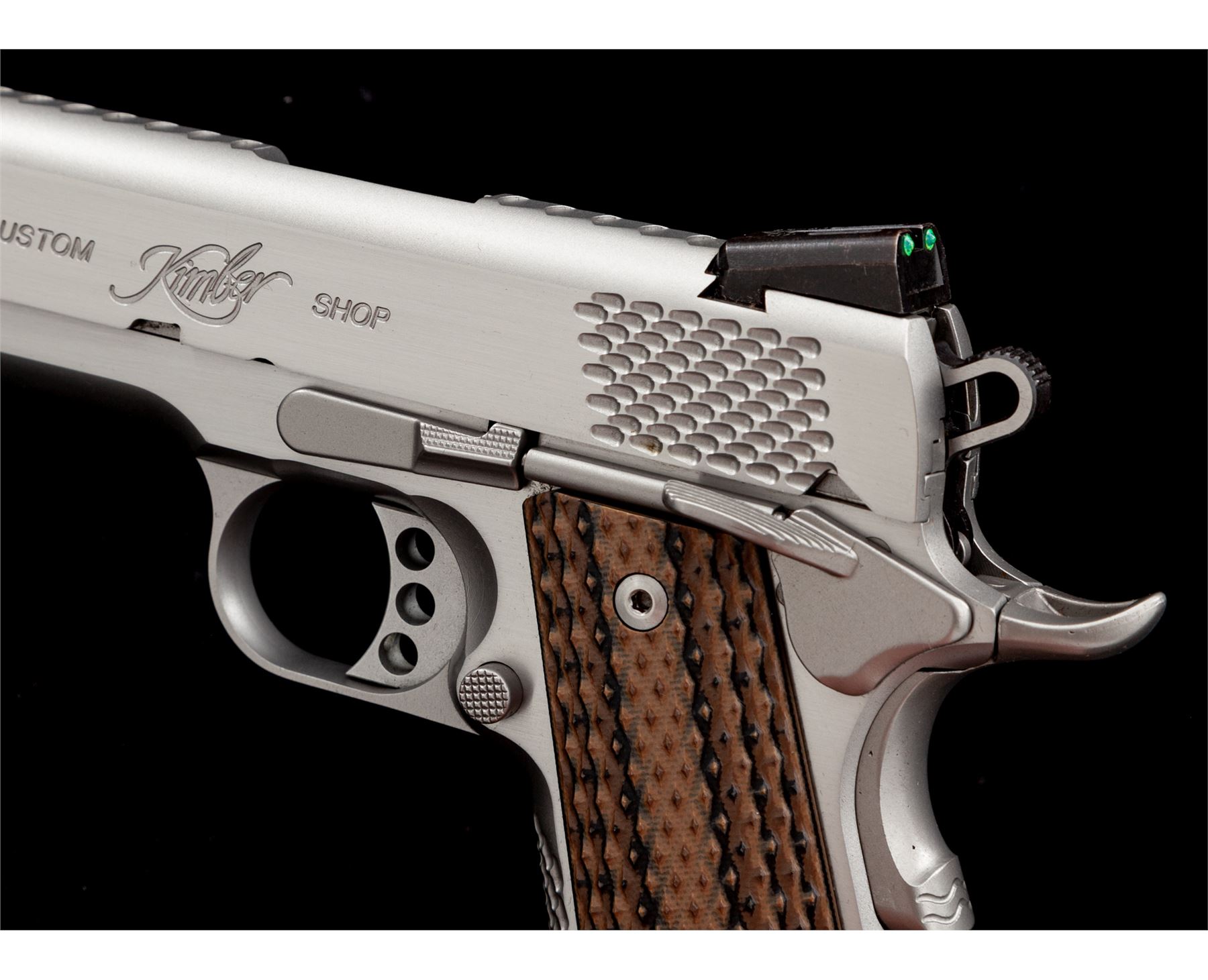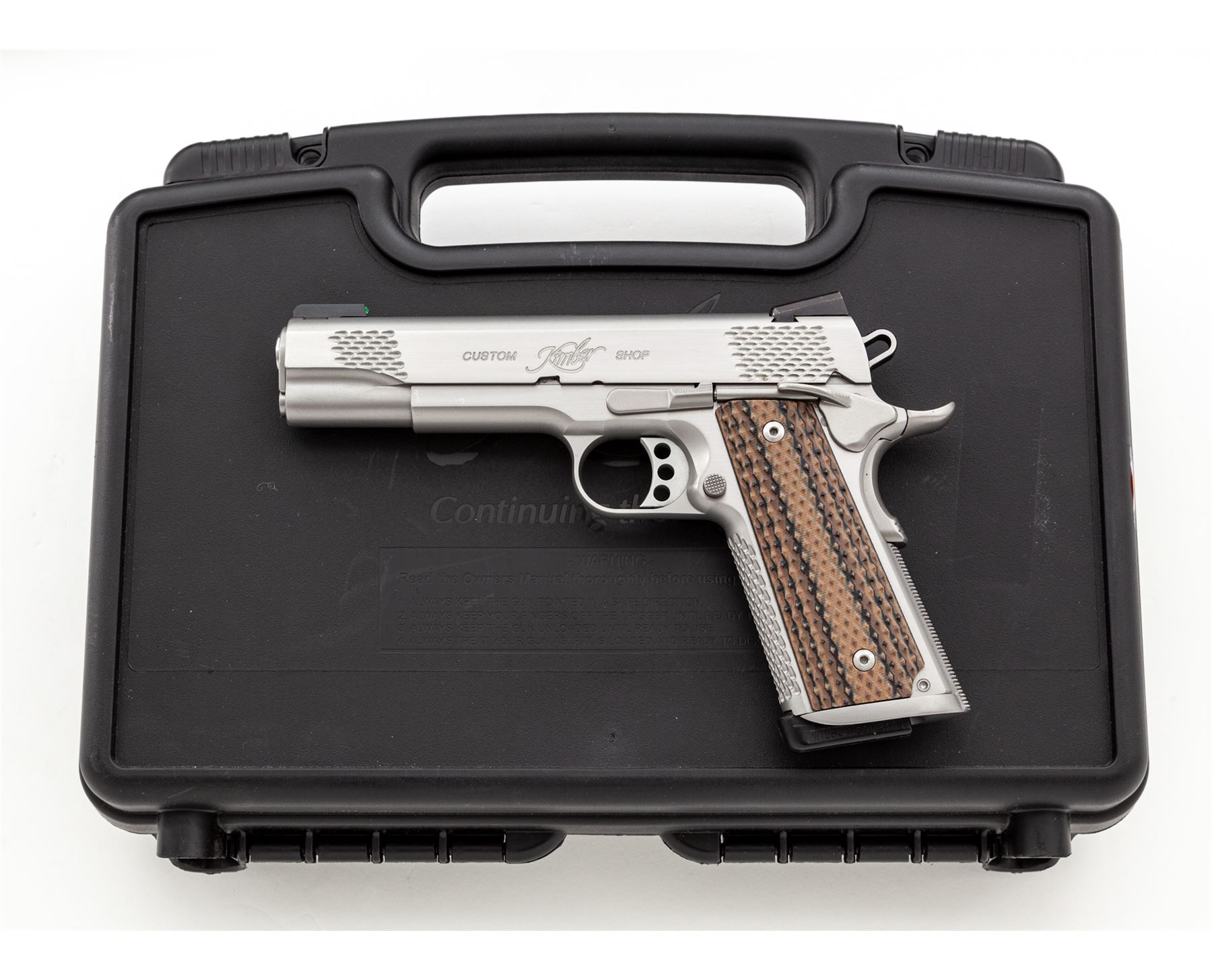 Kimber Custom Shop Stainless Raptor II Semi-Automatic Pistol, #K459827, .45 ACP cal., 5'' barrel, combination satin and polished stainless finish, with scale type serrations on the front and back of the slide as well as the front grip strap. The original grips have been replaced with a pair of checkered G10 grips manufactured by VZ Grips. Pistol also features an ambidextrous thumb safety, skeletonized hammer and trigger, with green 3-dot fiber optic sights, and one Wilson Combat magazine. Included is the original black plastic Kimber case with matching end label and cable lock. Condition overall is excellent. Left front portion of the slide and frame with a few small scratches; flat sides with a nice polished finish and crisp lettering and scale type slide serrations. VZ grips appear as new. Excellent action and bright shiny bore. Est.: $800-$1,000. (Modern/PPT)