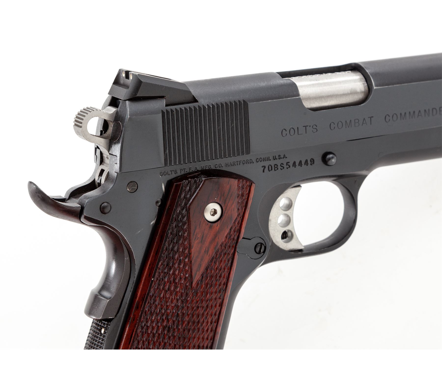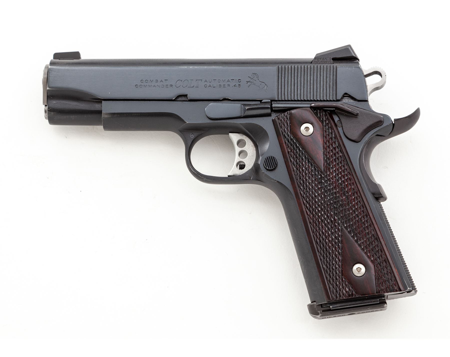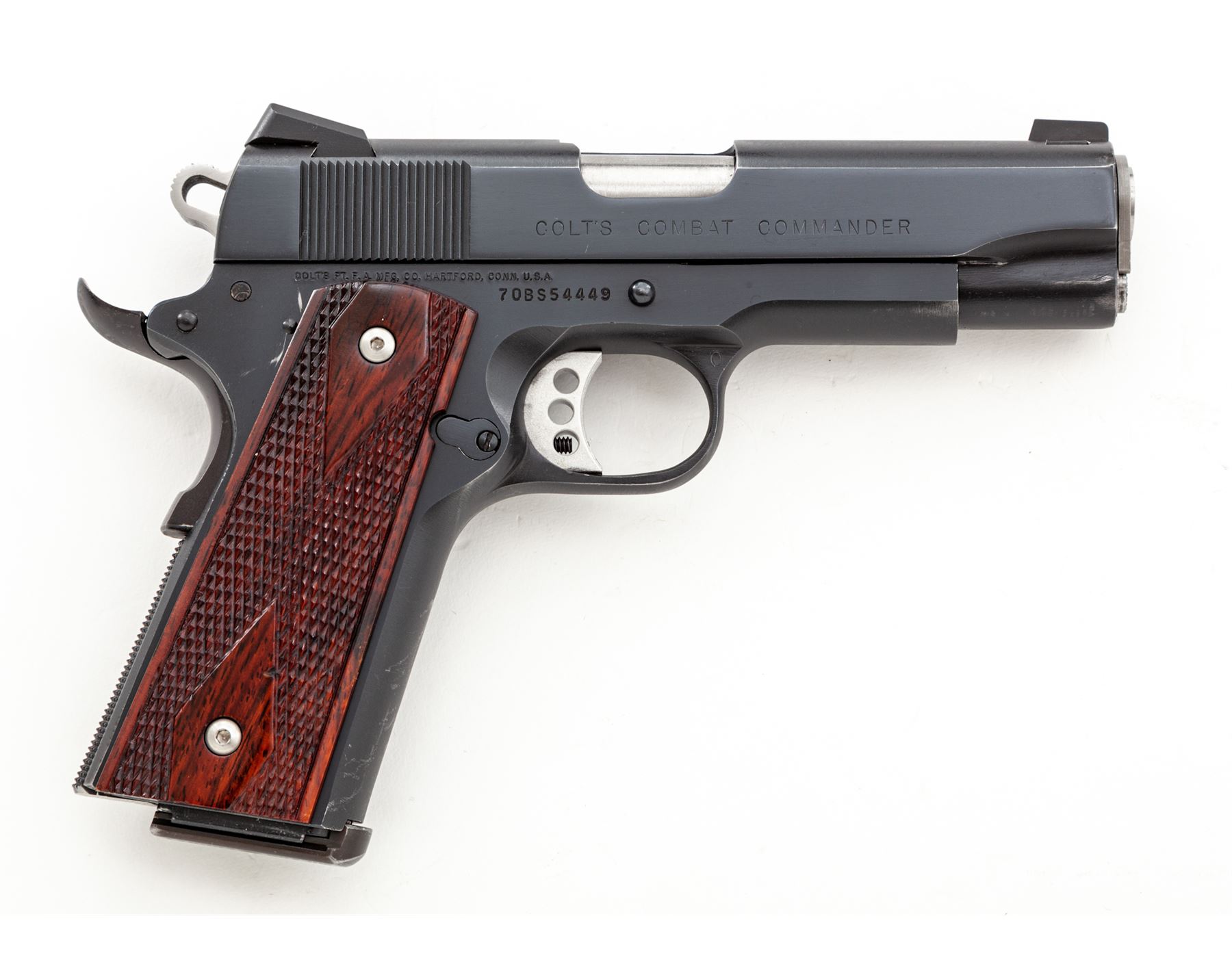 Custom Colt Combat Commander Semi-Automatic Pistol, #70BS54449, .45 ACP cal., 4.25'' Barsto barrel, blue finish, diamond and borderline checkered rosewood grips, Novak sights, Wilson trigger, beavertail safety, checkered flat mainspring housing, fitted stainless steel barrel bushing, with one Wilson Combat magazine. Condition is excellent as modified retaining approx. 95% lightly thinning blue. Grips and action are crisp, bore is mirror bright. Est.: $600-$800. (Modern/PPT)