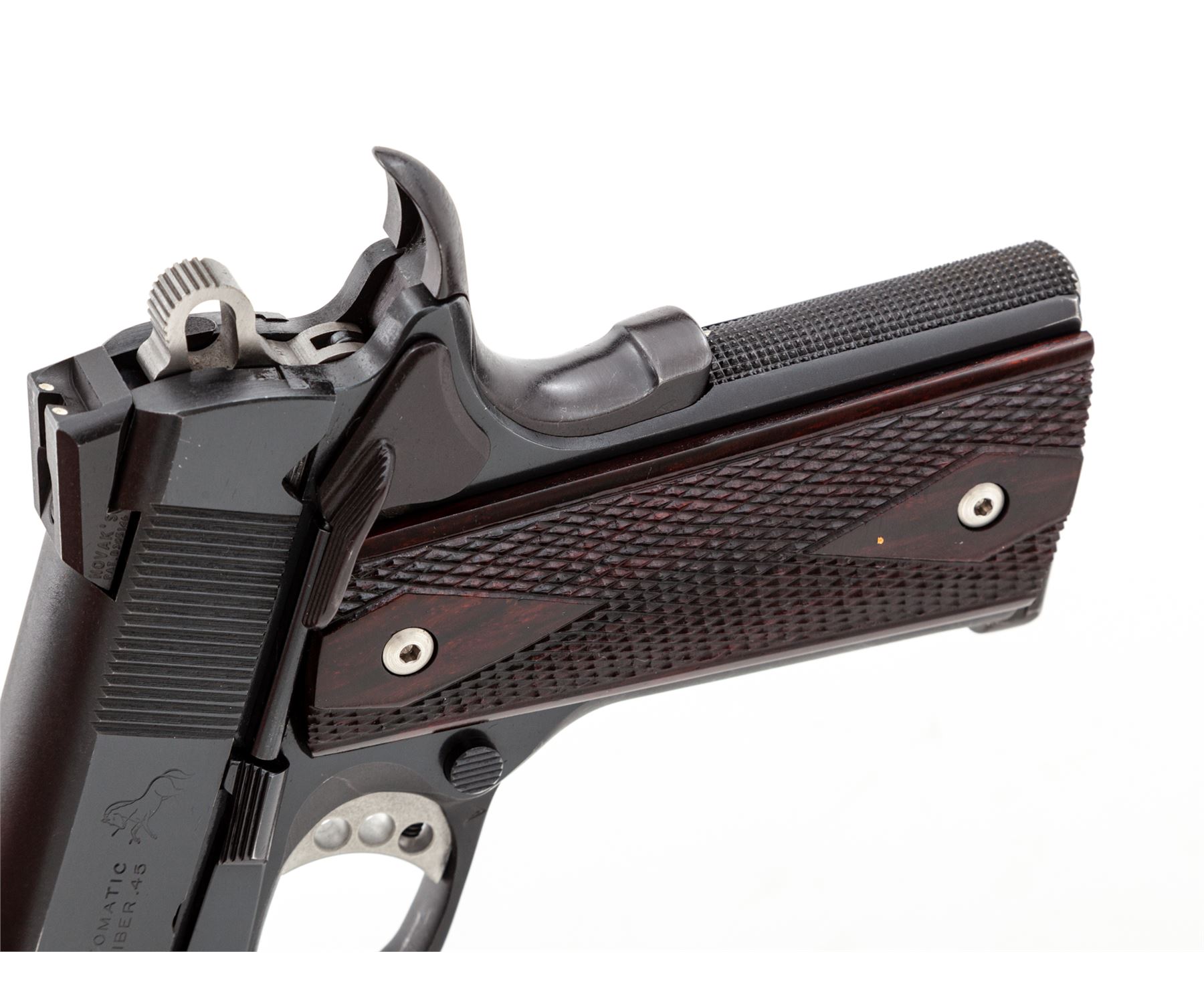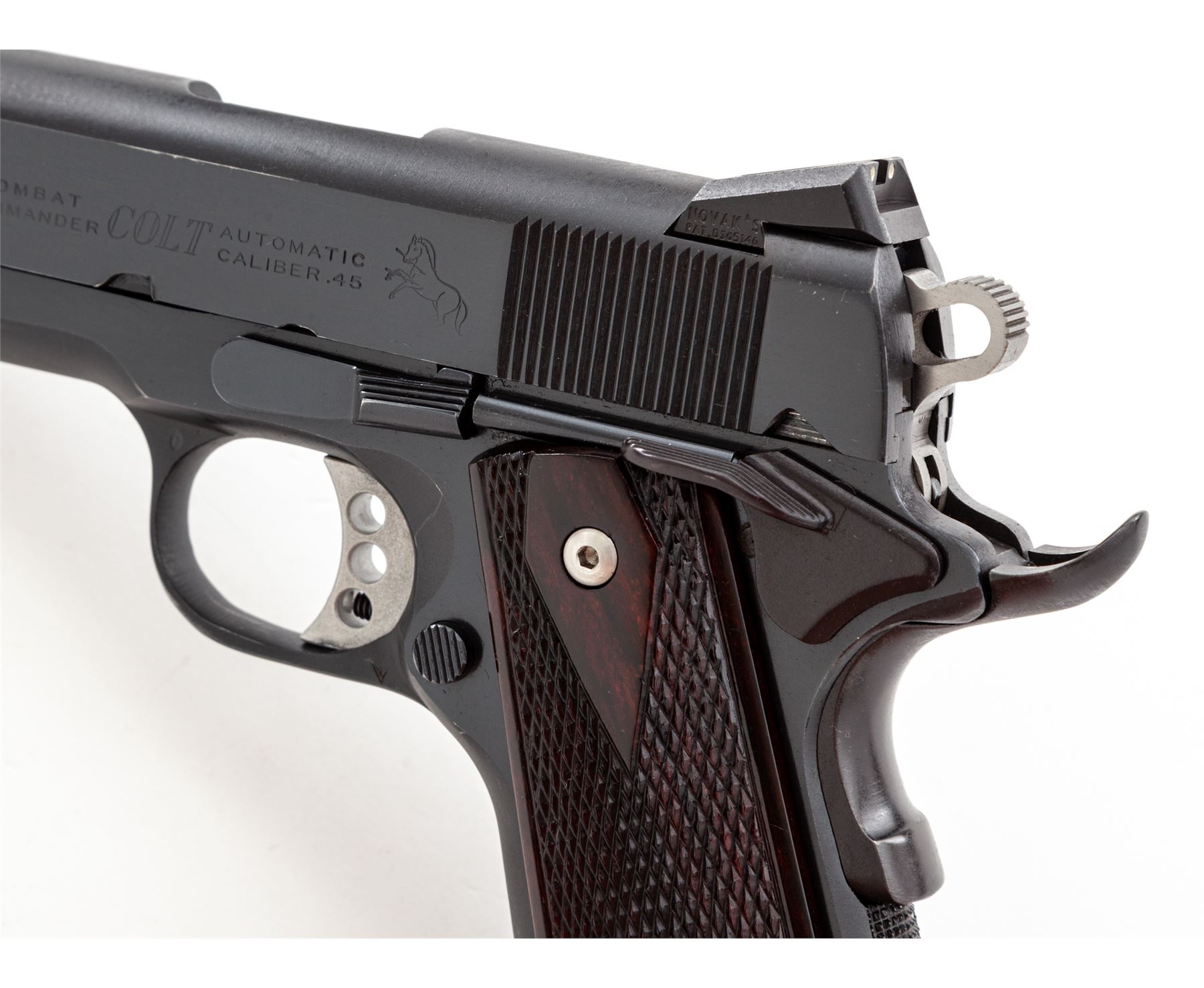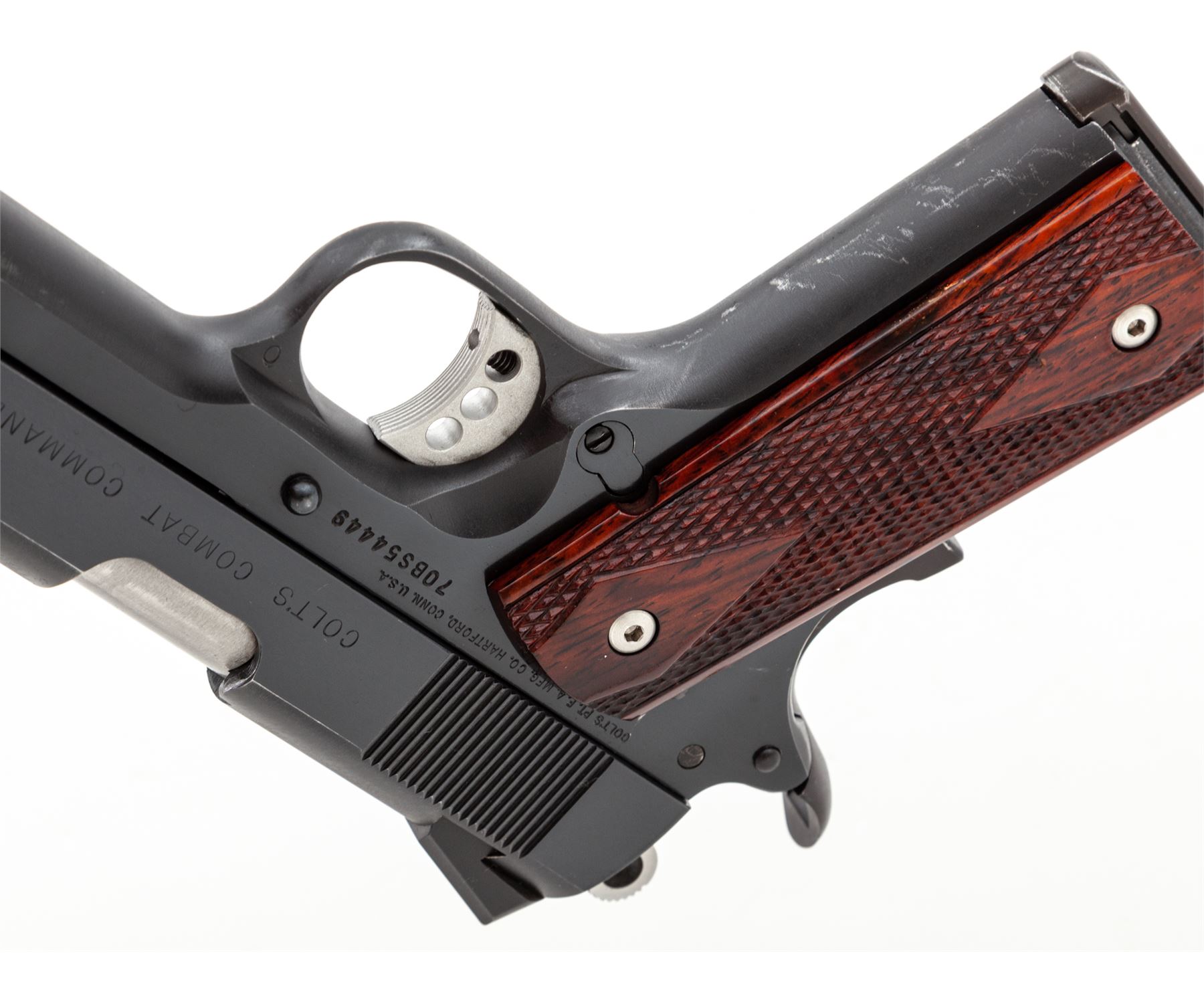 Custom Colt Combat Commander Semi-Automatic Pistol, #70BS54449, .45 ACP cal., 4.25'' Barsto barrel, blue finish, diamond and borderline checkered rosewood grips, Novak sights, Wilson trigger, beavertail safety, checkered flat mainspring housing, fitted stainless steel barrel bushing, with one Wilson Combat magazine. Condition is excellent as modified retaining approx. 95% lightly thinning blue. Grips and action are crisp, bore is mirror bright. Est.: $600-$800. (Modern/PPT)