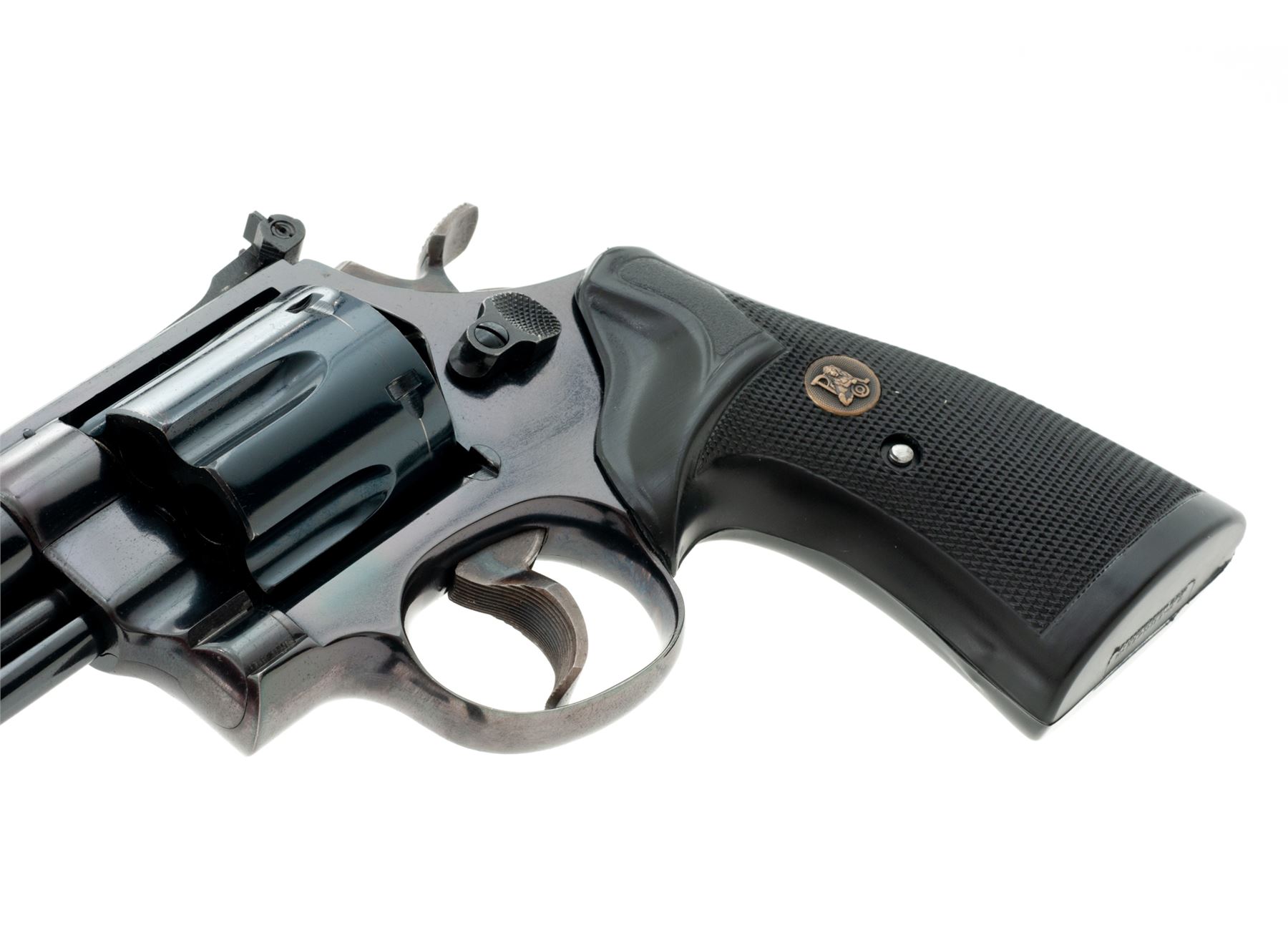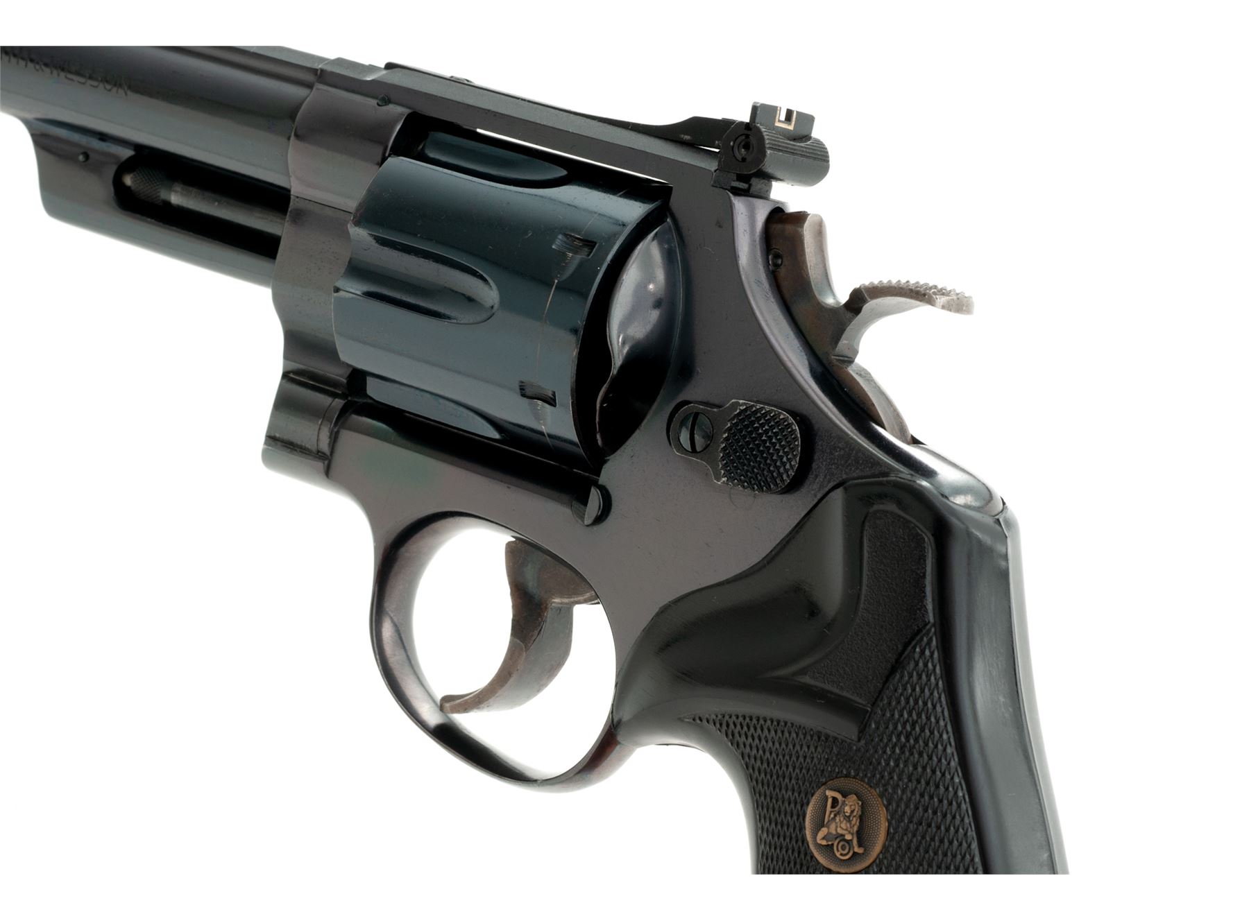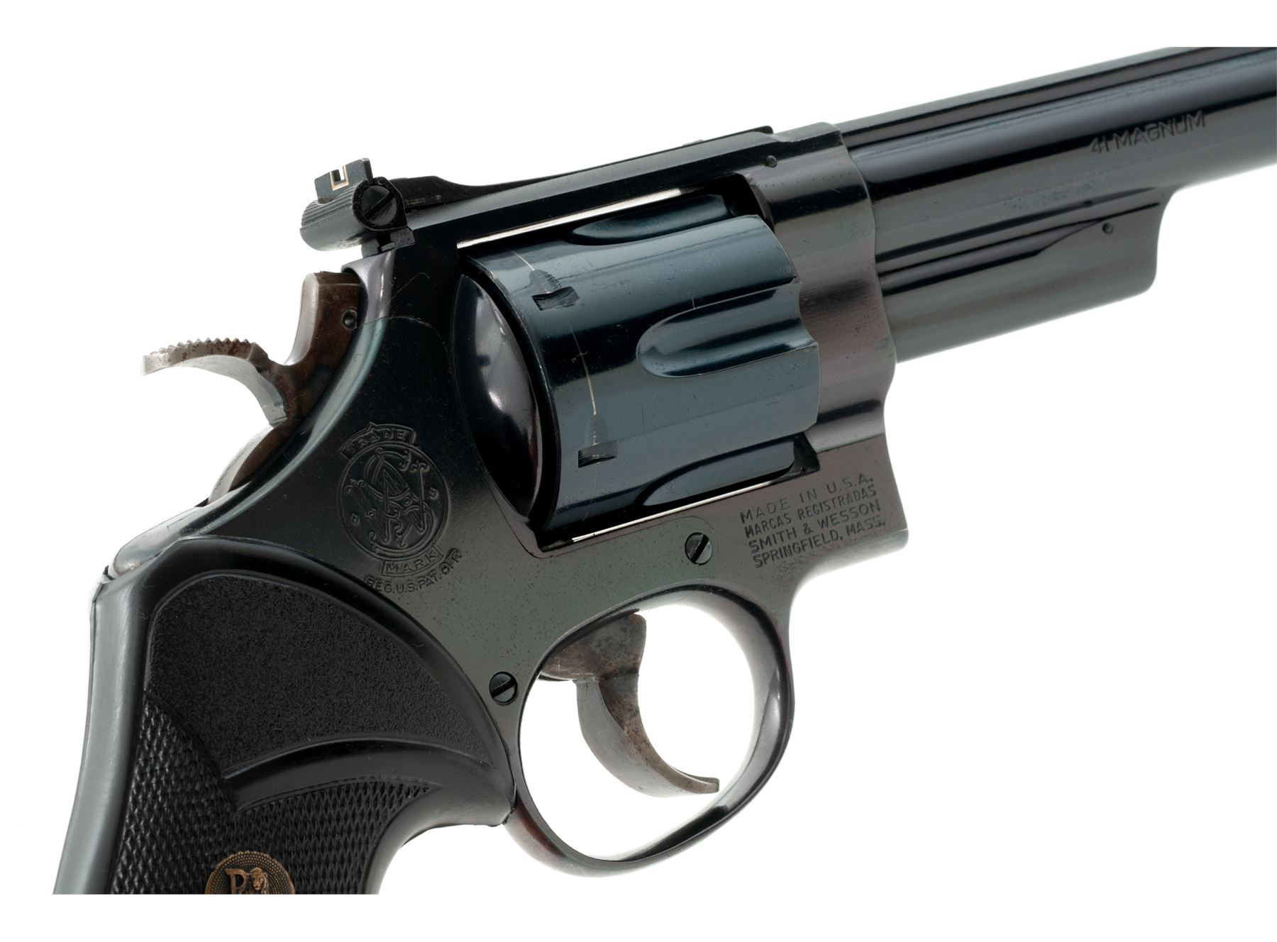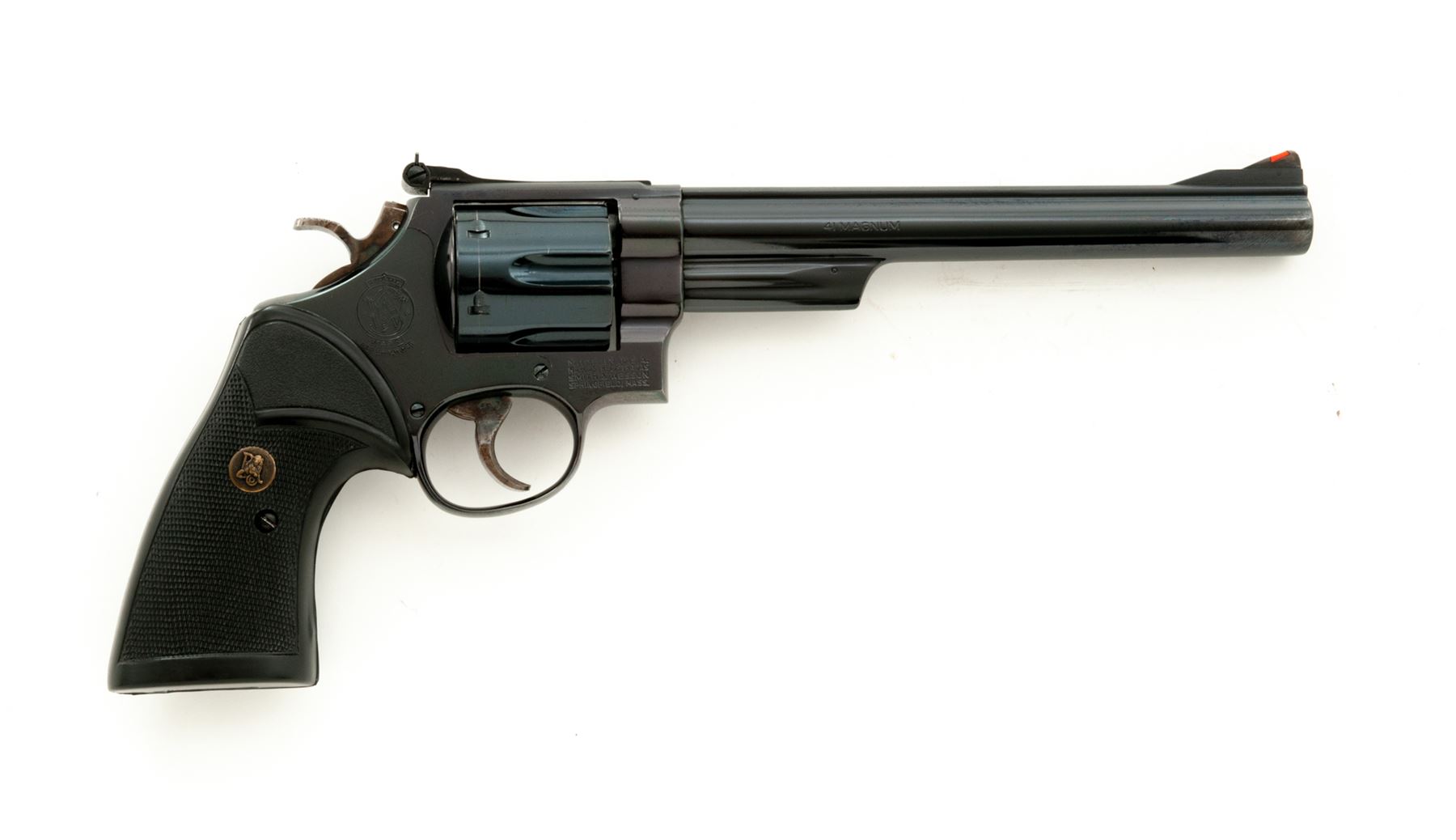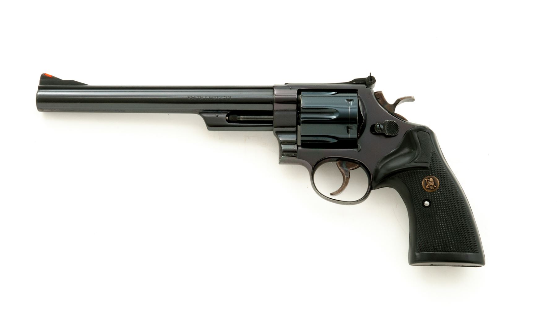 Smith & Wesson Model 57 Double Action Revolver, #N317147, .41 mag. cal., 8-3/8'' pinned barrel, blue finish, black rubber Pachmayr Presentation grips, red ramp front sight, micrometer click adjustable rear sight, wide color case hardened hammer and trigger. Mfg'd 1975-1976. Approx. 97% original blue finish remains and metal surfaces rate as fine overall, with scattered micro-scratching and signs of range use; sideplate with specks of faint reddish brown oxidation; cylinder with a thin index line. Factory lettering is clear. Hammer and trigger with approx. 97% rich case colors; right side of trigger also with reddish brown spotting. Grips are excellent, checkering shows no noticeable wear. Action is smooth and crisp; excellent bright bore. Est.: $600-$900. (Modern/PPT)