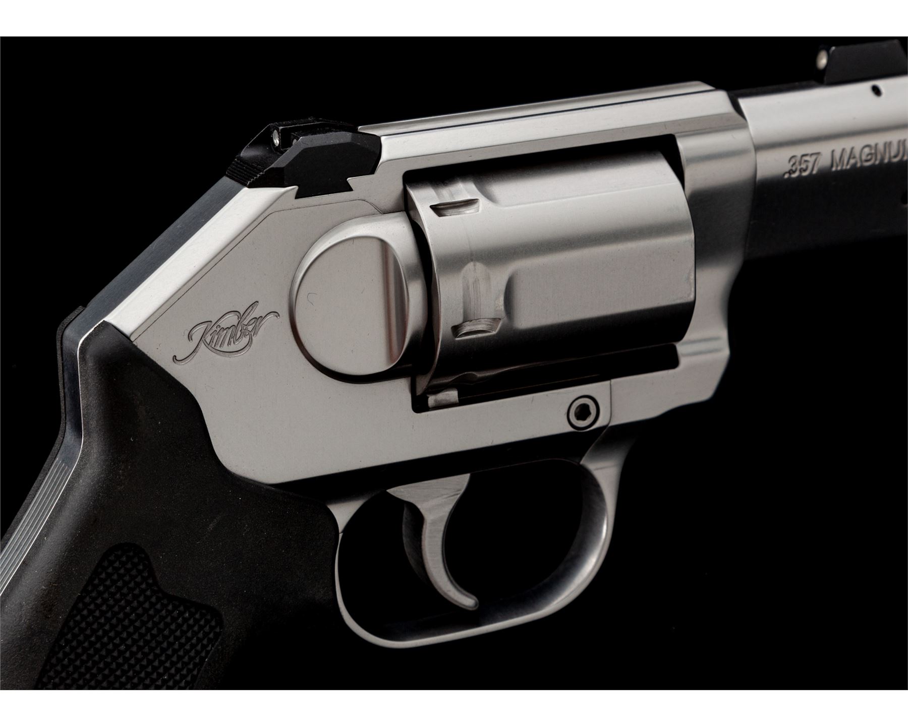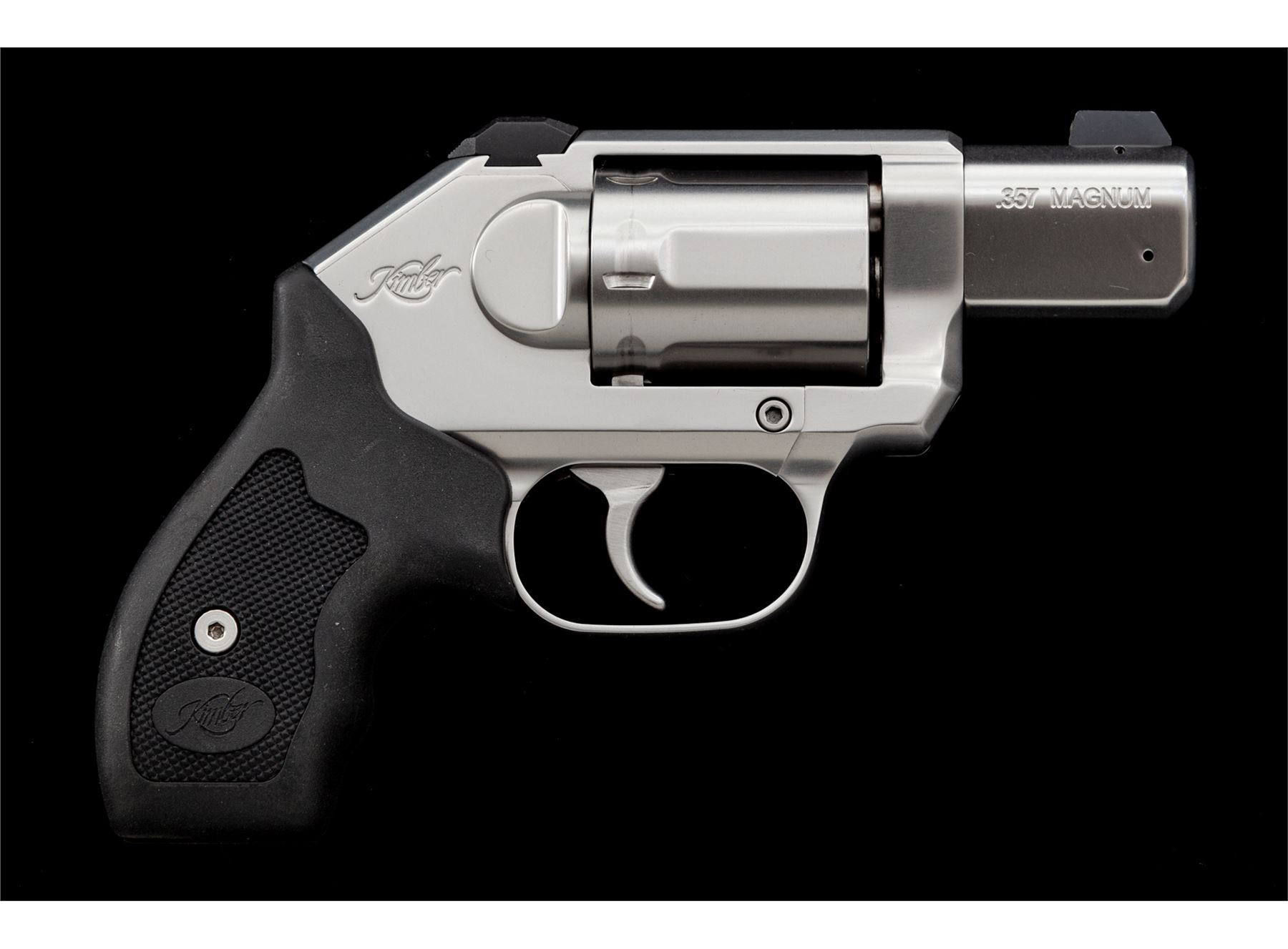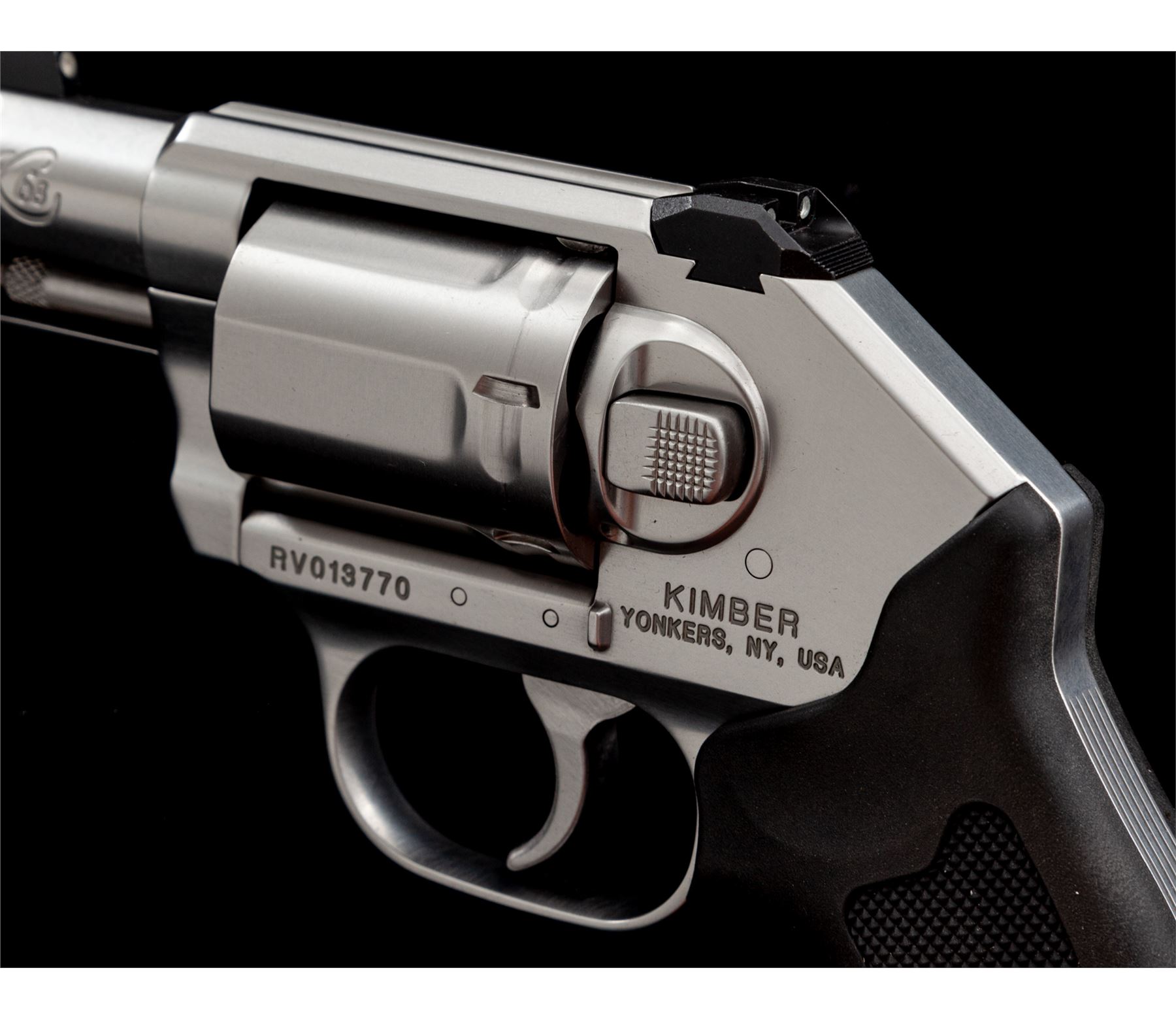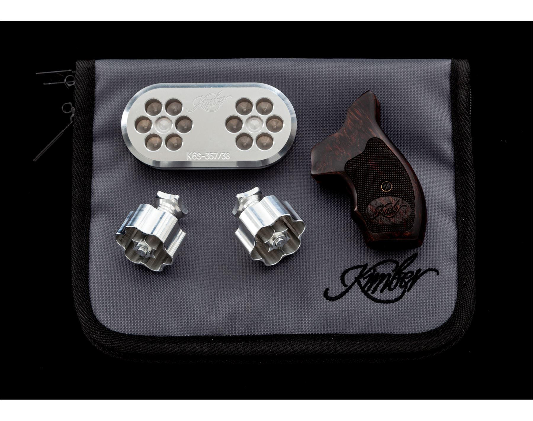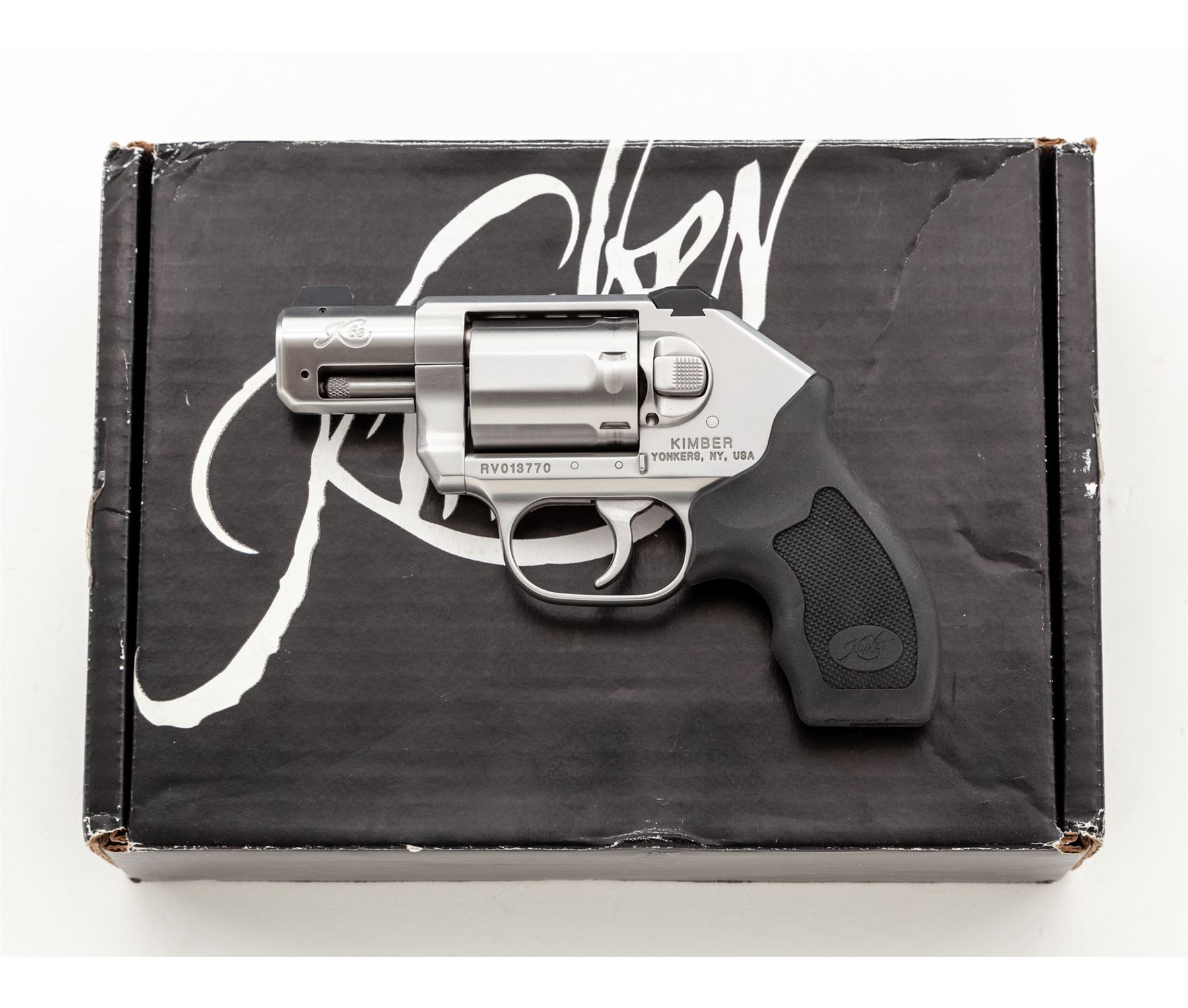 Kimber K6S DCR (Deluxe Carry Revolver), #RV013770, .357 mag. cal., 6-shot, double action, hammerless, 2'' barrel, satin stainless steel, checkered black rubber Kimber/Crimson Trace grips (no laser), and included is the original pair of checkered rosewood grips with Kimber logo. 3-dot night sights include a fixed blade front and square notched rear. In original box with matching end label, owner's manual, and soft padded Kimber case. Also included is a aluminum loading stand with two loaders, by 5-Star Firearms. Condition overall is excellent. Right lower edge of frame with a few minor surface scuffs, cylinder with a light index line. Black rubber grips with only a few slight handling marks. Rosewood grips are like new. Cylinder face with mild burn rings, chambers are clean, this revolver does not appear to have been fired very often. Excellent action and bore. Est.: $800-$1,000. (Modern/PPT)