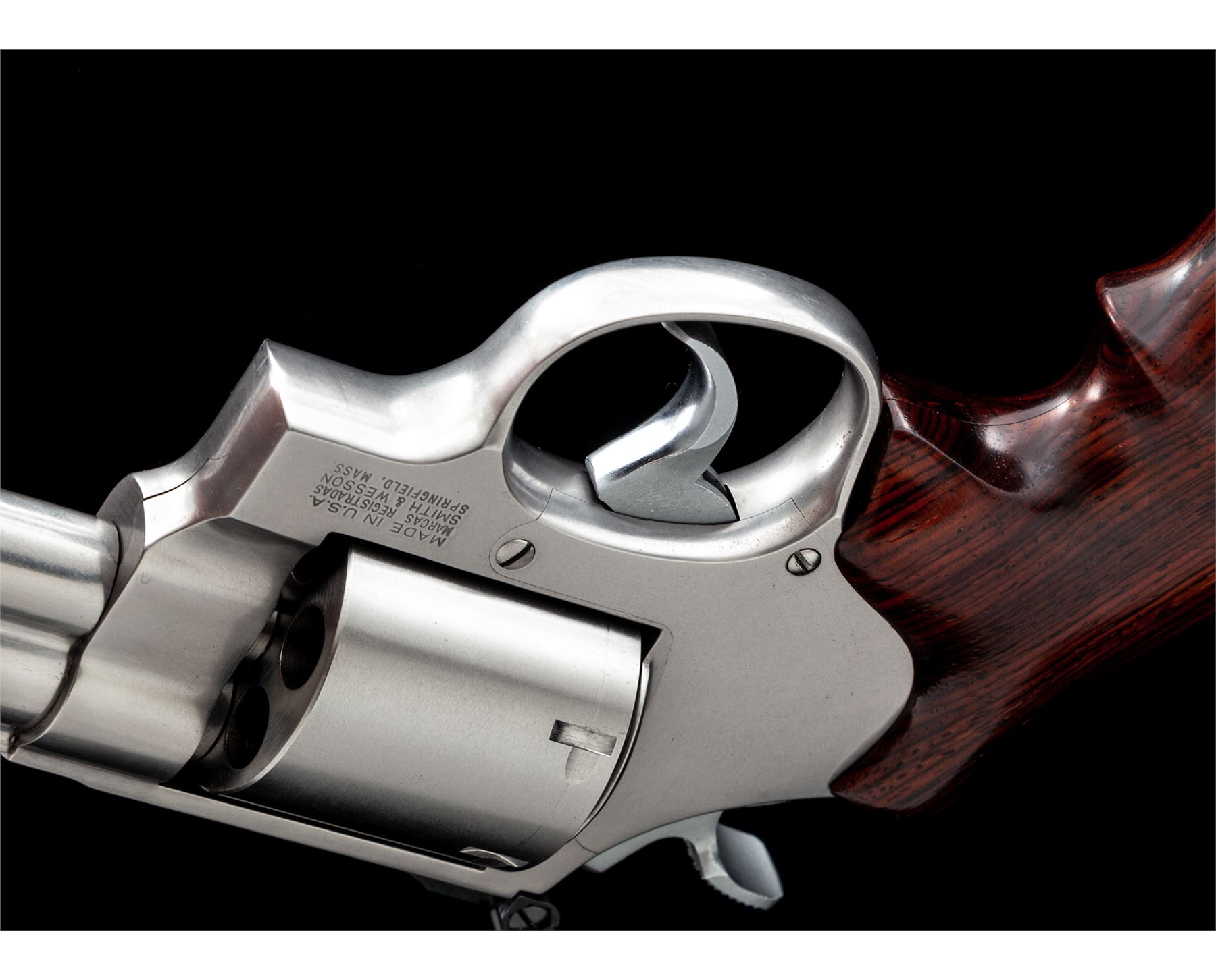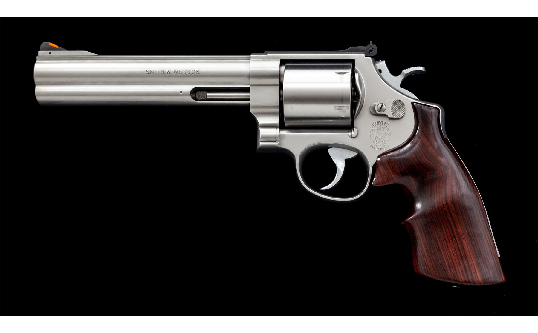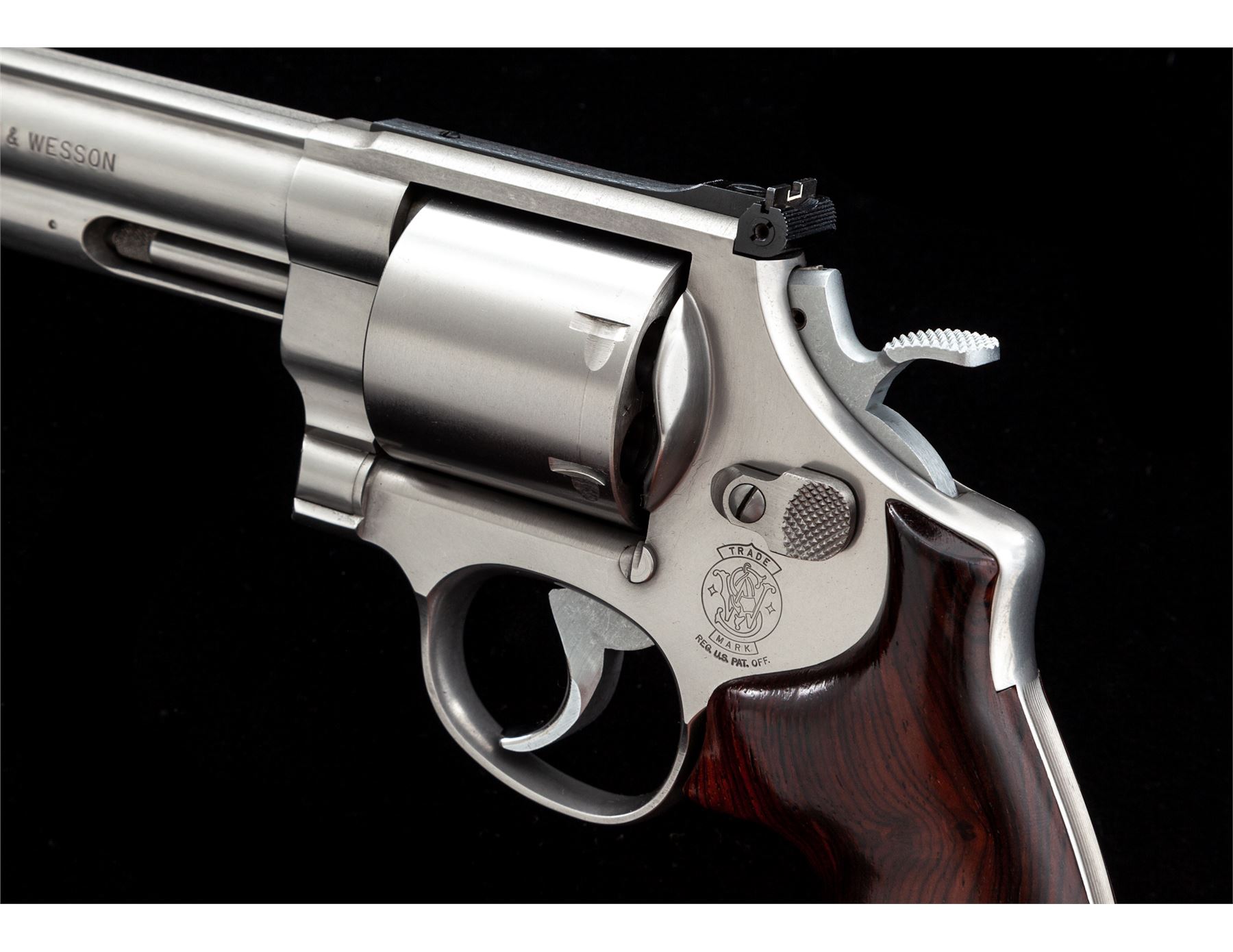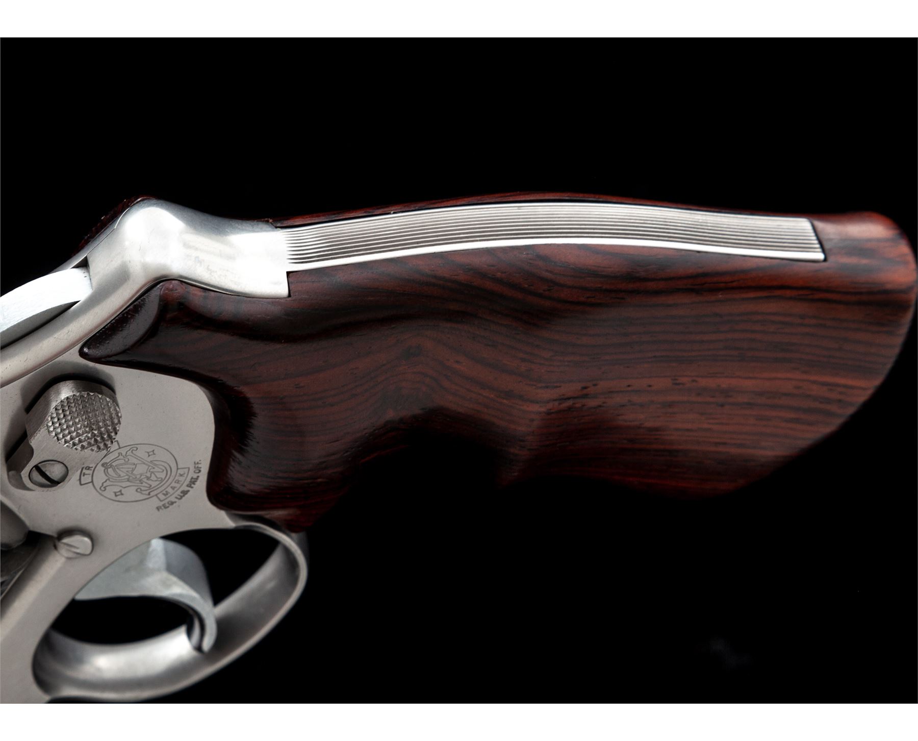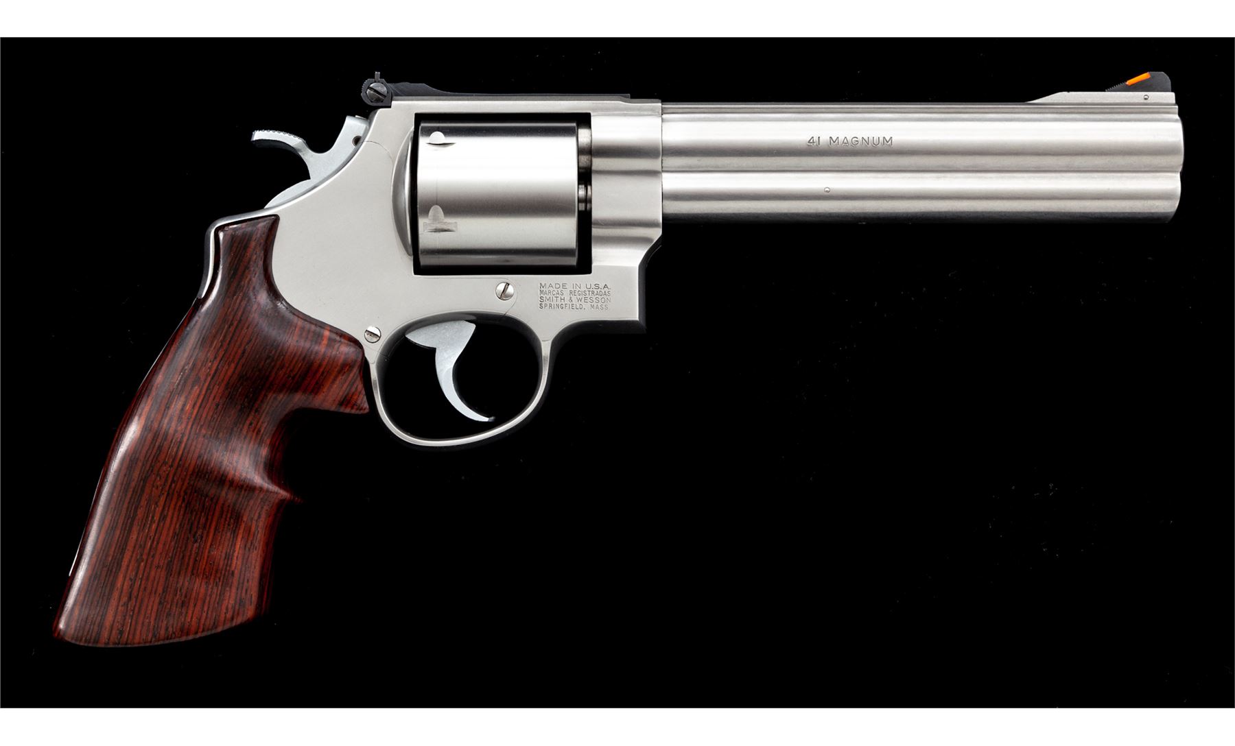 Custom Smith & Wesson Model 657-2 Double Action Revolver, #HTR0302, .41 mag. cal., 6.5'' barrel, stainless steel finish, non-fluted cylinder, custom Border Patrol finger swell cocobolo grips, target hammer, polished target trigger, red ramp front and white outline adjustable rear sight. Action job, chamfered forcing cone and thinned grips with all custom work by George DeLio. Single action trigger letting off right at 2.45 lbs. Condition is excellent appearing new and unused. Est.: $1,000-$1,400. (Modern/PPT)
