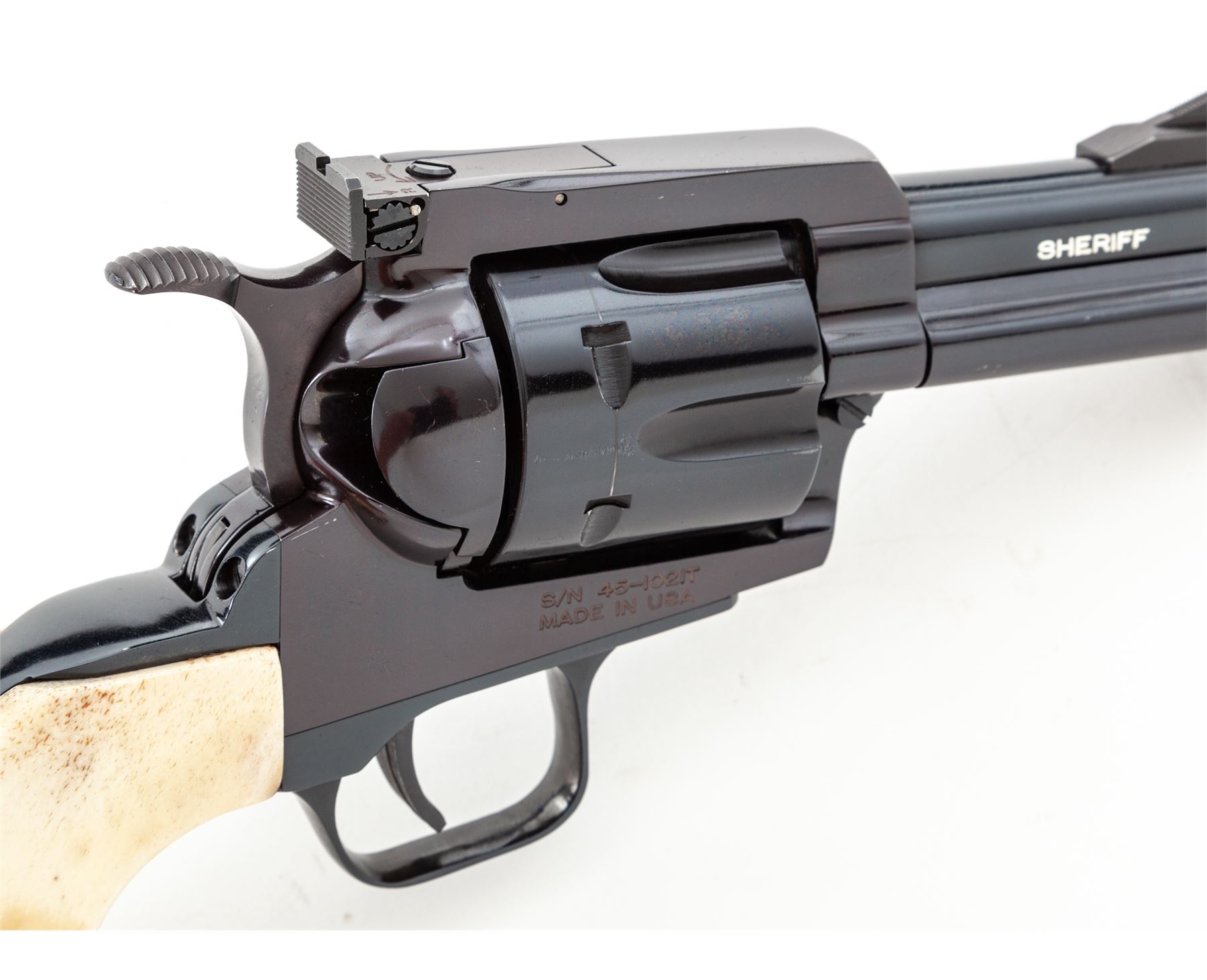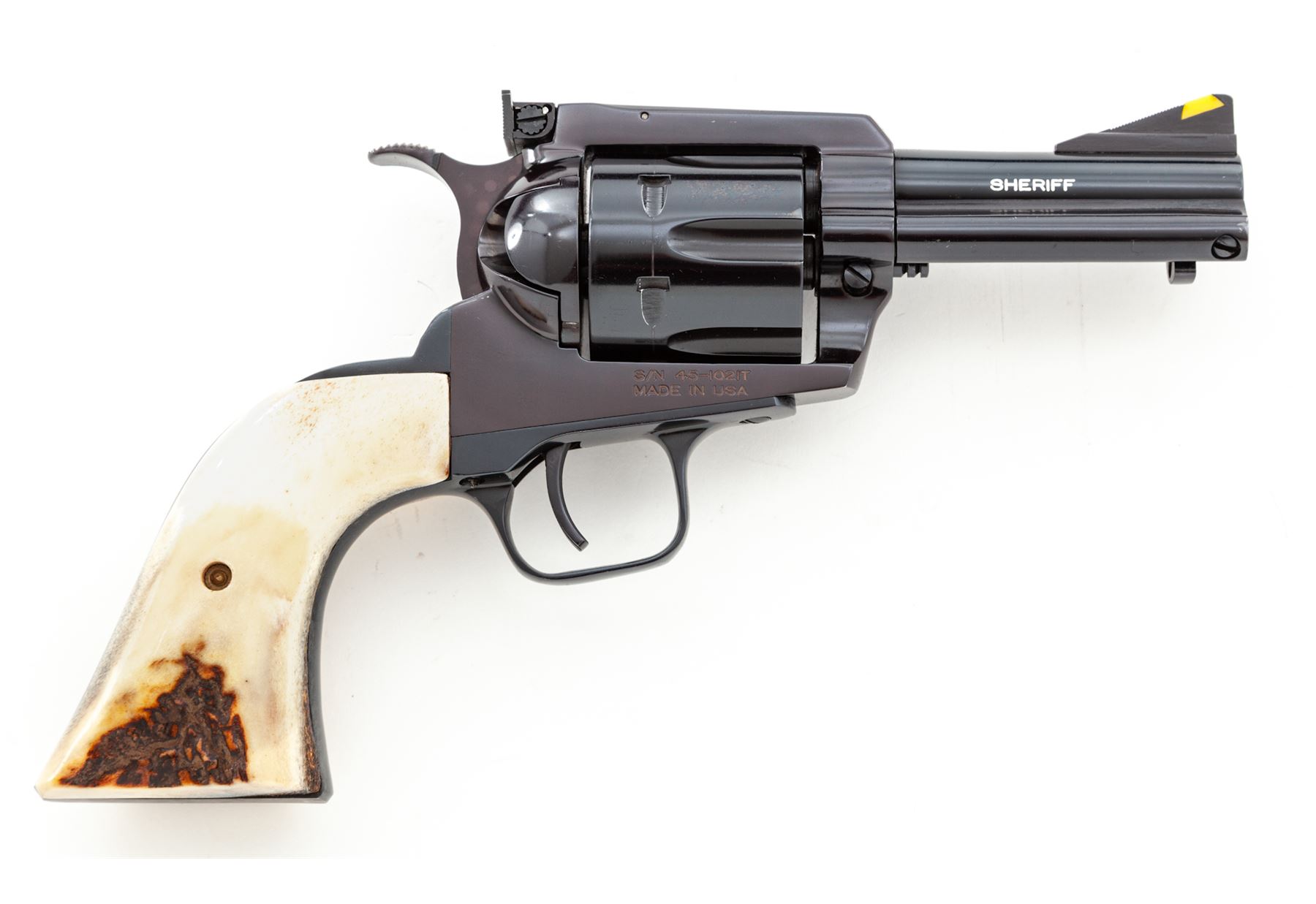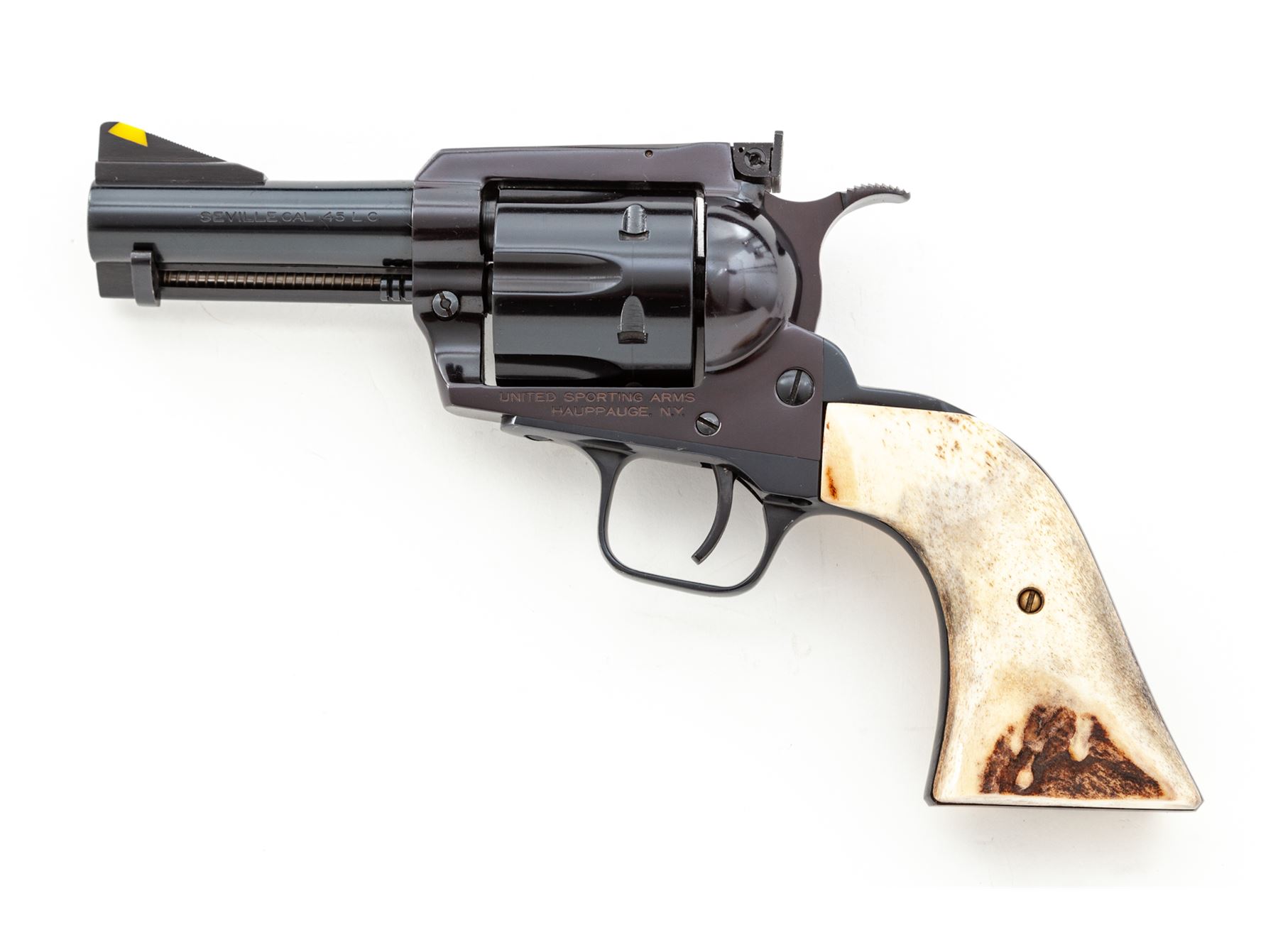 Custom United Sporting Arms Sheriff's Model Seville Single Action Revolver, #45-1021T, .45 Colt cal., 3.5'' barrel, royal blue finish, two-piece stag grips, factory adjustable rear sight and yellow insert front sight, Python type trigger spur, non-fluted cylinder. Tuned action with 3.15 lb. single action trigger pull, with all custom work by George DeLio. Condition appears near new with stunning inky blue/black finish and some of the nicest and well-fitting stag grips we've yet encountered. A revolver of excellent quality. With original receipt from 1996. Est.: $800-$1,200. (Modern/PPT)