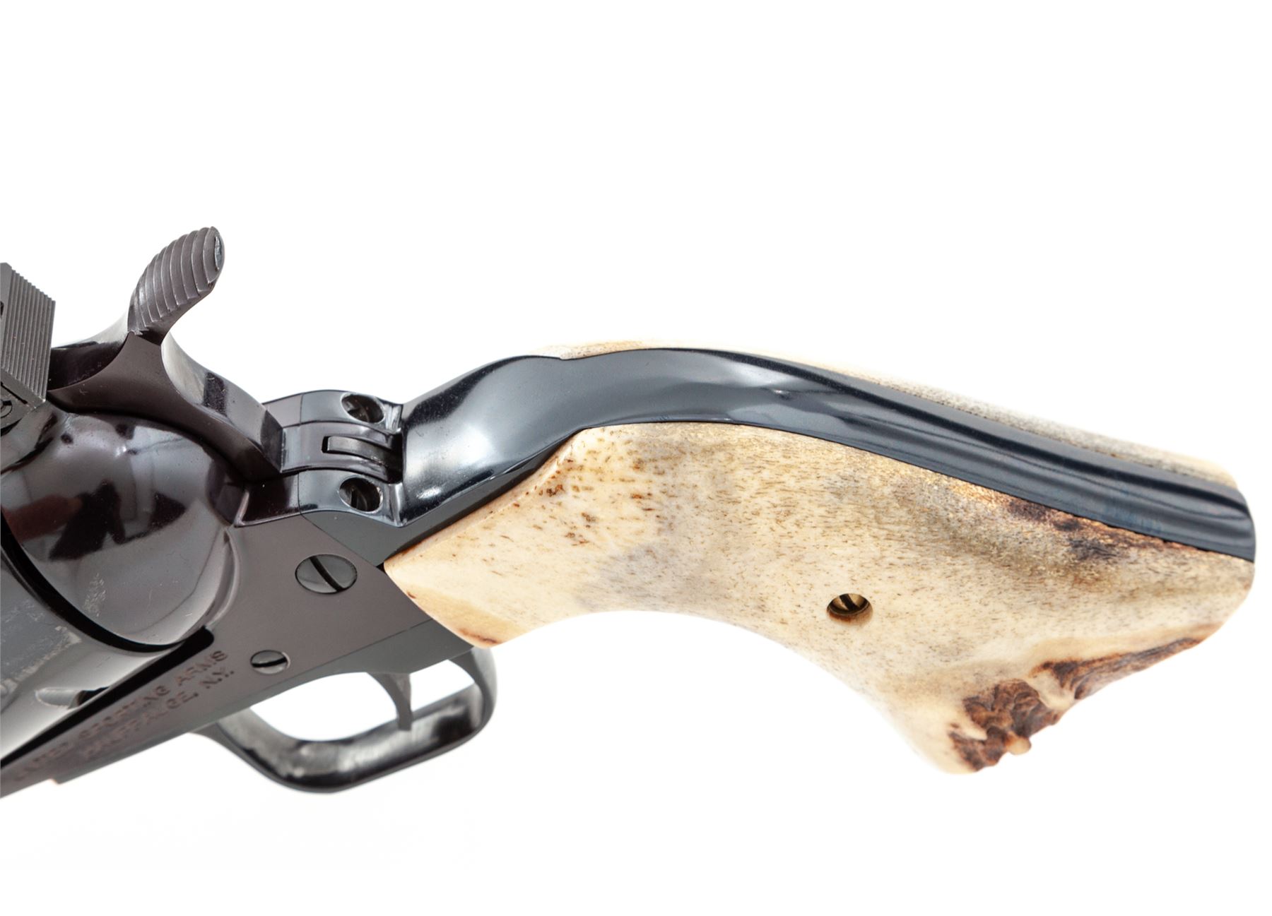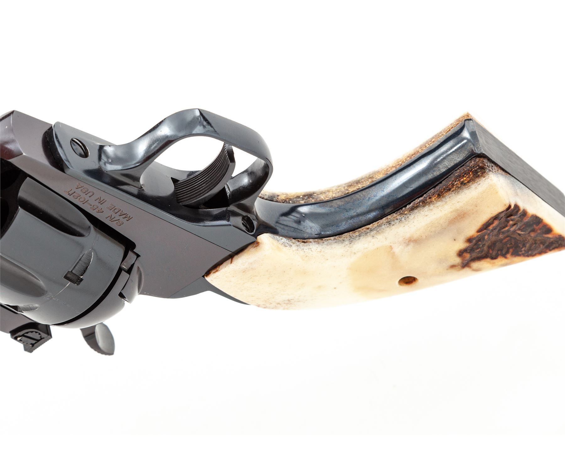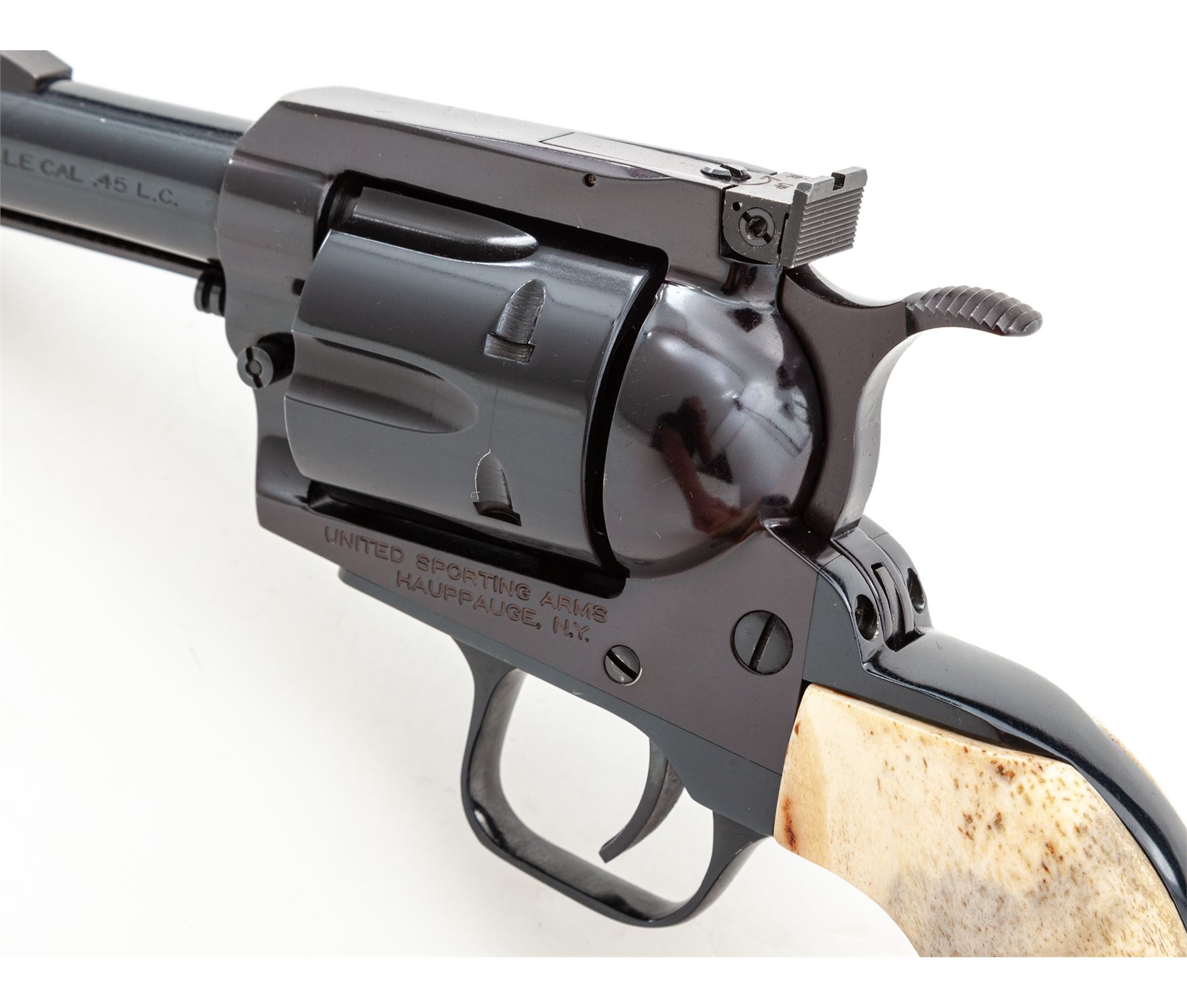 Custom United Sporting Arms Sheriff's Model Seville Single Action Revolver, #45-1021T, .45 Colt cal., 3.5'' barrel, royal blue finish, two-piece stag grips, factory adjustable rear sight and yellow insert front sight, Python type trigger spur, non-fluted cylinder. Tuned action with 3.15 lb. single action trigger pull, with all custom work by George DeLio. Condition appears near new with stunning inky blue/black finish and some of the nicest and well-fitting stag grips we've yet encountered. A revolver of excellent quality. With original receipt from 1996. Est.: $800-$1,200. (Modern/PPT)