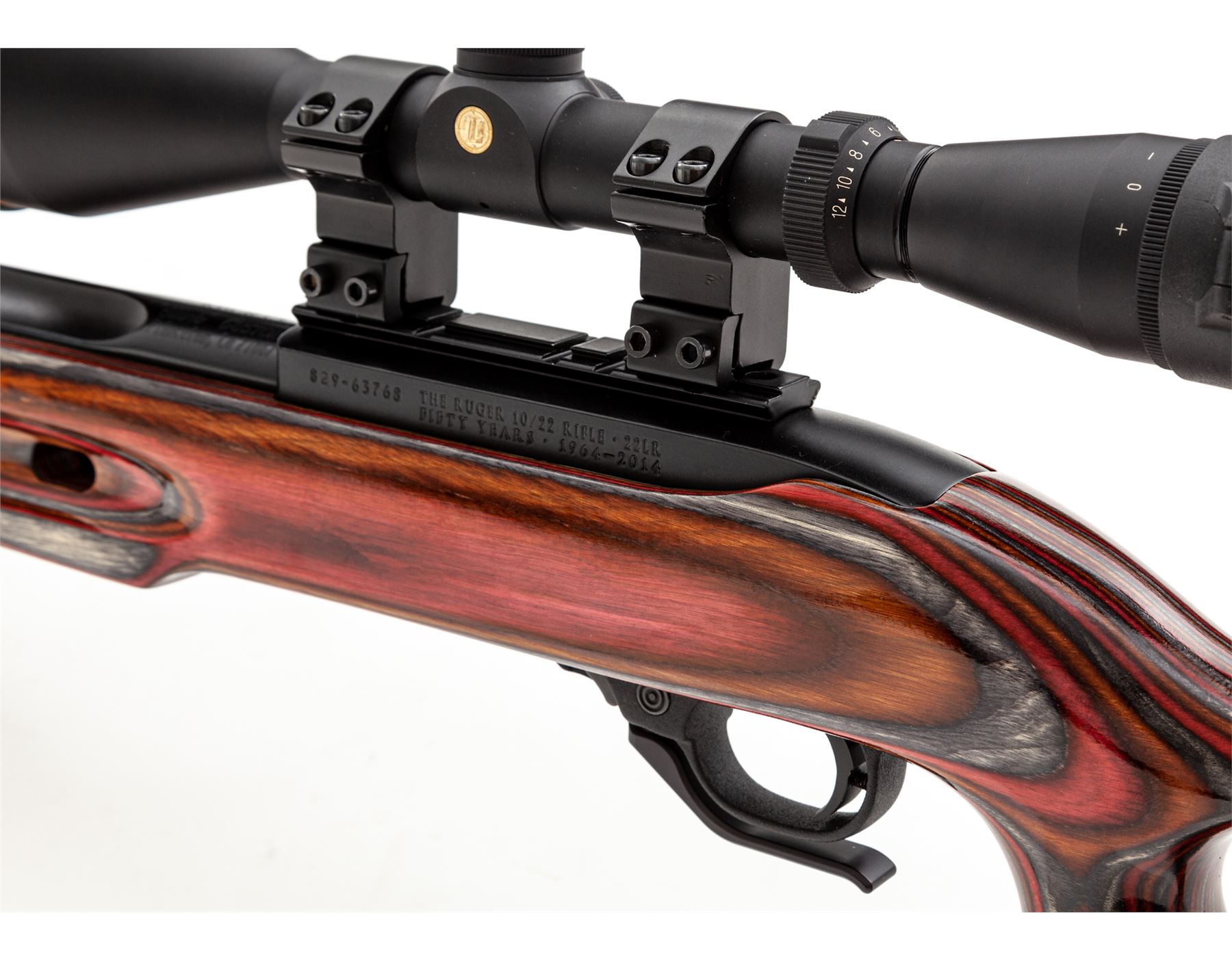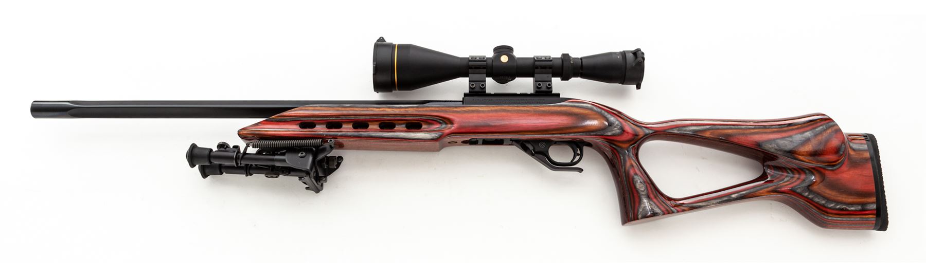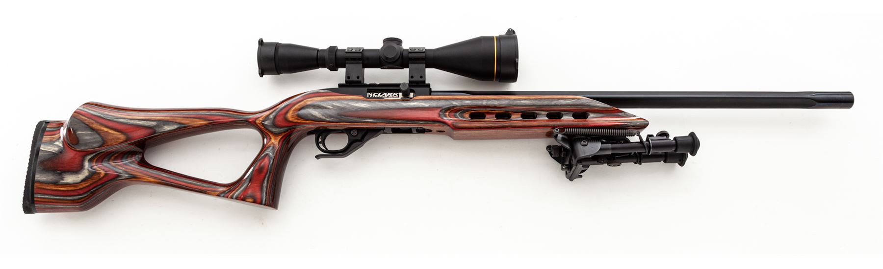 Customized Ruger 10/22 Semi-Automatic Rifle, #829-63768, .22 LR cal., Clark custom fluted 22'' barrel, blue finish, red/orange/grey laminated cutaway pistol-grip cheekpiece stock, with rubber butt pad. Topped with a Leupold VX-2/4-12x50 scope with covers. Clark Custom Guns marked bolt, extended bolt handle and mag release, custom adjustable trigger, with bipod. Complete with seven (7) factory magazines, other accessories, and case. Condition is excellent, as built on a 10/22 frame marked ''50 Years 1964-2014''. Beautiful stock, no marks on barrel or frame. Good crisp action, bright bore, clear scope optics with duplex reticle. Est.: $600-$900. (Modern)