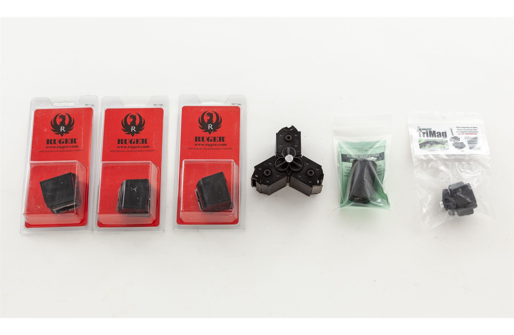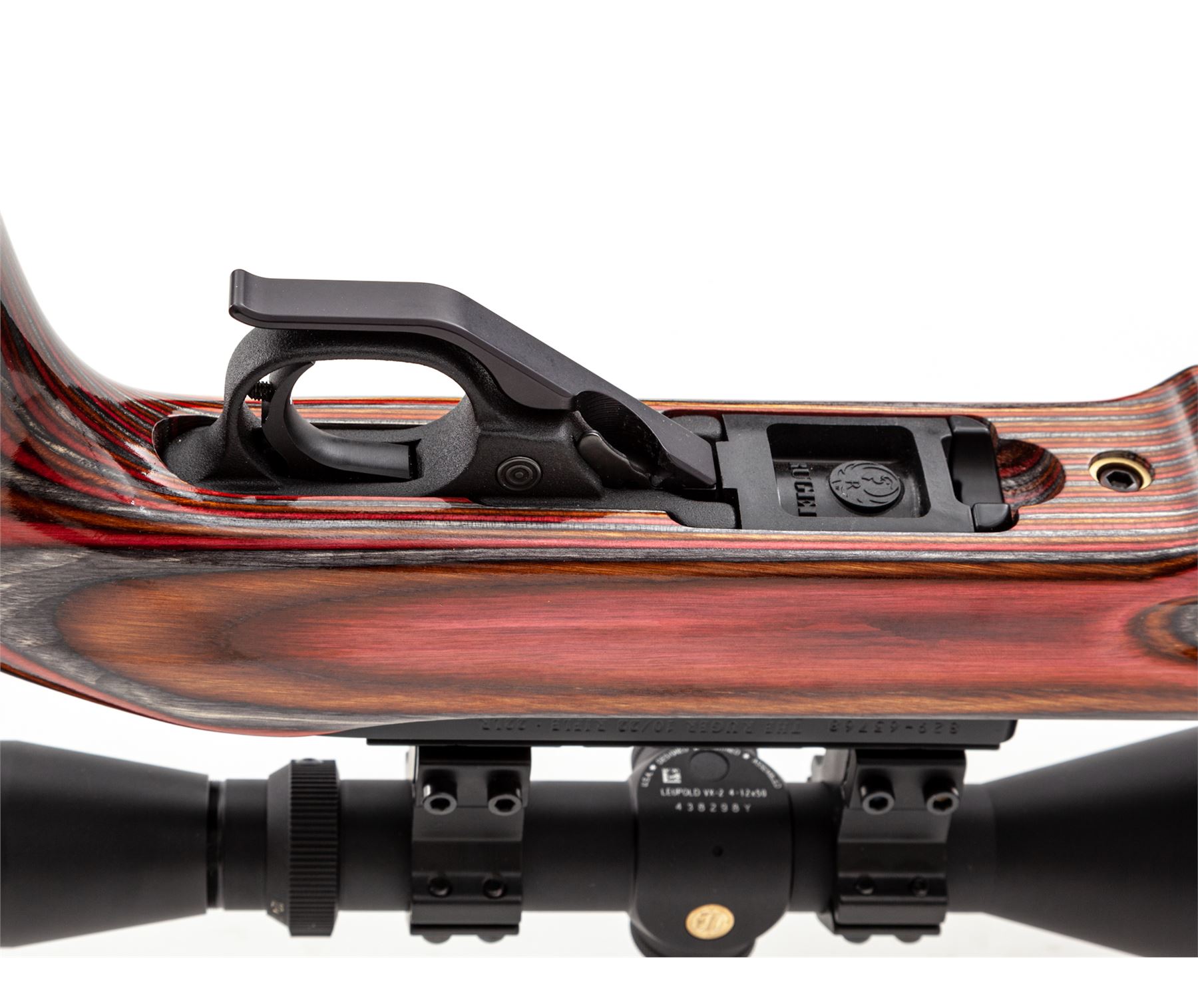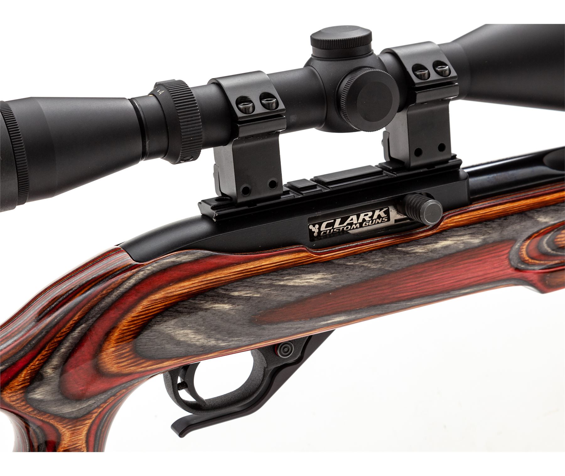 Customized Ruger 10/22 Semi-Automatic Rifle, #829-63768, .22 LR cal., Clark custom fluted 22'' barrel, blue finish, red/orange/grey laminated cutaway pistol-grip cheekpiece stock, with rubber butt pad. Topped with a Leupold VX-2/4-12x50 scope with covers. Clark Custom Guns marked bolt, extended bolt handle and mag release, custom adjustable trigger, with bipod. Complete with seven (7) factory magazines, other accessories, and case. Condition is excellent, as built on a 10/22 frame marked ''50 Years 1964-2014''. Beautiful stock, no marks on barrel or frame. Good crisp action, bright bore, clear scope optics with duplex reticle. Est.: $600-$900. (Modern)