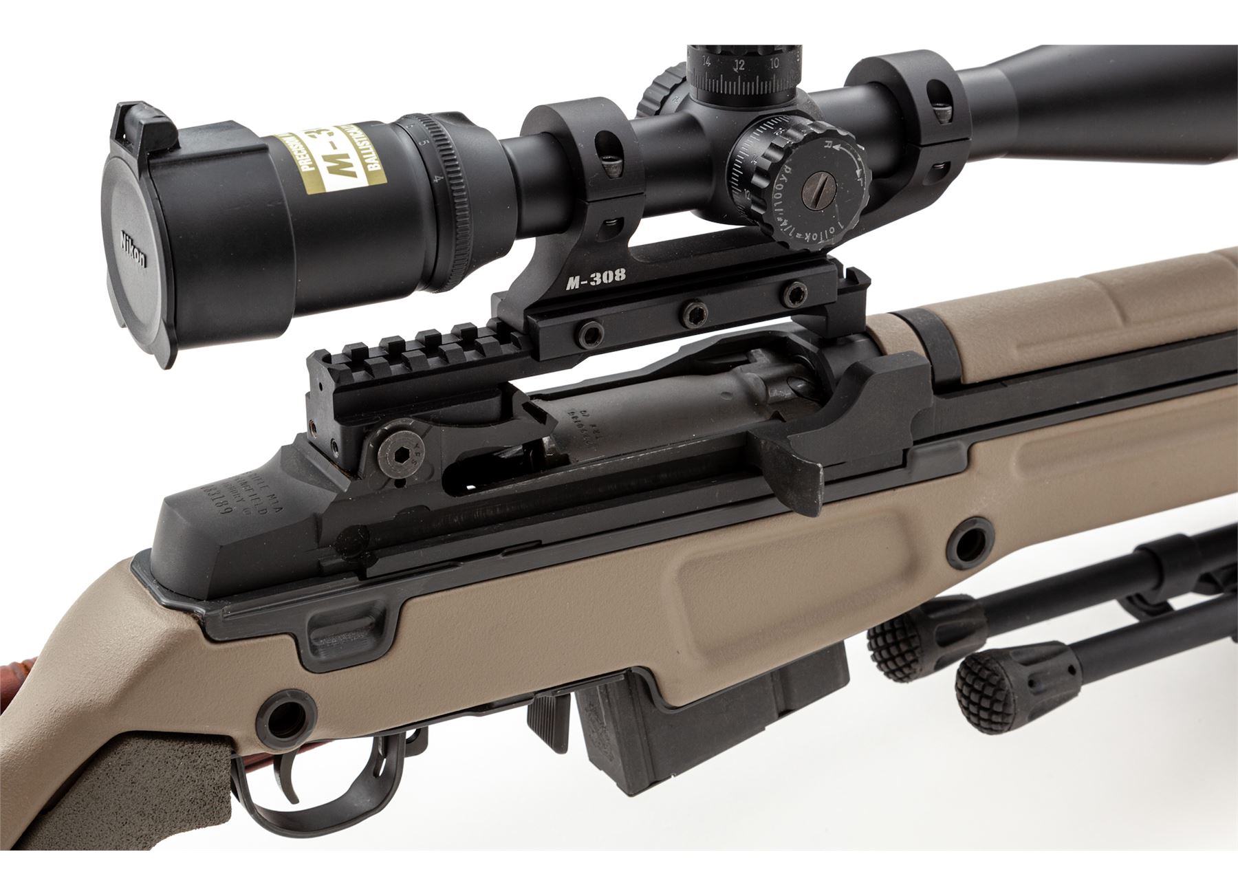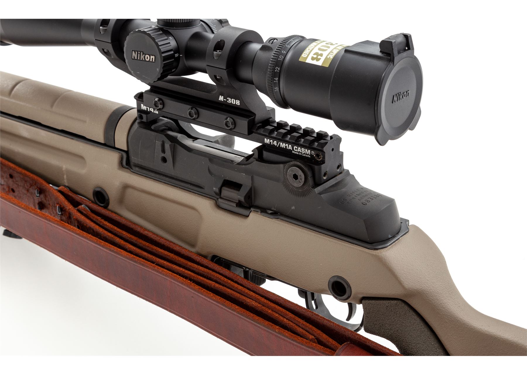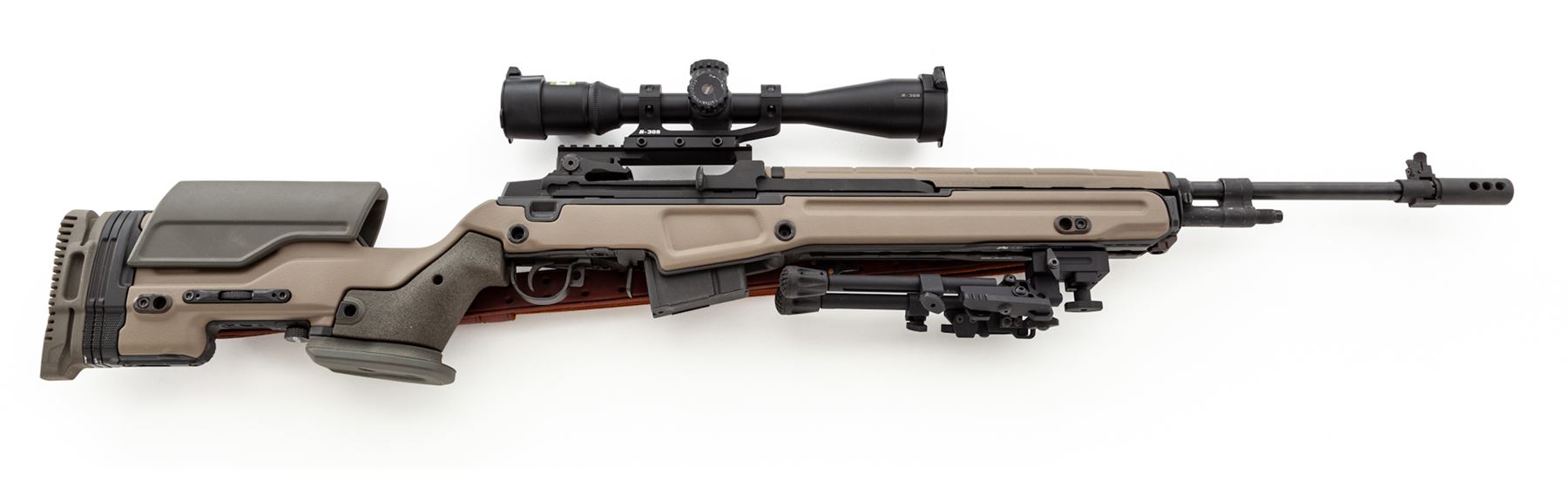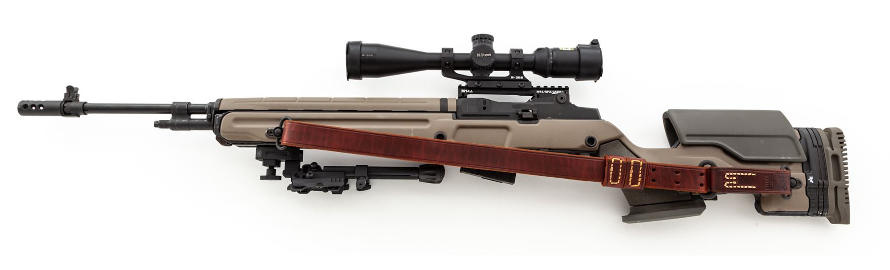 Extensively Upgraded Springfield Armory M1A Semi-Automatic Rifle, #083189, 7.62x51mm cal., 22'' Smith Enterprises ''Crazy Horse'' barrel and muzzlebrake that was installed by Smith, metal surfaces with a phosphate finish. Original stock has been replaced with a J. Allen Enterprises JAE-100 G3 chassis with buttstock spacers, adjustable cheekpiece, flush mounted lower rail with GG&G XDS-2 bipod, sling swivels, and 1.25'' wide brown leather Custom Match sling. TRW marked bolt and hammer, ''HR'' trigger housing, .062 NM front sight, and one 5-round magazine. Rifle is topped with an M14.ca CASM base with black oxide coating, Nikon M-308 mount, and Nikon M-308 4-16x42 scope with BDC reticle and Nikon lens covers. In excellent overall condition showing only normal signs of light range use, which includes a few light scuffs and scratches around the op rod and left side of receiver. Stock appears near new and also shows only a few minor rub marks from handling and use. Smooth action; bright bore with sharp rifling. Scope is like new and shows no signs of mentionable wear or handling, optics are bright and clear. Est.: $2,500-$3,500. (Modern)