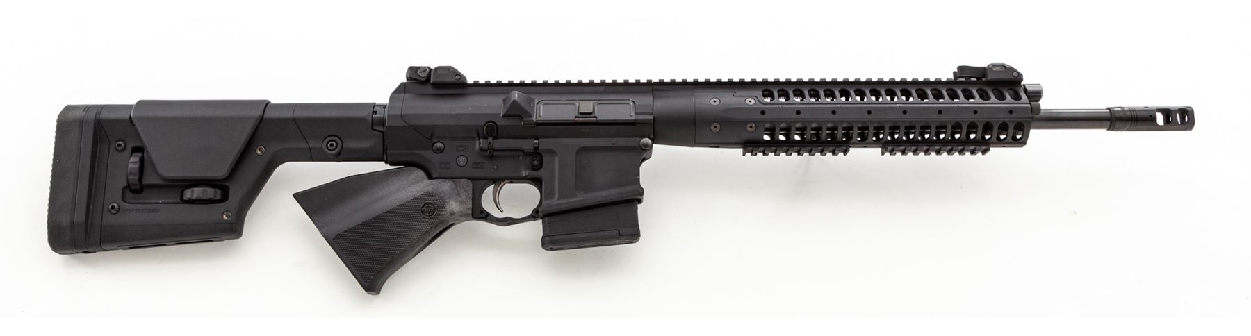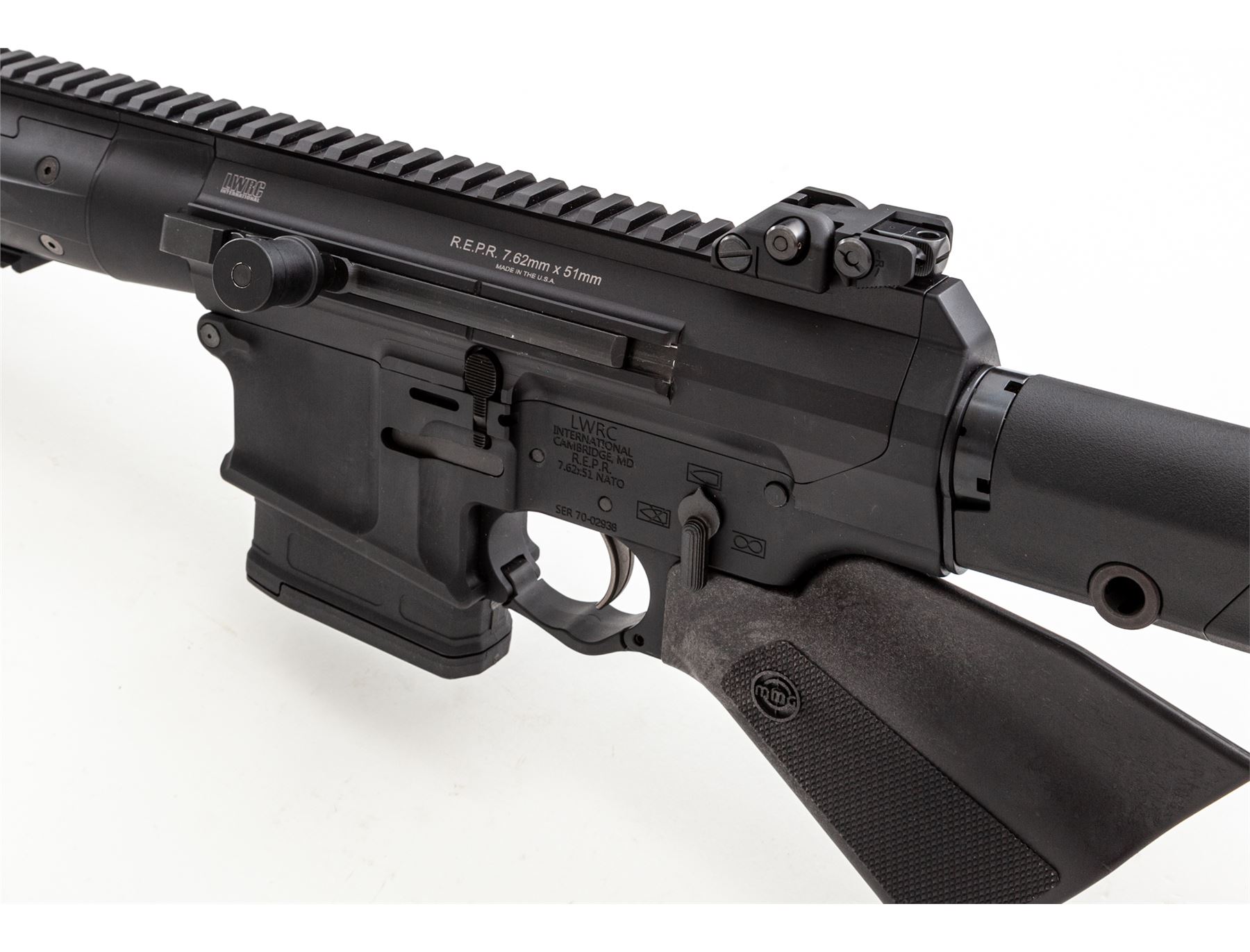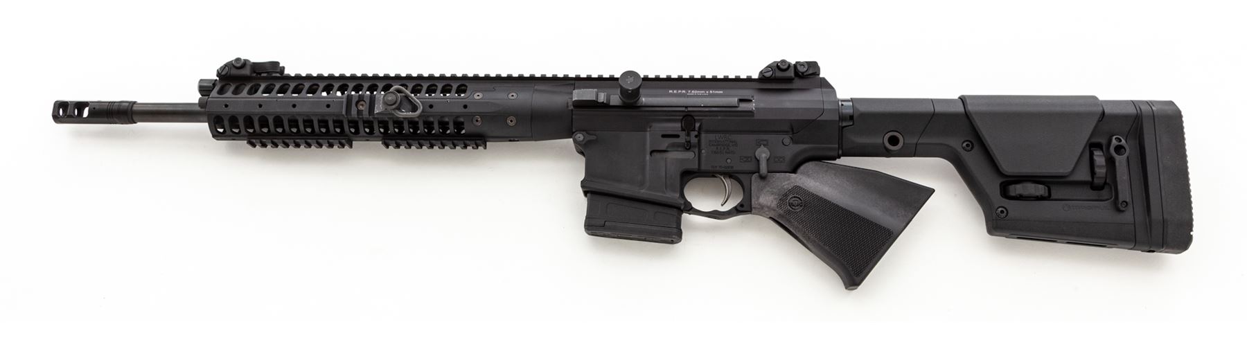 LWRC R.E.P.R. (Rapid Engagement Precision Rifle), with fifteen (15) magazines, #70-02938, 7.62x51mm cal., 16'' barrel, 18.5'' overall which includes the Surefire Procomp muzzlebrake, and black finish. Black Magpul PRS Gen3 stock with adjustable cheekpiece and recoil pad, ''featureless'' MonsterMan grip. Also featuring a left side-mounted charging handle, standard magazine release (no bullet button), quad rail system which includes a full length upper rail with LWRC Skirmish flip-up front and rear sight, and ambidextrous bolt release. Included are a total of five (5) 10-round Magpul PMAG M3 magazines with dust/impact covers; ten (10) Magpul PMAG 20LR magazines that have been pinned to a 10-round capacity, also with dust/impact covers and include bullet button tools mounted to the bottom portion of the magazine. Several of the magazines are new and in original packaging. Overall condition is excellent, appearing near new, with a few light scuffs and small handling marks. Excellent action; bright bore with sharp rifling. Est.: $2,200-$2,600. (Modern)