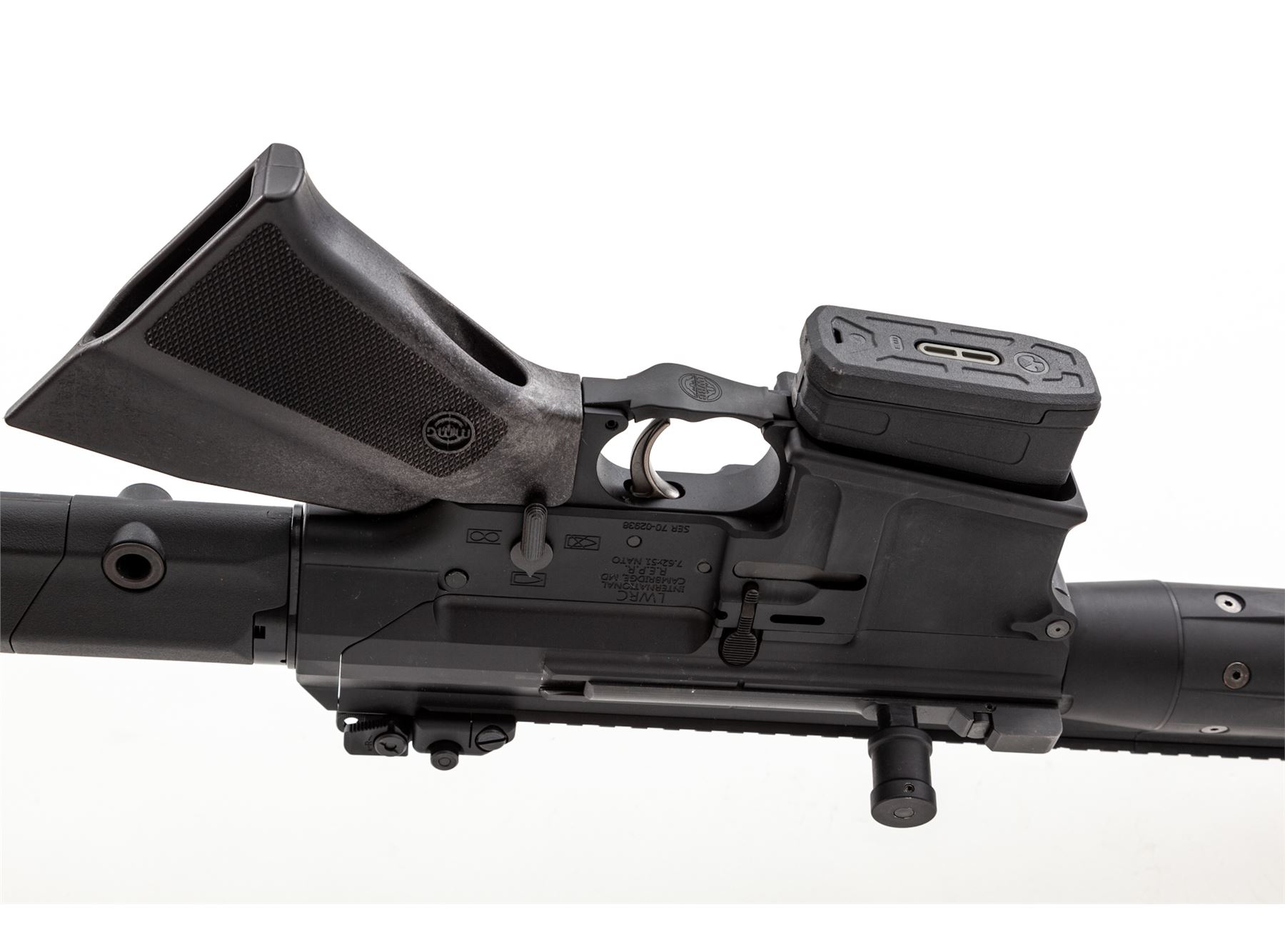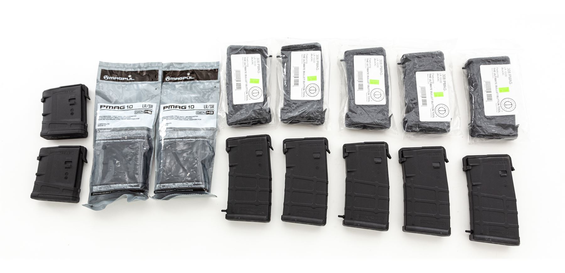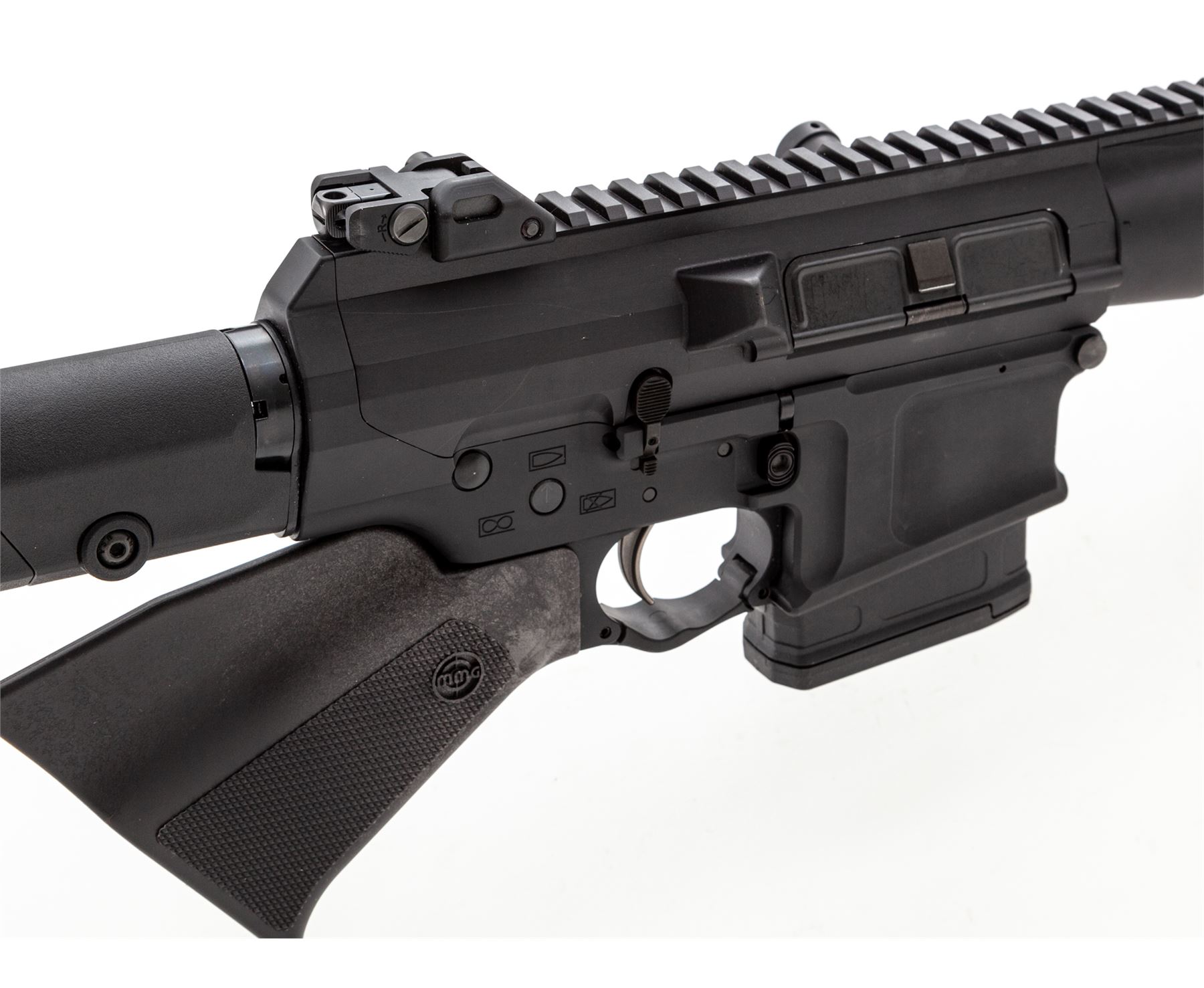 LWRC R.E.P.R. (Rapid Engagement Precision Rifle), with fifteen (15) magazines, #70-02938, 7.62x51mm cal., 16'' barrel, 18.5'' overall which includes the Surefire Procomp muzzlebrake, and black finish. Black Magpul PRS Gen3 stock with adjustable cheekpiece and recoil pad, ''featureless'' MonsterMan grip. Also featuring a left side-mounted charging handle, standard magazine release (no bullet button), quad rail system which includes a full length upper rail with LWRC Skirmish flip-up front and rear sight, and ambidextrous bolt release. Included are a total of five (5) 10-round Magpul PMAG M3 magazines with dust/impact covers; ten (10) Magpul PMAG 20LR magazines that have been pinned to a 10-round capacity, also with dust/impact covers and include bullet button tools mounted to the bottom portion of the magazine. Several of the magazines are new and in original packaging. Overall condition is excellent, appearing near new, with a few light scuffs and small handling marks. Excellent action; bright bore with sharp rifling. Est.: $2,200-$2,600. (Modern)