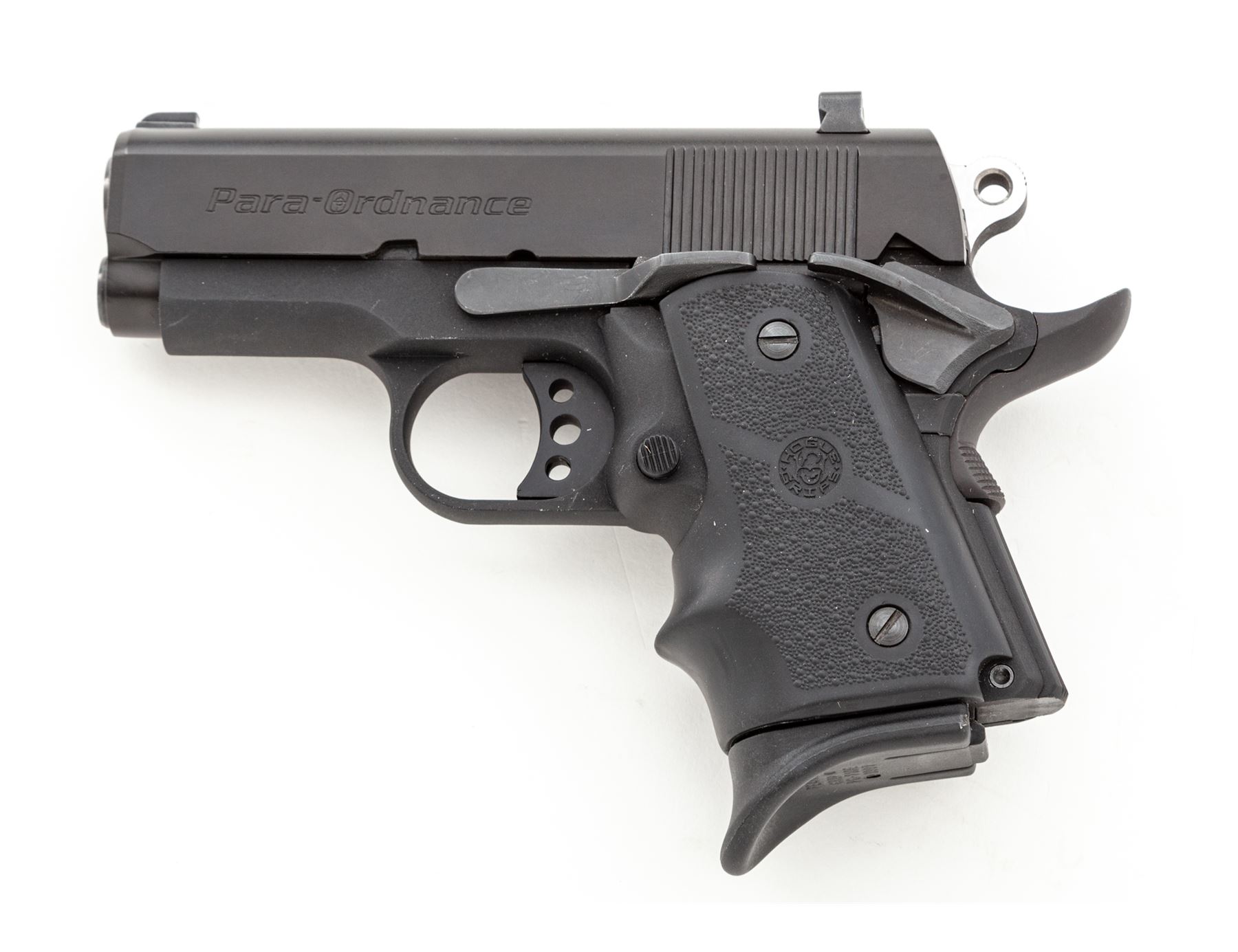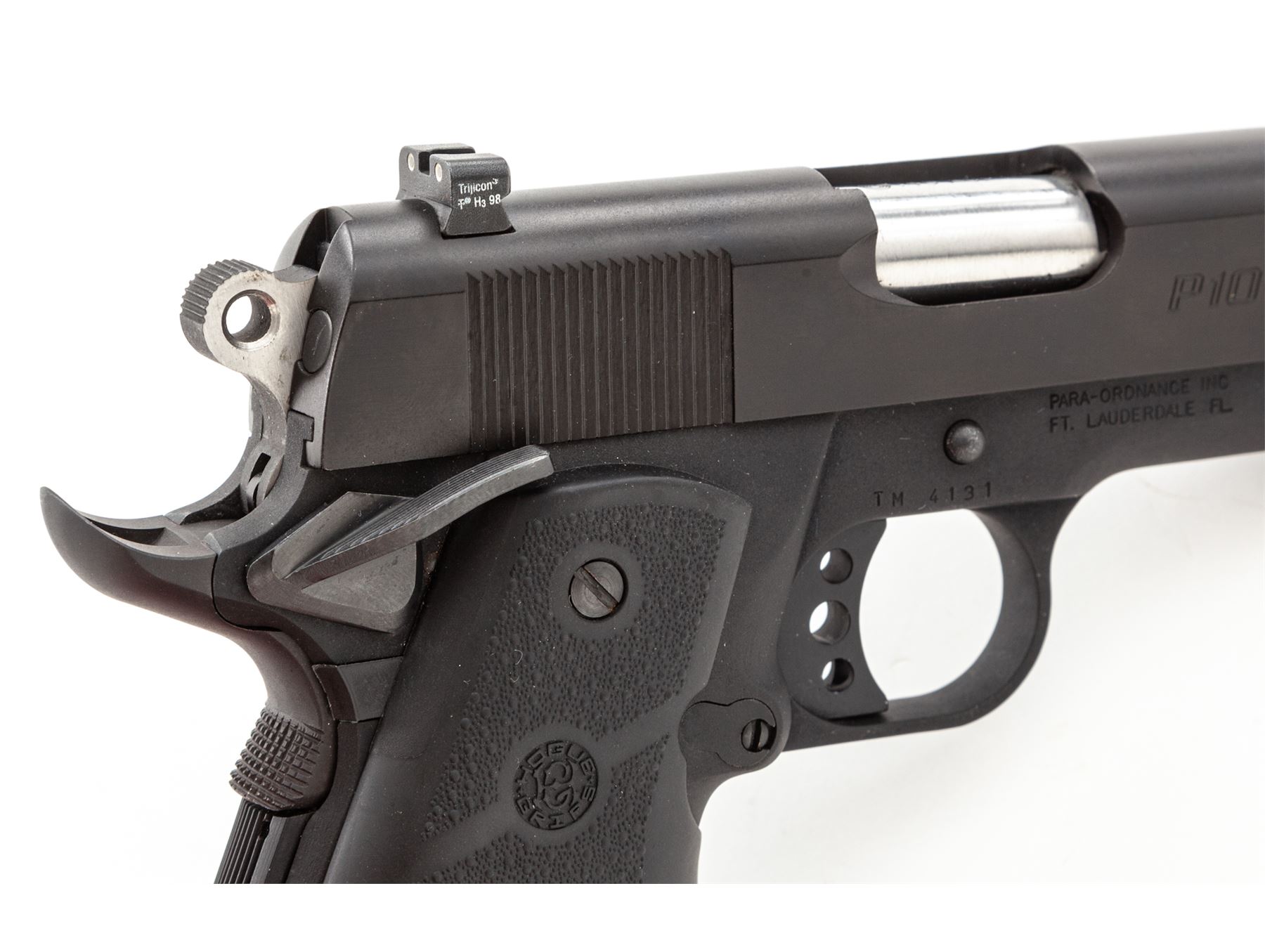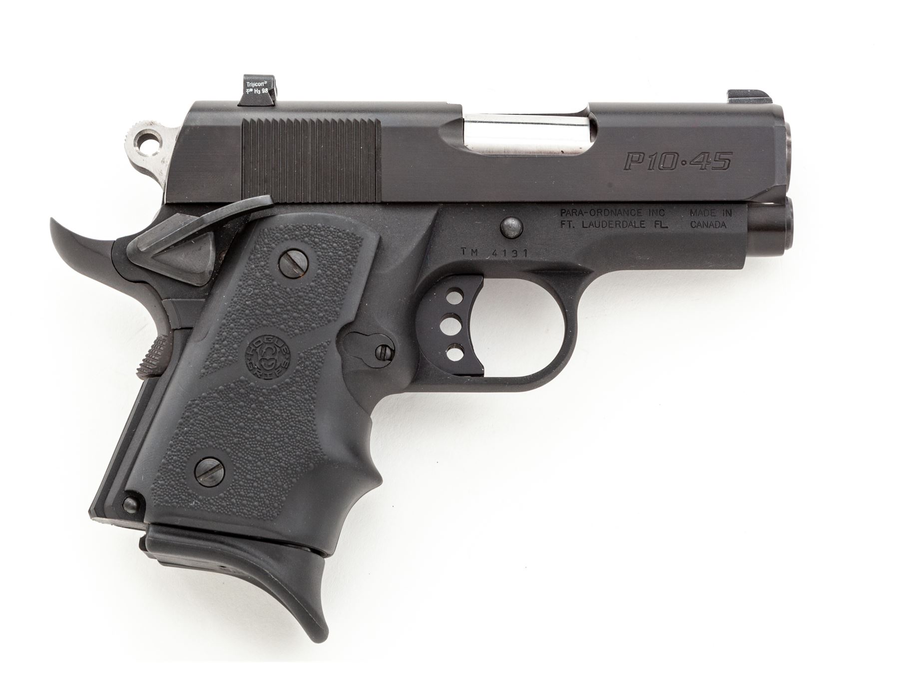 Custom Para-Ordnance P10-45 Semi-Automatic Pistol, #TM 4131, .45 ACP cal., 3.25'' barrel, matte finish, Hogue finger-groove wraparound rubber grips, two magazines and two mag extensions. Pistol additionally features extended slide release, Commander ring hammer, partially checkered extended grip safety, King's match trigger, ambidextrous thumb safety, and Trijicon sights, with all custom work by George DeLio. Barrel throat and chamber polished, angle and polish to feed ramp, action job is crisp with the trigger letting off right at 4.5 lbs. Condition is excellent, appearing new and unused since its build in the mid 1990's. Est.: $750-$1,000. (Modern/PPT)