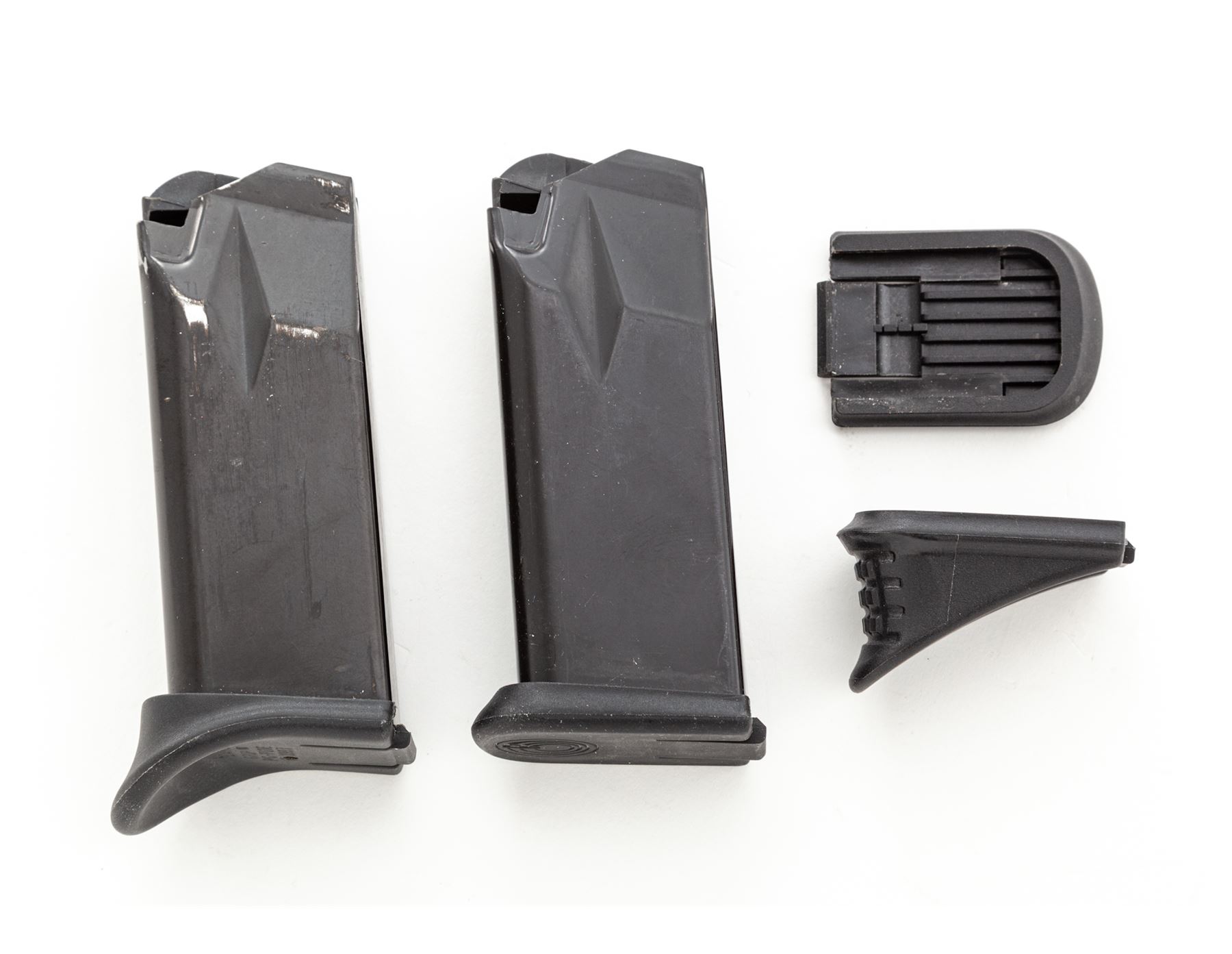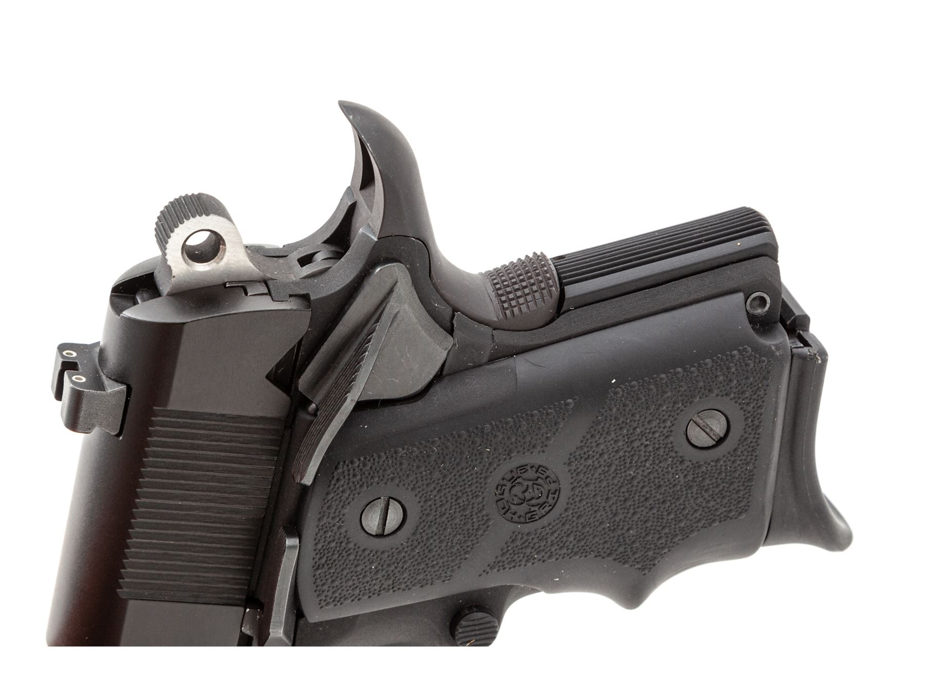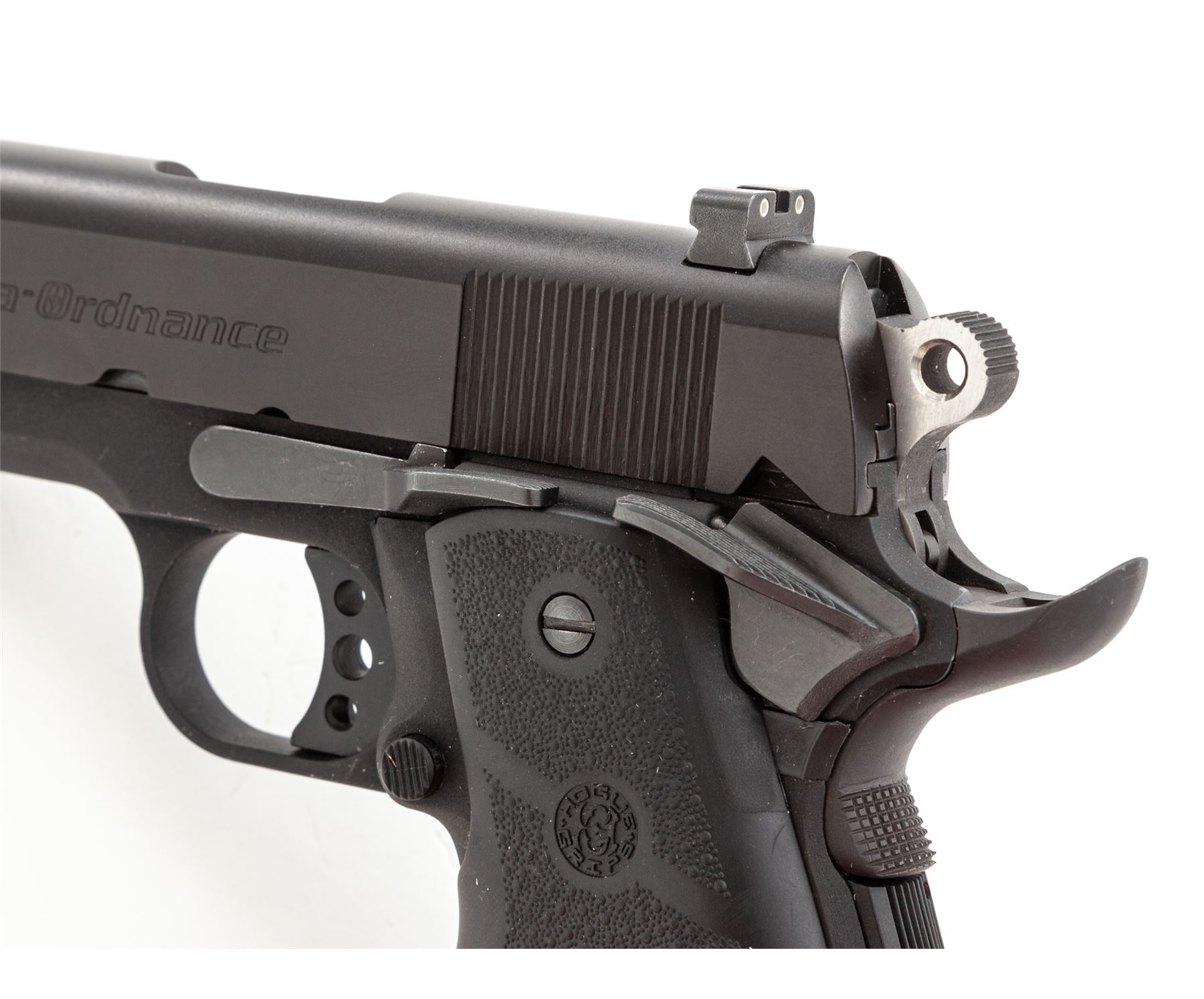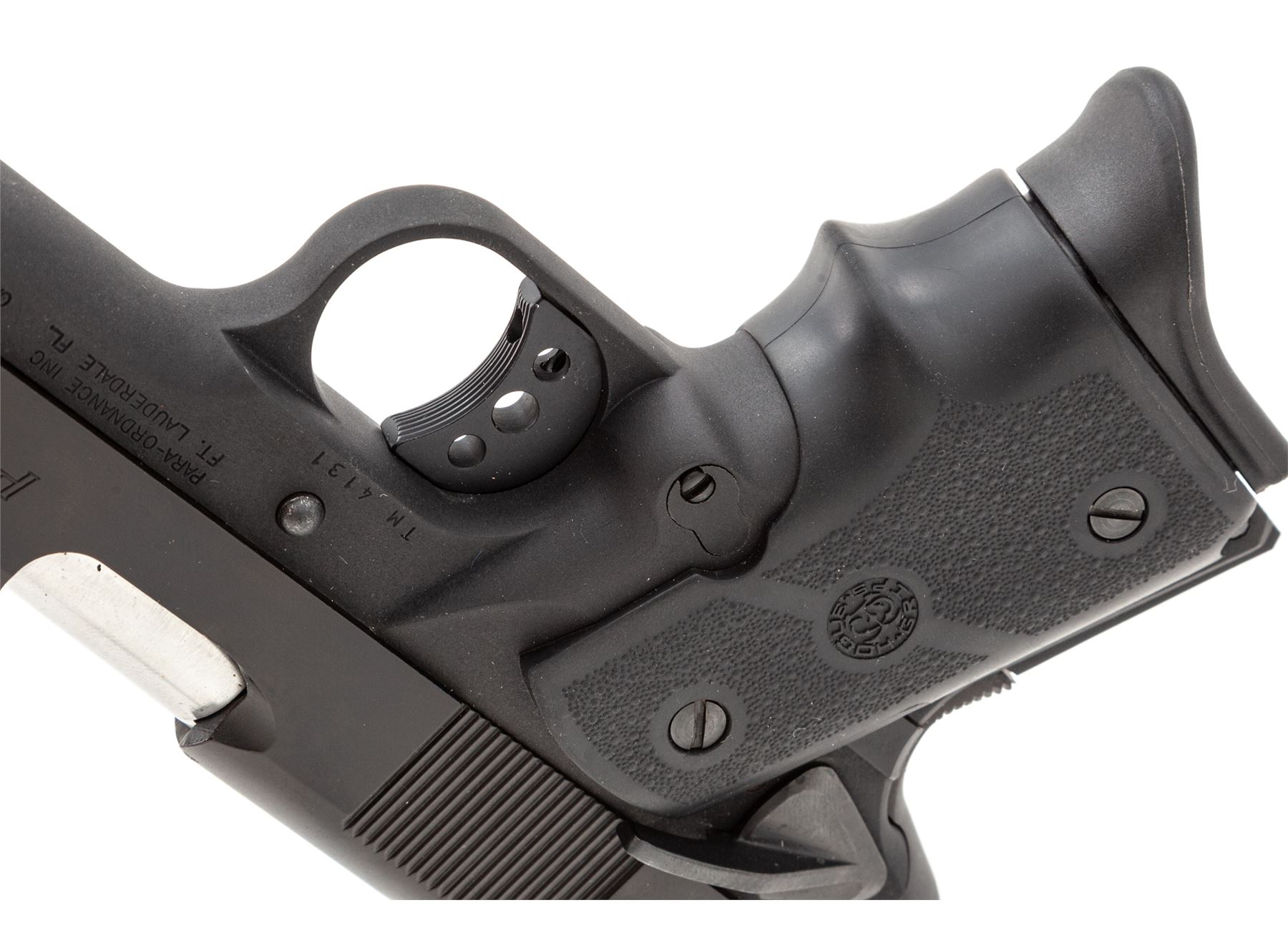 Custom Para-Ordnance P10-45 Semi-Automatic Pistol, #TM 4131, .45 ACP cal., 3.25'' barrel, matte finish, Hogue finger-groove wraparound rubber grips, two magazines and two mag extensions. Pistol additionally features extended slide release, Commander ring hammer, partially checkered extended grip safety, King's match trigger, ambidextrous thumb safety, and Trijicon sights, with all custom work by George DeLio. Barrel throat and chamber polished, angle and polish to feed ramp, action job is crisp with the trigger letting off right at 4.5 lbs. Condition is excellent, appearing new and unused since its build in the mid 1990's. Est.: $750-$1,000. (Modern/PPT)
