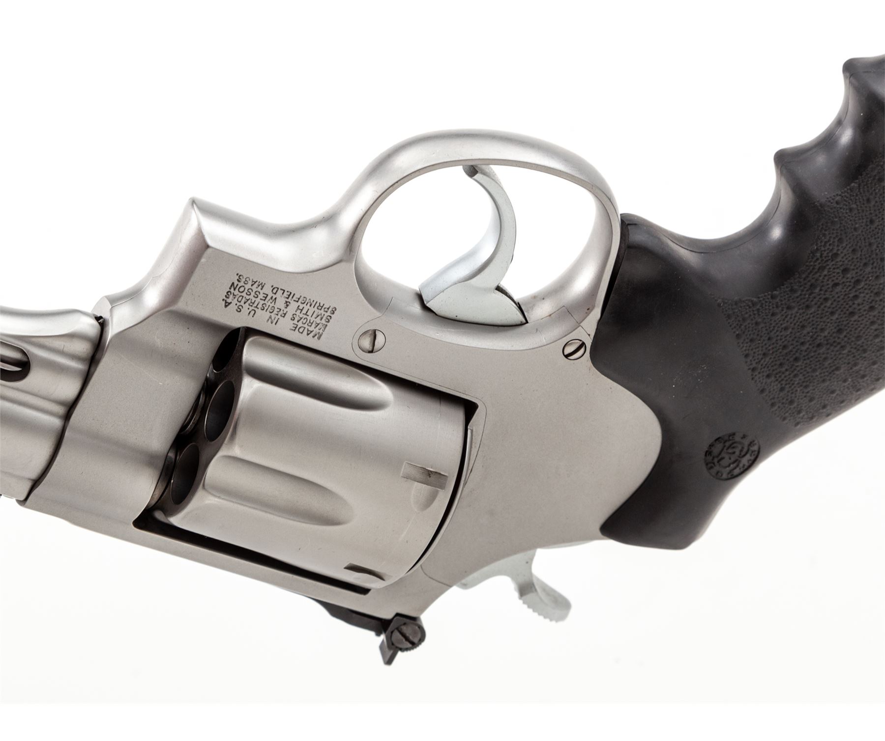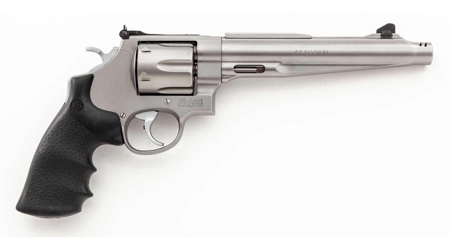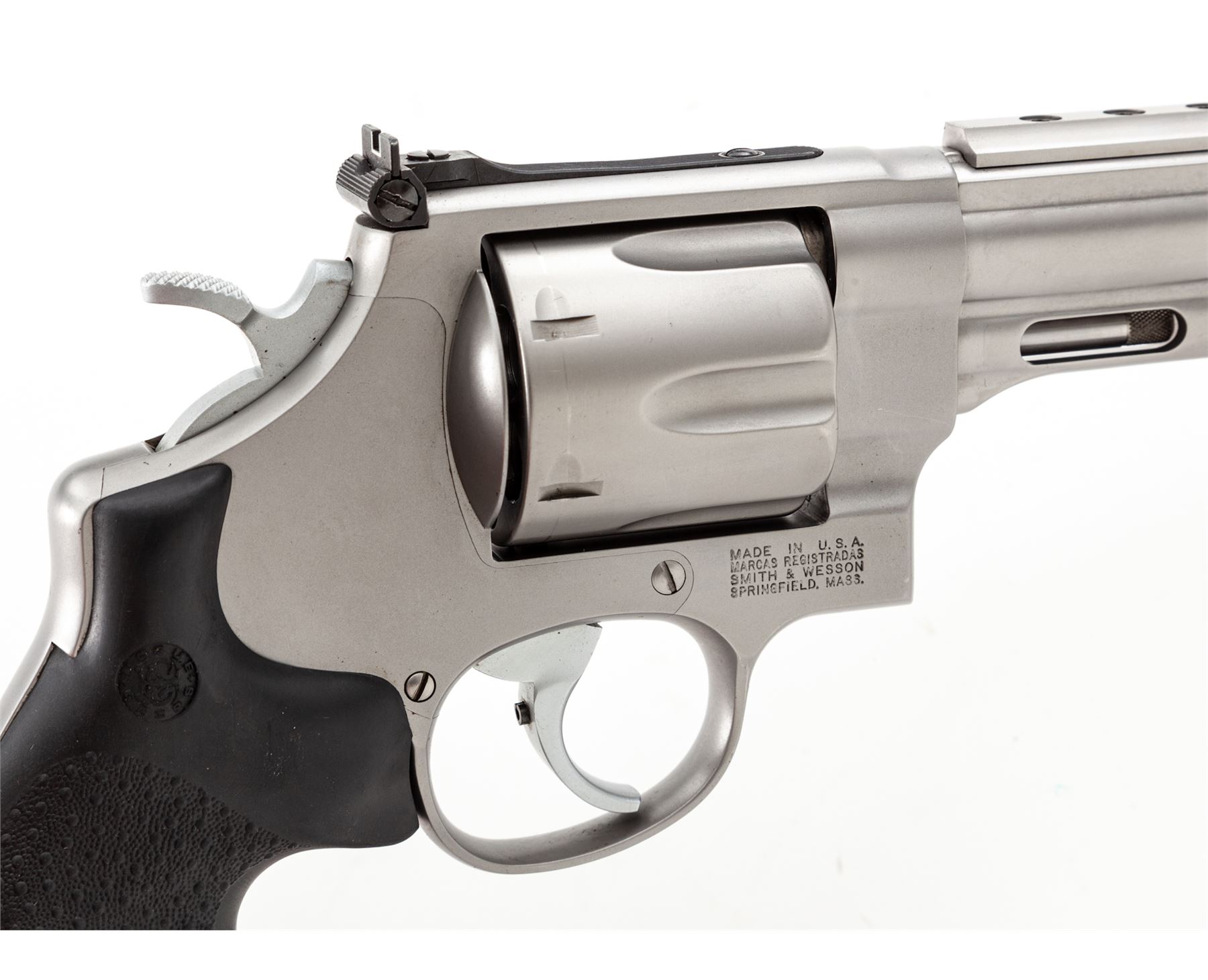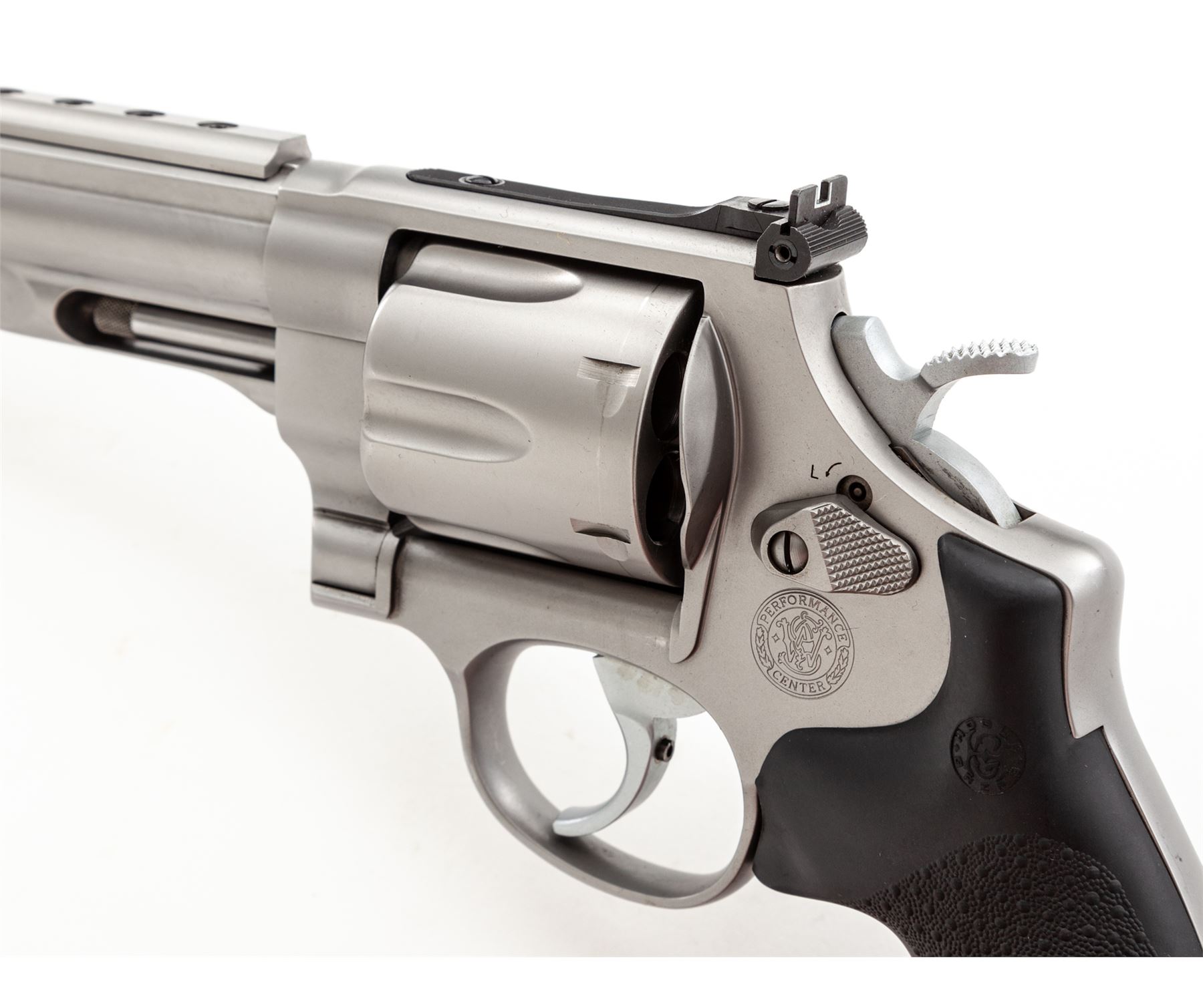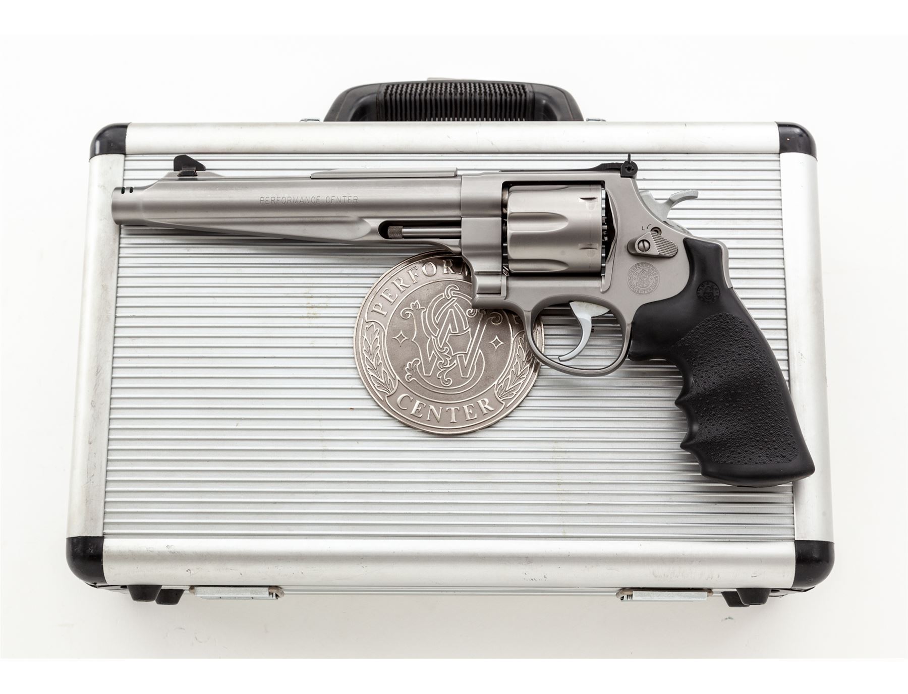 Smith & Wesson Performance Center Model 629-6 Double Action Revolver, with PC case, #HAA0003, .44 mag. cal., 7.5'' compensated barrel with removable mount, satin nickel finish, stippled black rubber Hogue grips with finger grooves, tall orange front sight, white-outline rear sight adjustable for both windage and elevation. In silver Performance Center carrying case, with owner's manual, cable lock, safety key, and additional barrel mount. Condition is excellent showing normal signs of very light range use. Metal with a few intermittent minor marks, cylinder with light index line. Factory lettering is clear and crisp. Grips show normal small handling marks. Inside of the frame, cylinder face, and chambers are very clean. Excellent action and bright bore. Est.: $750-$1,000. (Modern/PPT)