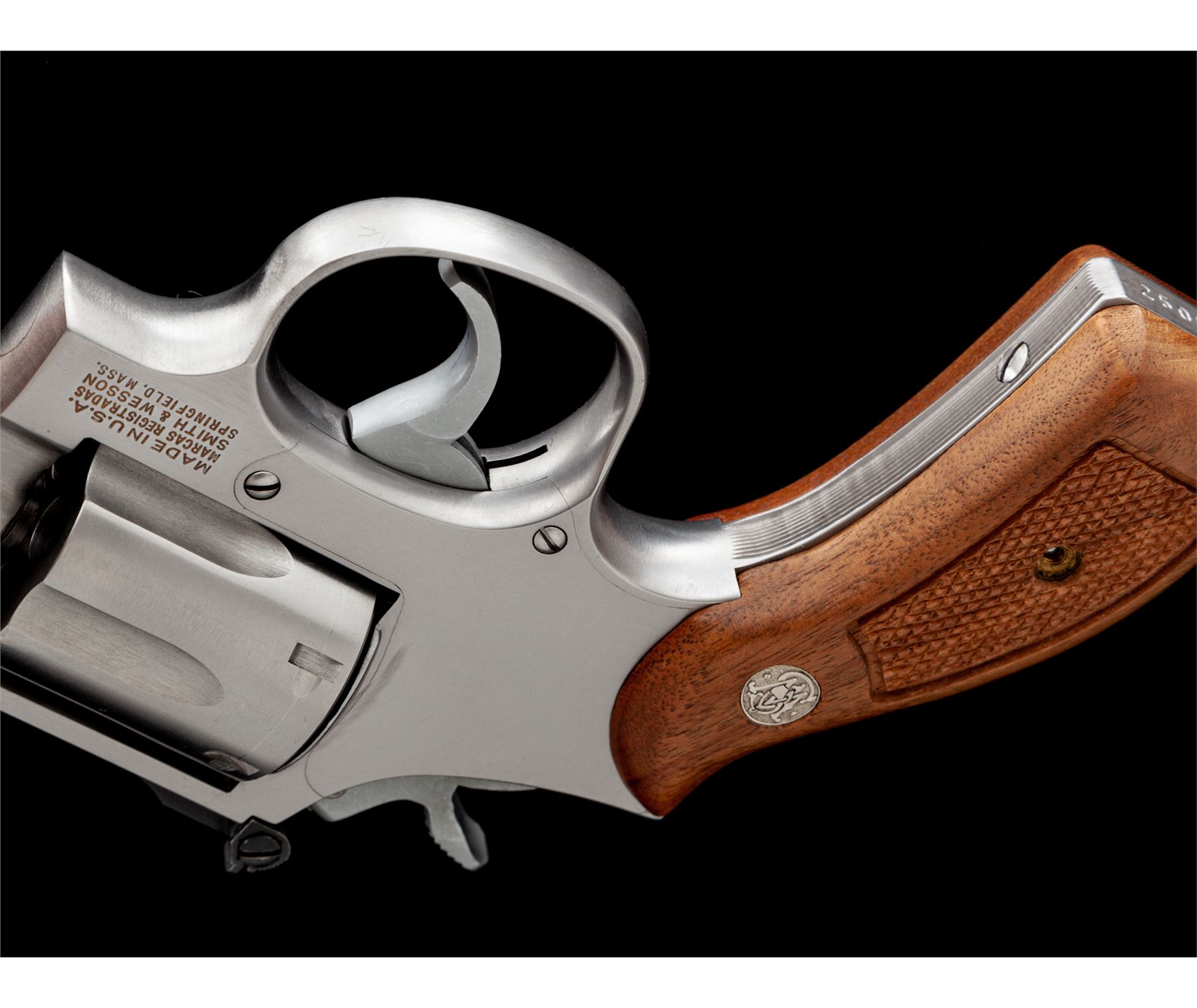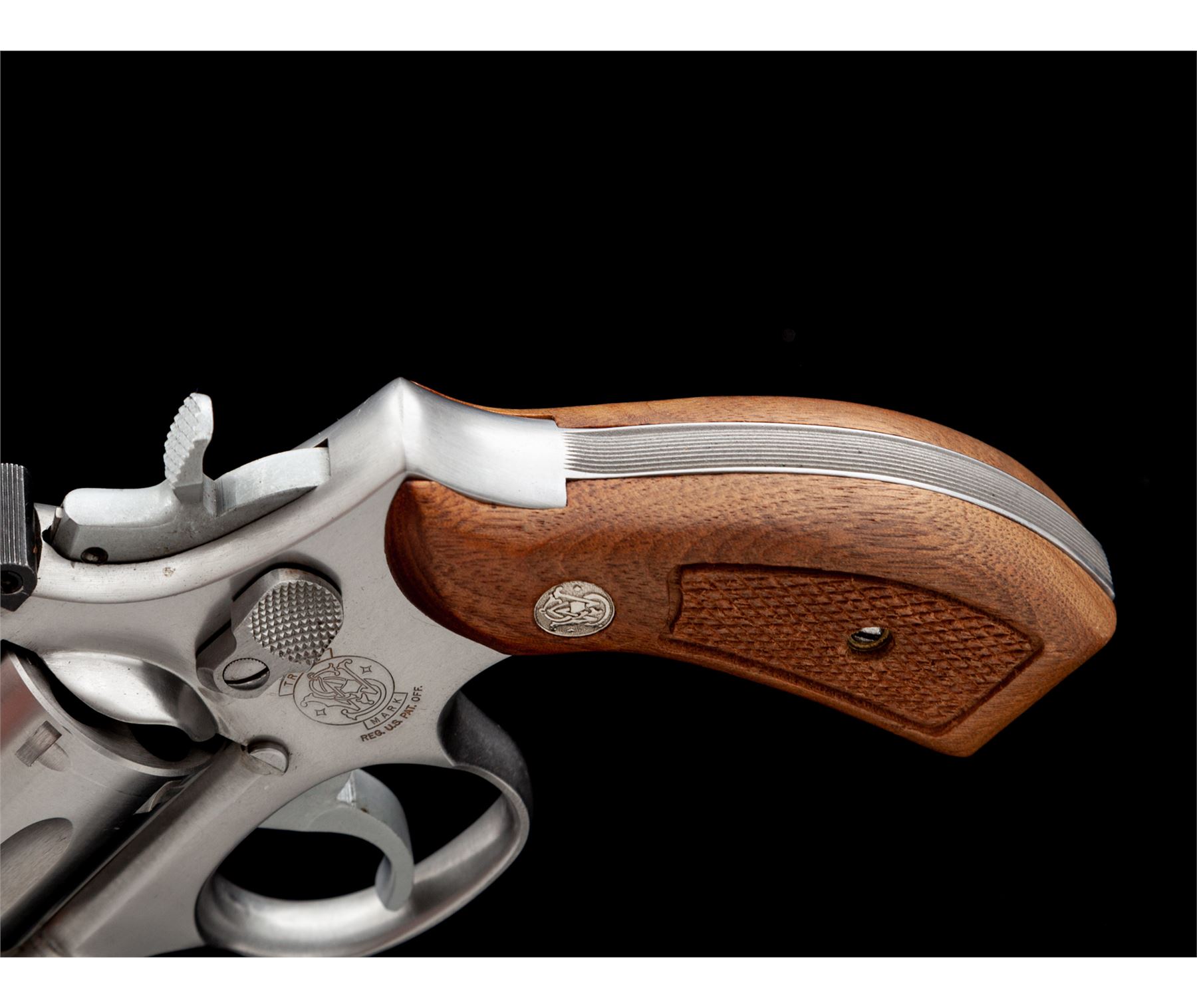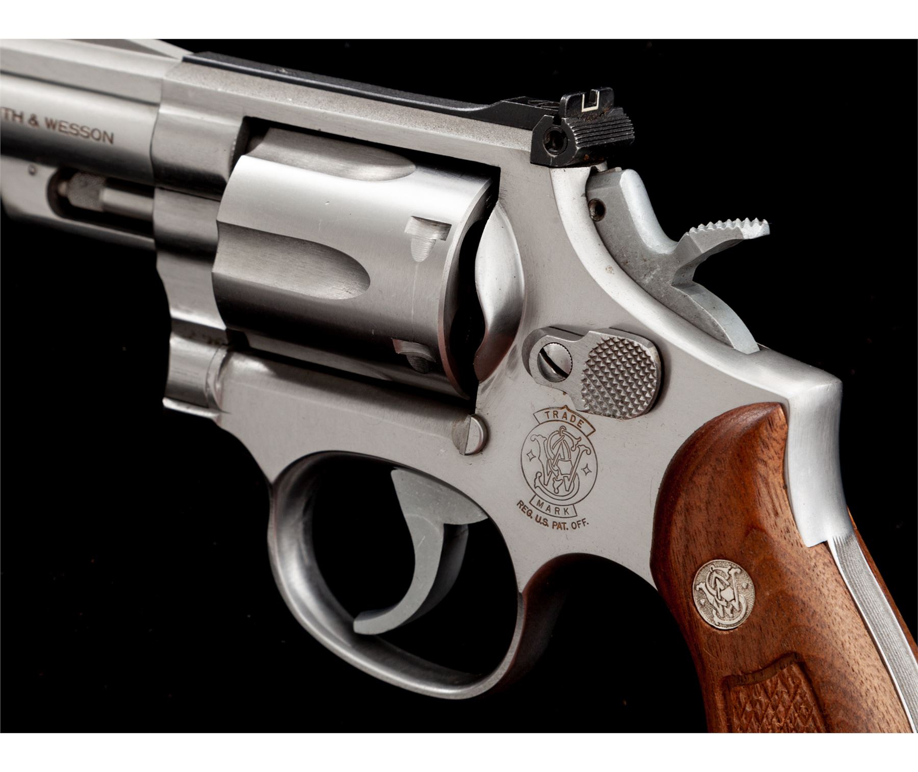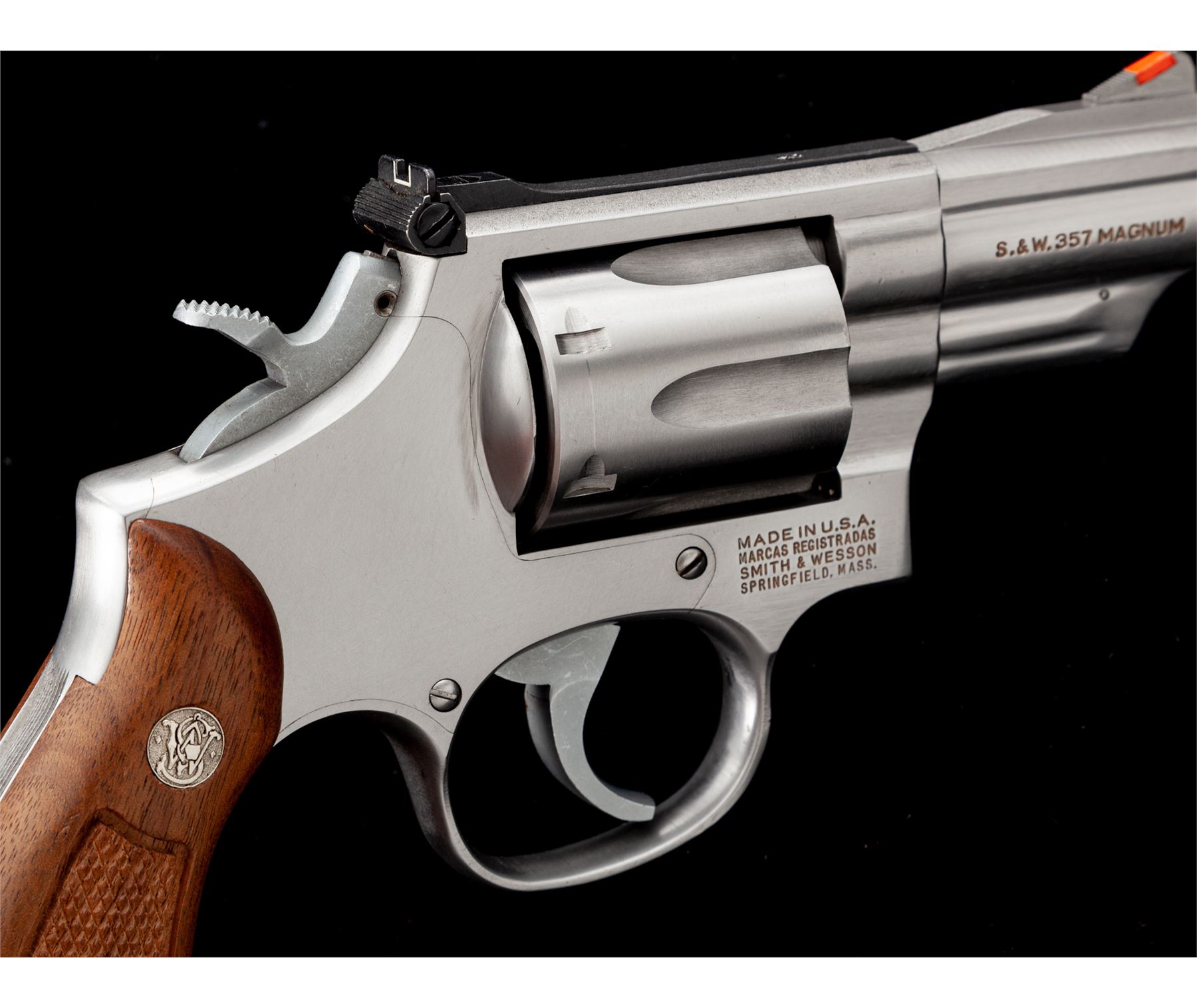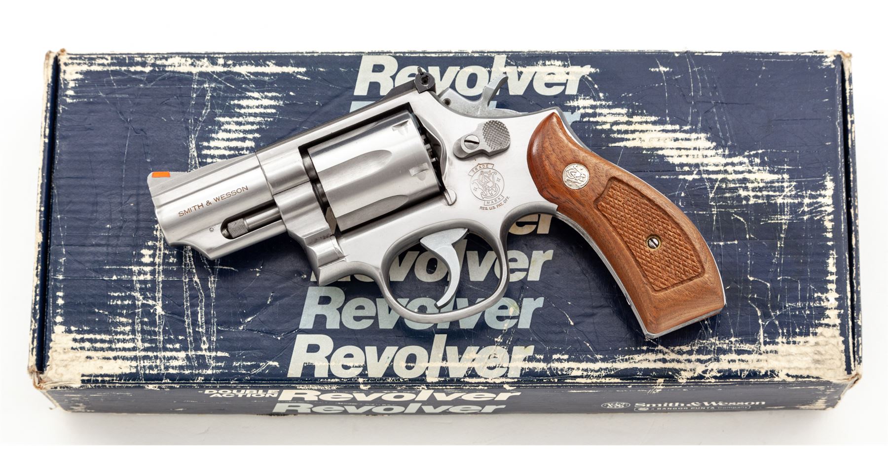 Smith & Wesson Model 66-2 .357 Combat Magnum Double Action Revolver, #250K366, .357 mag. cal., 2.5'' barrel, satin stainless steel, factory checkered round butt walnut grips with silver S&W medallions, red ramp front sight and white outline micrometer click adjustable rear sight. In blue and white one-piece S&W box with matching end label, sealed cleaning kit with screwdriver, S&W packing paper, owner's manual, and other misc. factory paperwork. Condition overall is excellent, showing intermittent small handling marks and a little micro-scratching to the metal; cylinder with a fine index line. Factory lettering is clear and defined. Grips show a few minor handling marks, checkering is sharp. Cylinder face, inside of frame, and chambers are clean; excellent action and bore. Box exterior with storage wear. Est.: $600-$800. (Modern/PPT)