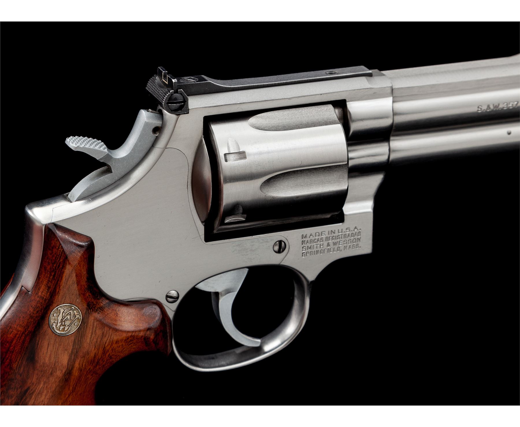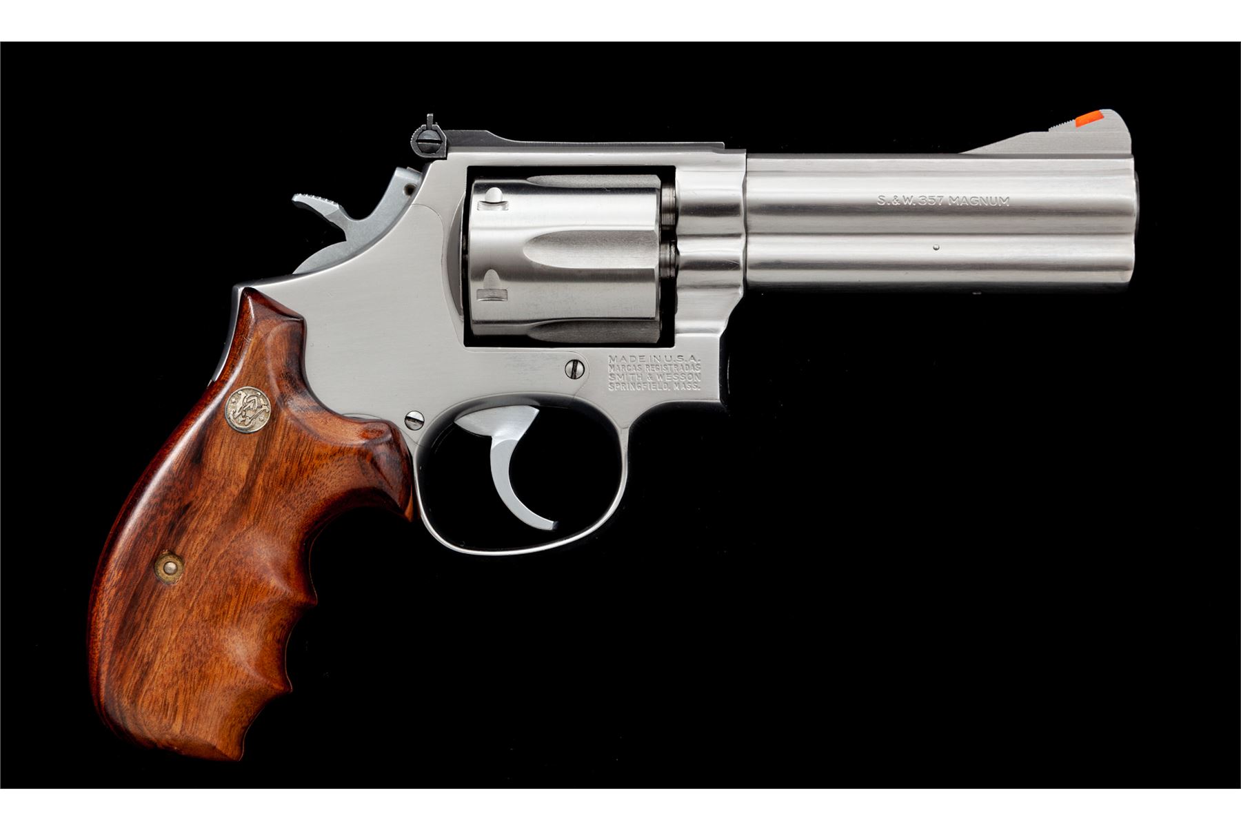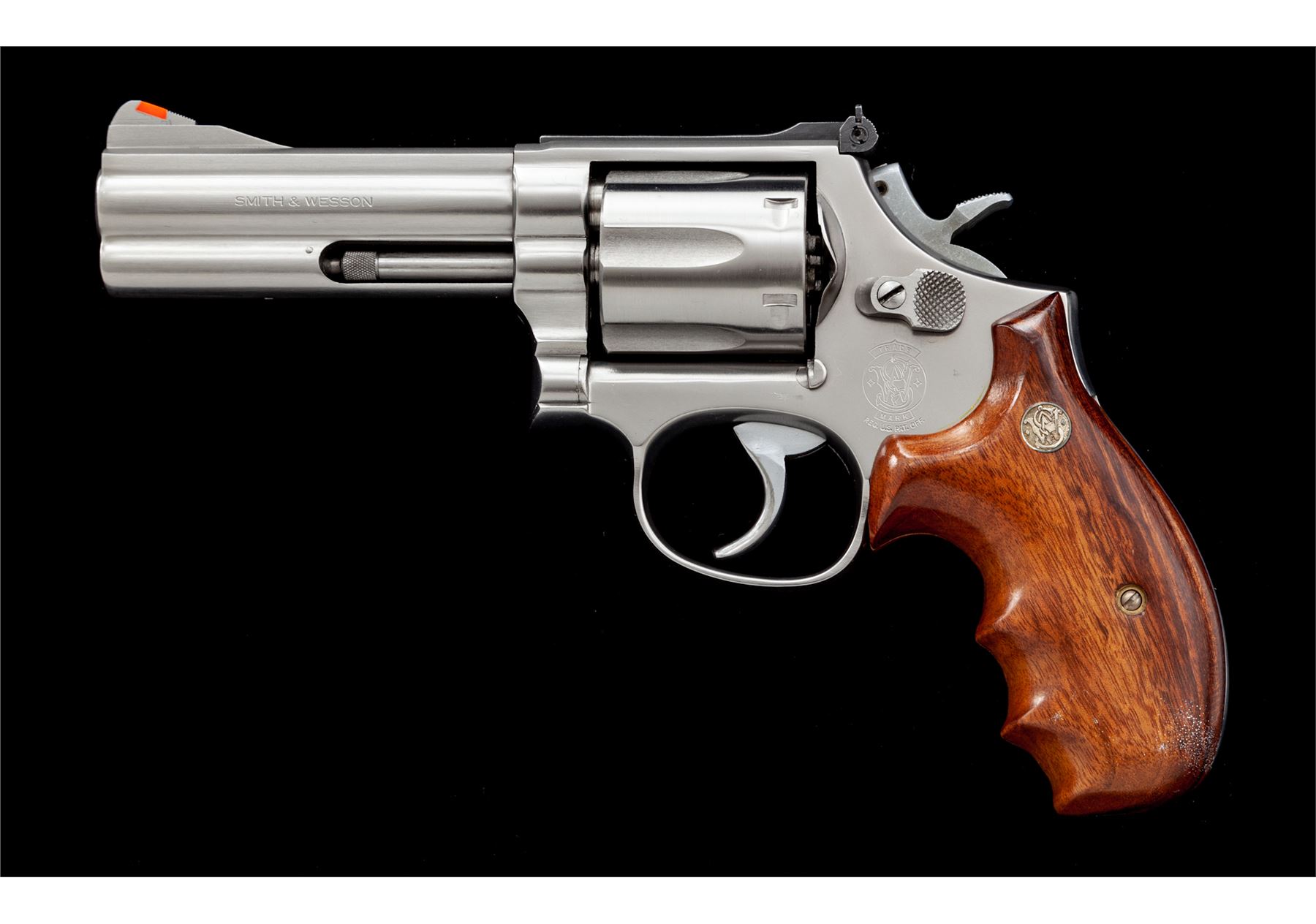 Custom Smith & Wesson Model 686 Double Action Revolver, #AAK4224, .357 mag. cal., 4'' barrel, stainless steel finish, factory finger-grooved round butt cocobolo grips,, standard hammer, polished trigger, red ramp front and white outline adjustable rear sight. Action job, chamfered forcing cone and thinned grips with all custom work by George DeLio. Single action trigger letting off right at 2.12 lbs. Cylinder EDM machined by Ranch Products to accept full moon clips (included); also includes speedloaders and a convert-a-pell system. Condition is excellent appearing new and unused. Est.: $1,000-$1,400. (Modern/PPT)