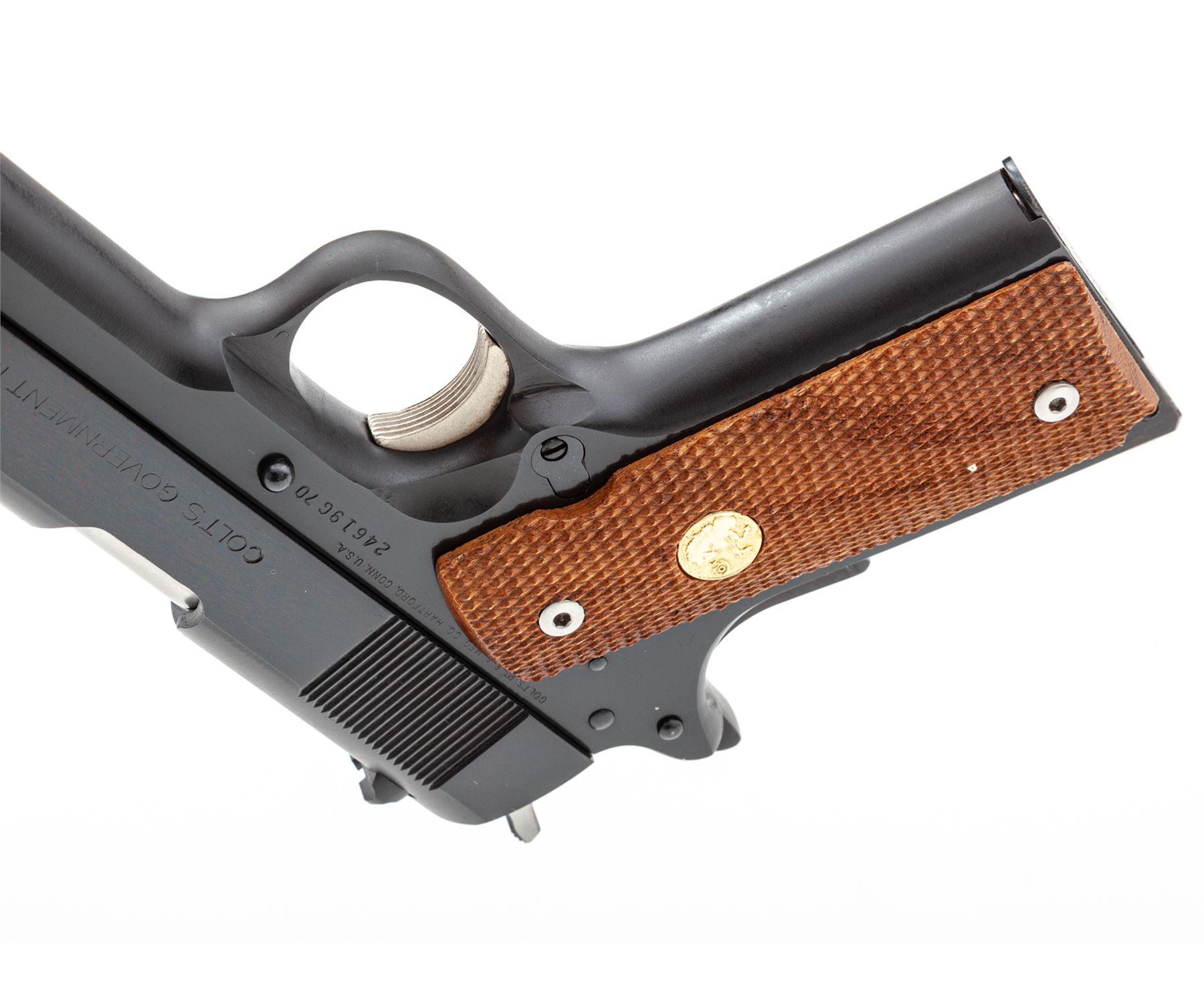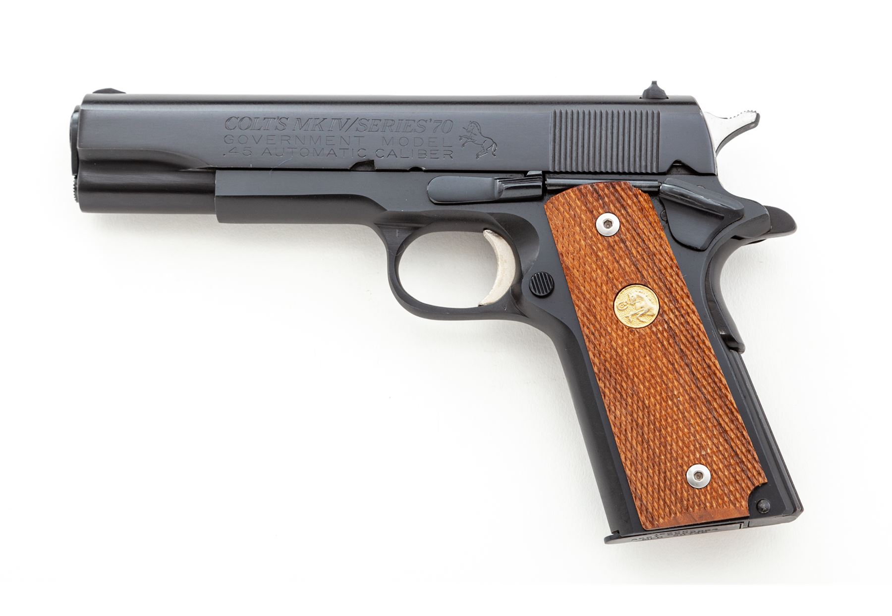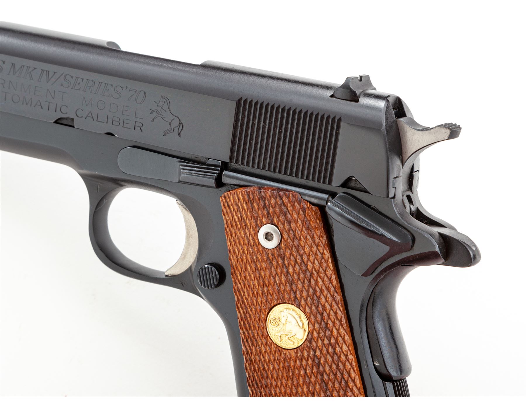 Customized Colt MK IV Series 70 Gov't Model Semi-Automatic Pistol, #24619G70, .45 ACP cal., 5'' barrel, blue finish, somewhat later factory walnut grips with Allen head grip screws, with two (2) 1960s era GI magazines. Condition is excellent as modified retaining approx. 98% blue. Smooth action, bright bore. Est.: $600-$800. (Modern/PPT)