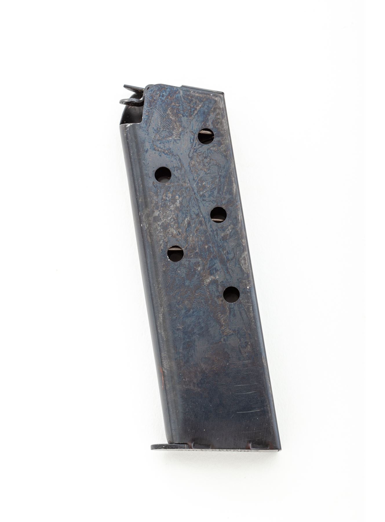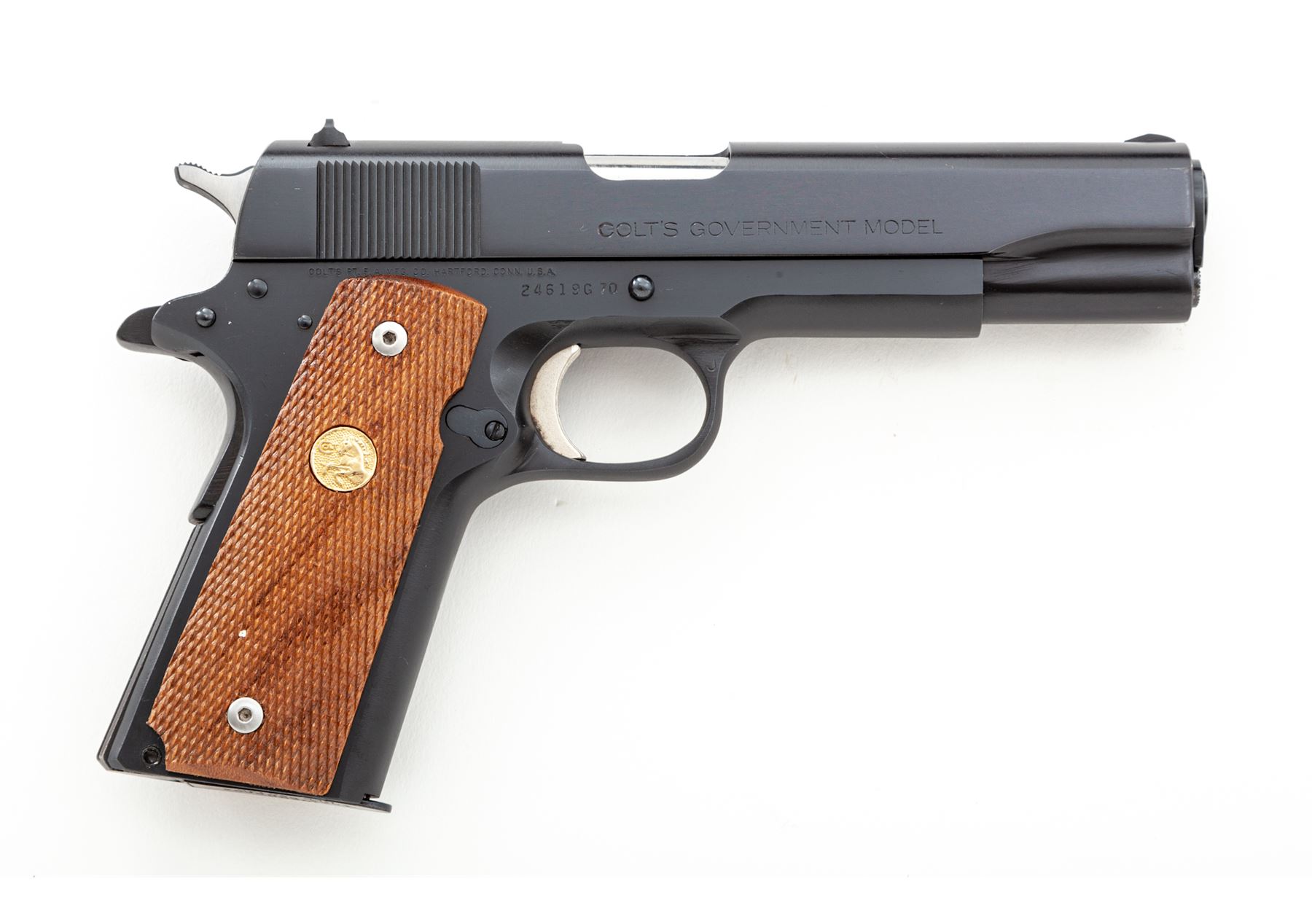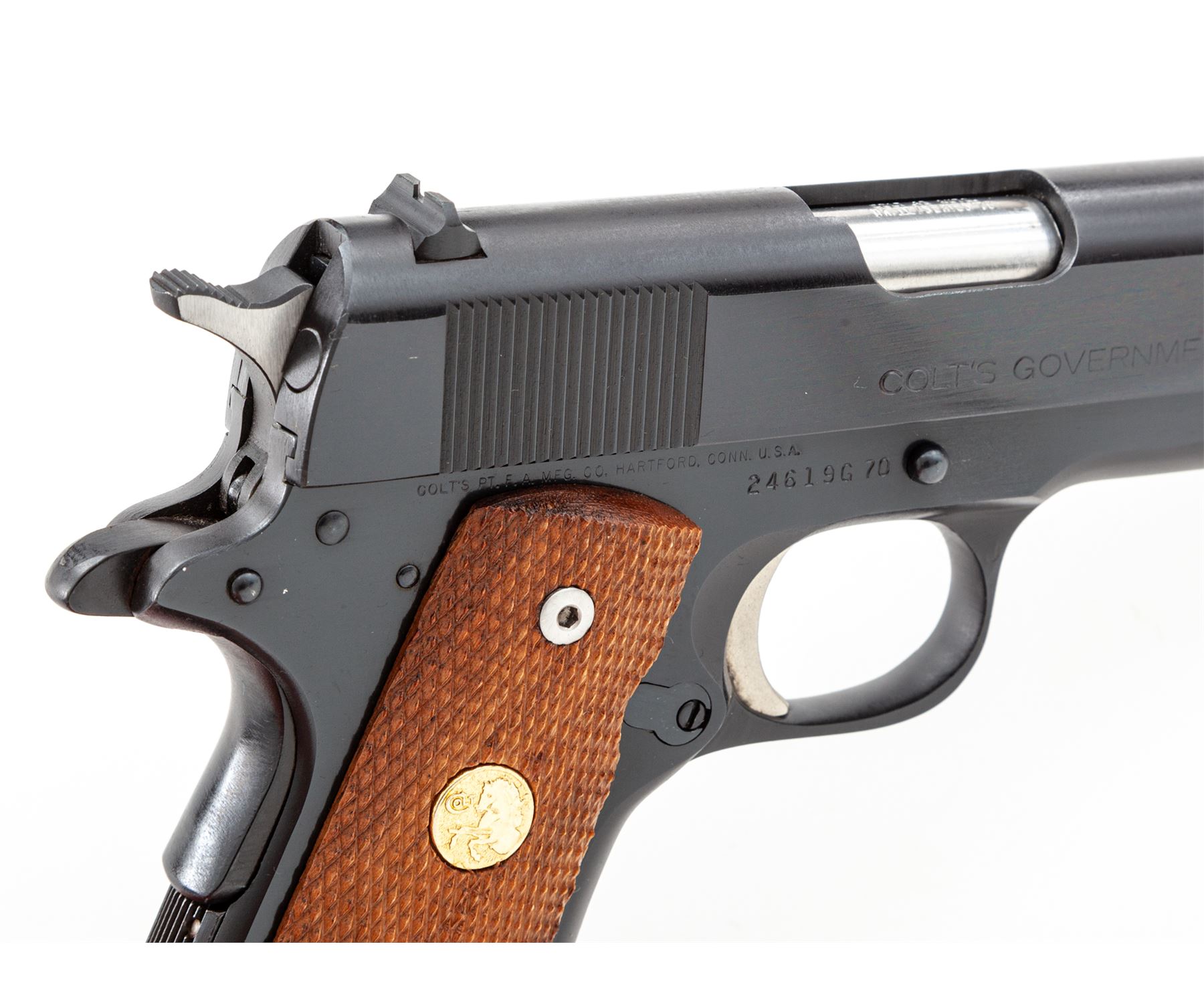 Customized Colt MK IV Series 70 Gov't Model Semi-Automatic Pistol, #24619G70, .45 ACP cal., 5'' barrel, blue finish, somewhat later factory walnut grips with Allen head grip screws, with two (2) 1960s era GI magazines. Condition is excellent as modified retaining approx. 98% blue. Smooth action, bright bore. Est.: $600-$800. (Modern/PPT)