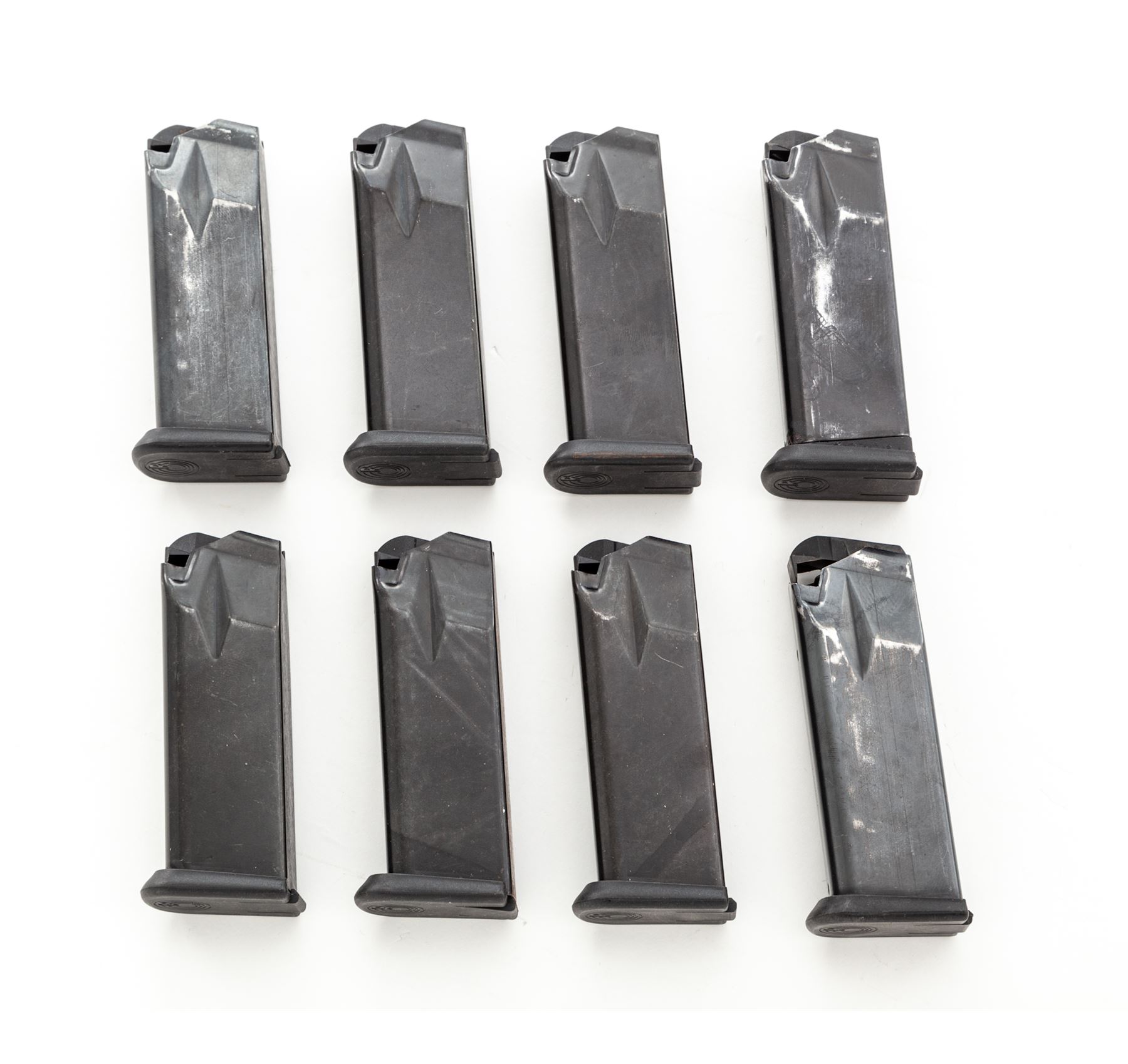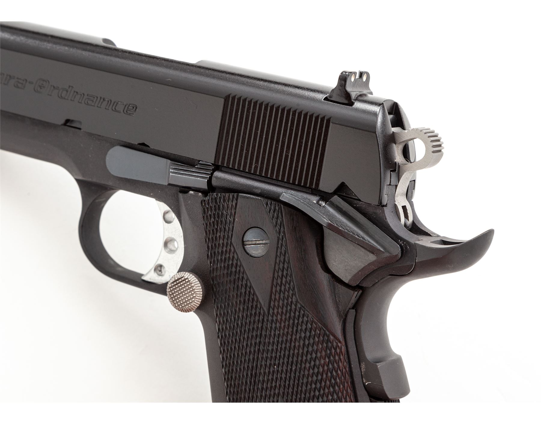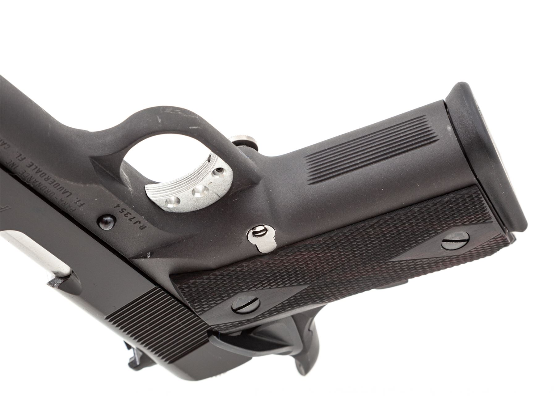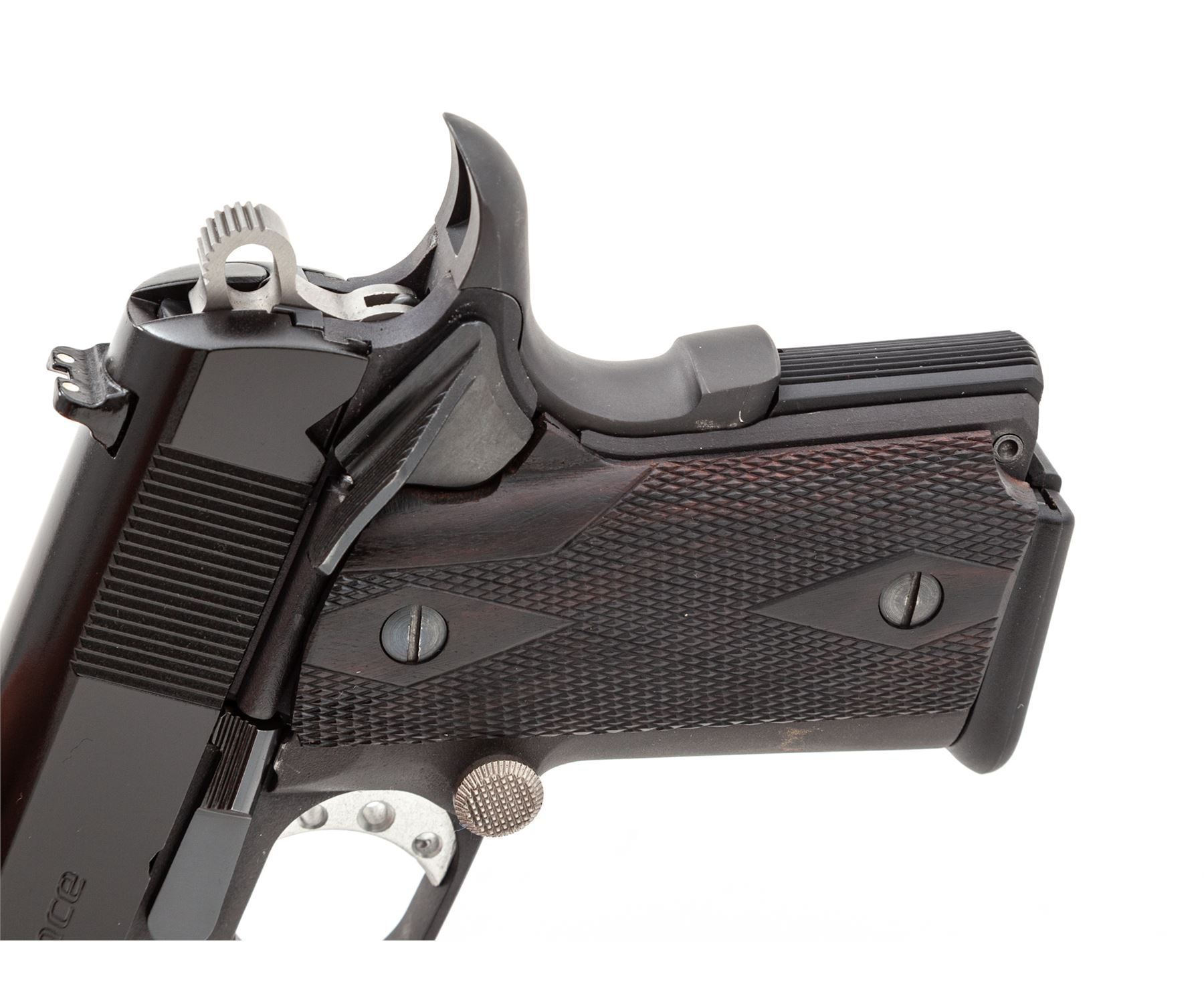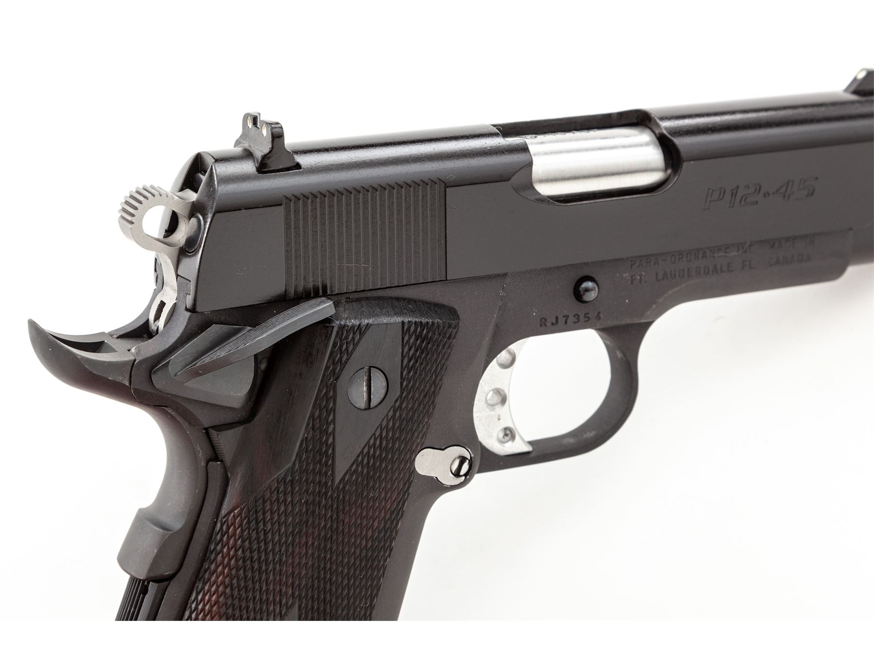 Custom Para-Ordnance P12-45 Semi-Automatic Pistol, #RJ 7354, .45 ACP cal., 3.5'' barrel, matte finish, diamond checkered dark walnut grips, and one 12-round magazine, in factory hard case. Pistol additionally features extended magazine release, Wilson oblong hammer, extended grip safety, aluminum match trigger, ambidextrous thumb safety and three-dot combat sights, with all custom work by George DeLio. Barrel throat and chamber polished, angle and polish to feed ramp, action job with crisp trigger letting off right at 3.2 lbs. Condition is excellent, appearing new and unused since its build in the mid 1990's. Est.: $750-$1,000 (Modern/PPT)(High-cap mags not available to Calif. residents.)