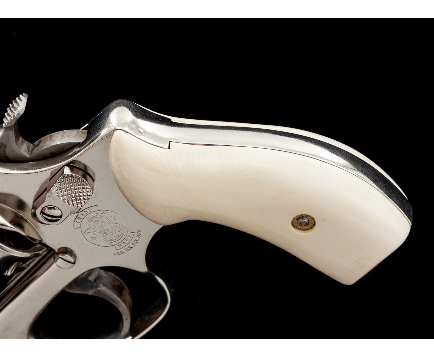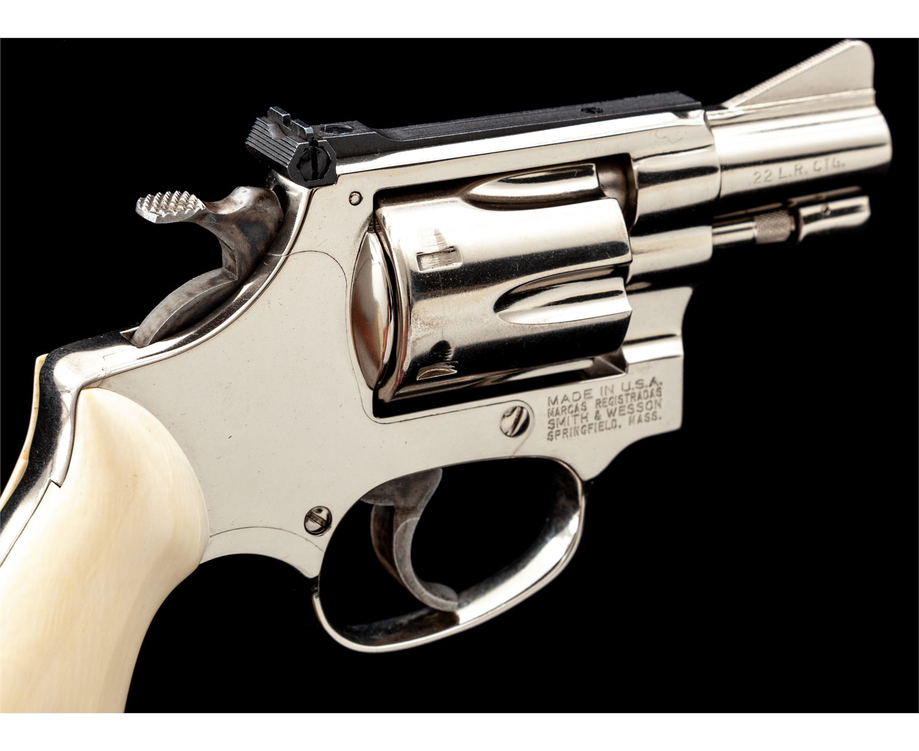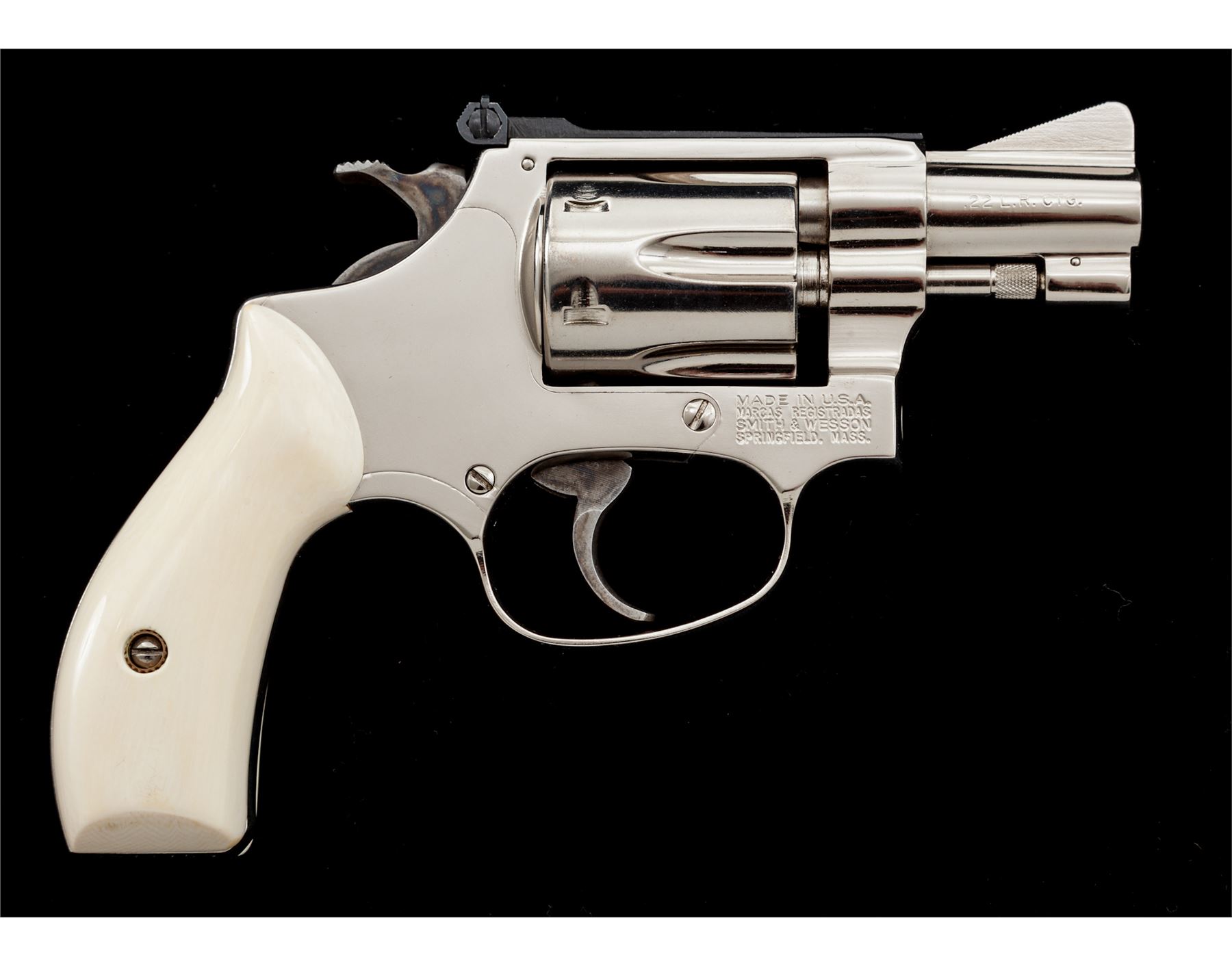 Custom Smith & Wesson Model 34-2 Double Action Revolver, #BCA1100, .22 LR cal., 2'' barrel, nickel finish, ivory grips, with factory adjustable rear sight. Tuned action with 2.15 lb. single action trigger pull with all custom work by George DeLio. All in Second Amendment Foundation red satin lined presentation case. Condition appears near new as expertly renickeled, with very light index mark to cylinder. Case is excellent. Est.: $750-$1,250. (Modern/PPT)