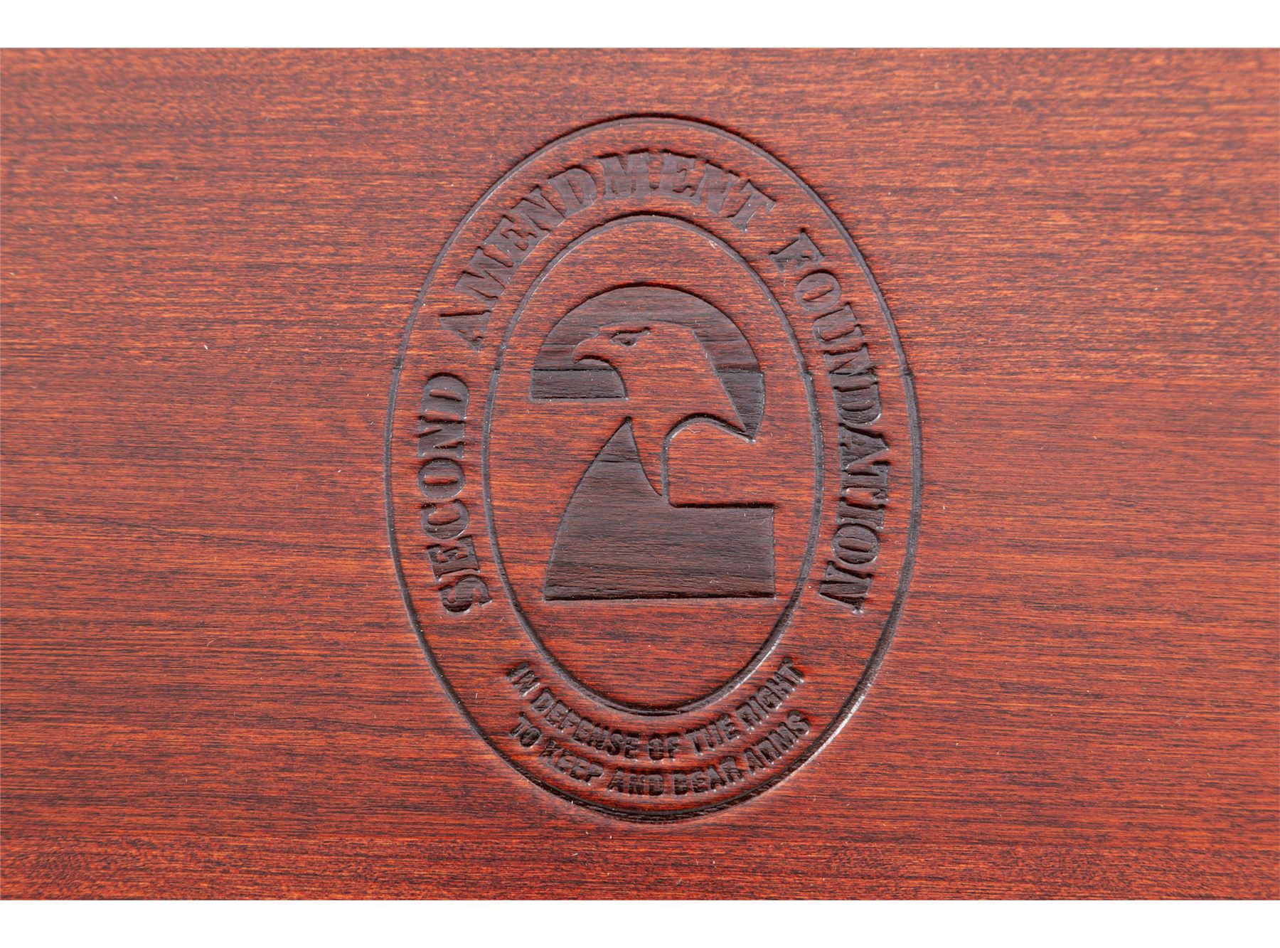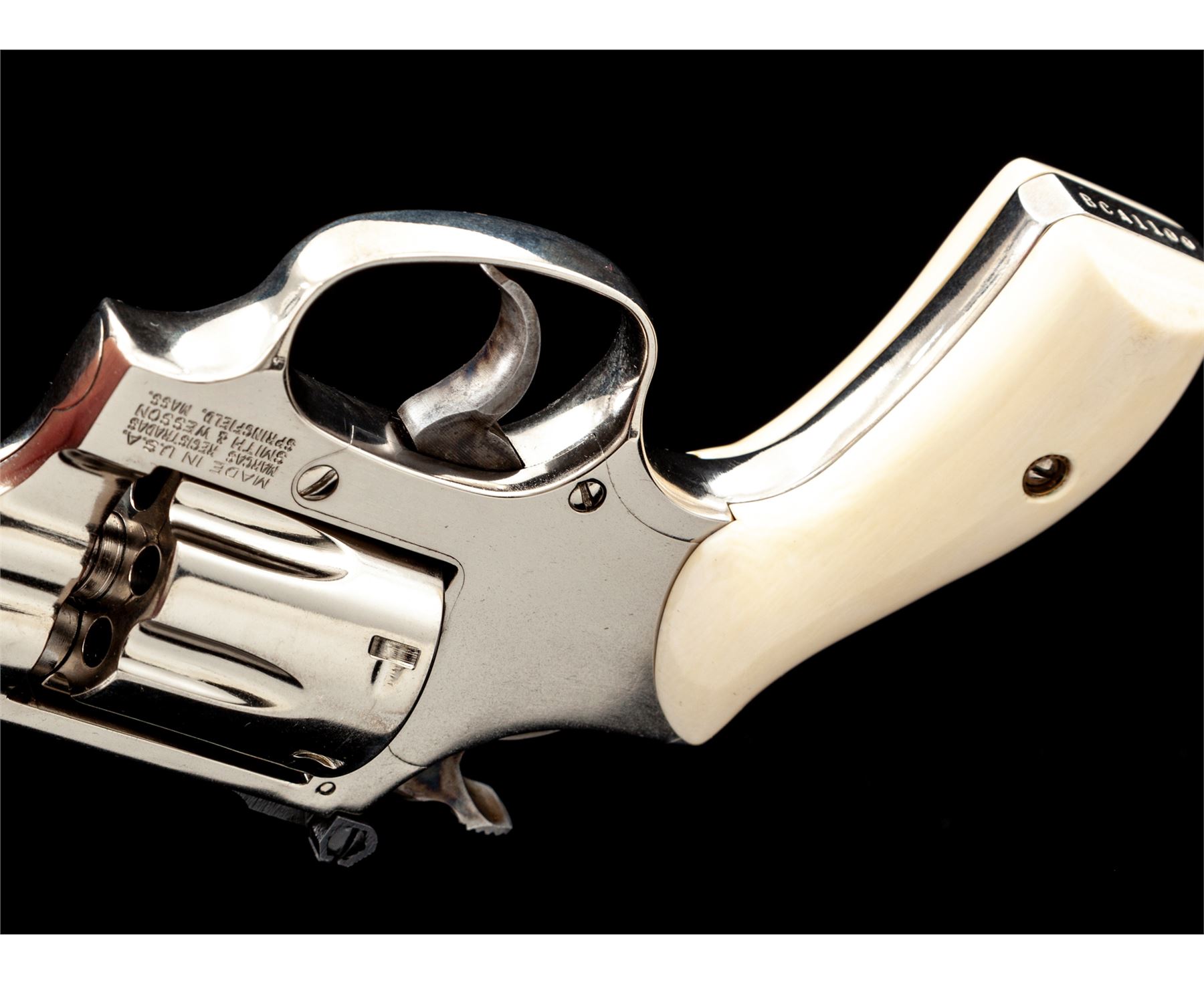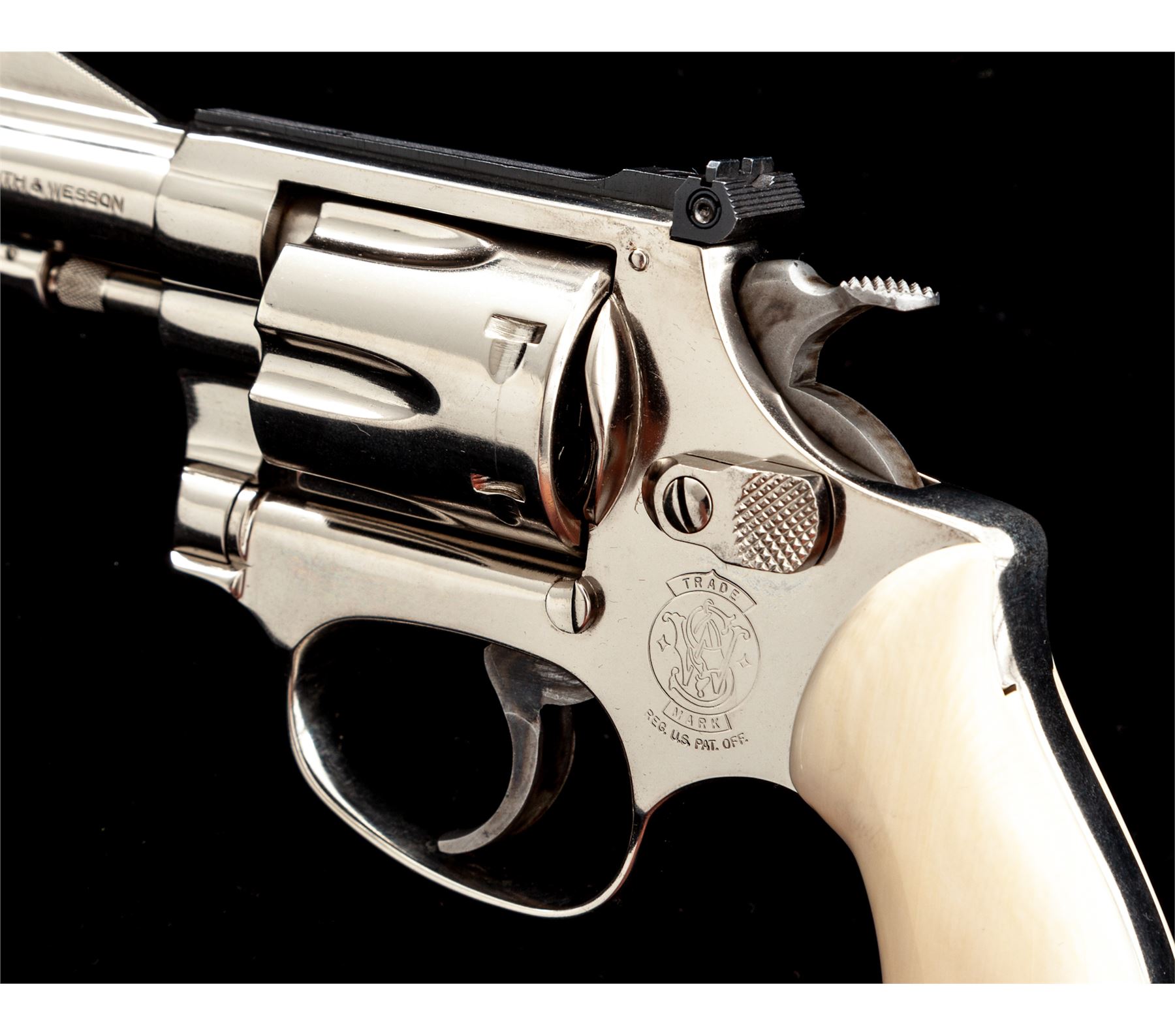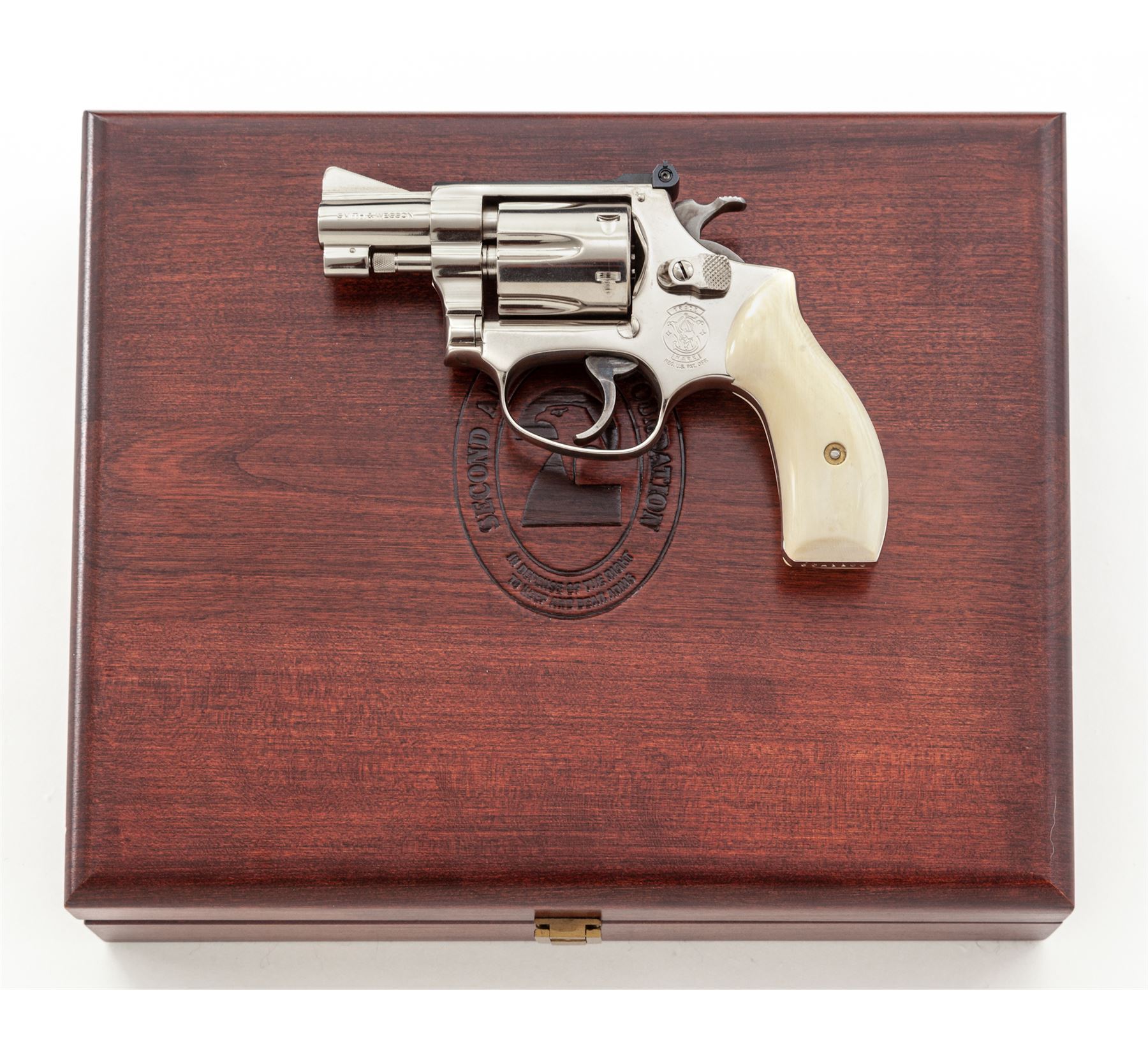 Custom Smith & Wesson Model 34-2 Double Action Revolver, #BCA1100, .22 LR cal., 2'' barrel, nickel finish, ivory grips, with factory adjustable rear sight. Tuned action with 2.15 lb. single action trigger pull with all custom work by George DeLio. All in Second Amendment Foundation red satin lined presentation case. Condition appears near new as expertly renickeled, with very light index mark to cylinder. Case is excellent. Est.: $750-$1,250. (Modern/PPT)