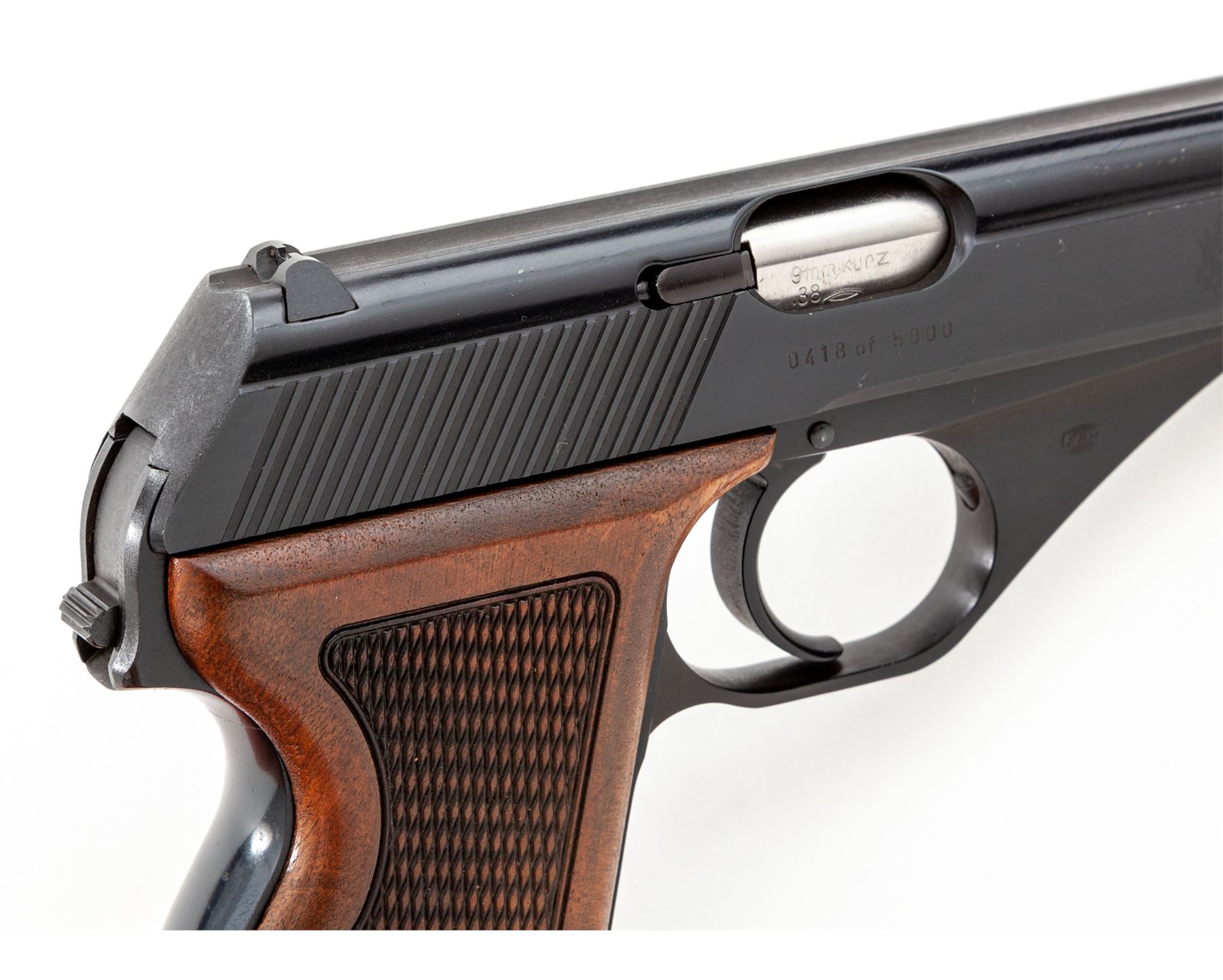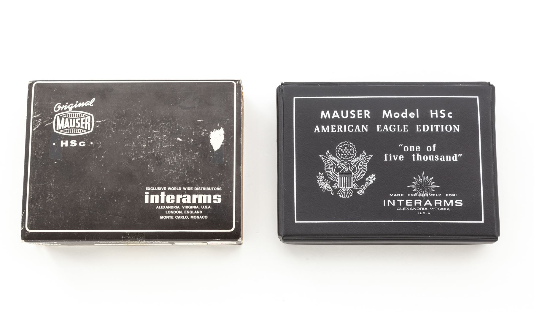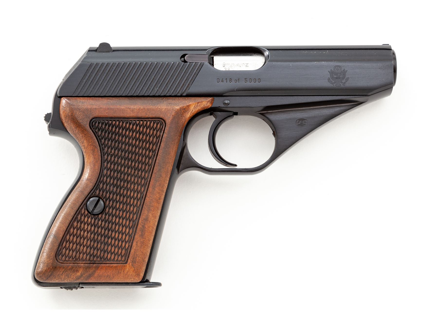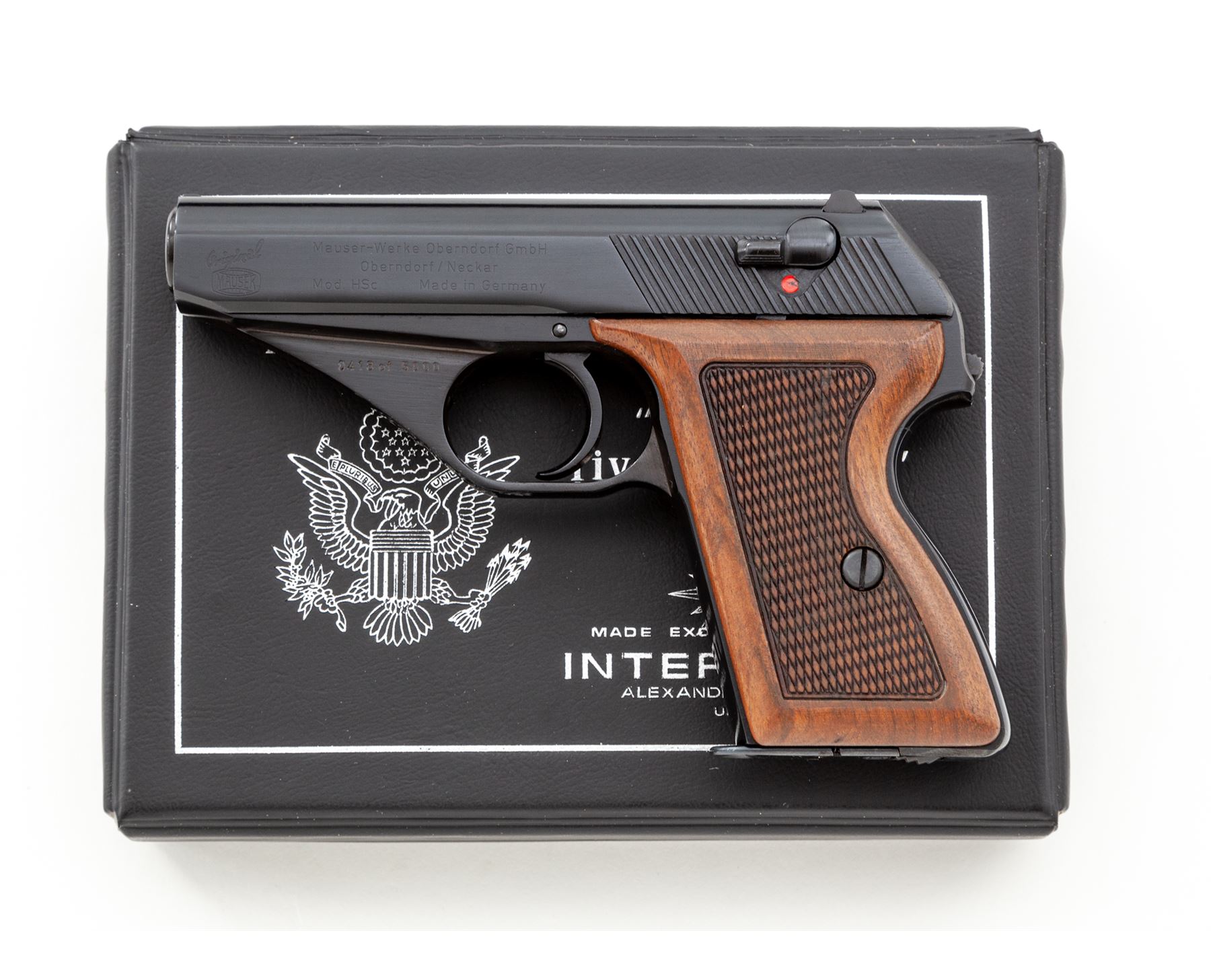 Post-War Mauser HSc Semi-Automatic Pistol, American Eagle Edition, #0418 of 5000, .380 cal., 3.25'' barrel, blue finish, checkered walnut grips, with two (2) magazines, test target and instructions, in original box with slipcover. Condition is excellent, appearing as new and unfired. Slipcover with some tape repairs and minor tattering. Est.: $500-$750. (Modern/PPT)