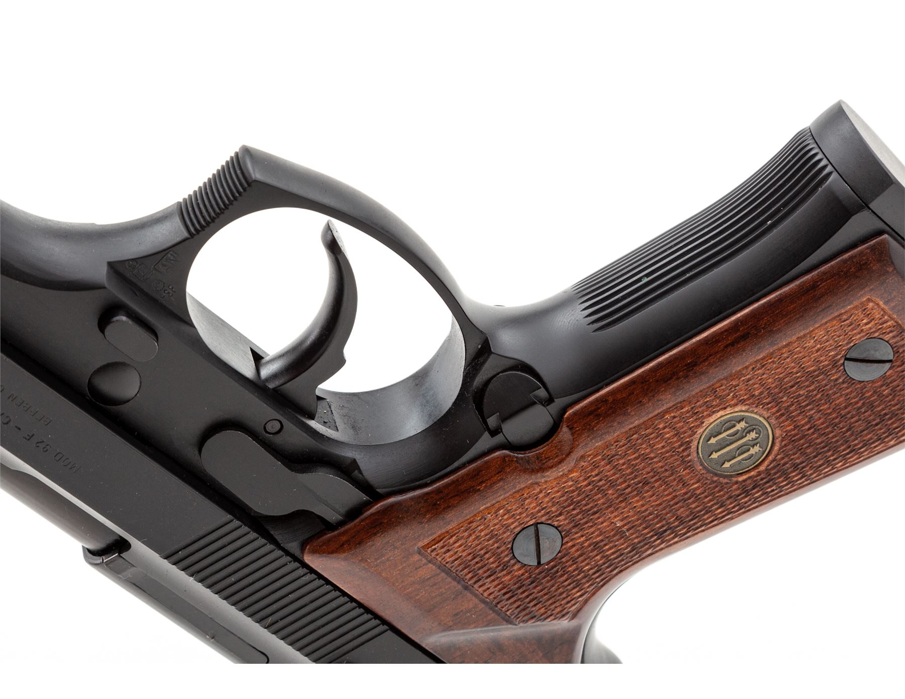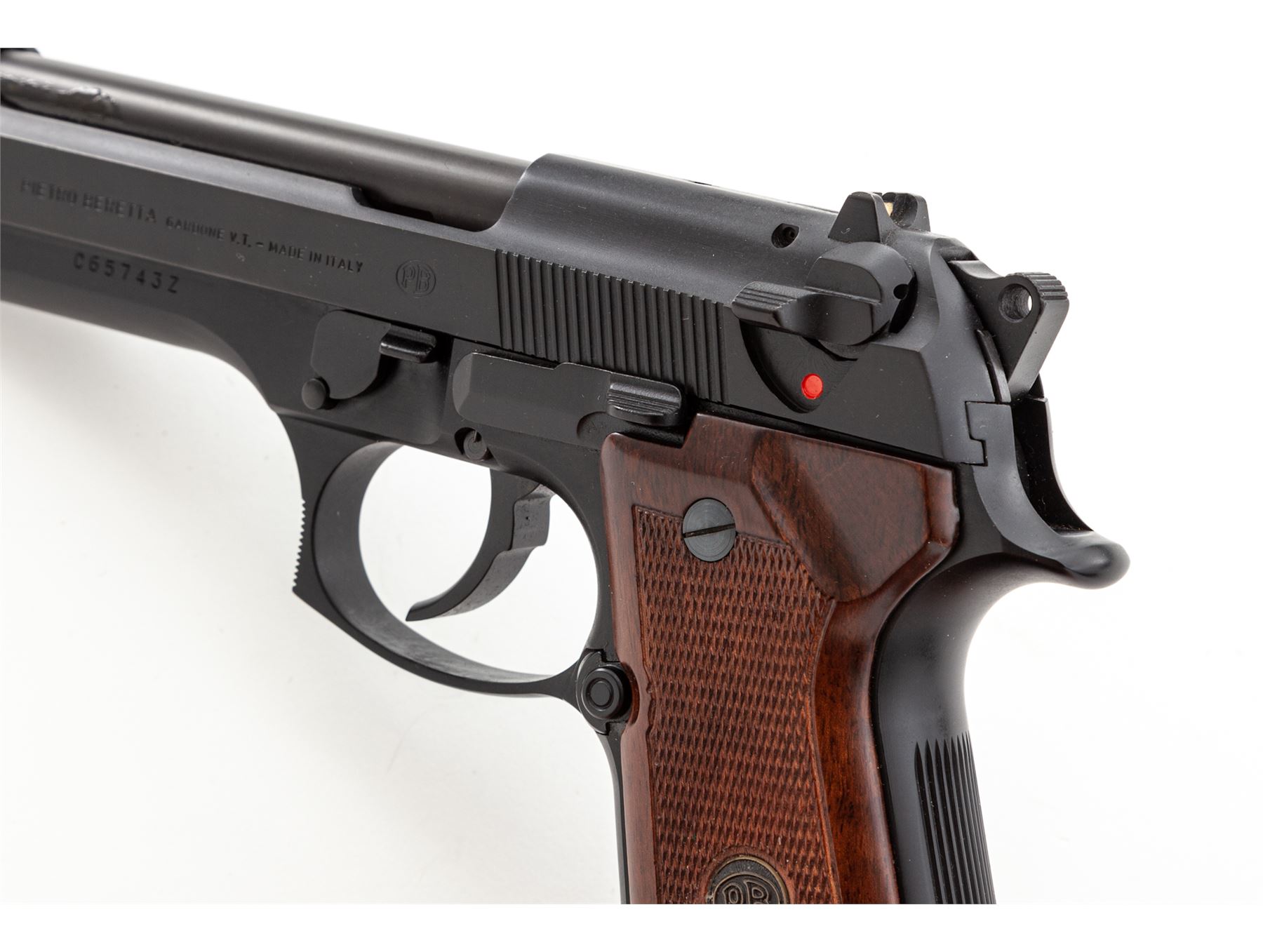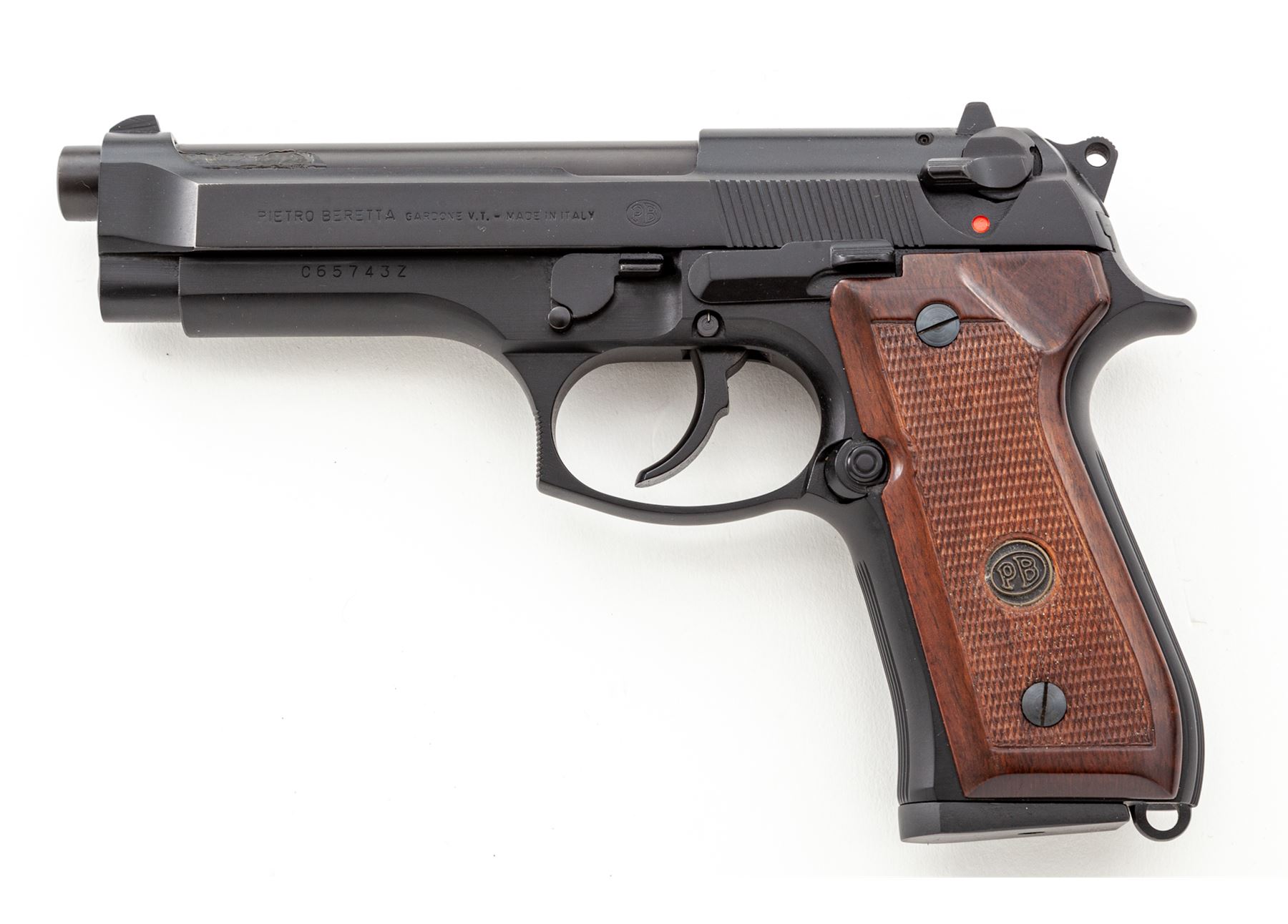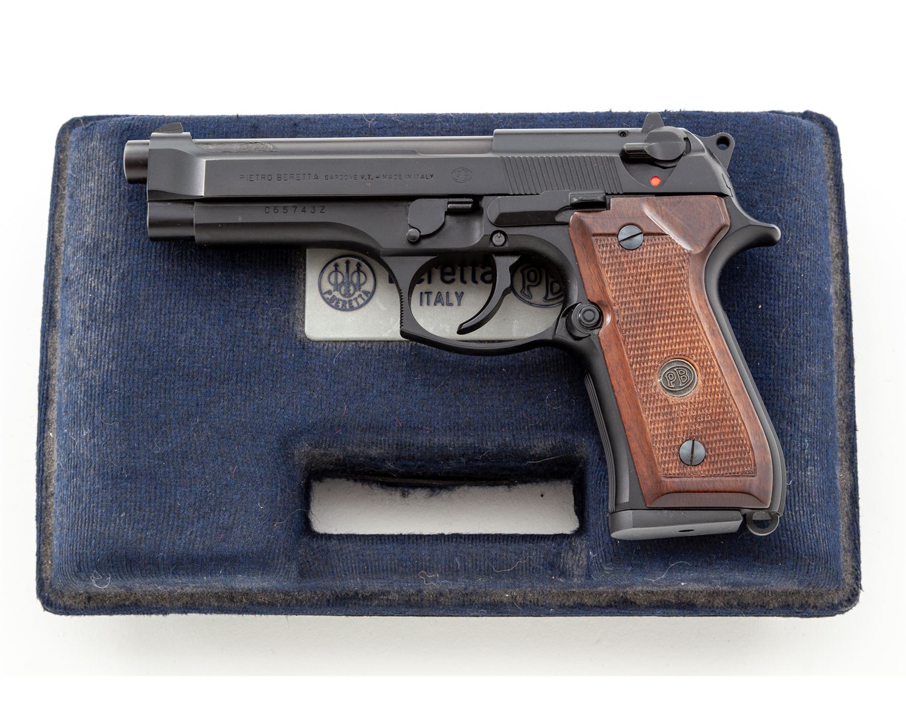 Mint Beretta Model 92F Semi-Automatic Pistol, #C65743Z, 9mm cal., 4-7/8'' barrel, black steel slide, black alloy frame, factory checkered wood grips with Beretta medallions, standard sights, ambidextrous safety/de-cocking lever, lanyard loop, with one 15-round Beretta magazine, and right-hand tan leather Bianchi holster. In Beretta box with owner's manual and warranty card. Approx. 99%+ original black finish remains and pistol is in near new overall condition, showing signs of very little handling or use. Grips appear as new. Magazine follower shows moderate wear. Excellent smooth action and mirror bright bore. Case shows storage wear and the original interior pieces are not present, loosely fit with replacement foam. Est.: $500-$650. (Modern/PPT)