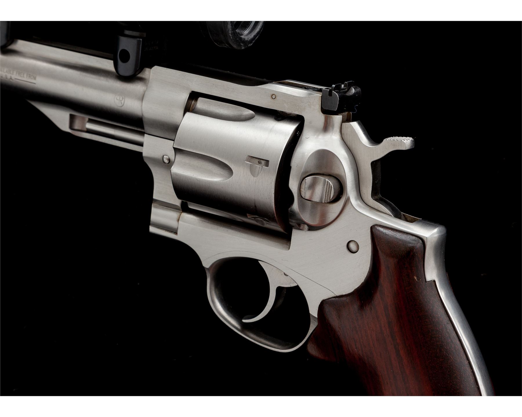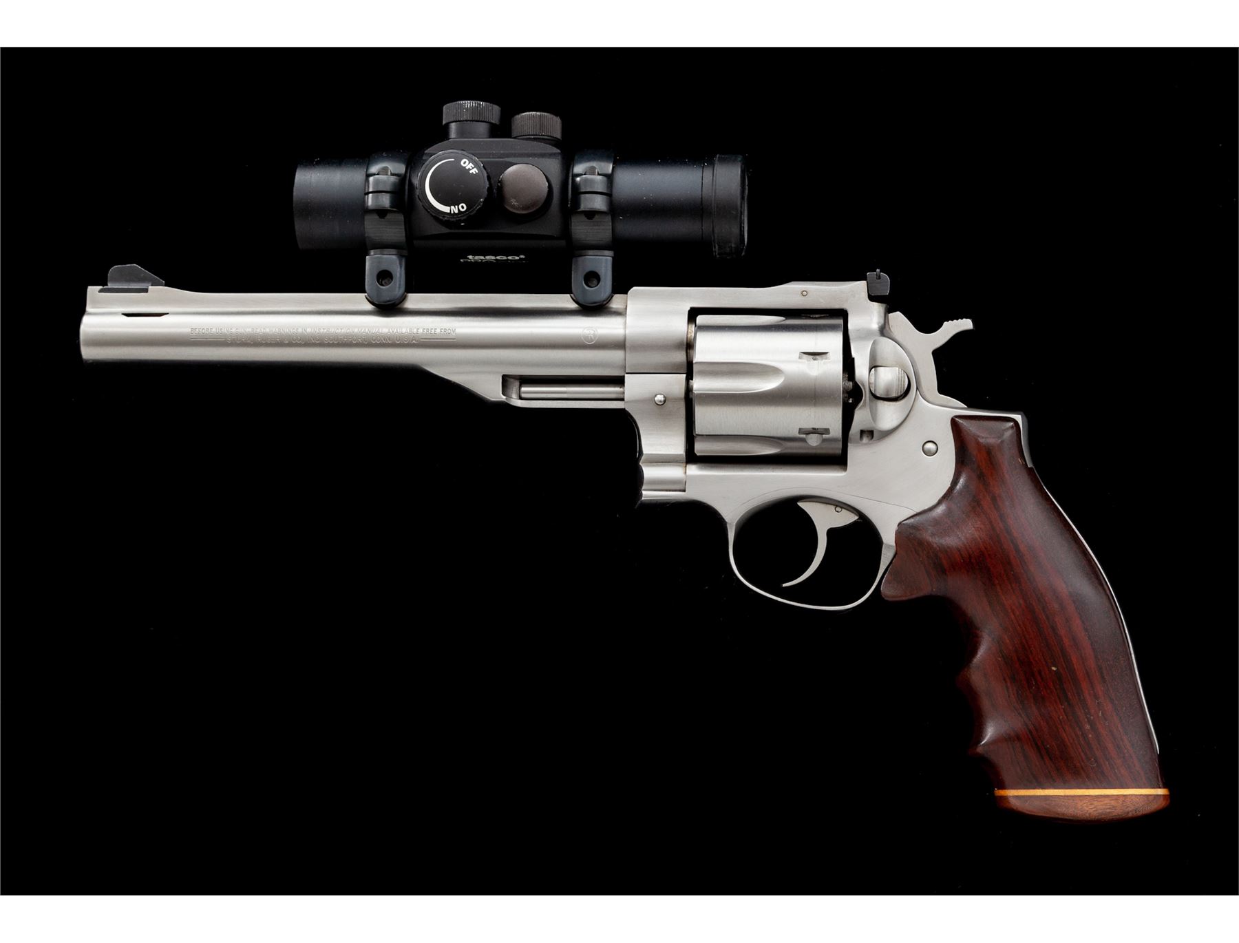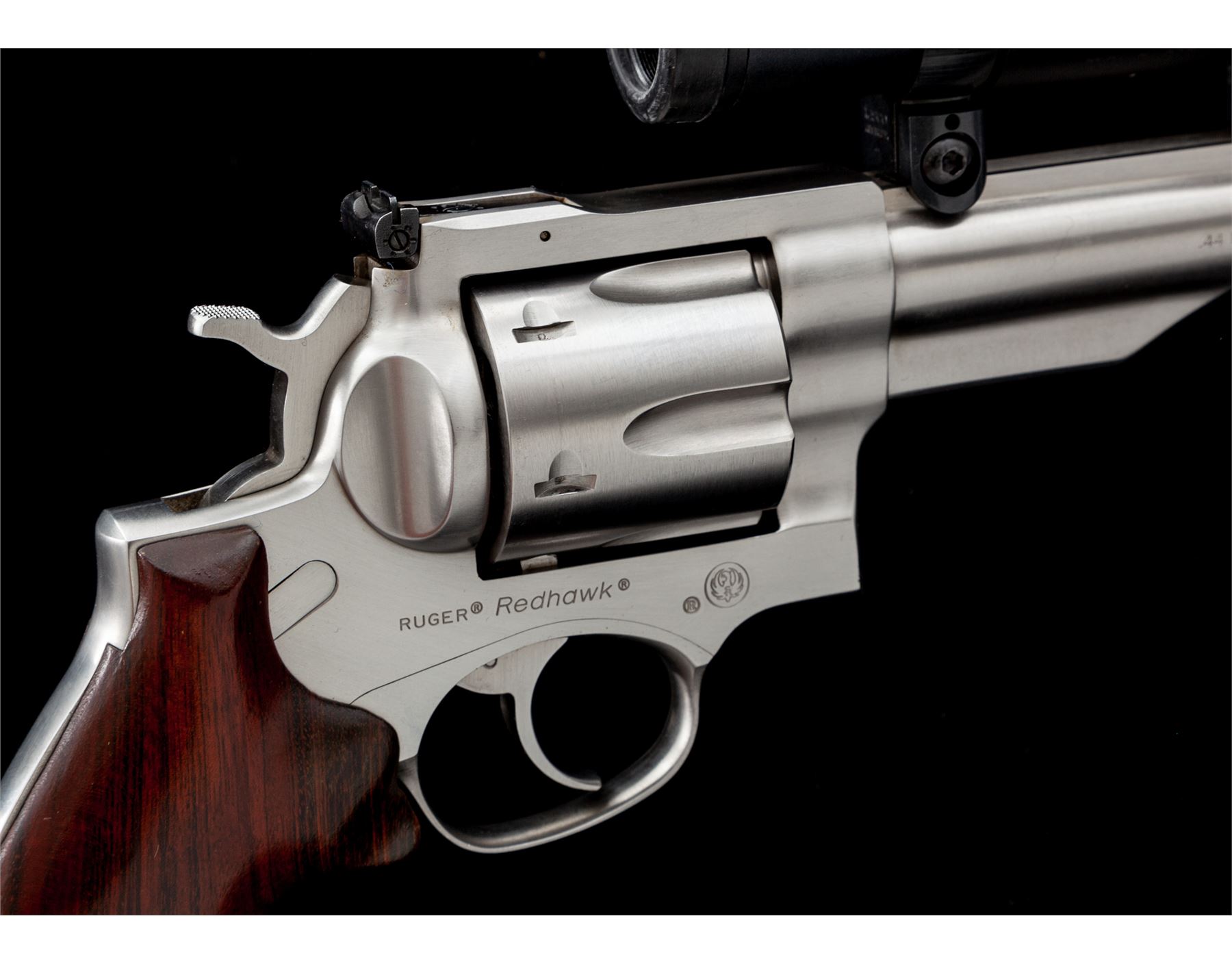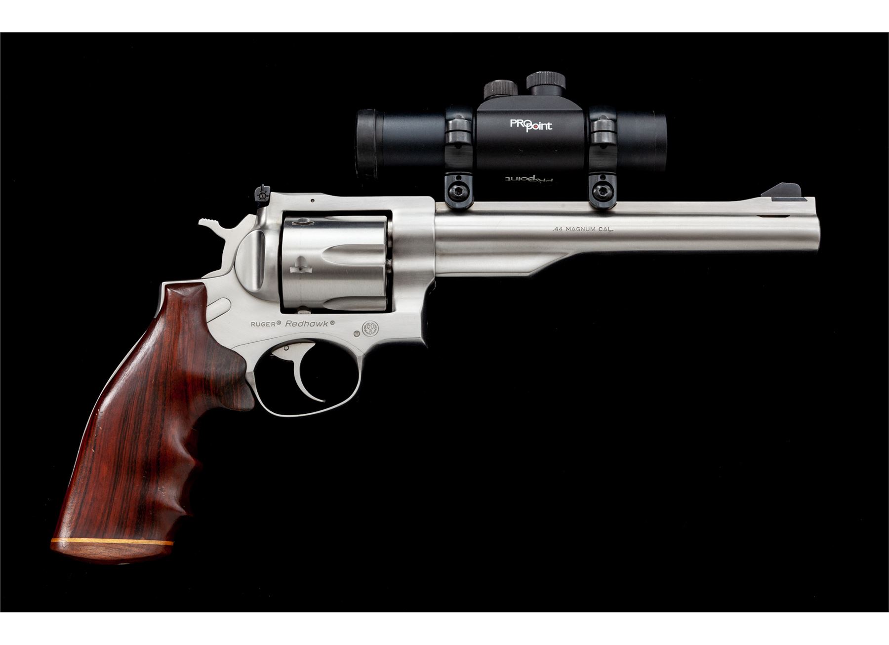 Ruger Redhawk Double Action Revolver, #502-63982, .44 mag. cal., 7.5'' ported barrel, stainless steel finish, custom rosewood grips with birch spacer and walnut butt cap. Standard hammer, polished trigger, oversize orange ramp front, and standard adjustable rear sight topped with a Pro-Port red dot system. All custom work by George DeLio. Single action trigger letting off right at 3.20 lbs. Condition is excellent appearing new and unused. Est.: $1,000-$1,400. (Modern/PPT)