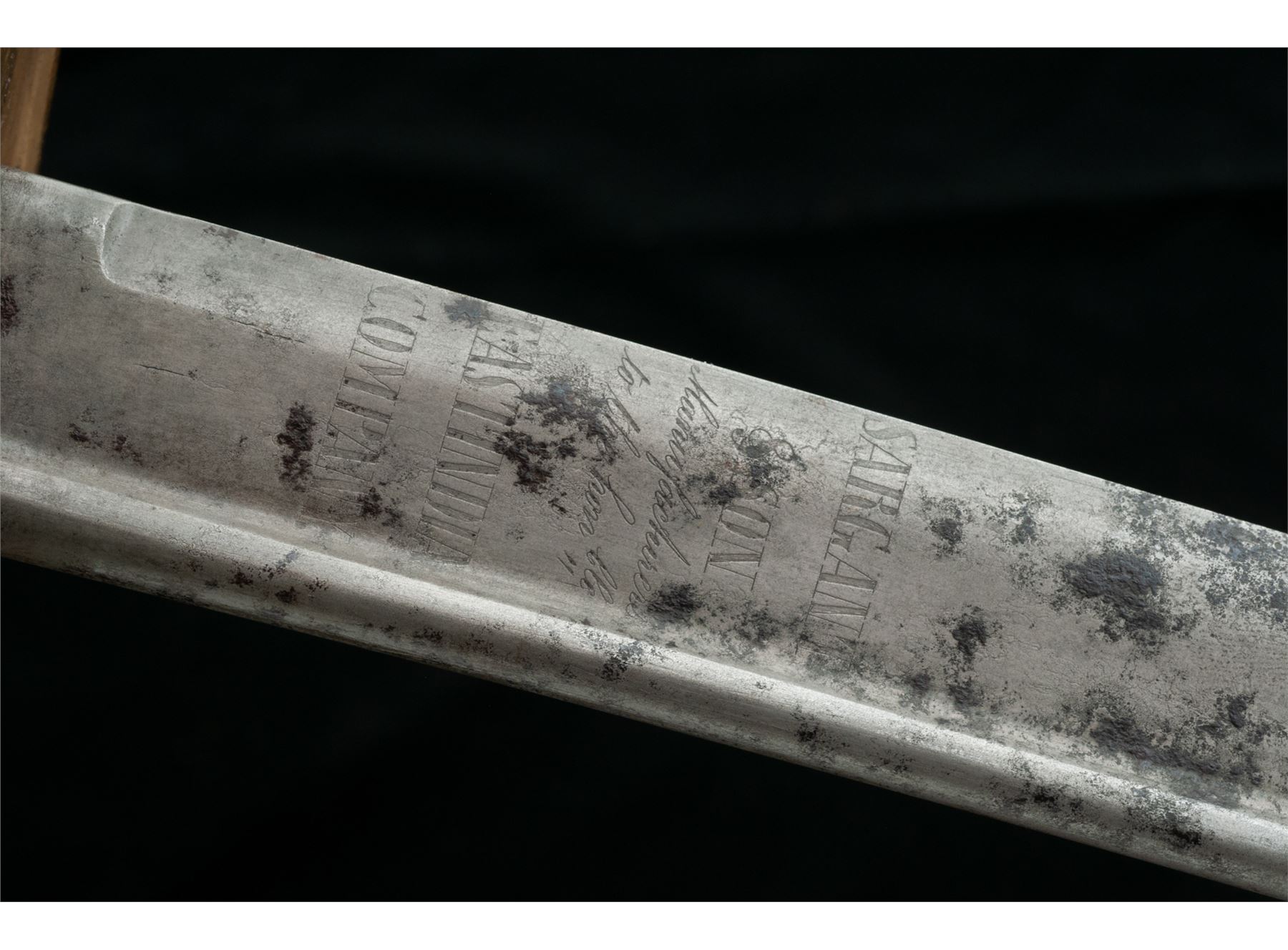 French Model 1822 Cavalry Officer's Sword, with English blade and decorated brass three-branch guard. Pommel has laurel leaves and flowers around the bottom edge. Brown horn grooved grip is missing its wire wrapping. The 34.5'' blade is piped or quill backed in design and was popular from the early to mid-1800's. Blade is engraved at the ricasso on both sides with ''Sargant & Sons Manufacturers to the Hon. Ble. East India Company''. Condition is fair overall. Blade shows age graying and light pitting, with one small edge nick. No scabbard. Est.: $150-$300.