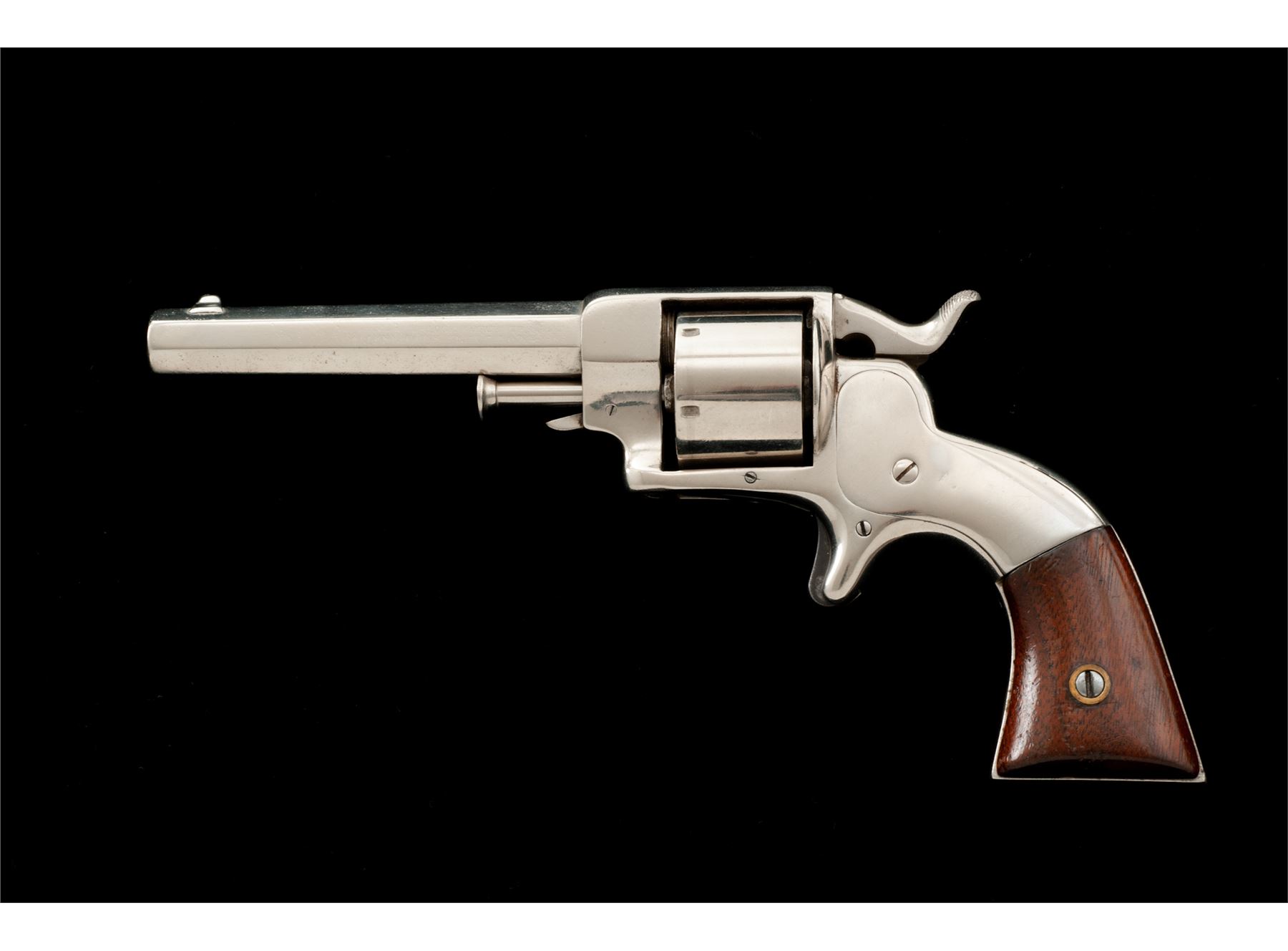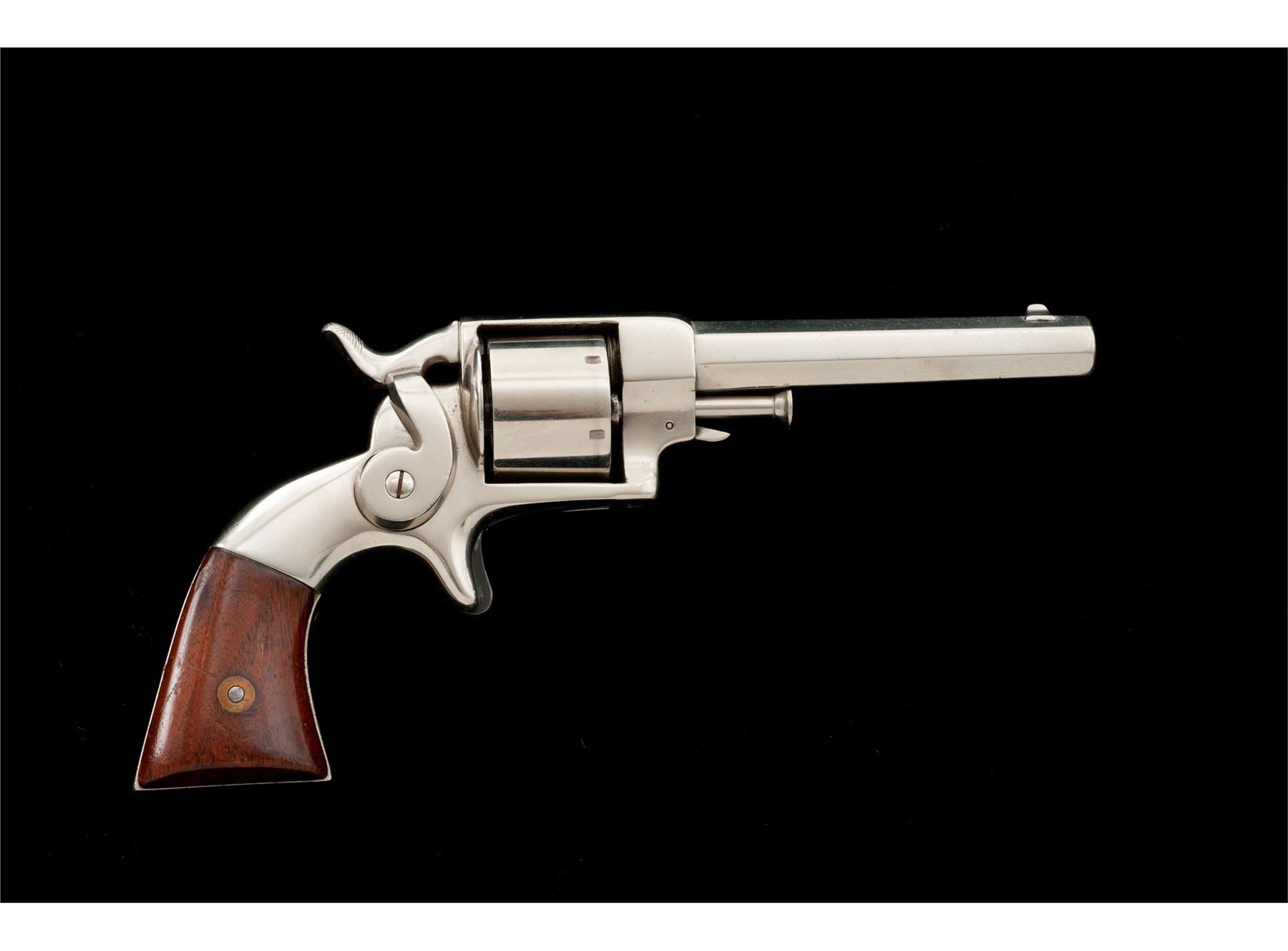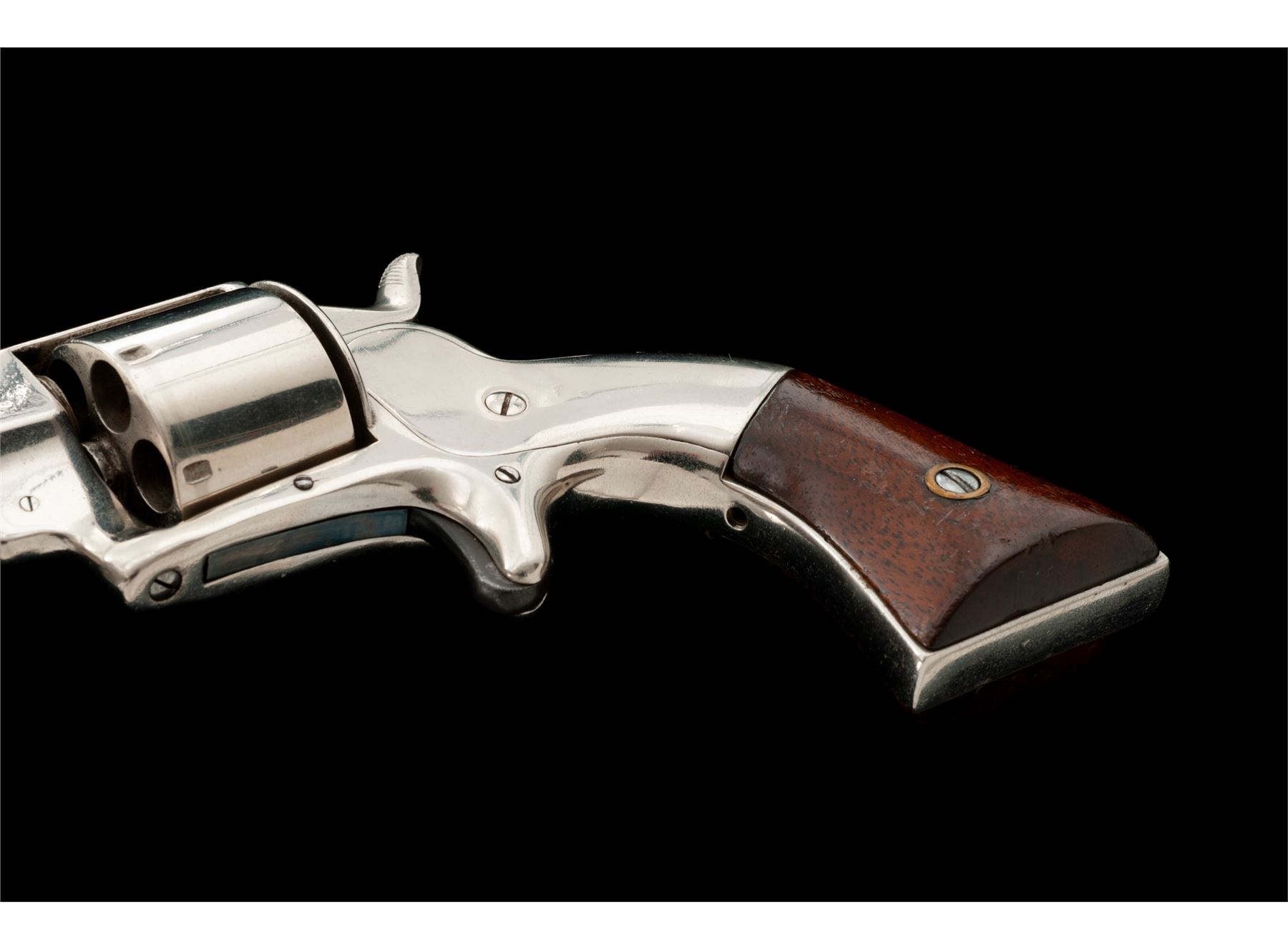 Civil War Allen & Wheelock Sidehammer Spurtrigger Pocket Revolver, #249 on frame under left grip and on both inside grip panels, .32 RF cal., 3.25'' octagonal barrel marked ''Allen & Wheelock Worcester Mass. U.S.'' and patent dates in two lines on left side, 6-shot plain round cylinder with serial number on rear between bores, full nickel-plated finish, two-piece varnished walnut grips. Mfg'd 1859-1862 in quantity of approx. 1000 revolvers. Condition is about good retaining all of a re-nickeled finish. Grips show only minor wear and retain most original varnish. Action functions but does not revolver cylinder; bore is clean with defined rifling. A unique sidehammer design modeled after the Colt Model 1855 percussion revolver. Est.: $200-$300. (Antique)