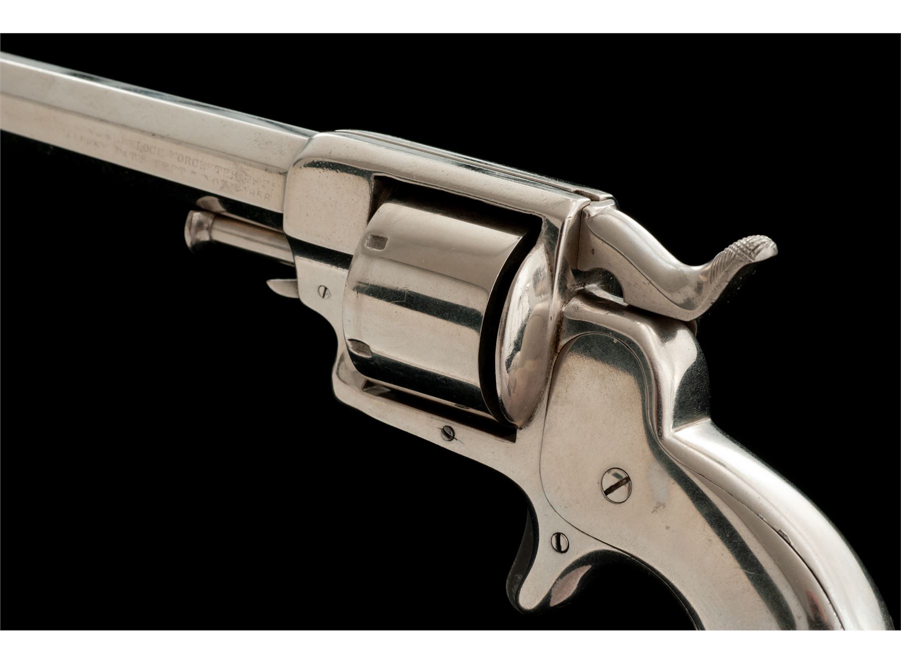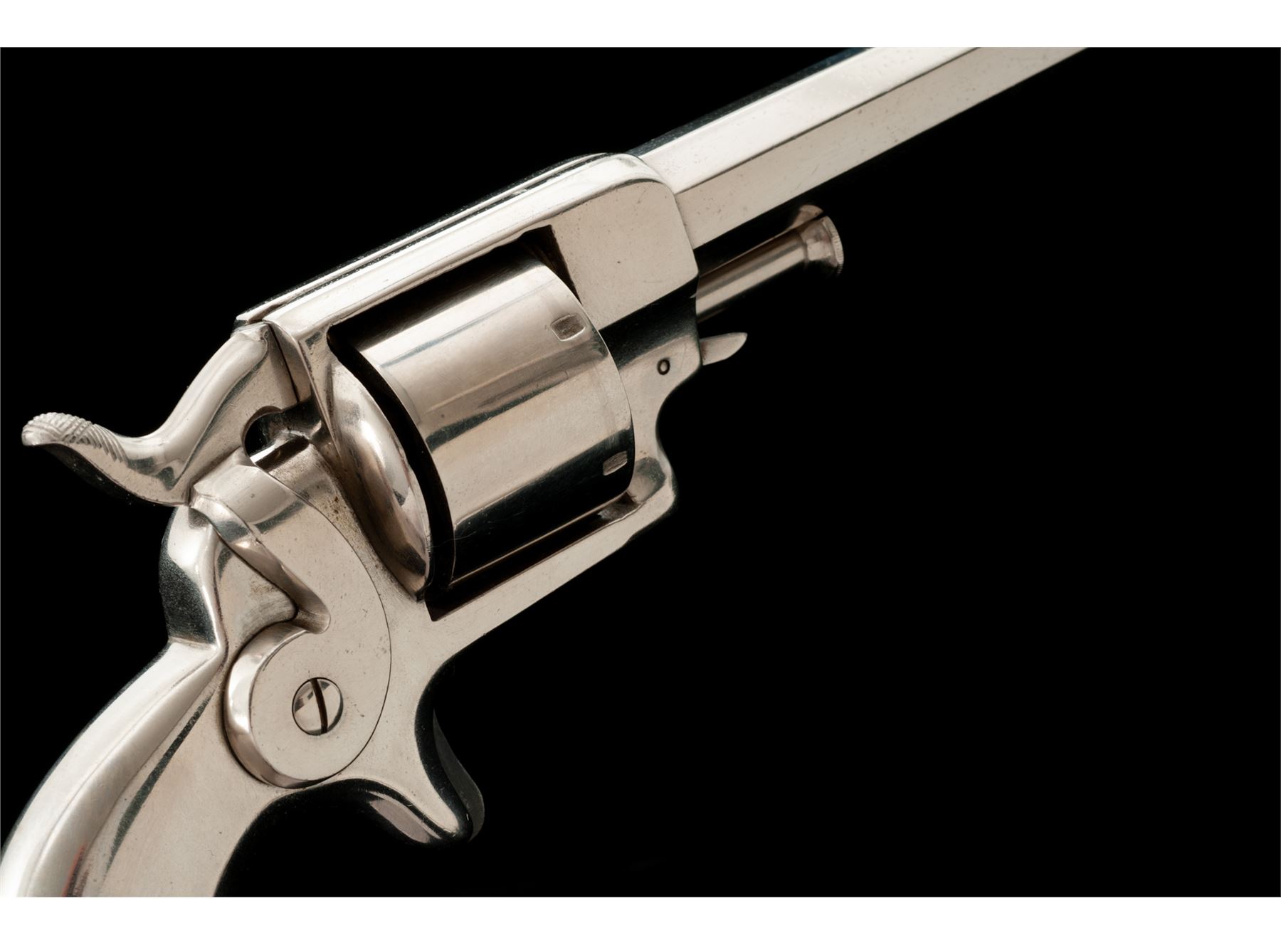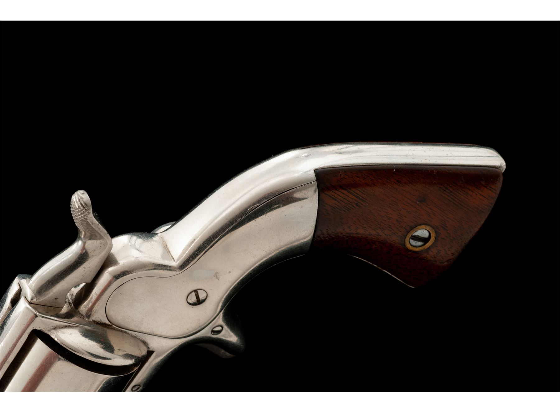 Civil War Allen & Wheelock Sidehammer Spurtrigger Pocket Revolver, #249 on frame under left grip and on both inside grip panels, .32 RF cal., 3.25'' octagonal barrel marked ''Allen & Wheelock Worcester Mass. U.S.'' and patent dates in two lines on left side, 6-shot plain round cylinder with serial number on rear between bores, full nickel-plated finish, two-piece varnished walnut grips. Mfg'd 1859-1862 in quantity of approx. 1000 revolvers. Condition is about good retaining all of a re-nickeled finish. Grips show only minor wear and retain most original varnish. Action functions but does not revolver cylinder; bore is clean with defined rifling. A unique sidehammer design modeled after the Colt Model 1855 percussion revolver. Est.: $200-$300. (Antique)