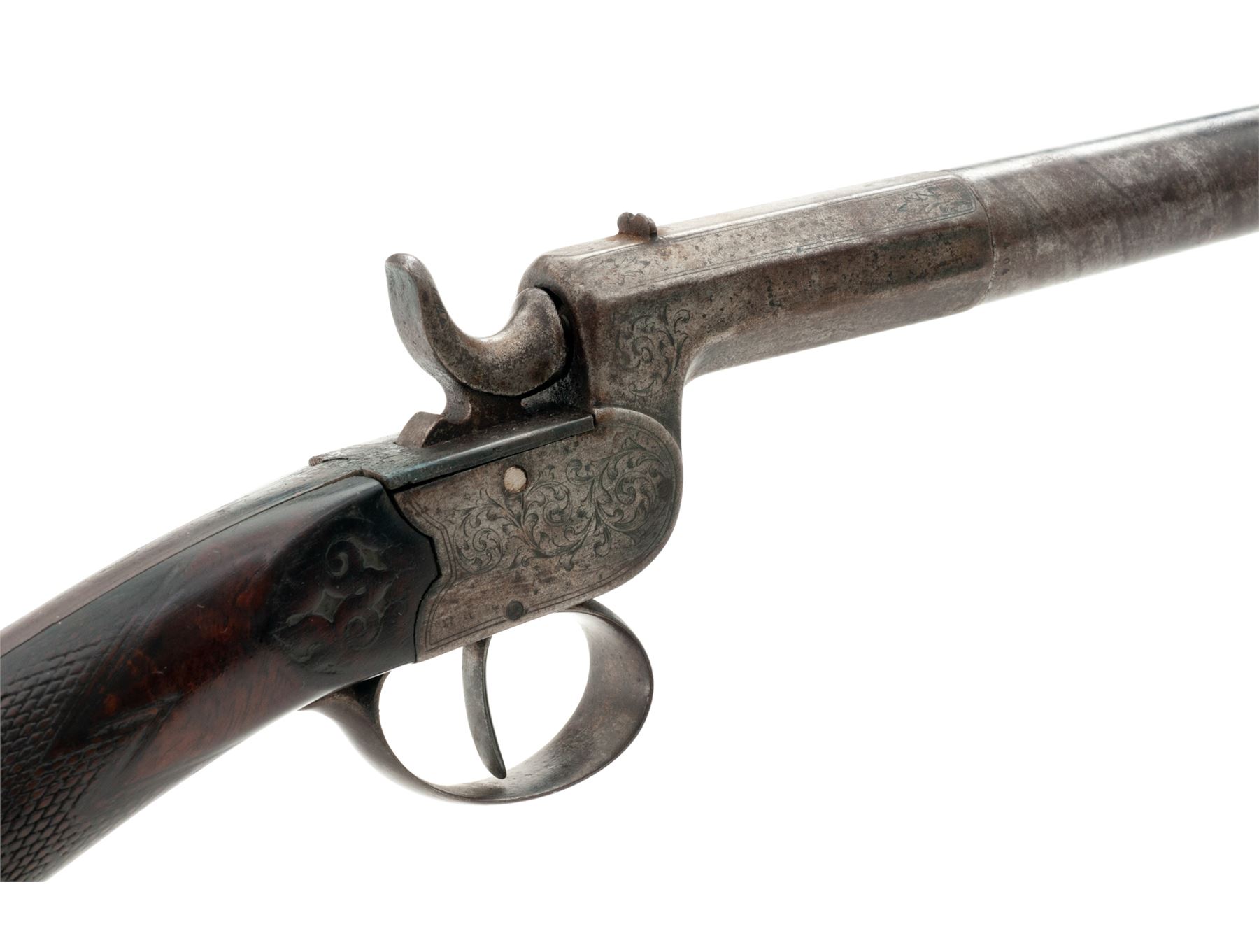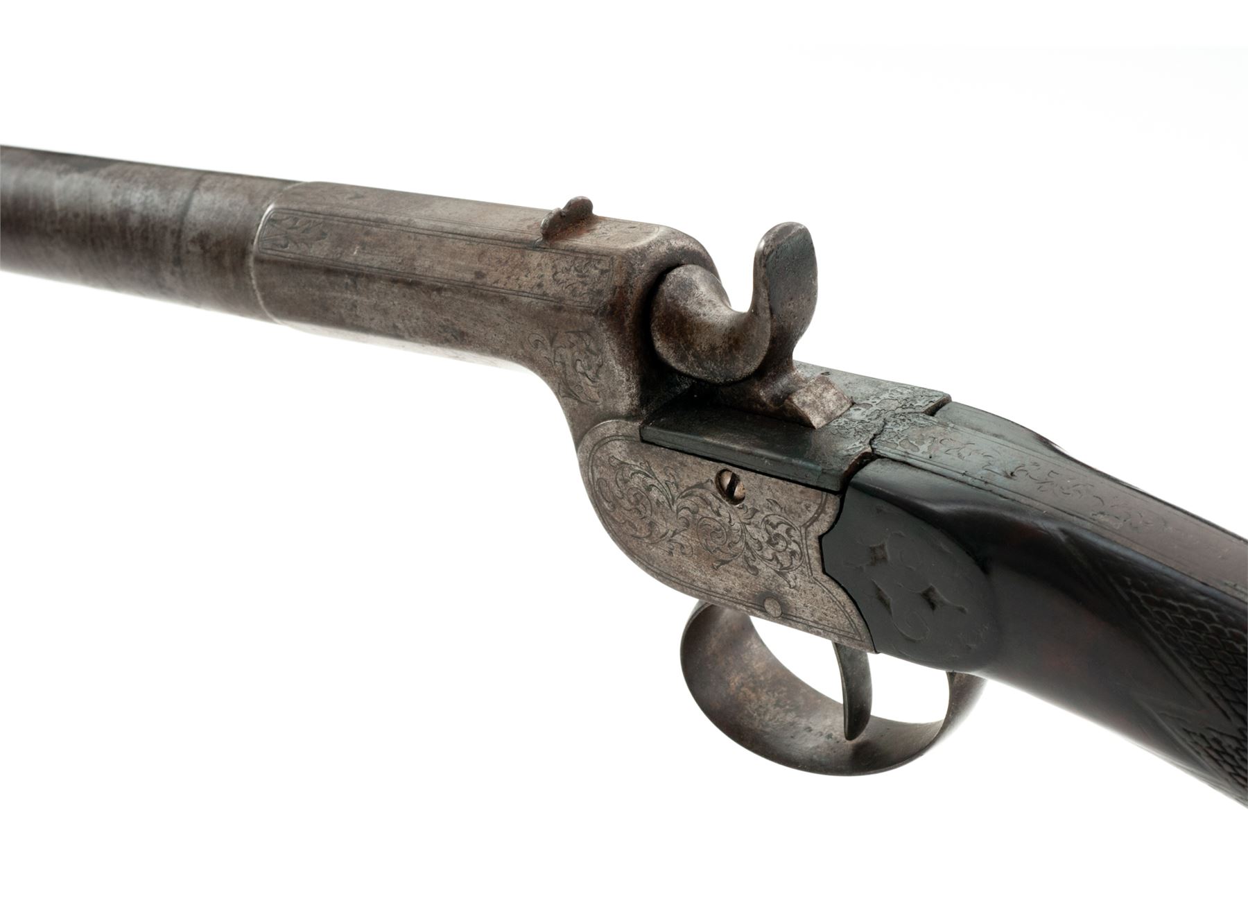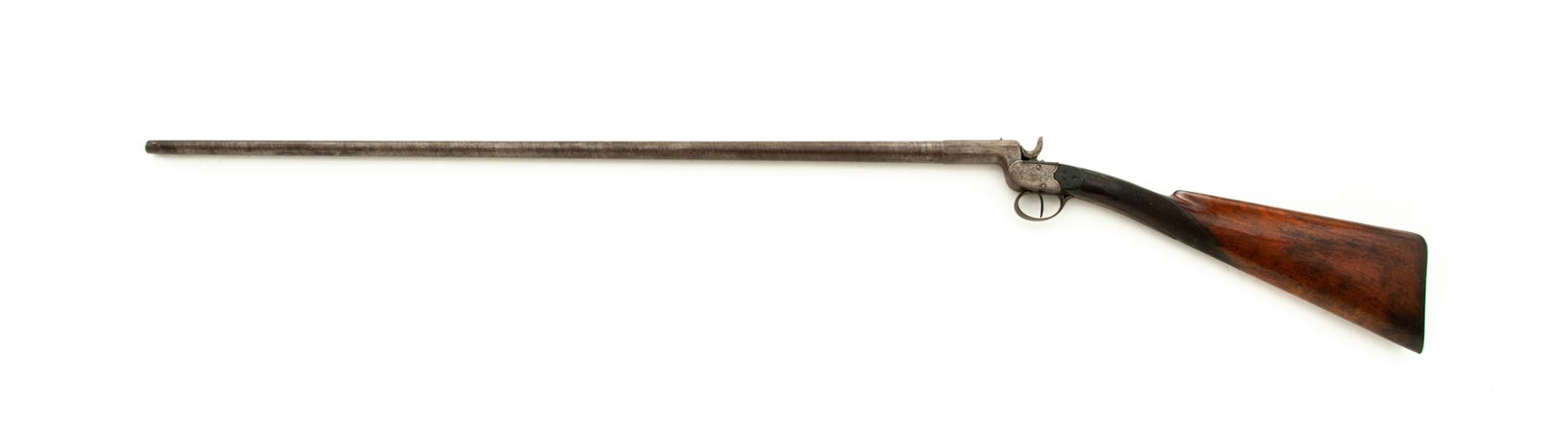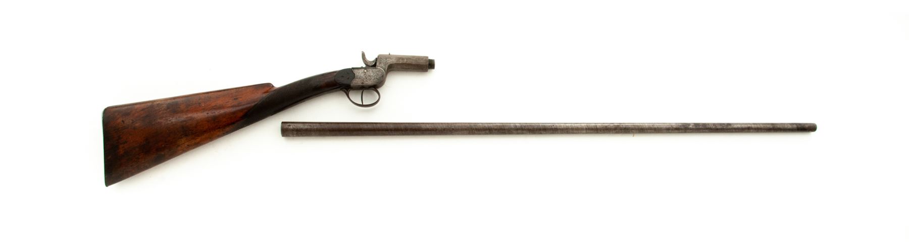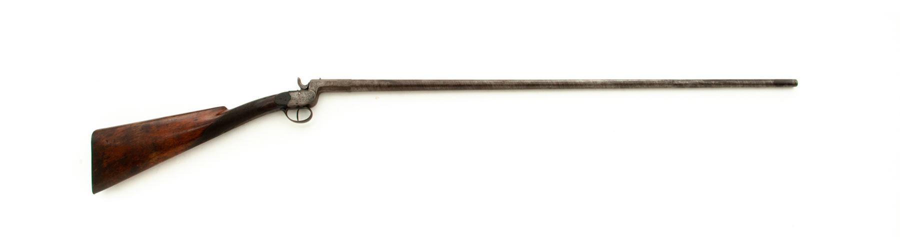 Antique Belgian Screw-Barrel Single-Shot Percussion Shotgun, #404, 12mm cal., 33-3/4'' part round-part octagonal twisted steel barrel with tiny blade front and notched rear sights marked ''12.0'', ''404'' and with the oval ''E.L.G.'' Liege proofmark at breech; floral engraved boxlock action is marked ''J.J. Rissack/Brevete'' on long bottom tang; varnished walnut buttstock with carved aprons on both sides behind lock and checkered at wrist, with steel buttplate. Condition is very good, the steel parts retaining no original finish and with an overall brownish-gunmetal color, the barrel having a distinct twist pattern. Stock is solid retaining most of its original varnish finish, sharp checkering, softened carving on aprons, and lovely grain and color. Action is strong and sure; smoothbore is dirty about 20% of the way down, shiny thereafter. Probably intended for collecting birds or small game. Est.: $200-$400. (Antique)