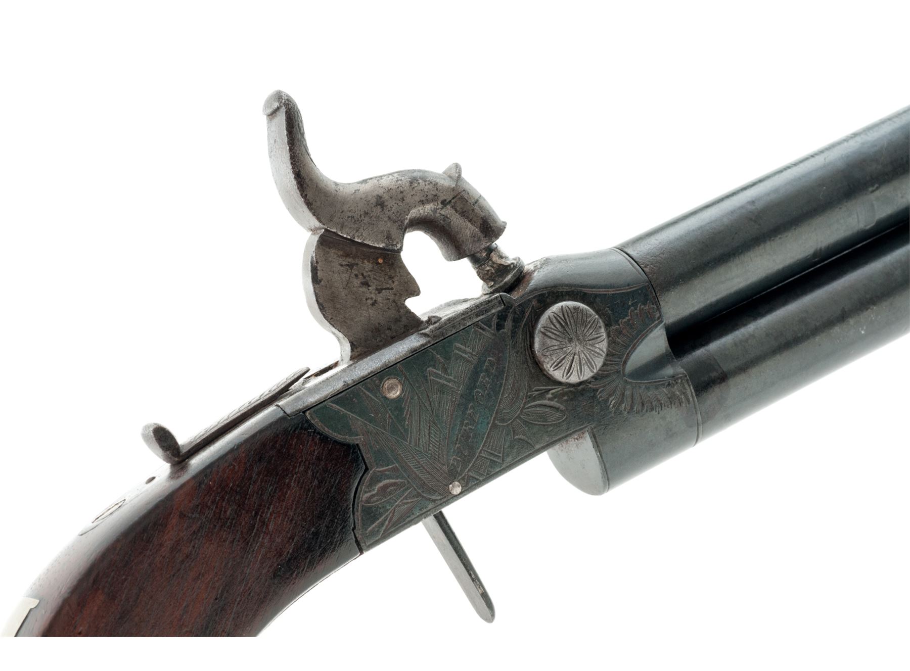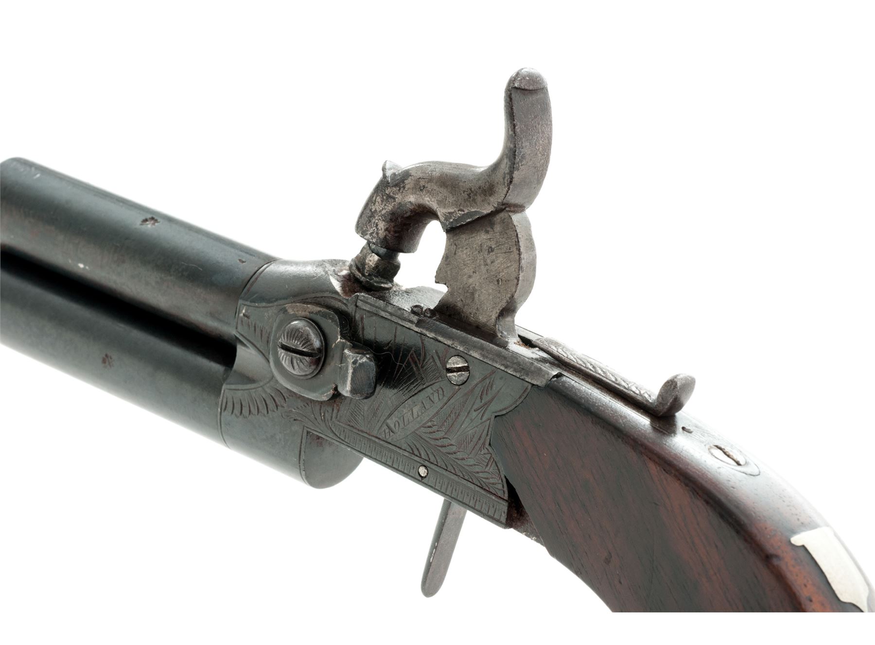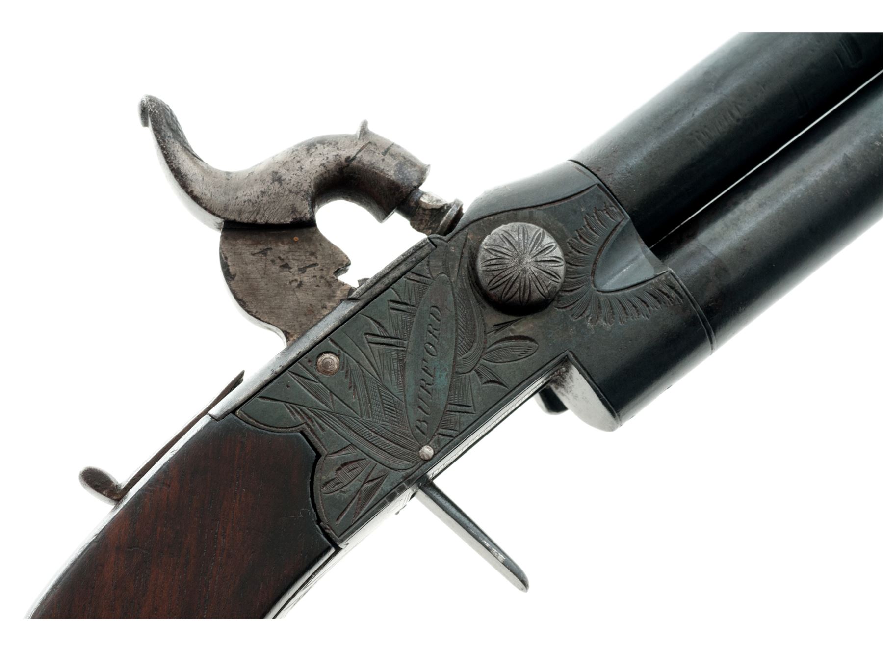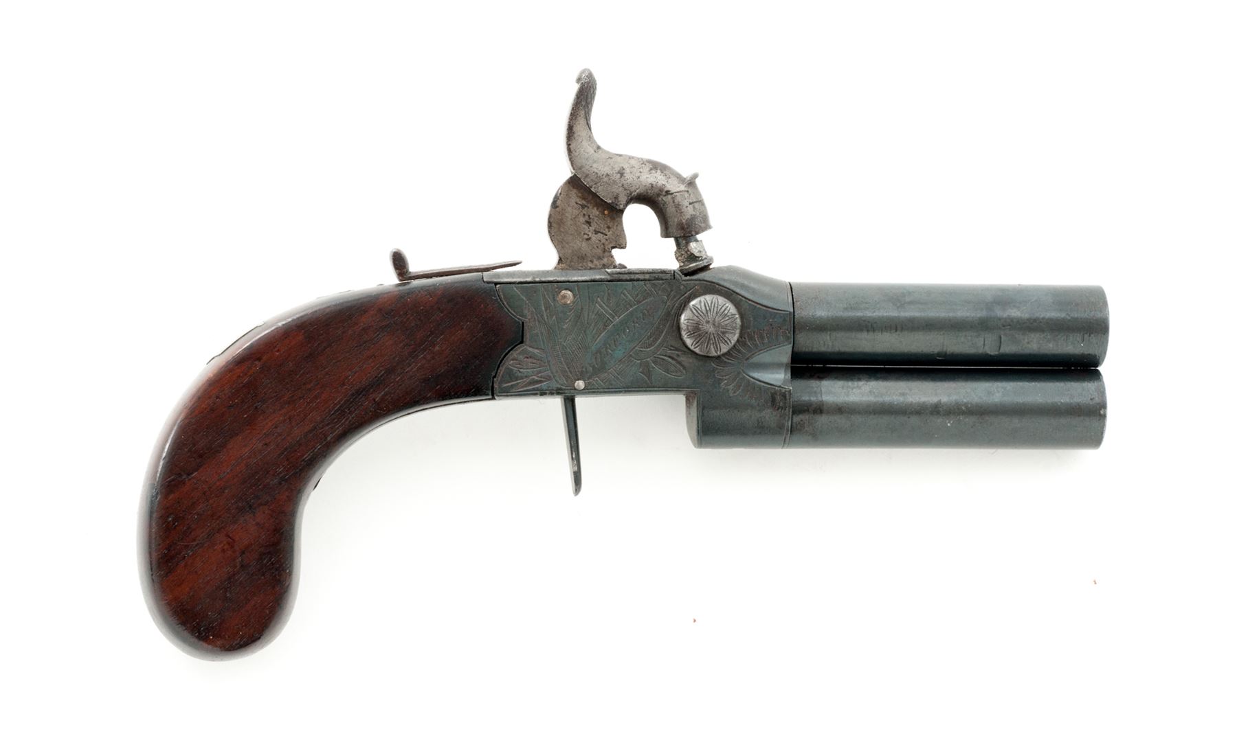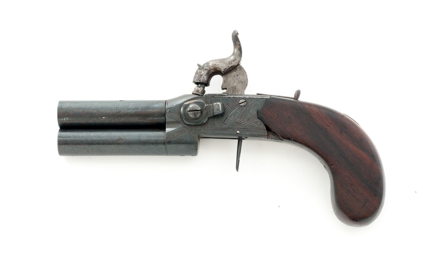Antique English Double Barrel Tap-Action Boxlock Percussion Pistol, by Henry Holland, NVSN, approx. .44 cal., 3.25'' round over-and-under screw-off barrels unmarked but for proofmarks; engraved frame marked ''Holland'' on left side and ''Burford'' on right and with proofmarks at bottom; unique sliding safety bar; folding/disappearing trigger, one-piece bag style grips appear to be rosewood with a vacant shield-shaped German silver nameplate inlaid at wrist. Tap action lever is mounted to left side of frame; when rotated up or down it selects which barrel will fire from the single hammer. Condition is very good+; smooth metal has a darkened bluish finish, with sharp markings and engraving. Grips are smooth and unblemished but for a chip out of bottom left side where they adjoin the frame. Action is crisp; bores are clean and smooth with polygonal rifling for about 1/4'' at muzzles. Est.: $750-$1,000. (Antique)