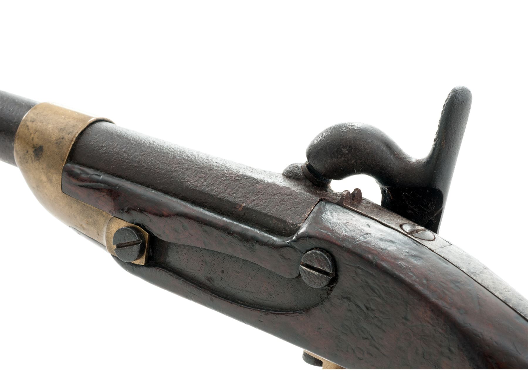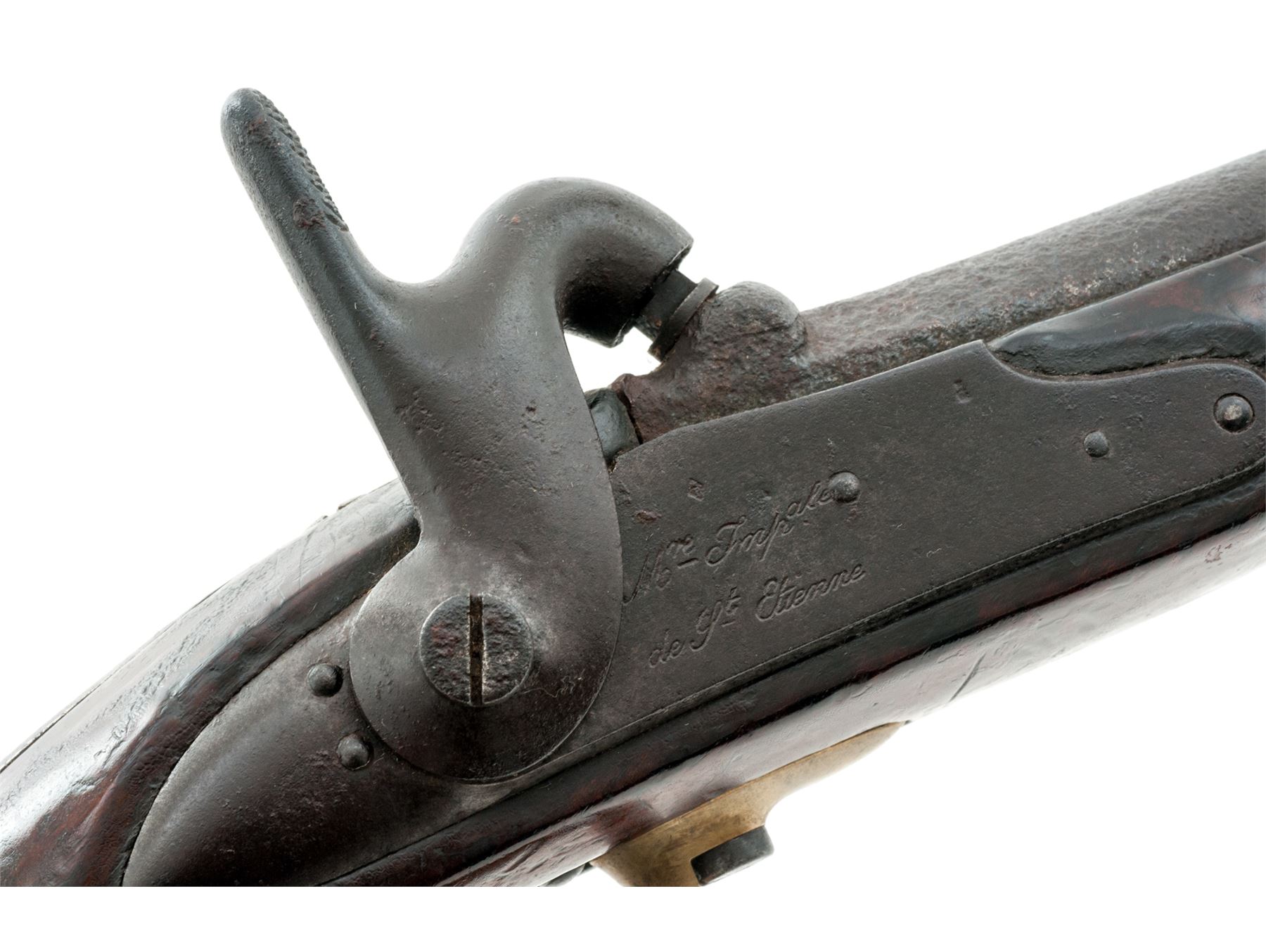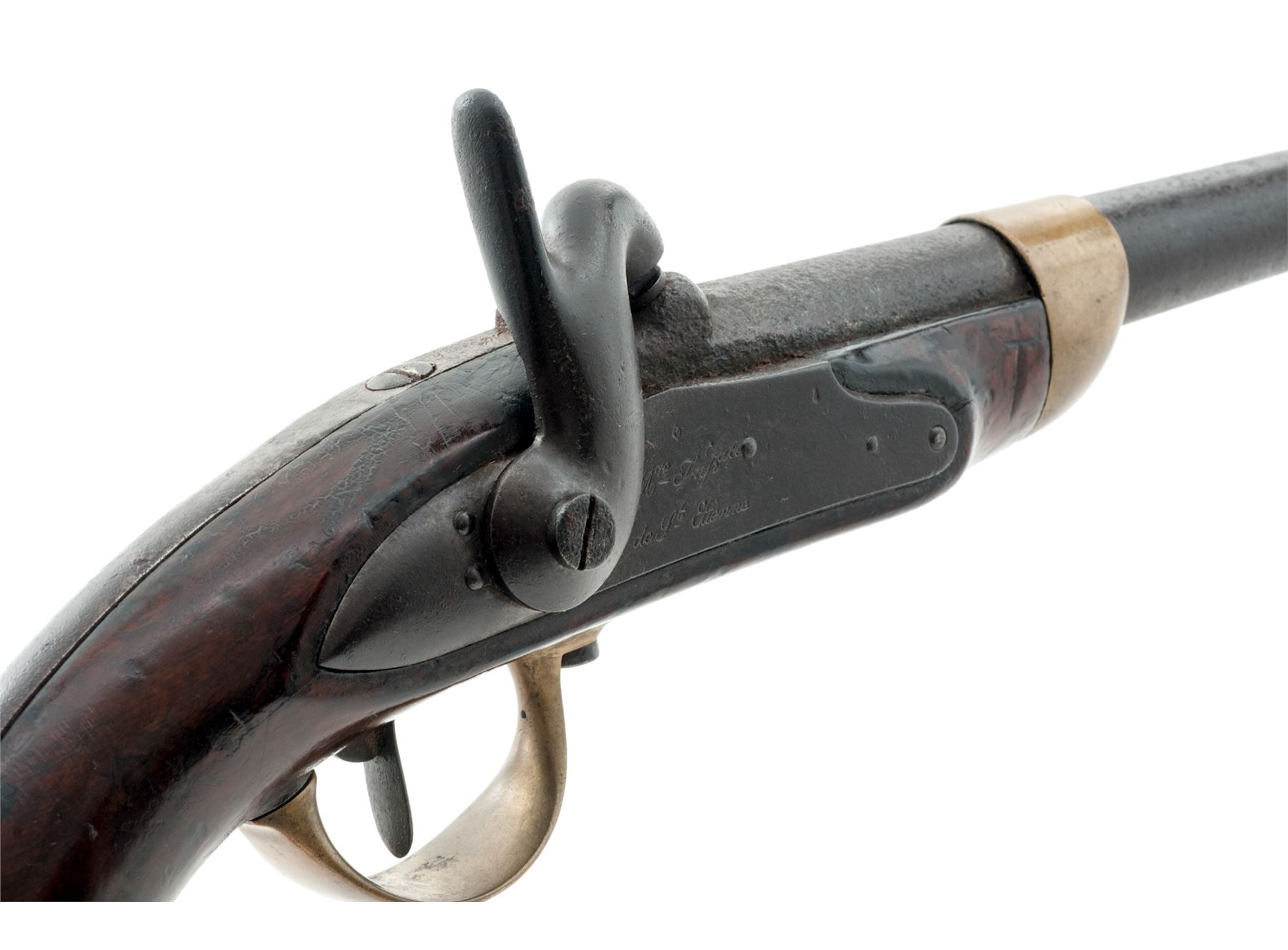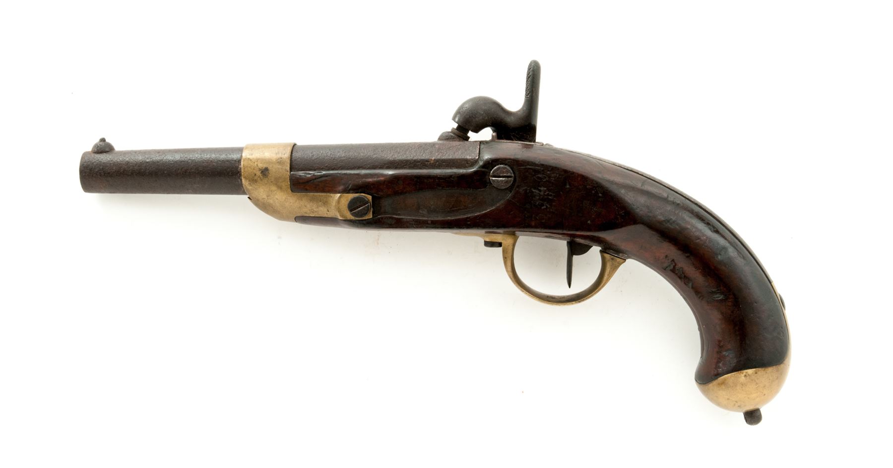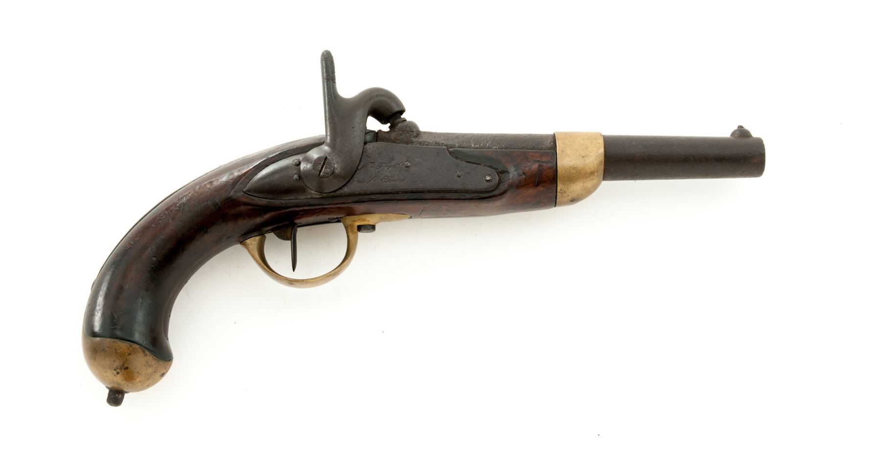 Antique French Military Model 1822 Single Shot Percussion Pistol, by St. Etienne Armory, NVSN, approx. .75 cal., 7-7/8'' octagon-to-round thin wall barrel with unusual post-type front sight and notched rear sight, barrel tang marked ''Mle 1822'' (faint), iron lockplate marked ''Mre Impale'' over ''de St. Etienne'', hammer with distinctive straight thumb spur, iron backstrap runs full-length from barrel tang to buttcap; brass barrel band, serpentine sideplate, brass triggerguard and buttcap with long tang and iron lanyard mount. One-piece European walnut stock stamped with circular arsenal cartouche and multiple inspectors' marks. Condition is good showing no original finish and heavy black powder pitting covering most of the barrel under a dark age patina; lockplate is smooth dark metal with clear markings; brass shows an aged patina. Stock is solid showing many faint arsenal and inspector marks and a later coat of varnish. Missing brass sideplate, ramrod and lanyard ring. Action is stout; bore is dark and pitted. Est.: $600-$800. (Antique)